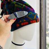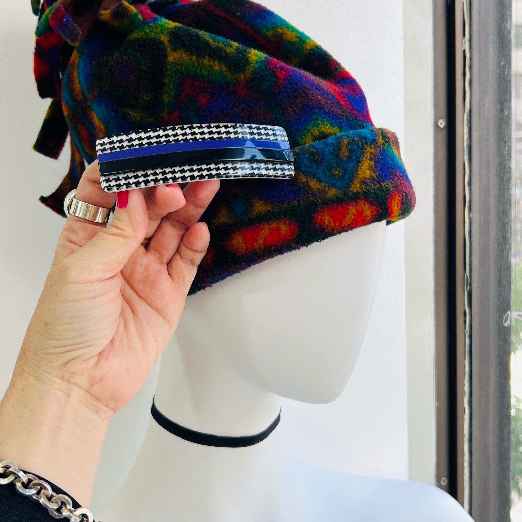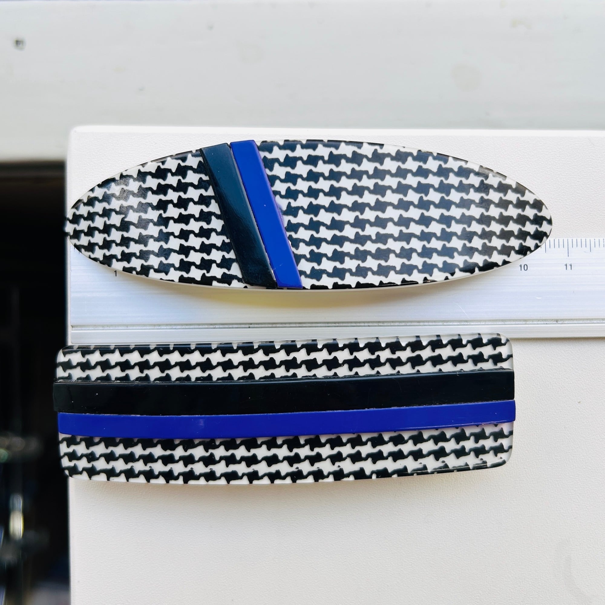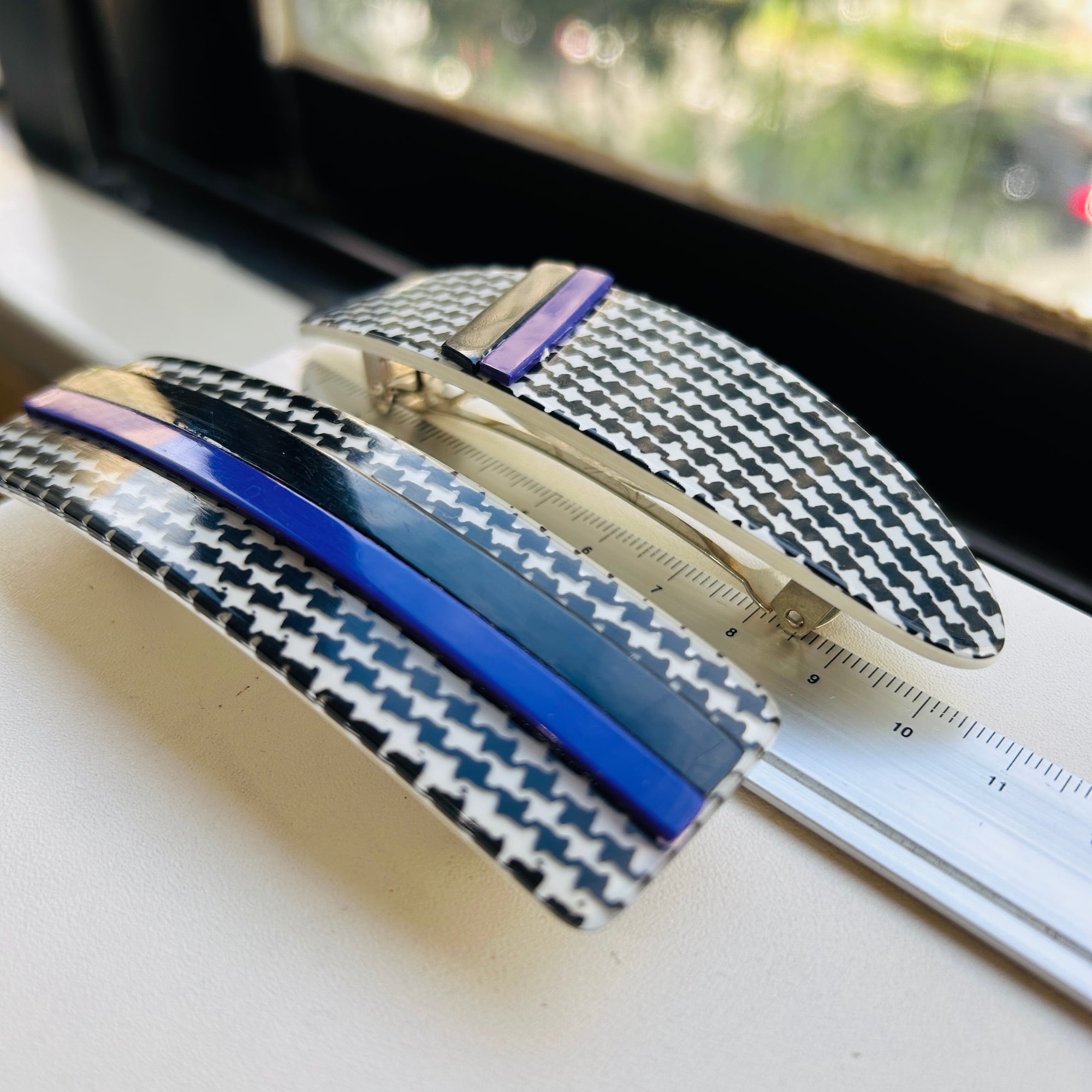 グレンチェックにライン模様のシックなバレッタ。約10cmのバレッタです。黒と紫ラインはバレッタにマウントされています。ラインの間、凹みに少し白いモノが見えます。これは汚れではなく下地が見えてるような感じです。細いヘラを通して凹み部分の汚れは取り除いてあります。金具に「MADE IN FRANCE」。1つのお値段です。