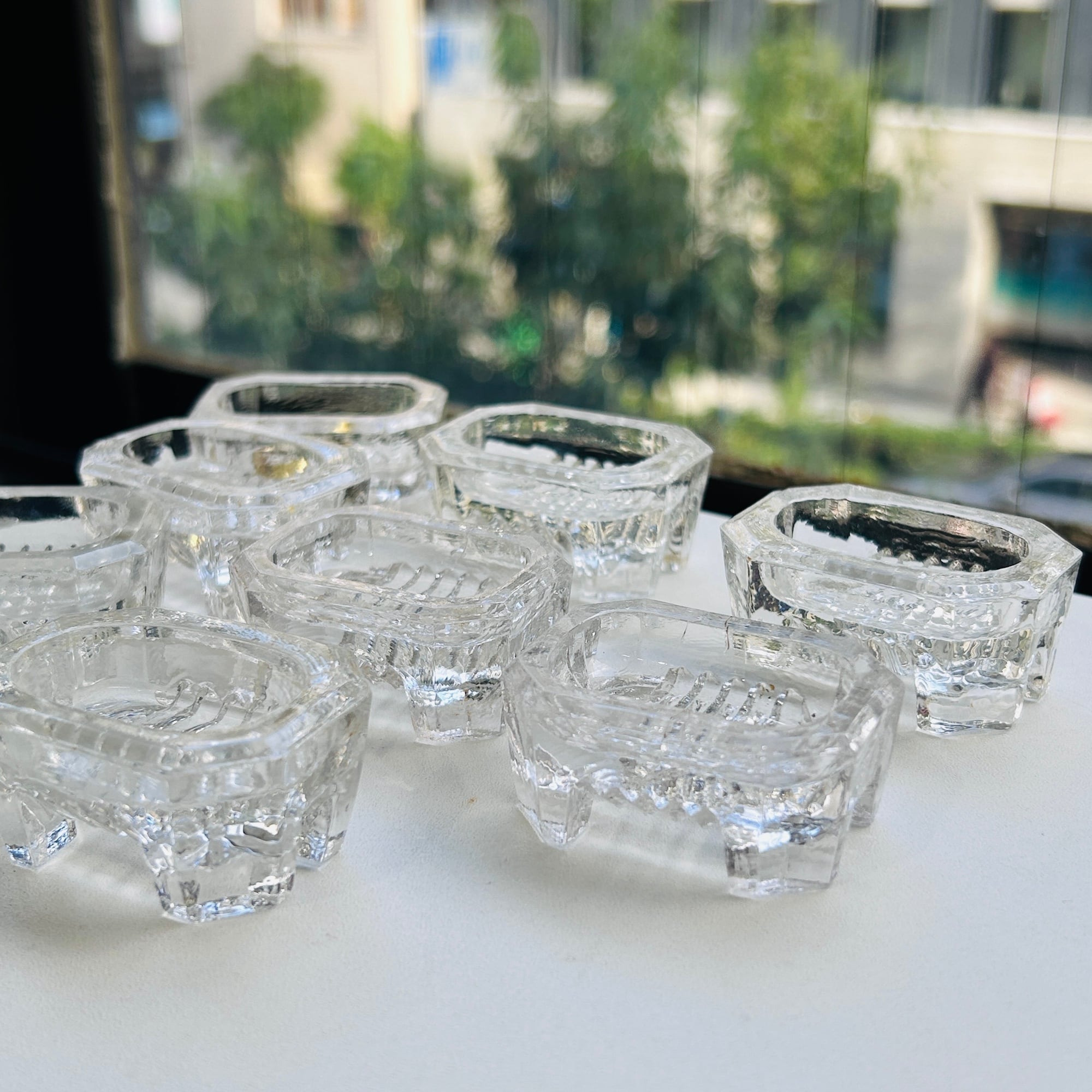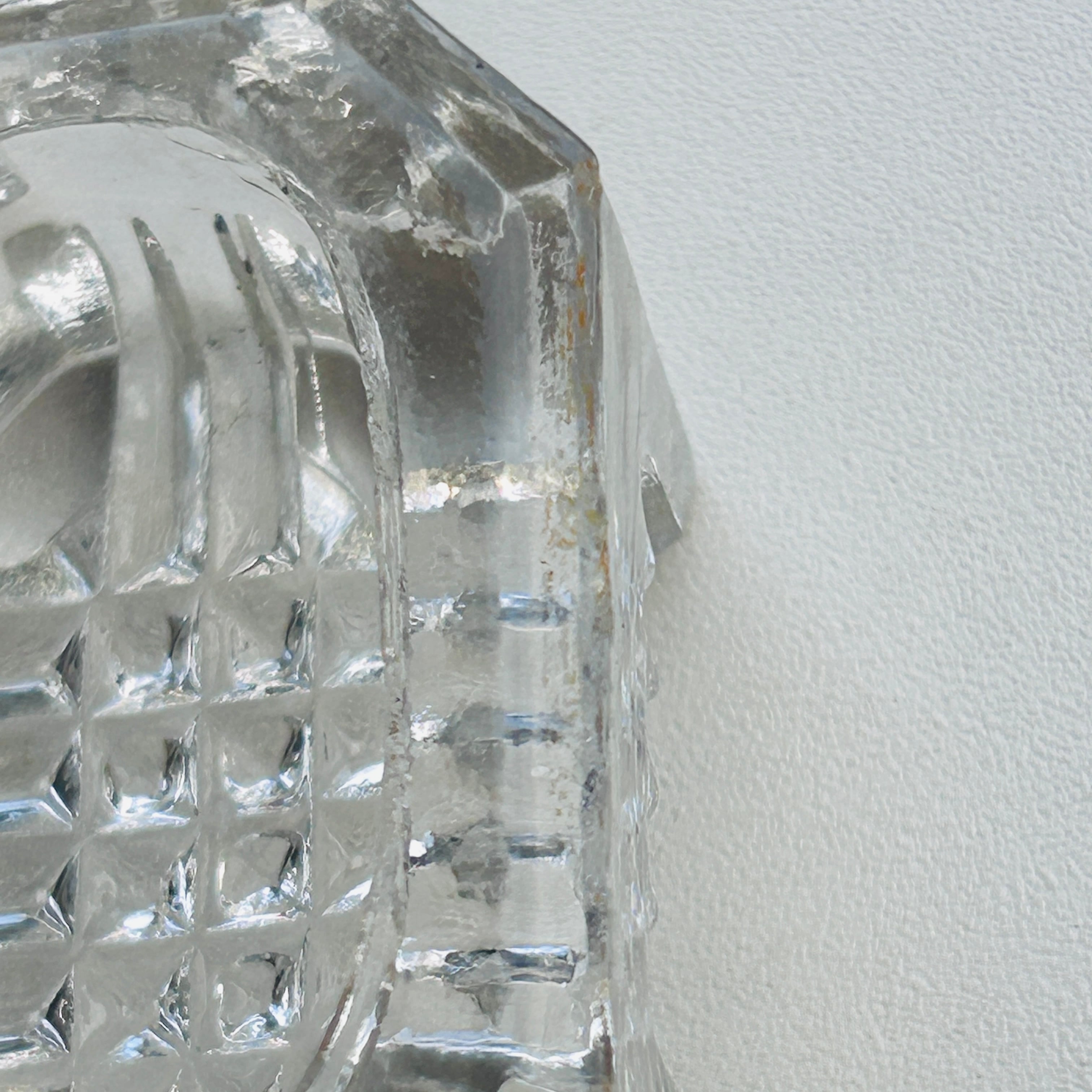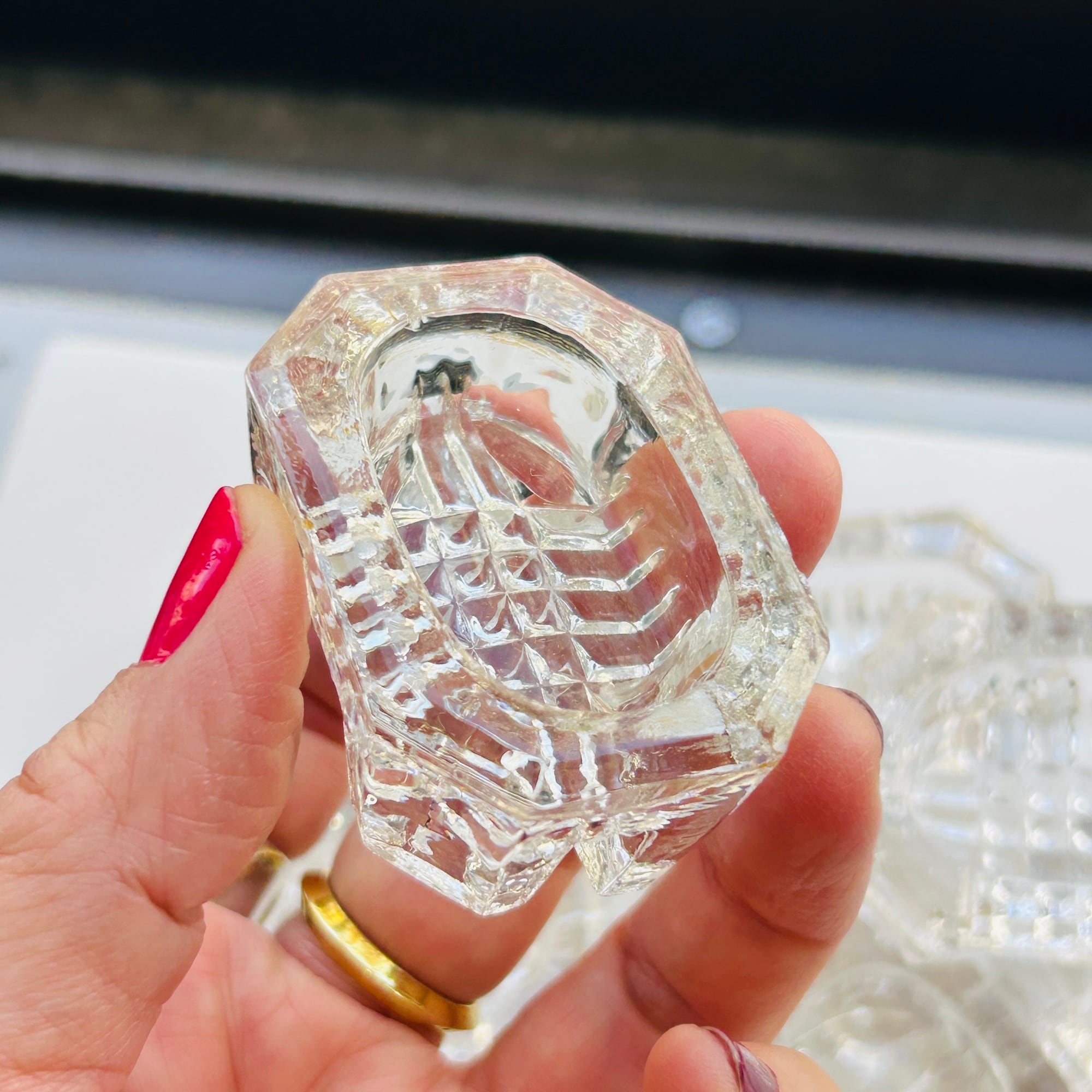 分厚いガラス小皿。ソルトディッシュ、ソルトセラーと呼ばれるお塩入れです。昔のテーブルウェアの1つです。塩が高価だった時代は豊かさの象徴でもあり、素敵な小皿に入れてディナーテーブルに1つ、小さなスプーンも添えて使われていたものです。テーブルを華やかなにラグジュアリーを演出するアイテムの1つでした。今回は同じ形のソルトディッシュを複数入荷しました。アクセサリートレイやお香の小皿としてもオススメです。ルーペで見ると角谷フチに極小さなカケがあったりするものもあります。指で触るとザラザラする程度です。底や脚に薄っすら油汚れのようなものが付着してましたが、かなり取り除きました。まだ少し付いているのもあります。白い台の上に置くと分かりますが色付きのモノの上に置くと分かりません。洗剤は普通の食器洗剤とキッチンハイターを試しましたが取れませんでした。カッターナイフで削ぐように擦ると取れます。他の洗剤も試したりしてみて下さい。1900年前後のガラスです。古いモノにご理解ある方よろしくお願いいたします。Good price!