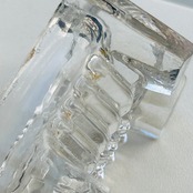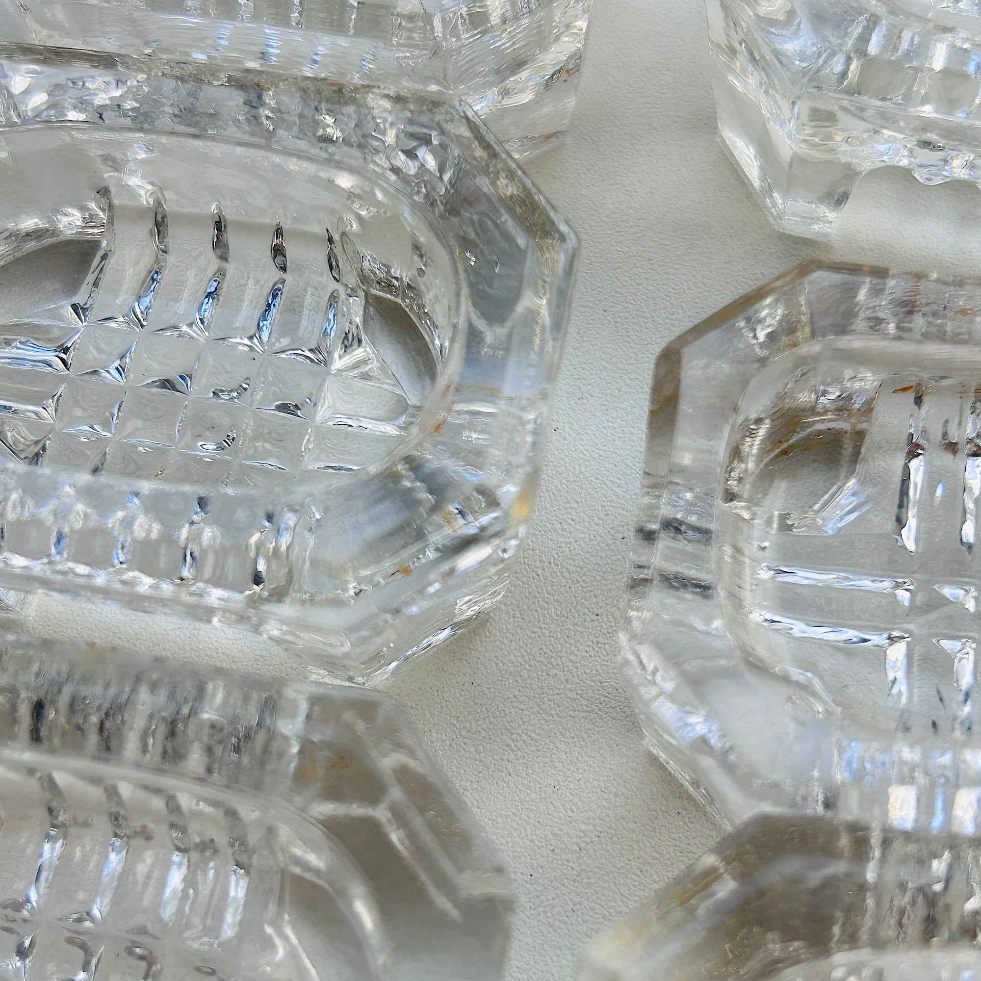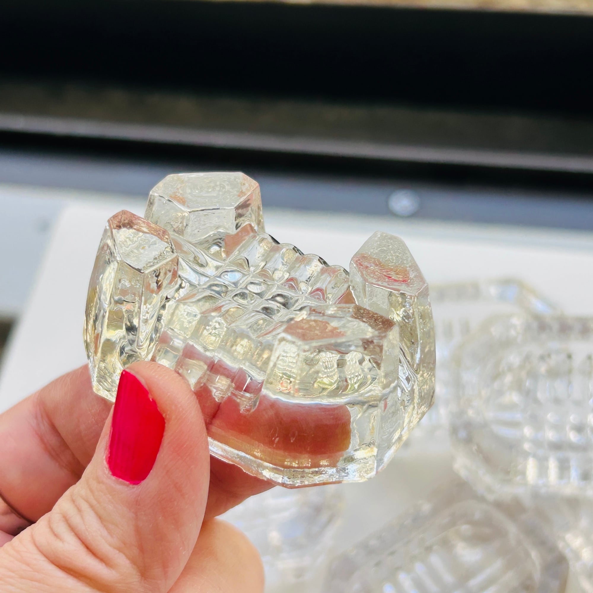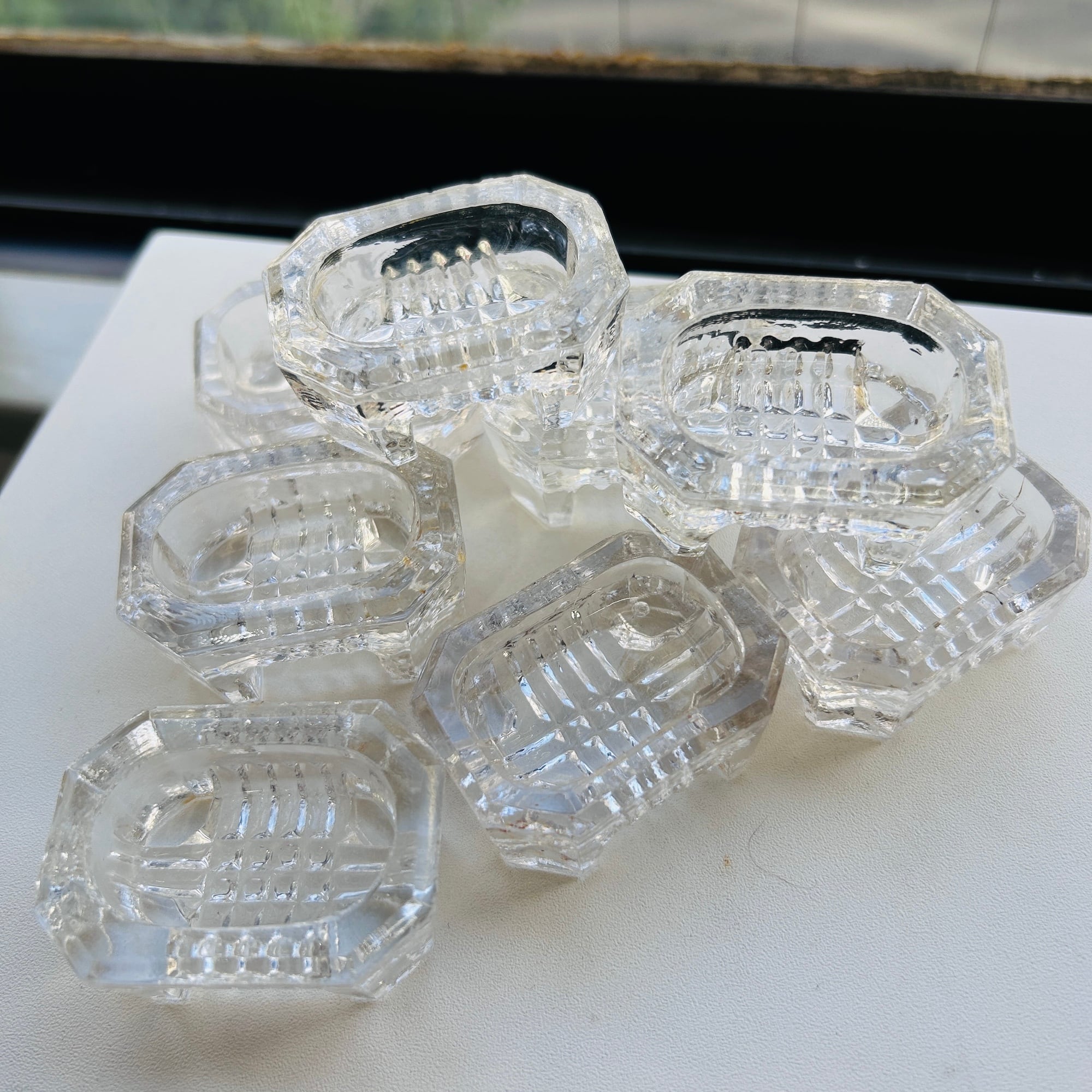 分厚いガラス小皿。ソルトディッシュ、ソルトセラーと呼ばれるお塩入れです。昔のテーブルウェアの1つです。塩が高価だった時代は豊かさの象徴でもあり、素敵な小皿に入れてディナーテーブルに1つ、小さなスプーンも添えて使われていたものです。テーブルを華やかなにラグジュアリーを演出するアイテムの1つでした。今回は同じ形のソルトディッシュを複数入荷しました。アクセサリートレイやお香の小皿としてもオススメです。ルーペで見ると角谷フチに極小さなカケがあったりするものもあります。指で触るとザラザラする程度です。底や脚に薄っすら油汚れのようなものが付着してましたが、かなり取り除きました。まだ少し付いているのもあります。白い台の上に置くと分かりますが色付きのモノの上に置くと分かりません。洗剤は普通の食器洗剤とキッチンハイターを試しましたが取れませんでした。カッターナイフで削ぐように擦ると取れます。他の洗剤も試したりしてみて下さい。1900年前後のガラスです。古いモノにご理解ある方よろしくお願いいたします。Good price!