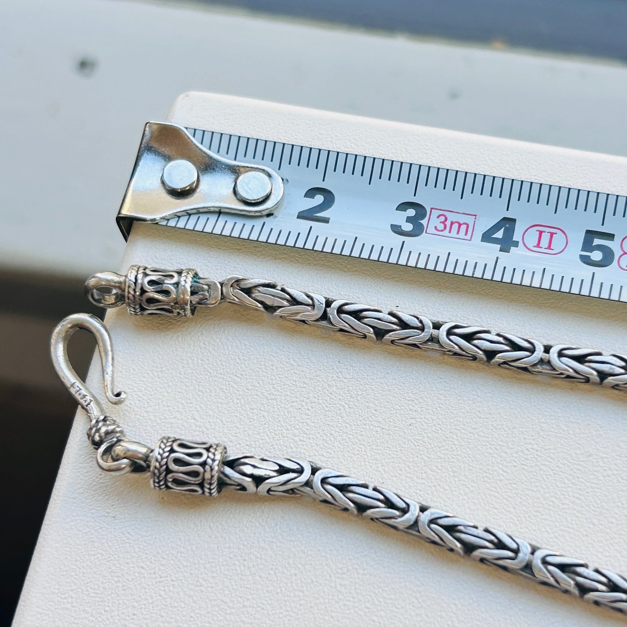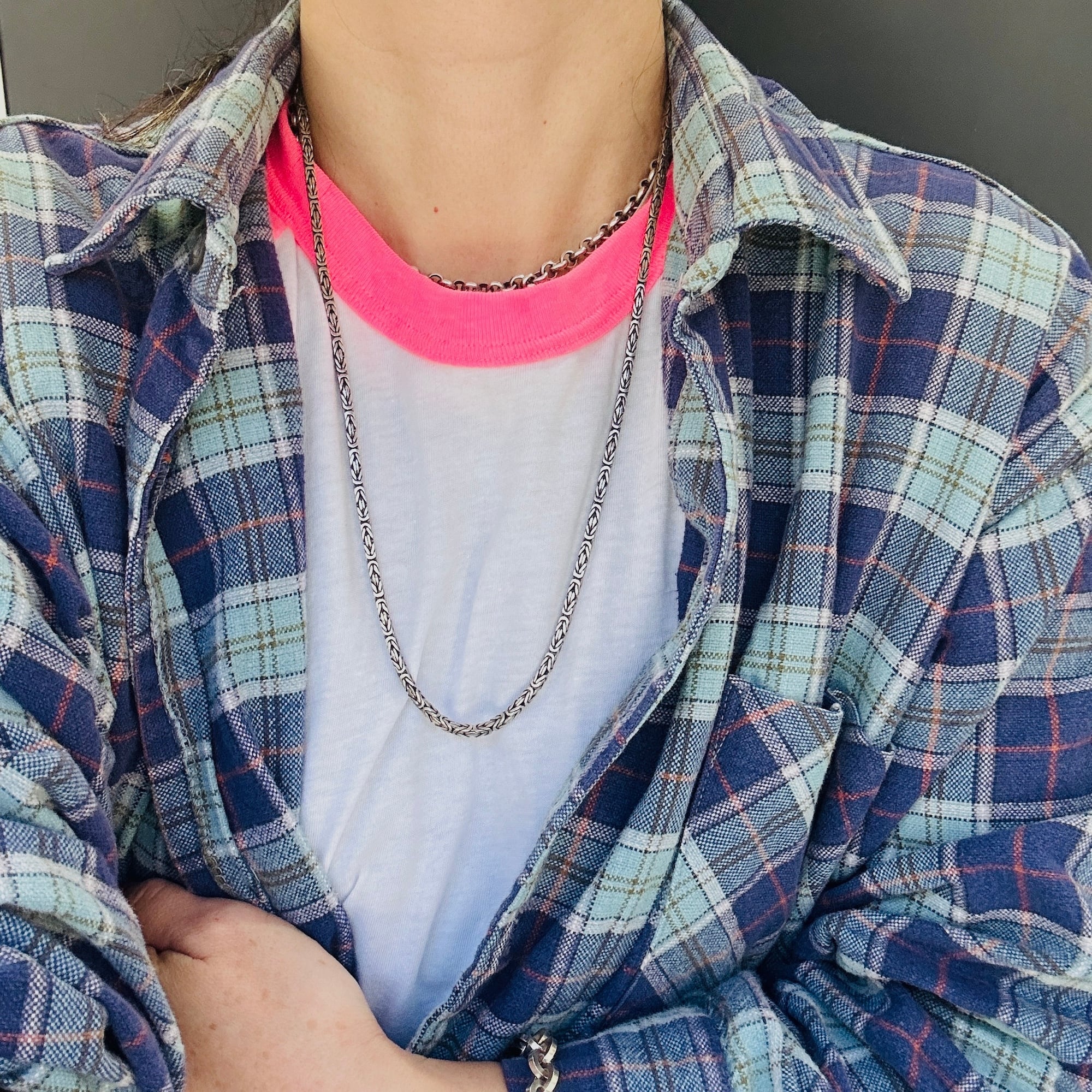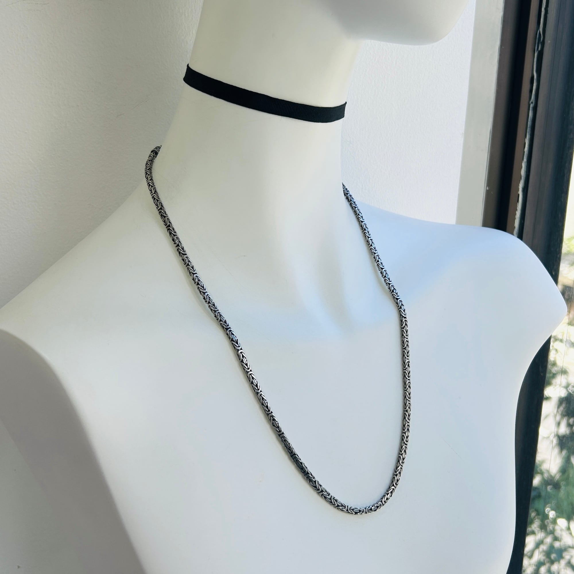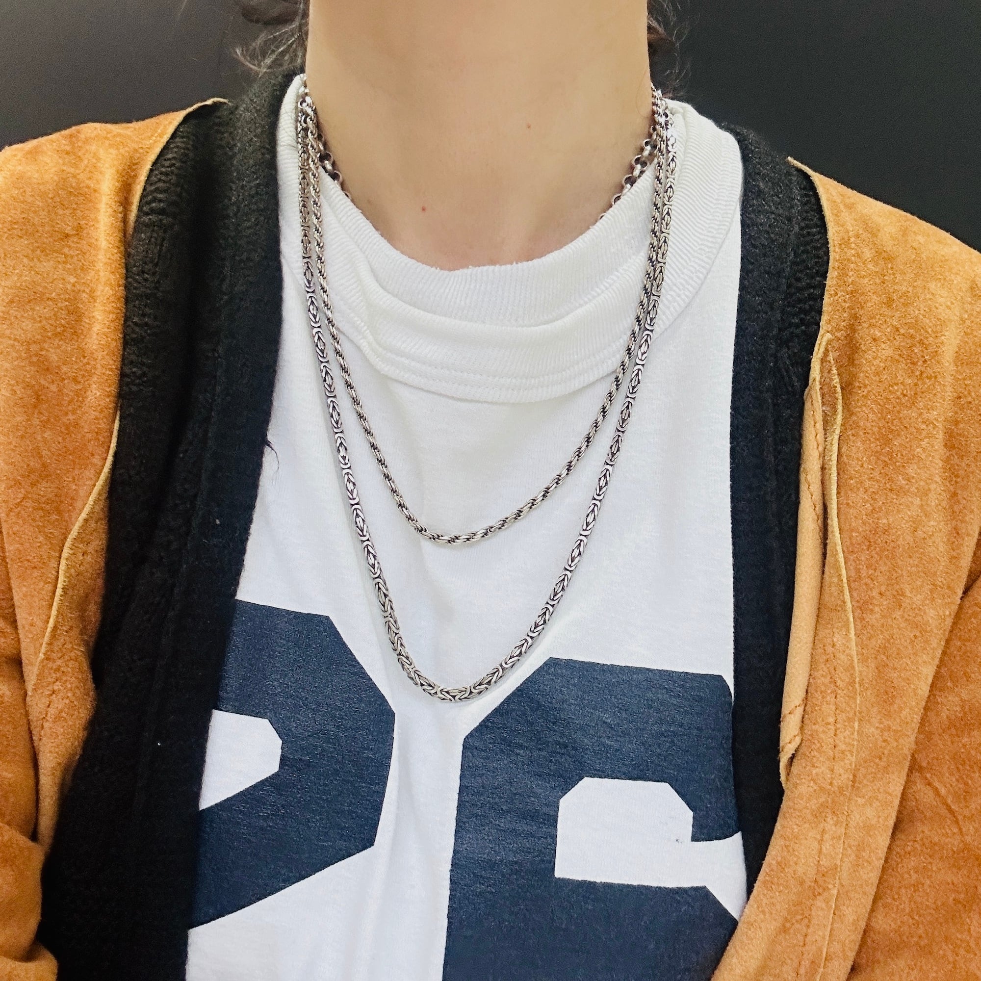 独特のチェーンコマがエキゾチックな模様になっているビザンチェーン(Byzantine Chain)ネックレス。使いやすい引っ掛け金具です。装飾性が高いので着けるだけでカッコいいアクセントになります。セミマットな質感でピカピカしていませんのでスタイリングに自然な感じで馴染みます。「925」刻印。送料無料でお届け致します。