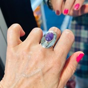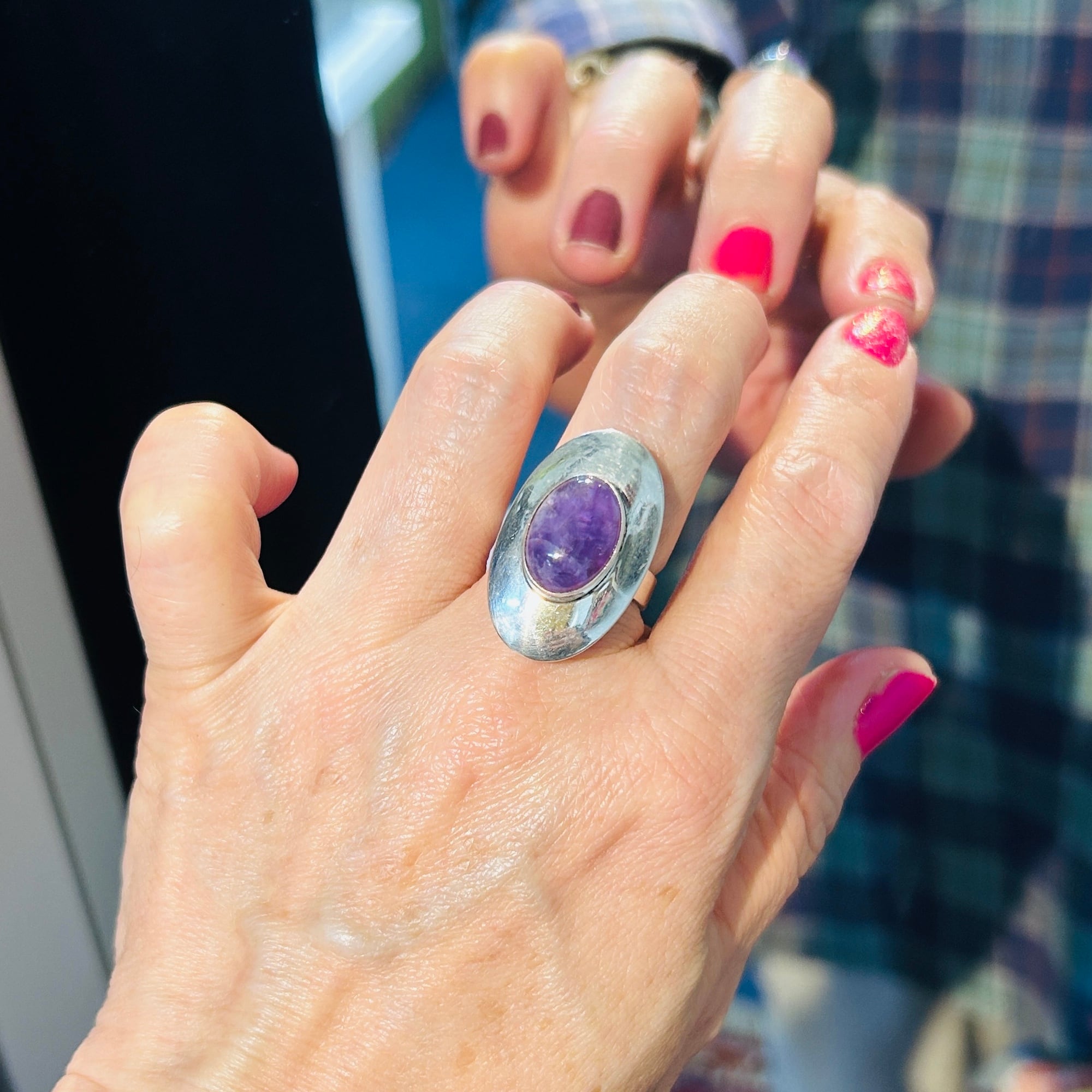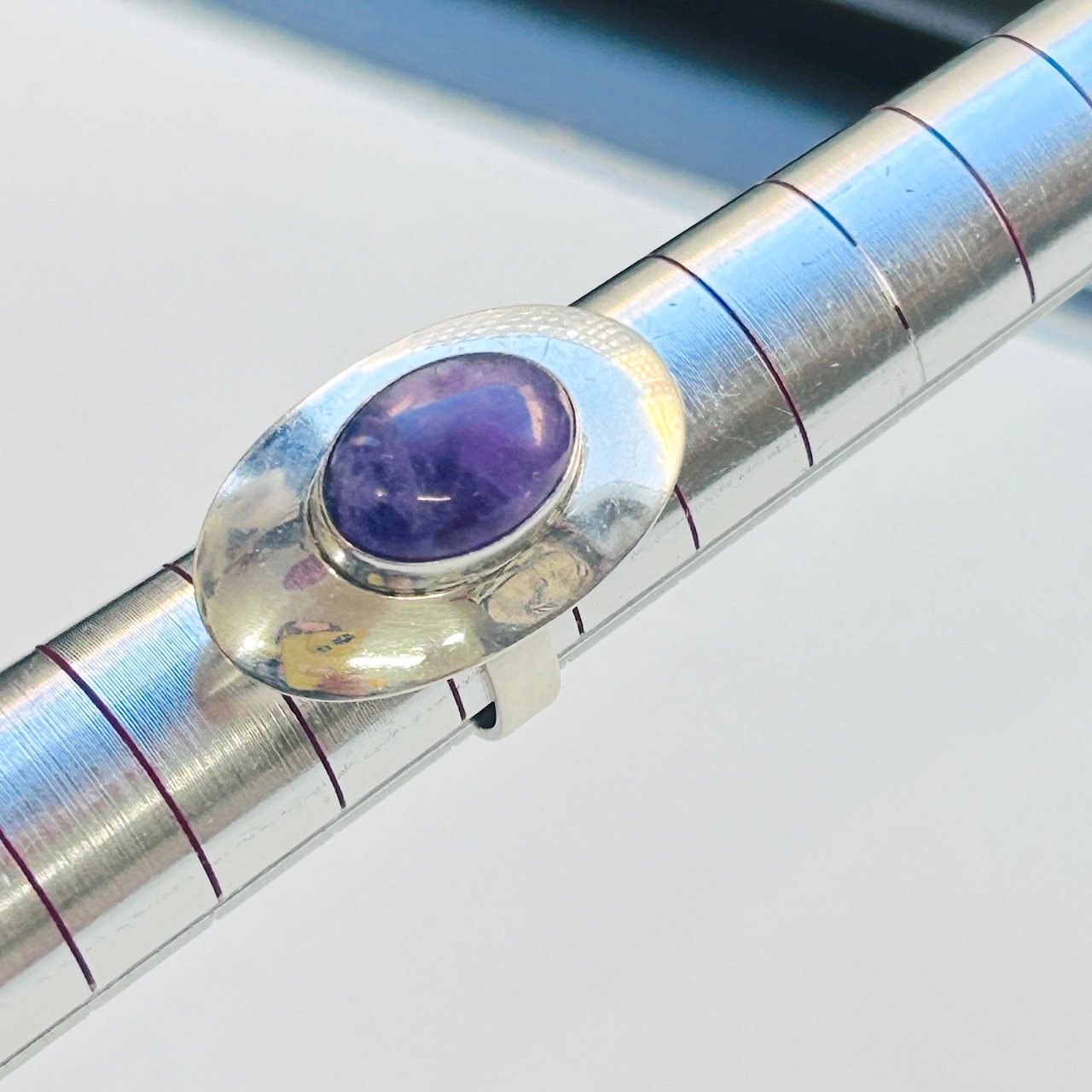 北欧風のアメジストリング。シンプルな曲線デザイン、きめ細かく研磨されたツルっとした表面でツヤのあるシルバーです。なんと言っても美しいアメジストが最大の魅力です。高く突起したストーンセッティングは手元でキレイに映えます。アメジストに当たり傷がありますがヒビはありません。円盤のように膨らんだシルバー楕円は縦2.8cm、横1.7cm。4mm幅のプレーンバンドは着脱しやすいです。私は12号中指と14−15号人差し指に着用できます。バンド内側に「ISRAEL925」とメーカーロゴマーク。
