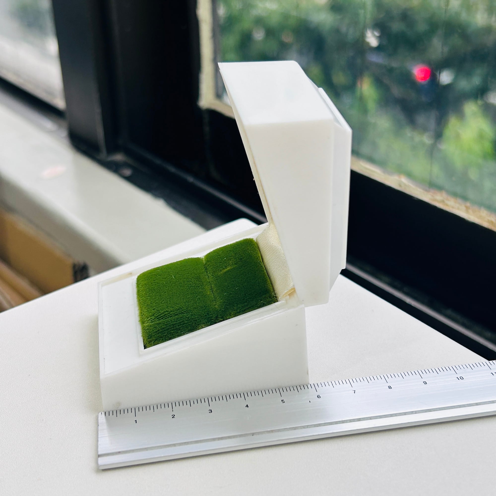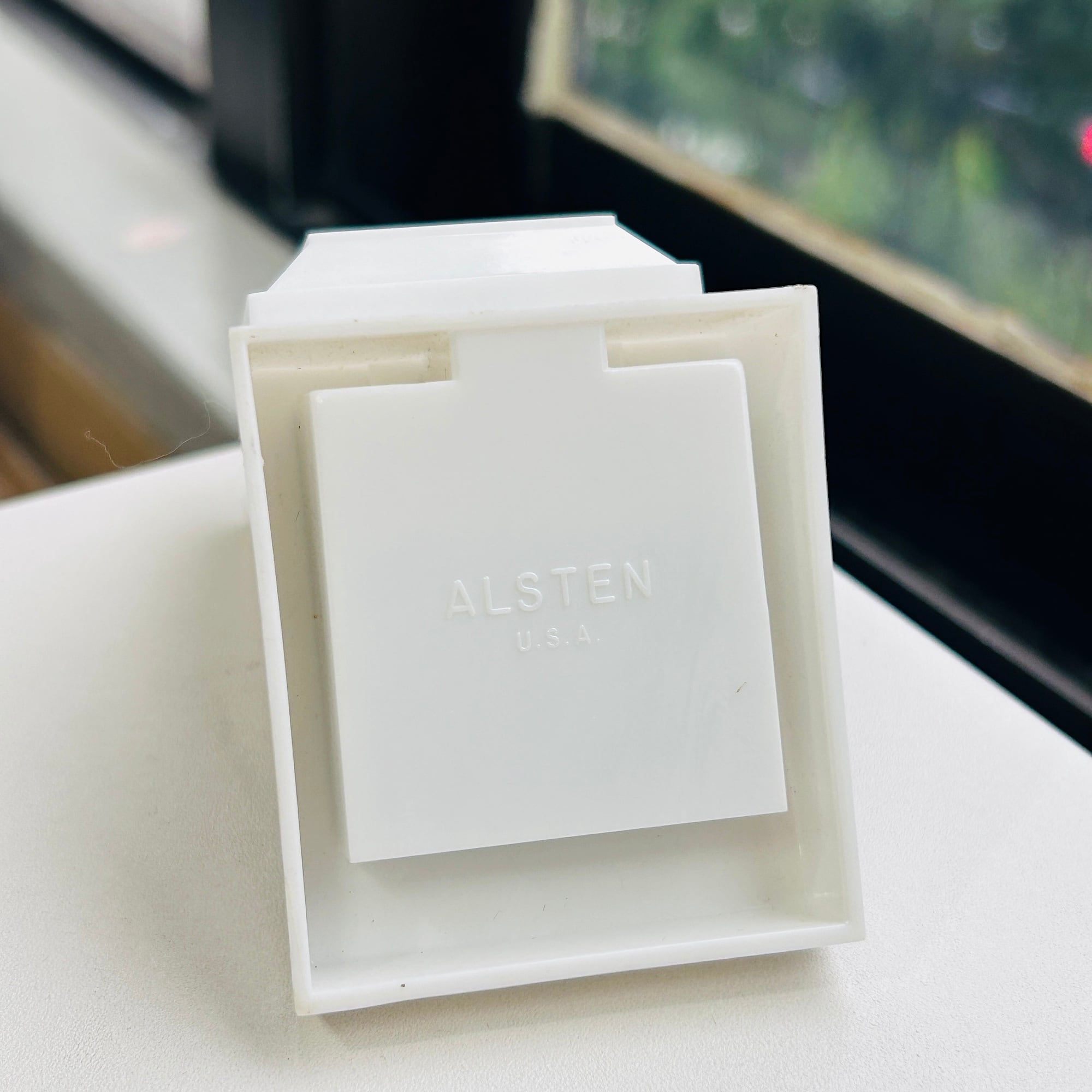 パカっと蓋が開閉するリングボックス。白いプラスチック製です。中がグリーンベルベット。バンド幅が広いリングはスリットに入りません。蓋の内側にショップシールが残っています。箱の底に「ALSTEN」「U.S.A.」。