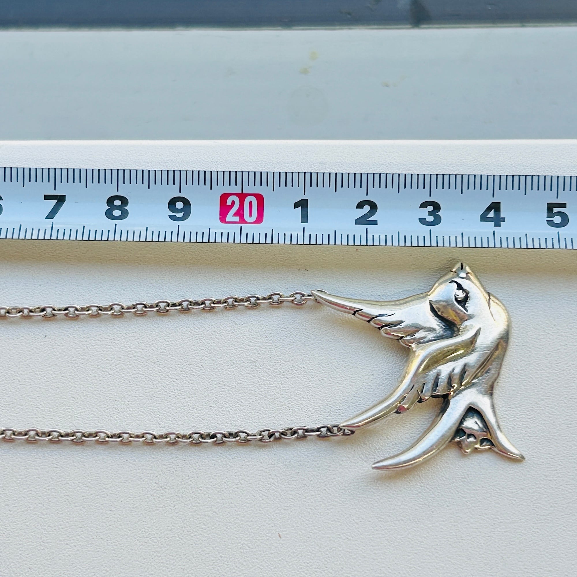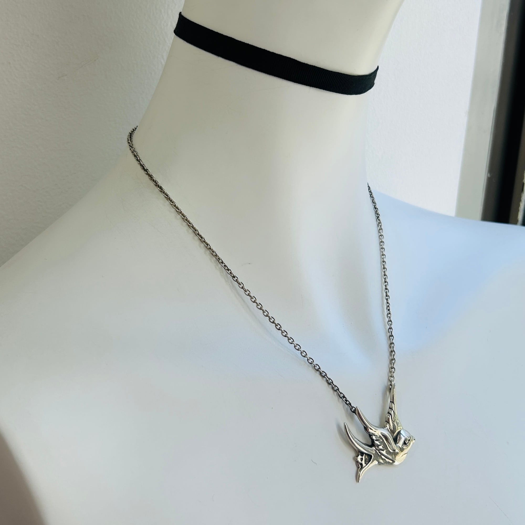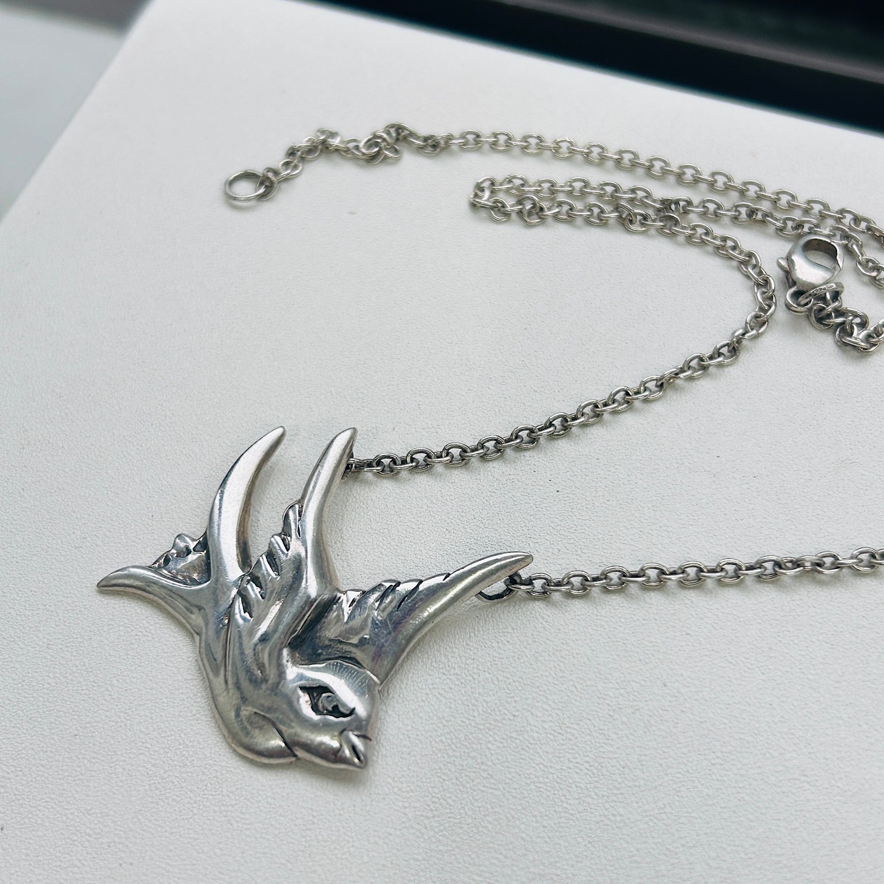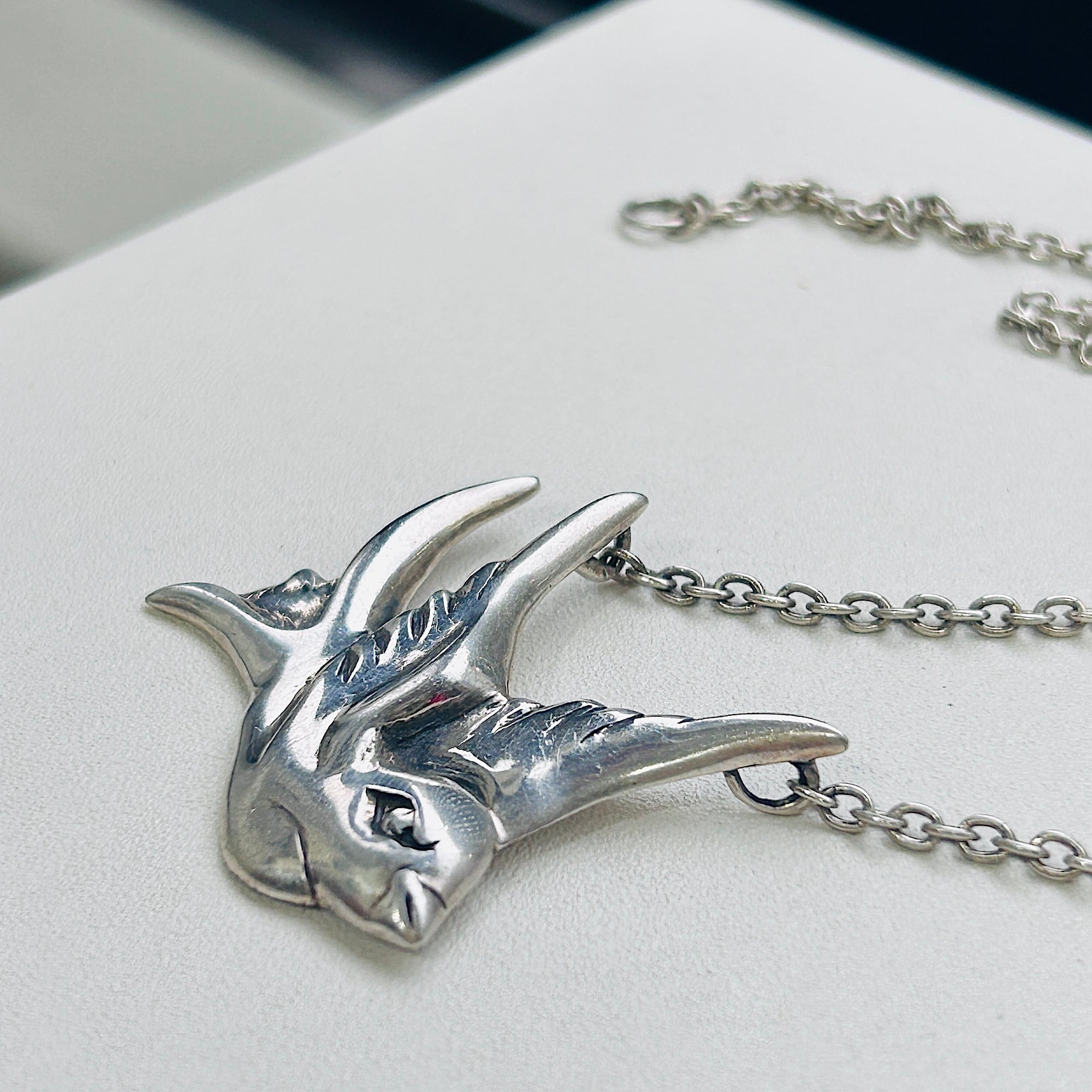 「Swallow」と呼ばれるクラシックなラッキーモチーフ「ツバメ」の両吊りネックレス。燻しの効いた重厚なUKシルバー。鋭い目付きと肉厚感のある羽がロックでカッコいいです。「Swallow」は「幸運・幸福」「自由・希望」「無事帰還」etc. を象徴するモチーフでアクセサリーやタトゥーで多く用いられています。裏の刻印は「TGF」「925」、ロンドンマーク、製造は2015年です。