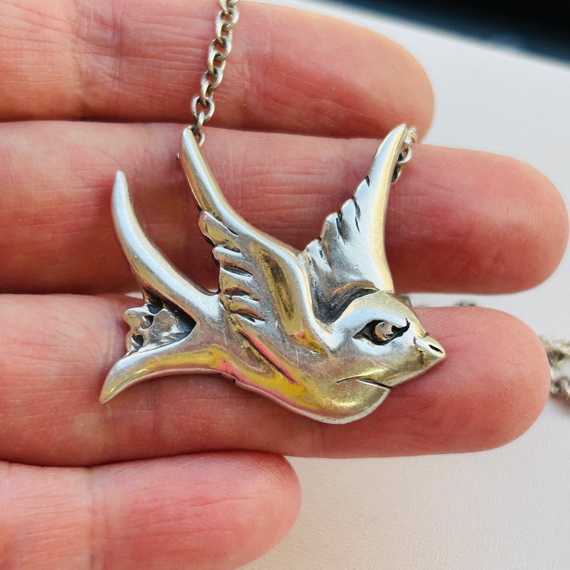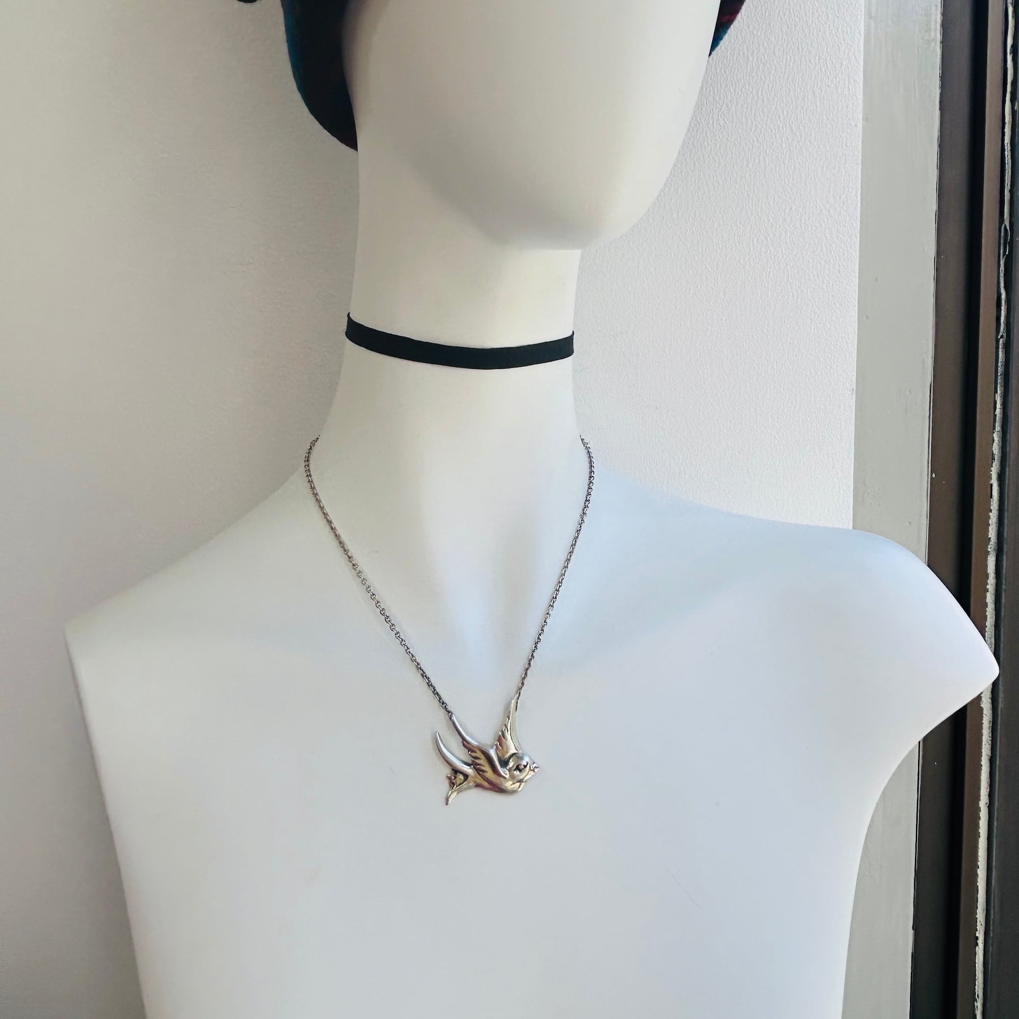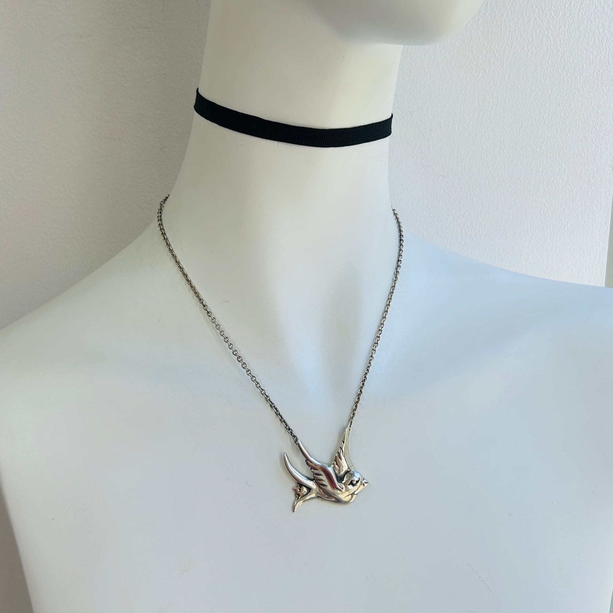 「Swallow」と呼ばれるクラシックなラッキーモチーフ「ツバメ」の両吊りネックレス。燻しの効いた重厚なUKシルバー。鋭い目付きと肉厚感のある羽がロックでカッコいいです。「Swallow」は「幸運・幸福」「自由・希望」「無事帰還」etc. を象徴するモチーフでアクセサリーやタトゥーで多く用いられています。裏の刻印は「TGF」「925」、ロンドンマーク、製造は2015年です。