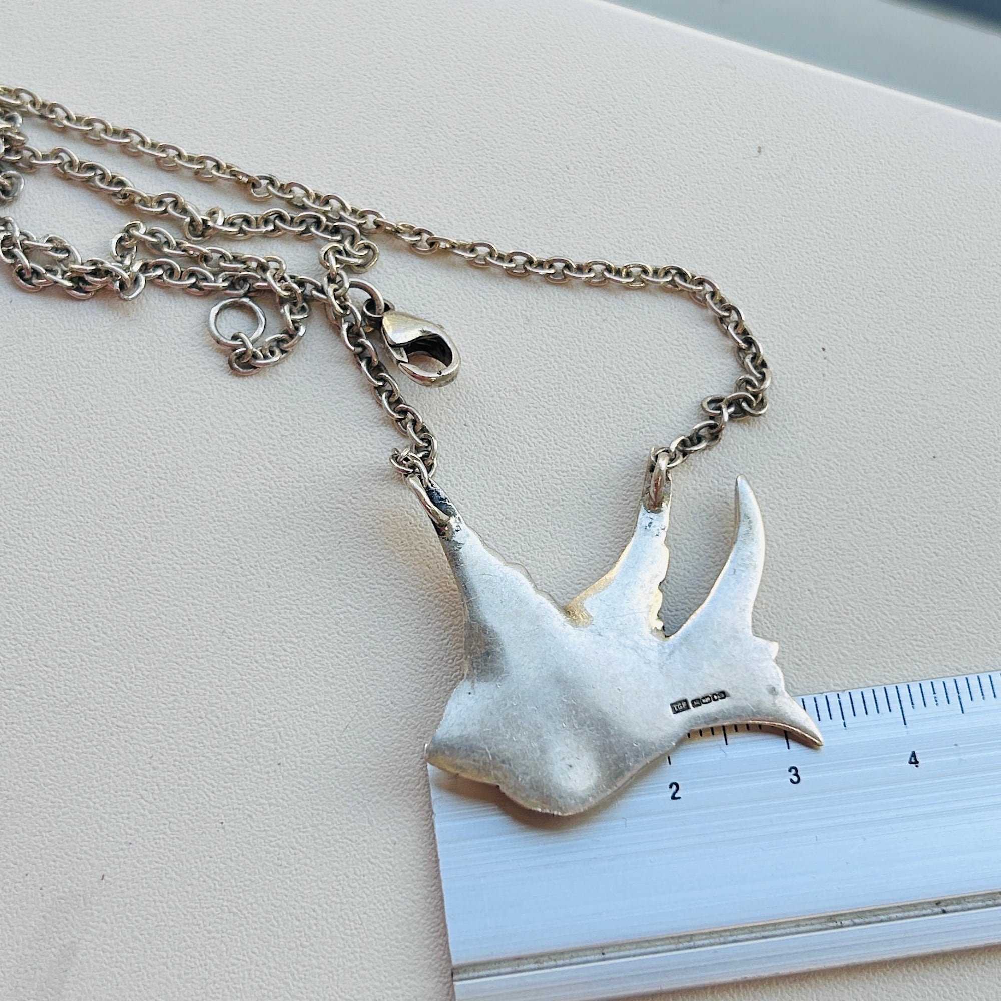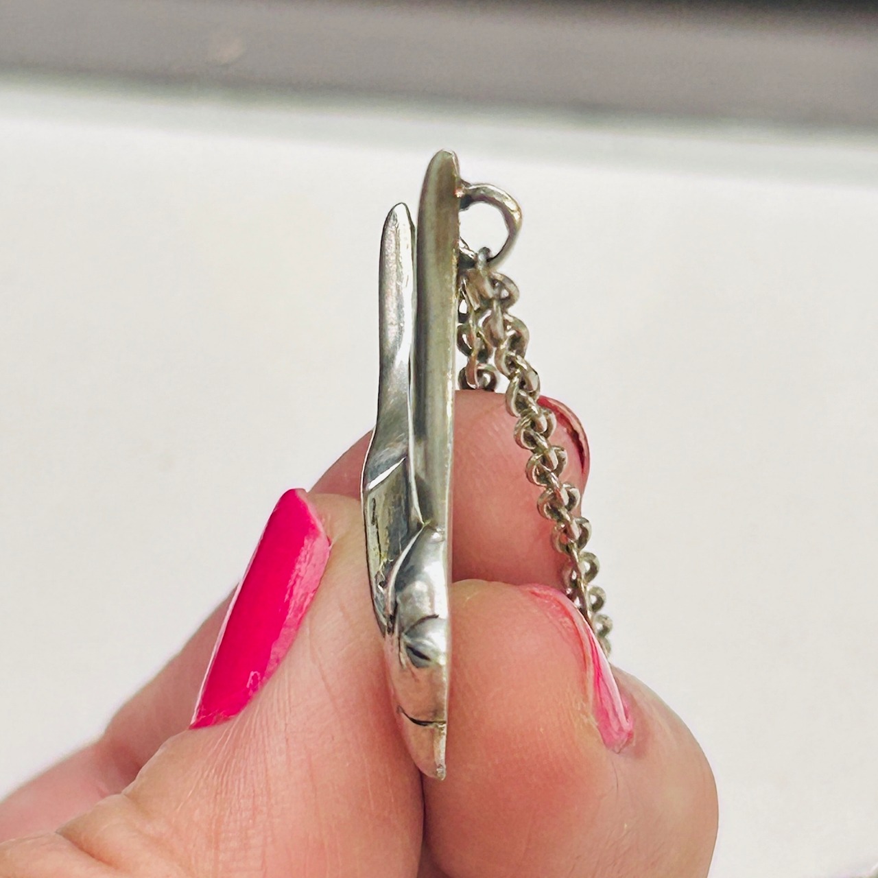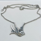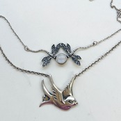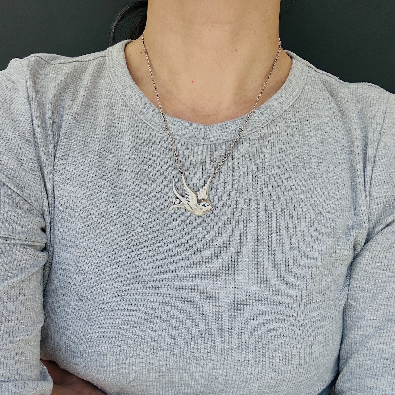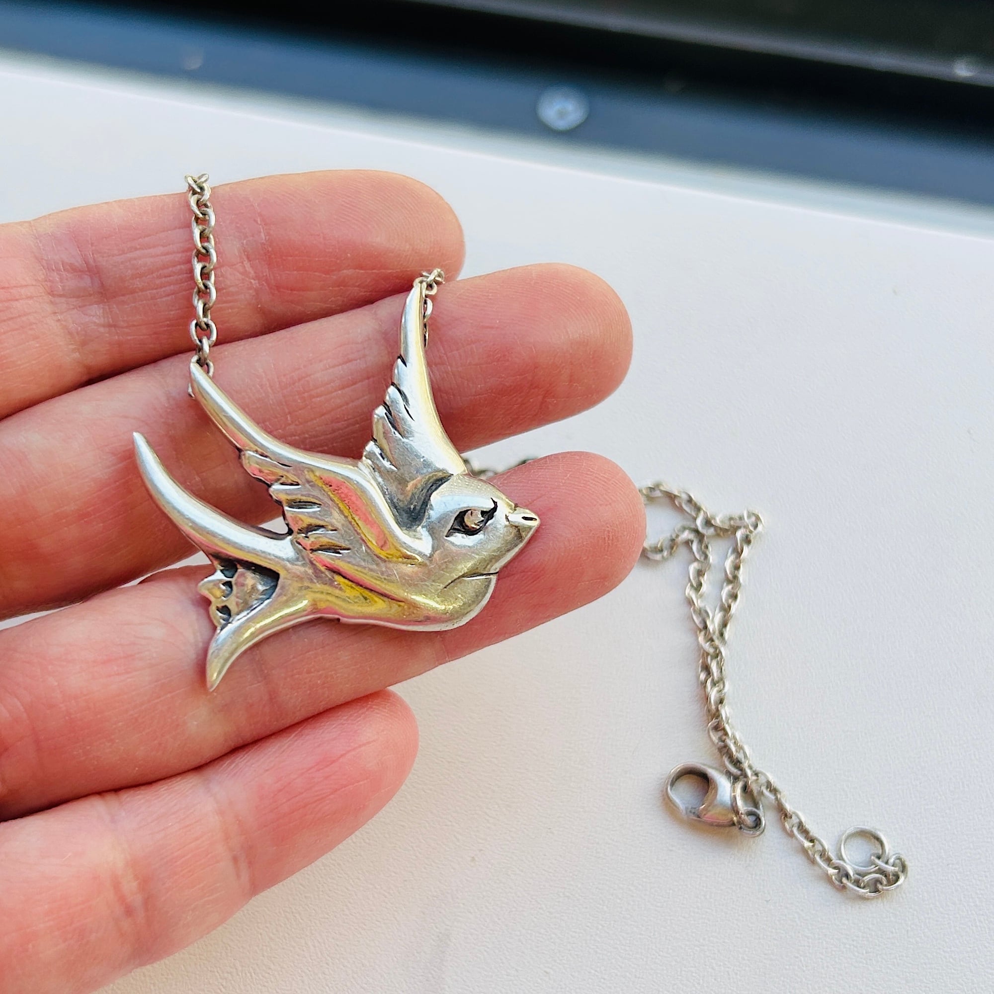 「Swallow」と呼ばれるクラシックなラッキーモチーフ「ツバメ」の両吊りネックレス。燻しの効いた重厚なUKシルバー。鋭い目付きと肉厚感のある羽がロックでカッコいいです。「Swallow」は「幸運・幸福」「自由・希望」「無事帰還」etc. を象徴するモチーフでアクセサリーやタトゥーで多く用いられています。裏の刻印は「TGF」「925」、ロンドンマーク、製造は2015年です。