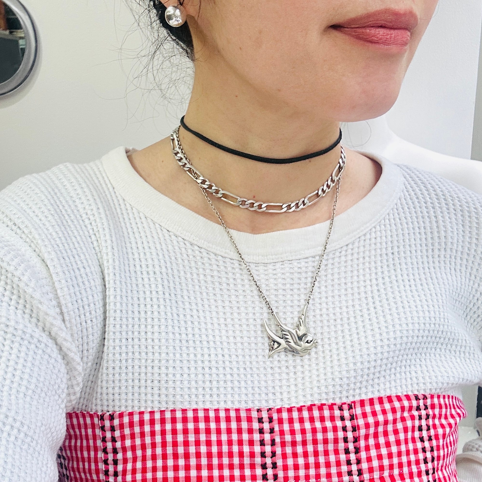 「Swallow」と呼ばれるクラシックなラッキーモチーフ「ツバメ」の両吊りネックレス。燻しの効いた重厚なUKシルバー。鋭い目付きと肉厚な羽がロックでカッコいいです。「Swallow」は「幸運・幸福」「自由・希望」「無事帰還」etc. を象徴するモチーフでアクセサリーやタトゥーで多く用いられています。裏の刻印は「TGF」「925」、ロンドンマーク、製造は2015年です。
