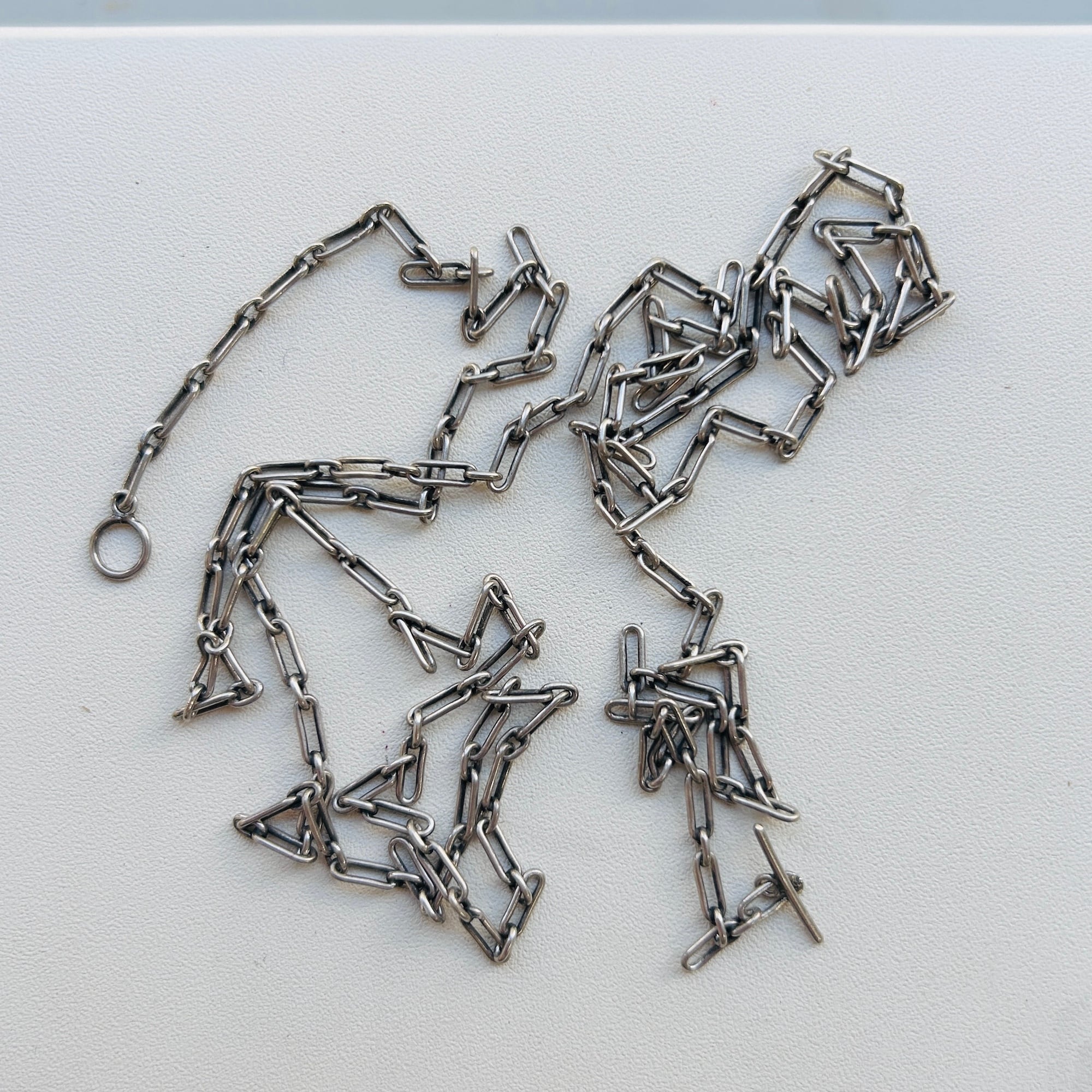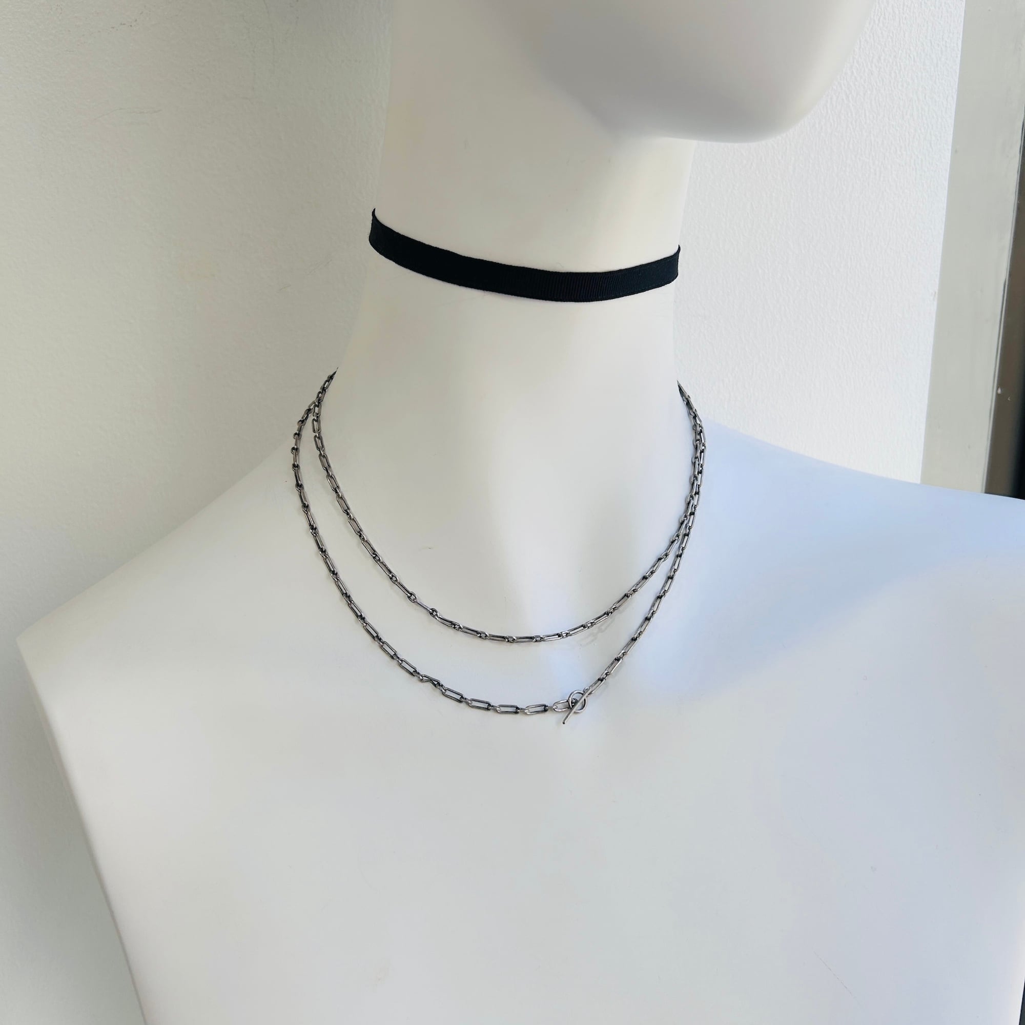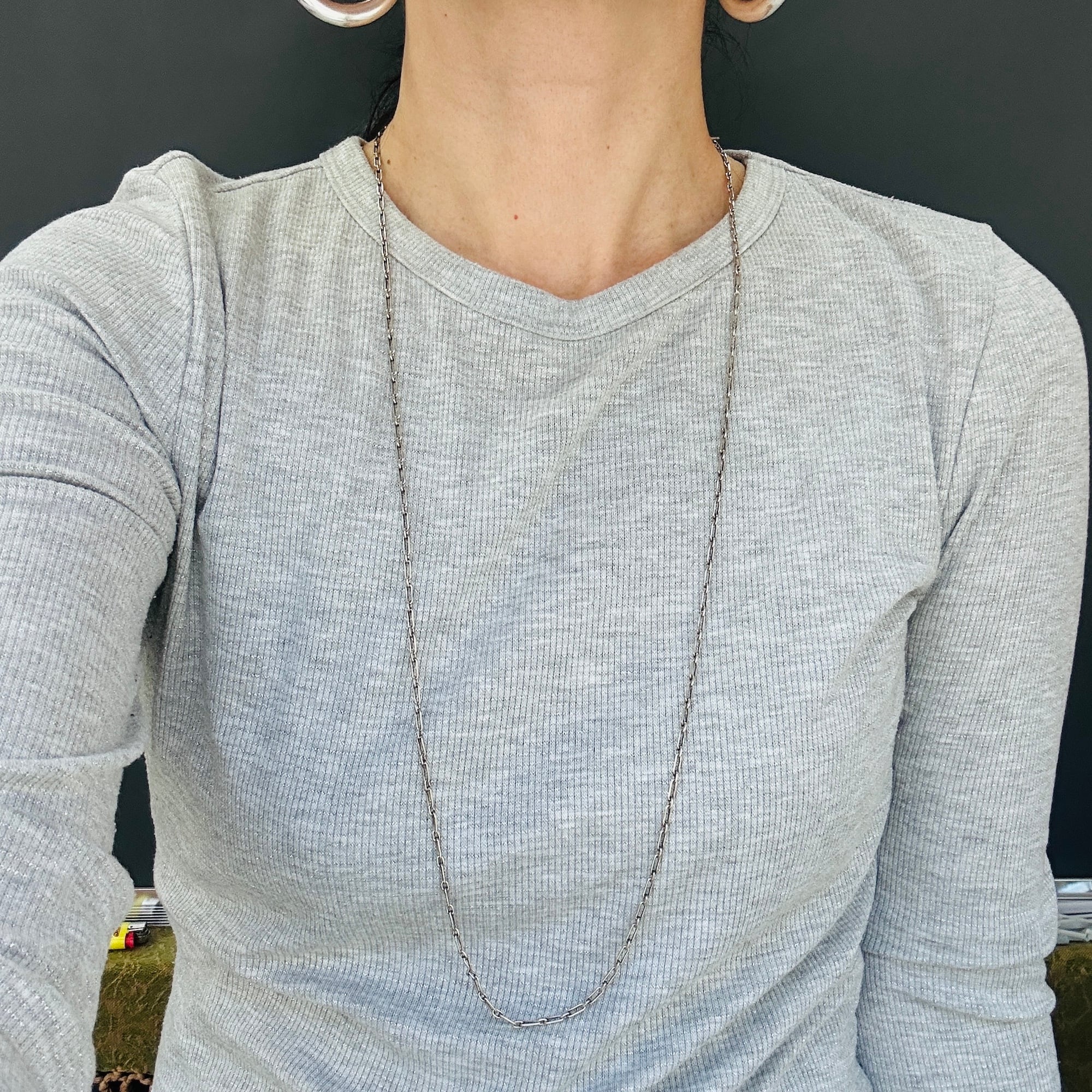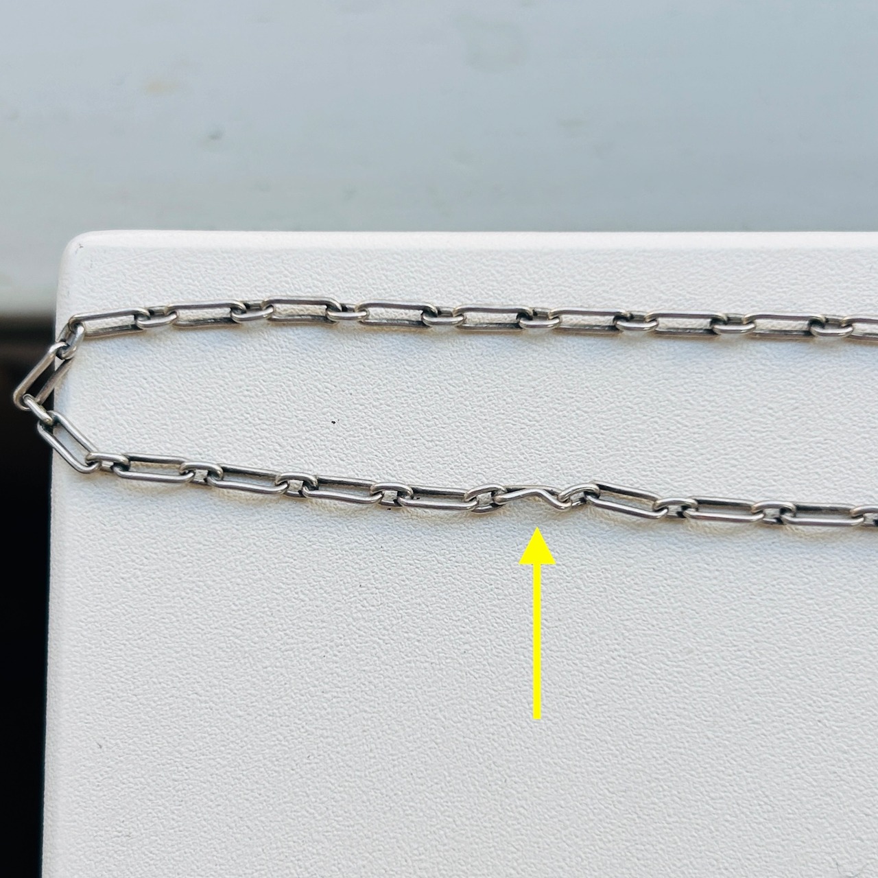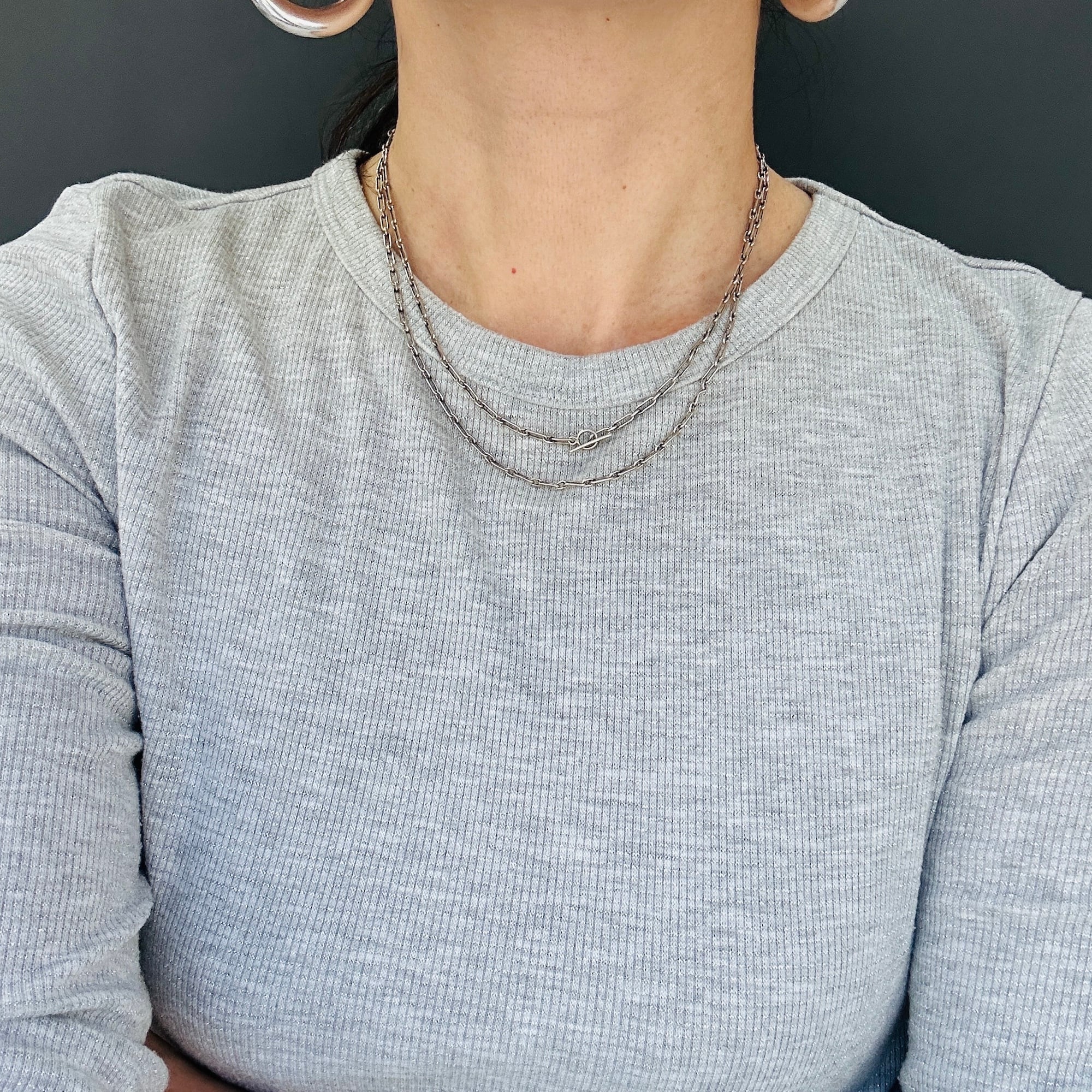 華奢なリンクチェーンネックレス。デザイン性のあるチェーン形状、2重巻きで着けることができる長さ、小さなトグルクラスプが特徴のユニークなチェーンです。グレートーンのセミマットなシルバーです。シックなブラックドレスに1連で着けるとスタイリッシュな雰囲気になりそう。2連ならシャツの間から覗かせるのもオシャレです。チャームを着けて違う楽しみ方もできます。刻印なしシルバー。コマが1つ曲がっています。