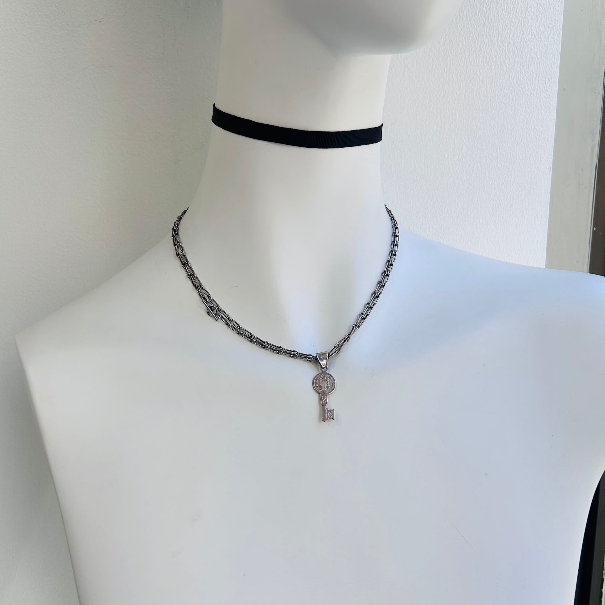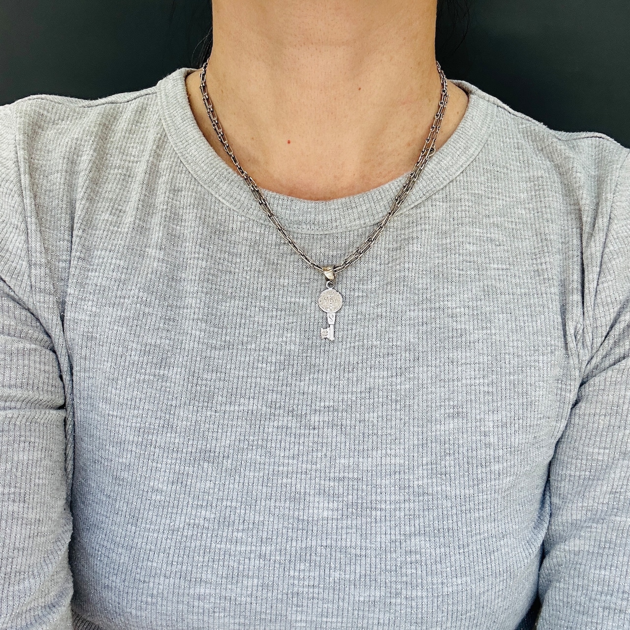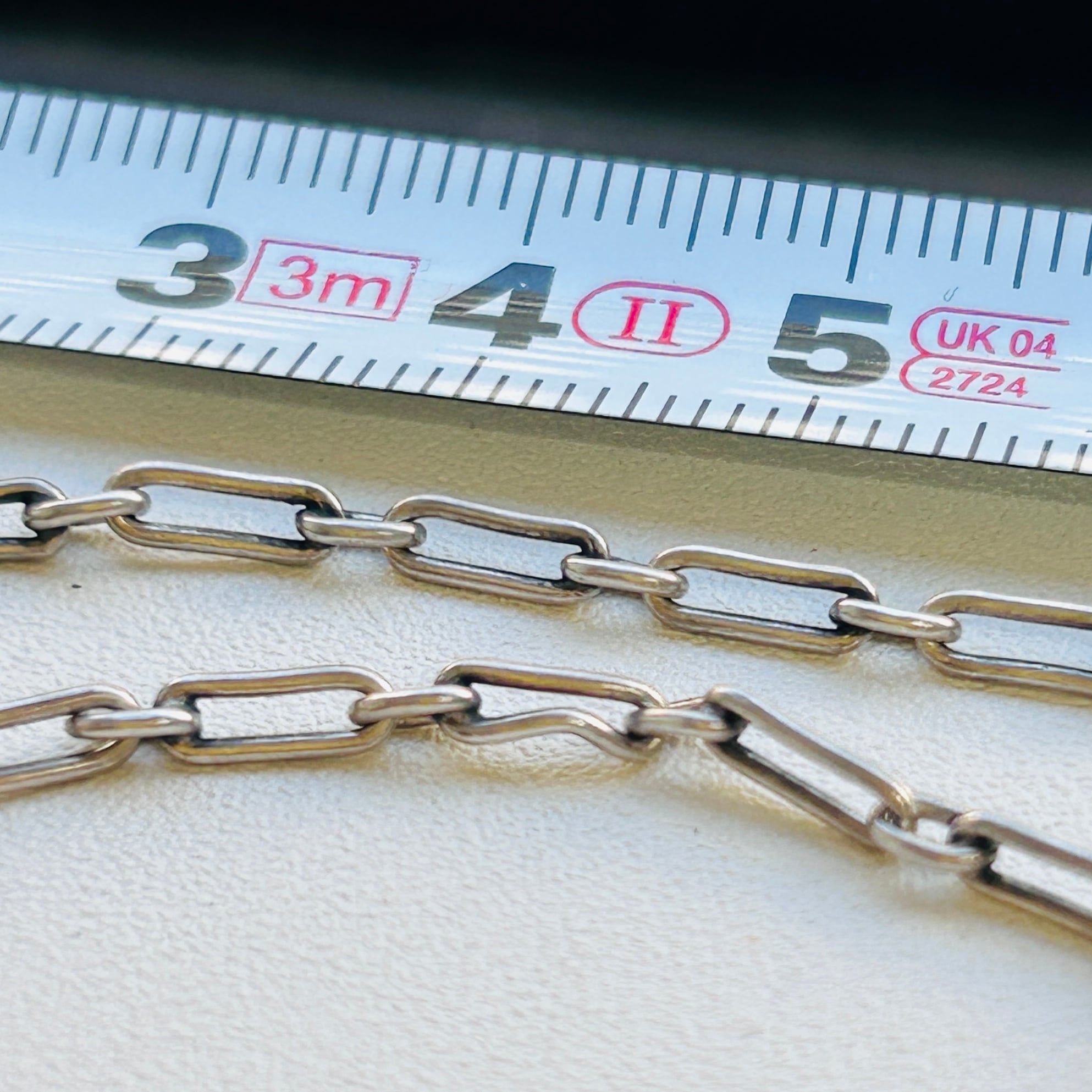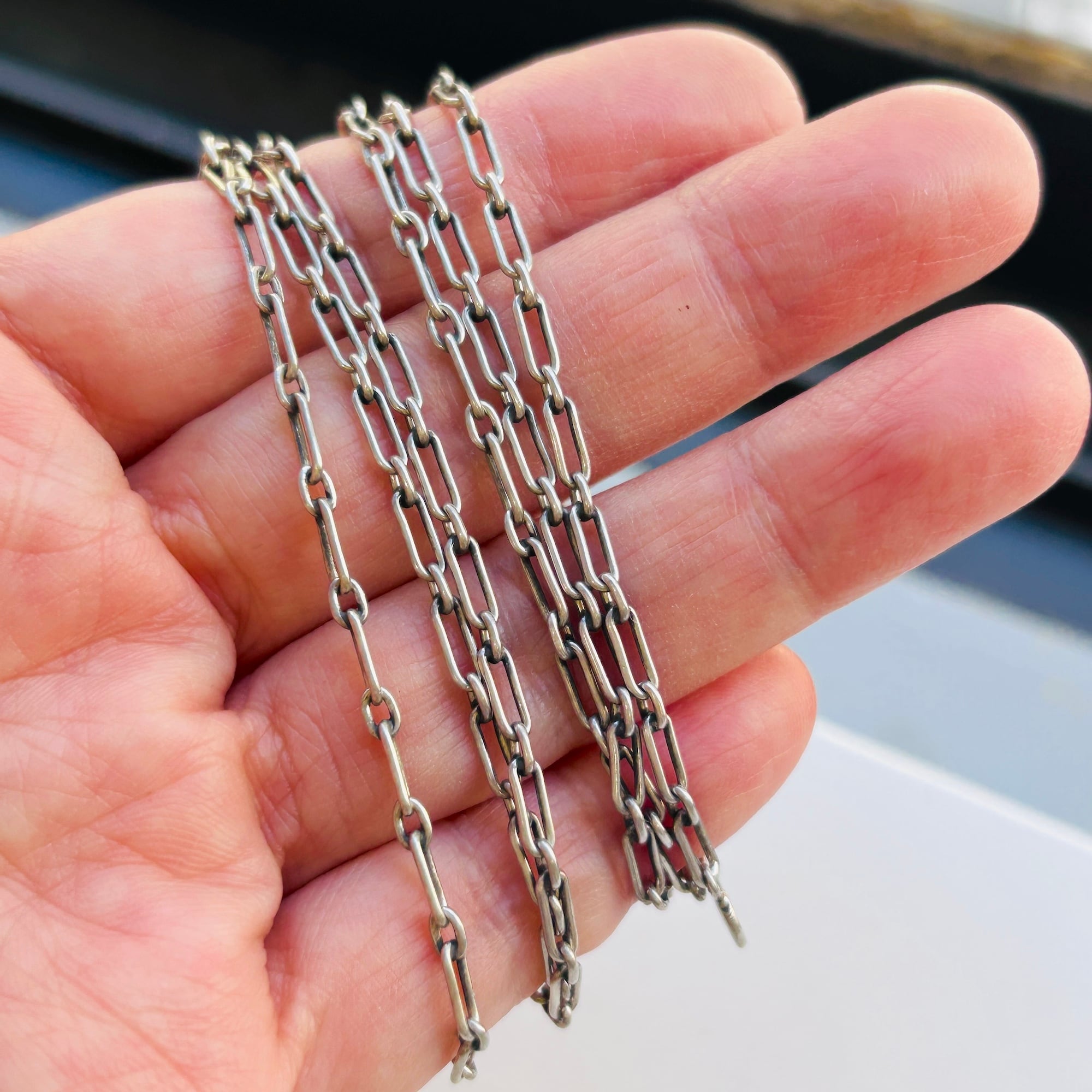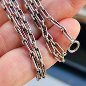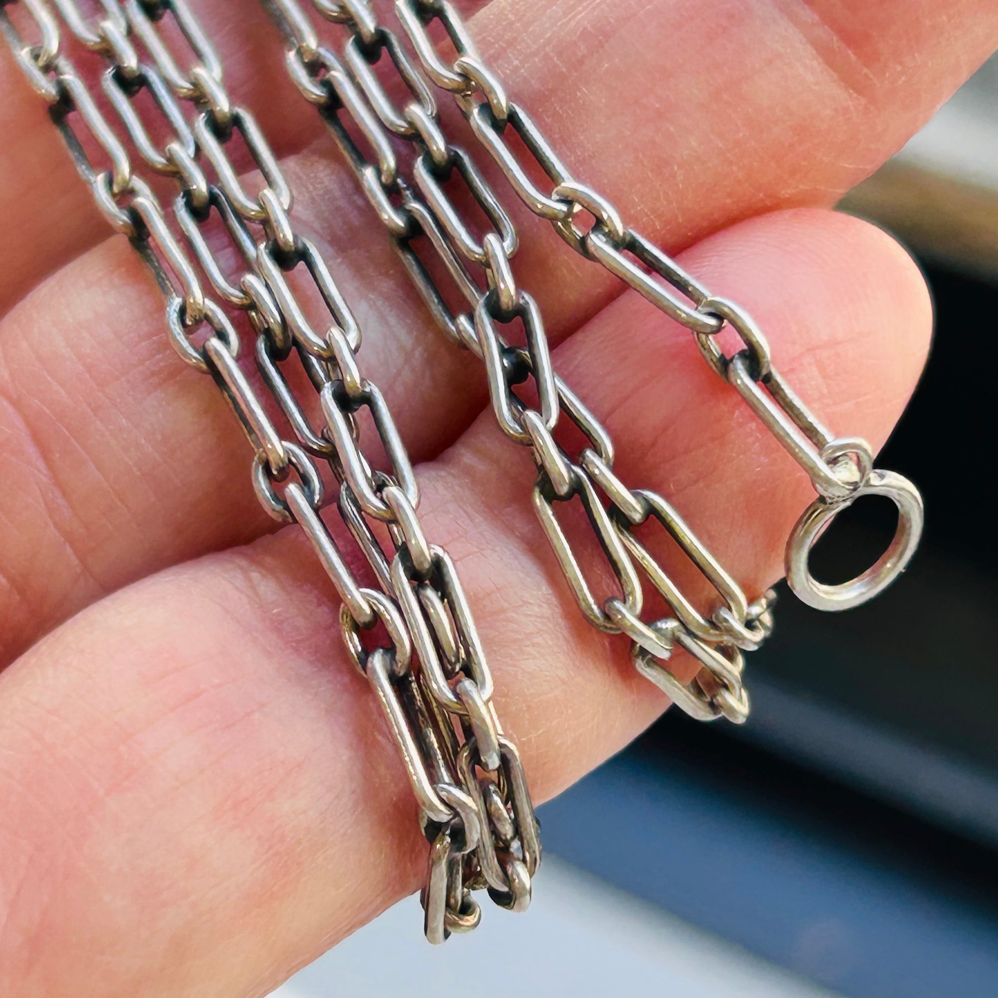 華奢なリンクチェーンネックレス。デザイン性のあるチェーン形状、2重巻きで着けることができる長さ、小さなトグルクラスプが特徴のユニークなチェーンです。グレートーンのセミマットなシルバーです。シックなブラックドレスに1連で着けるとスタイリッシュな雰囲気になりそう。2連ならシャツの間から覗かせるのもオシャレです。チャームを着けて違う楽しみ方もできます。刻印なしシルバー。コマが1つ曲がっています。