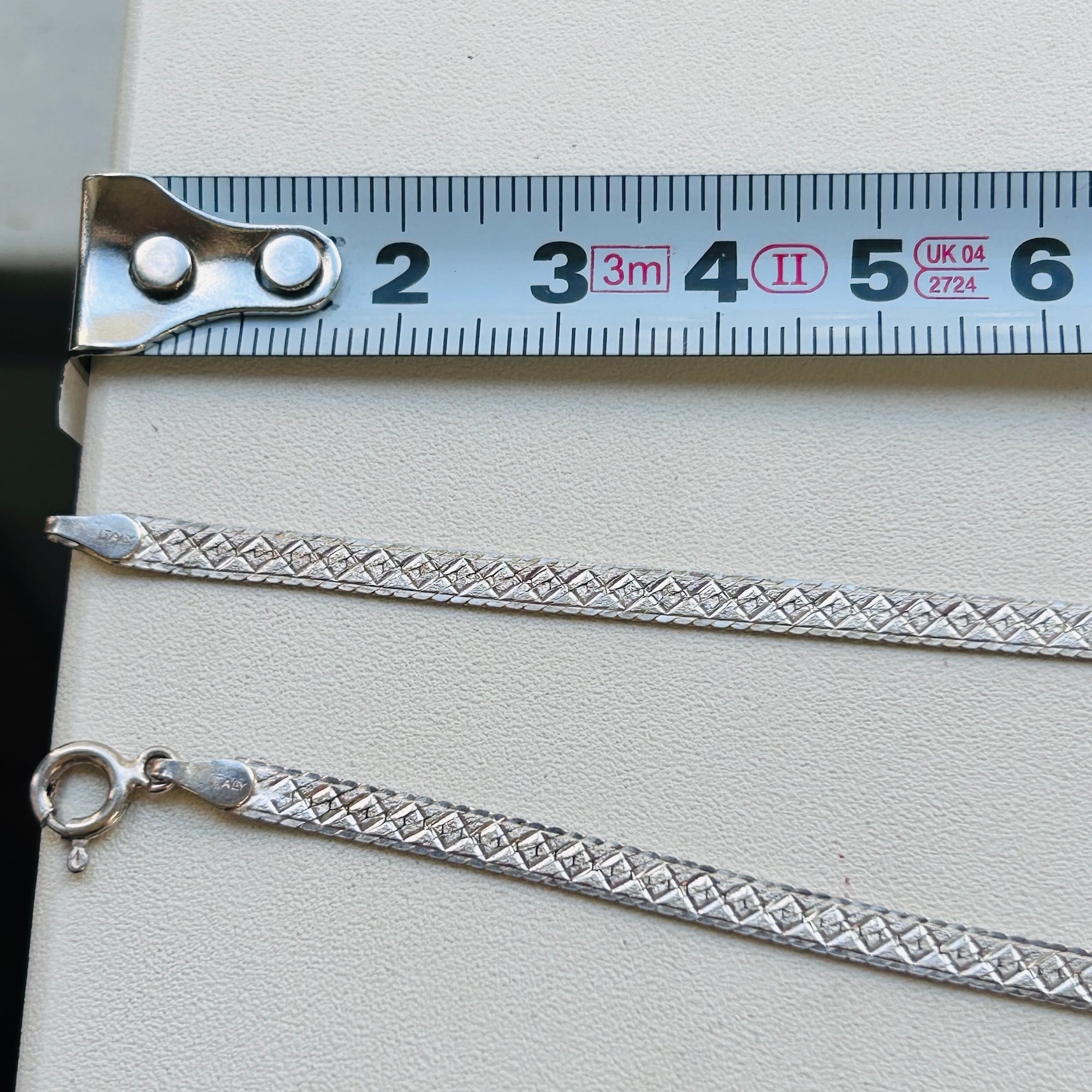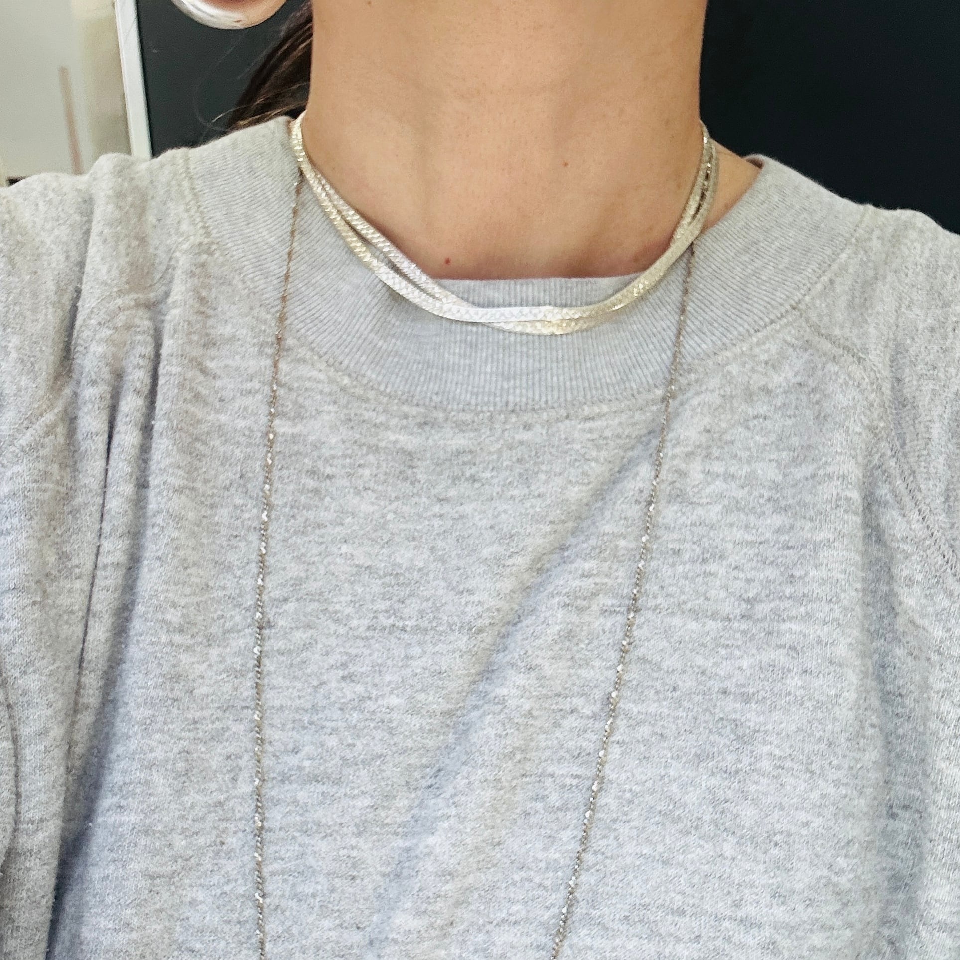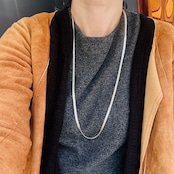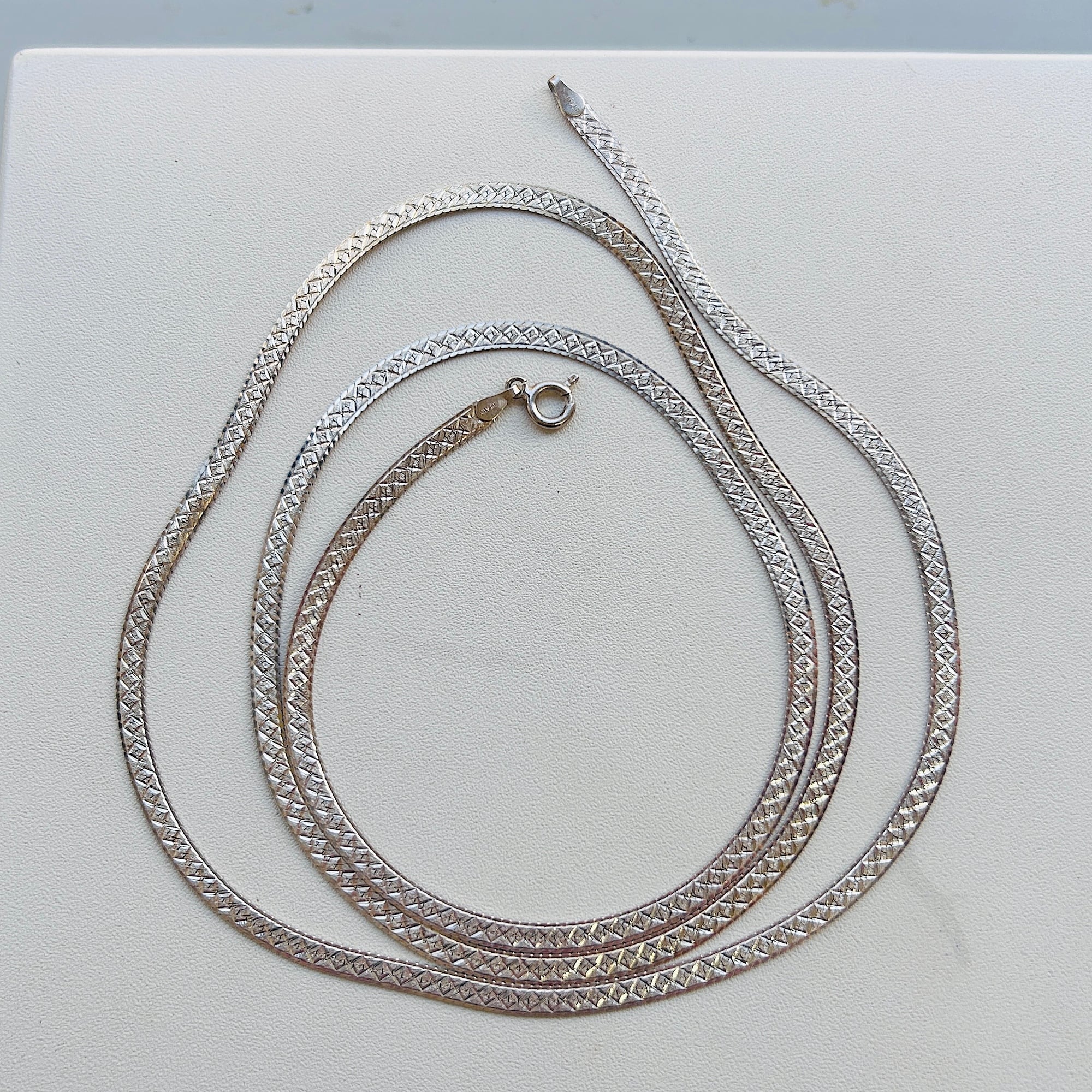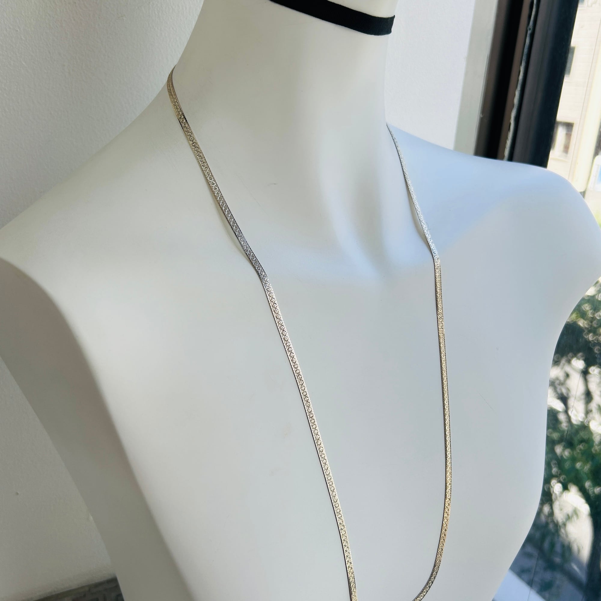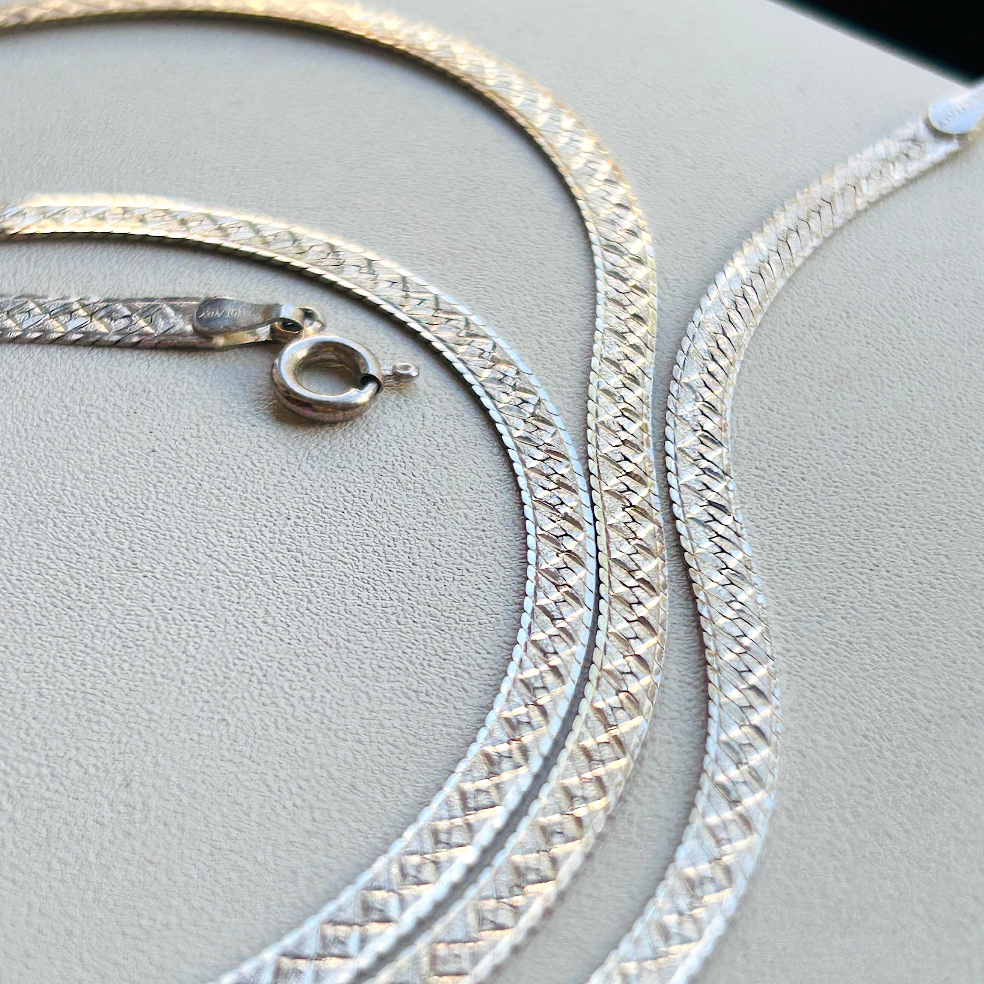 両面に細かい凹み模様とダイヤ柄がプレスされたヘリンボーンチェーン。セミマットなアルミ調の質感です。着けるだけでサマになるエレガントでかっこいいヘリンボーンネックレスです。2重巻きでも楽しんで頂けます。手早くパパっと首に巻く方がニュアンスよく決まるかなと思います。ヘリンボーンは柔らかく動きません。半分に曲げると折れ曲がってしまいますのでご注意ください。「ITALY」「925」刻印。一番手っ取り早くて楽なお手入れ方法はウェットティッシュで挟んでギューっと滑らせていくだけでクスミが取れて輝きます。すぐ乾くので拭き取り不要です。