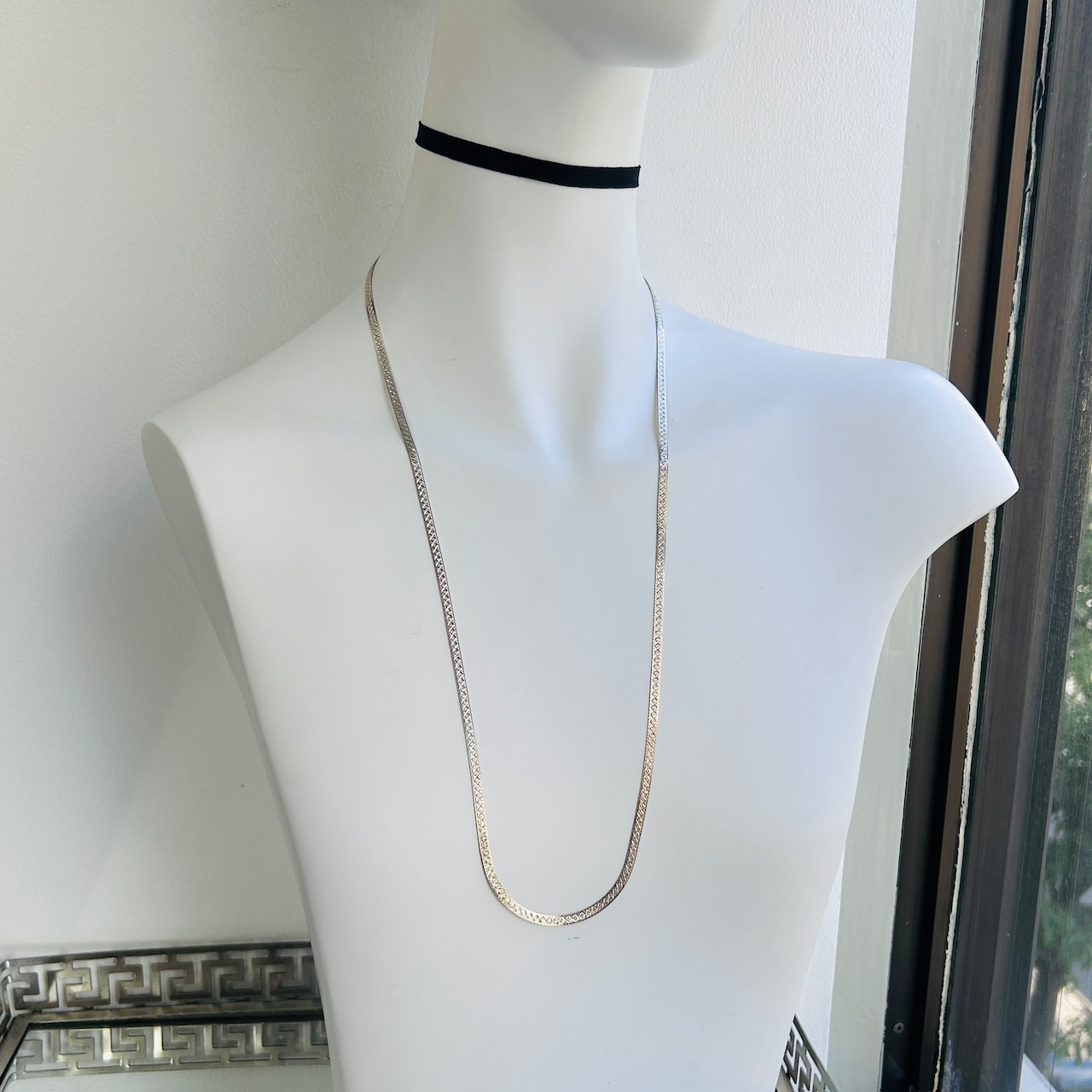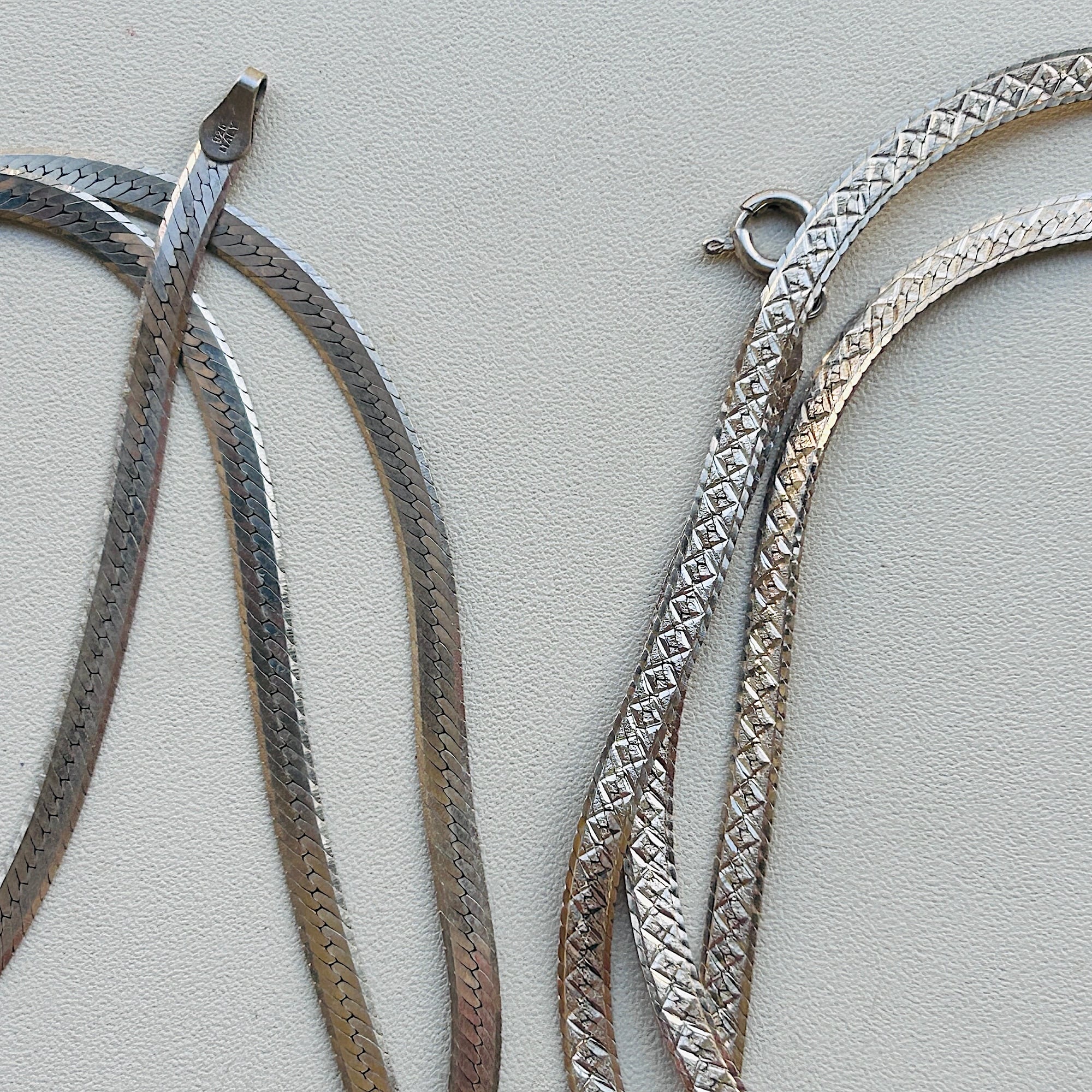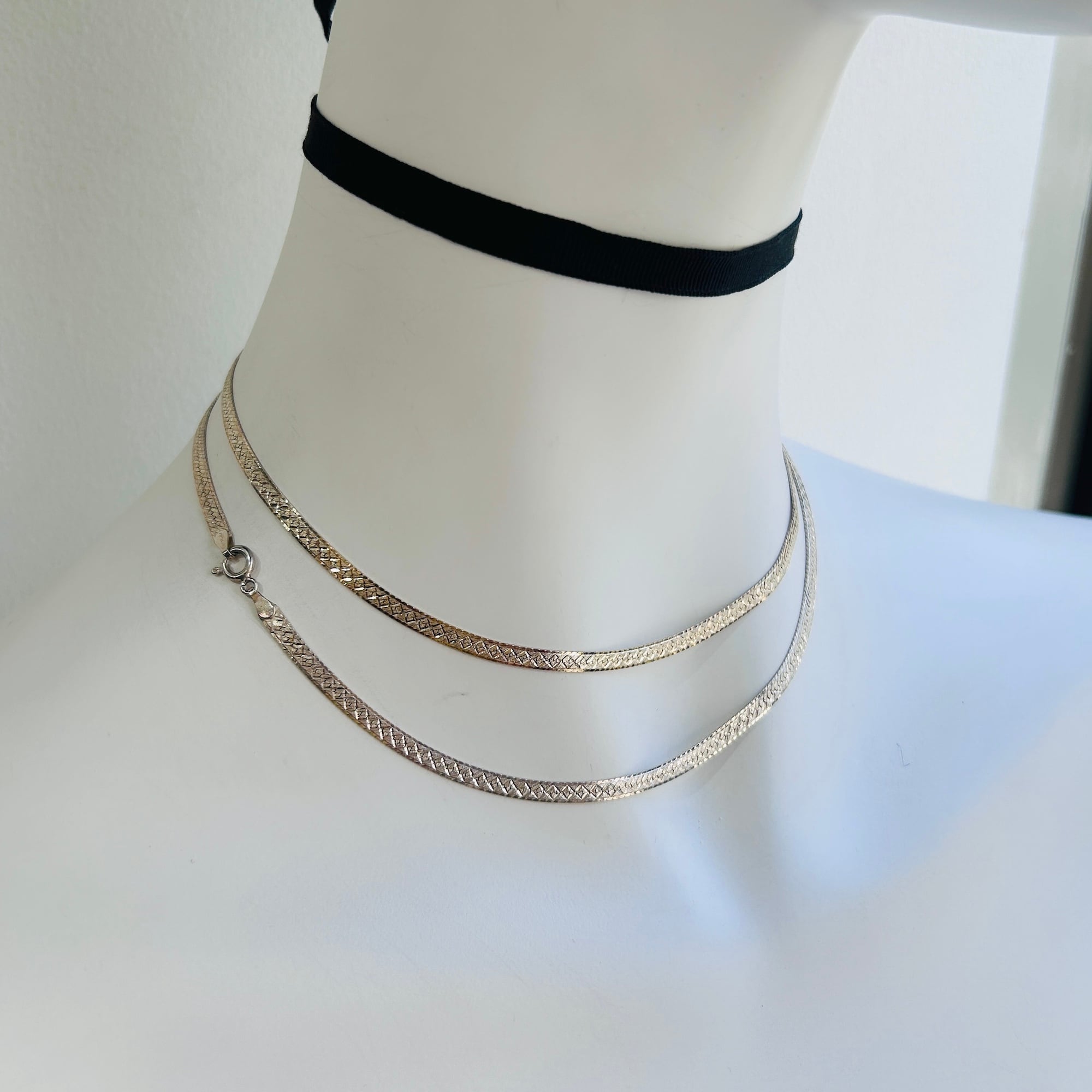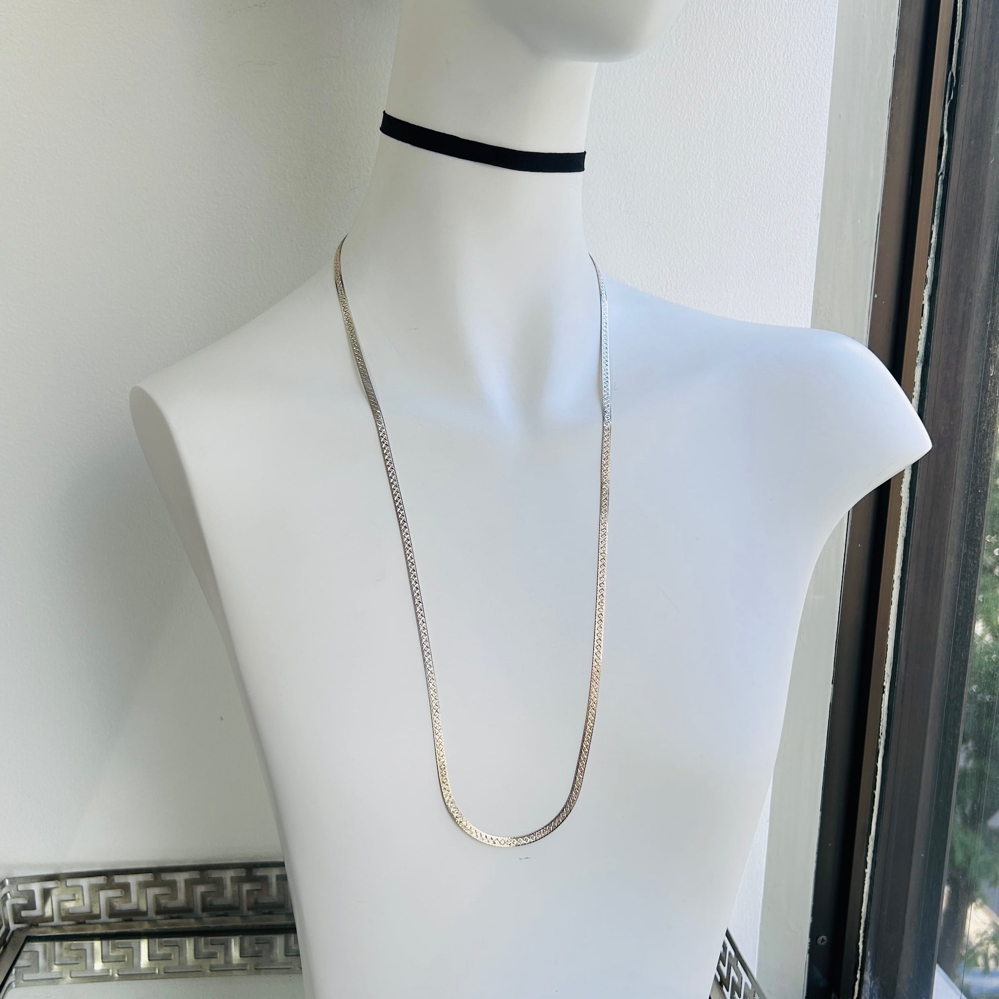 両面に細かい凹み模様とダイヤ柄がプレスされたヘリンボーンチェーン。セミマットなアルミ調の質感です。着けるだけでサマになるエレガントでかっこいいヘリンボーンネックレスです。2重巻きでも楽しんで頂けます。手早くパパっと首に巻く方がニュアンスよく決まるかなと思います。ヘリンボーンは柔らかく動きません。半分に曲げると折れ曲がってしまいますのでご注意ください。「ITALY」「925」刻印。一番手っ取り早くて楽なお手入れ方法はウェットティッシュで挟んでギューっと滑らせていくだけでクスミが取れて輝きます。すぐ乾くので拭き取り不要です。