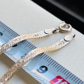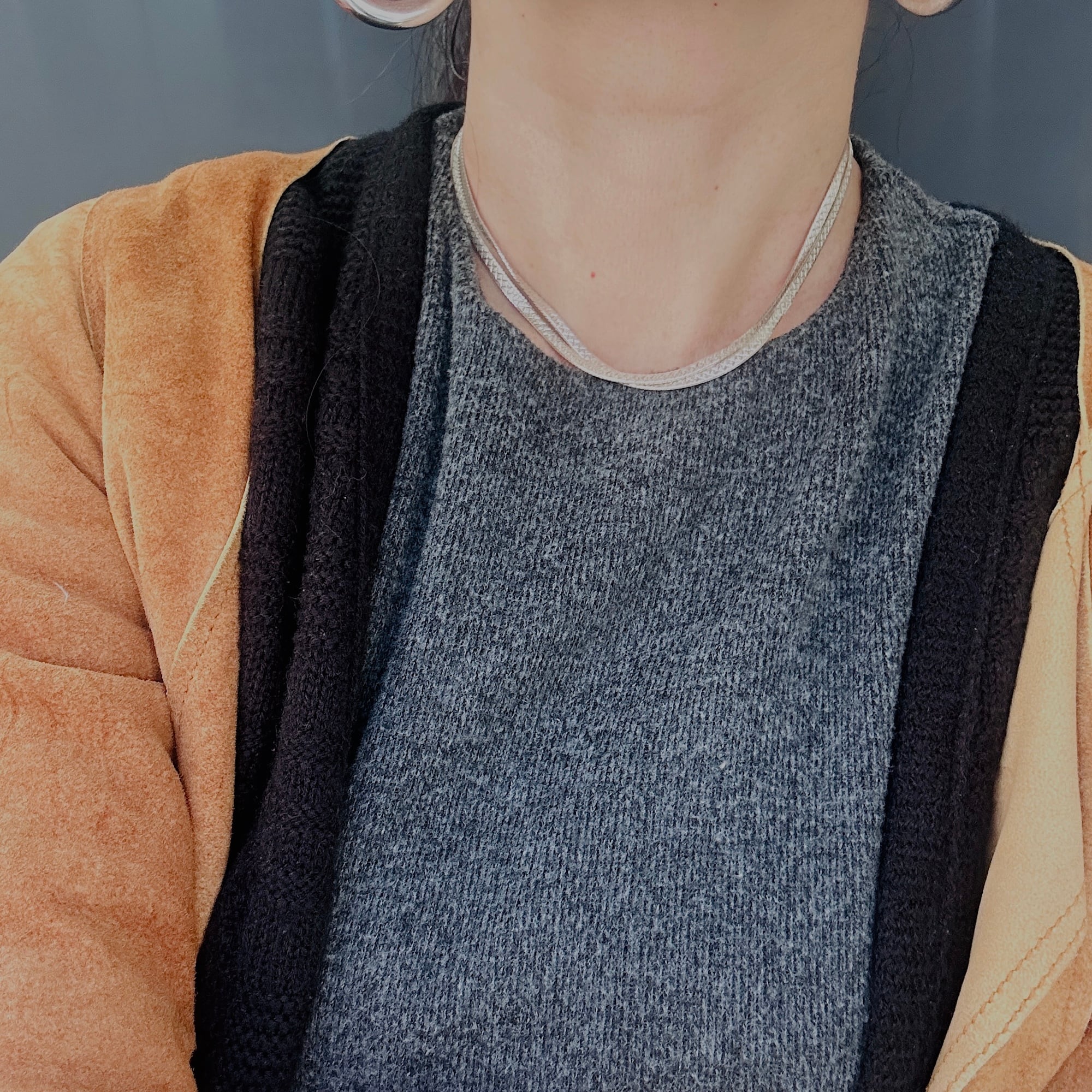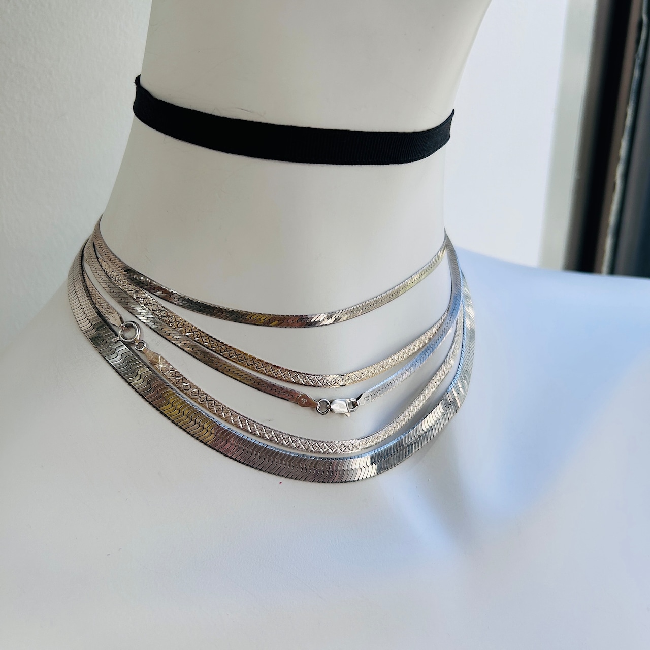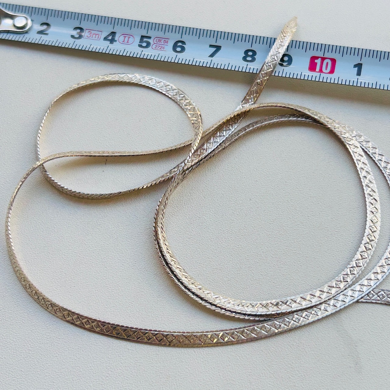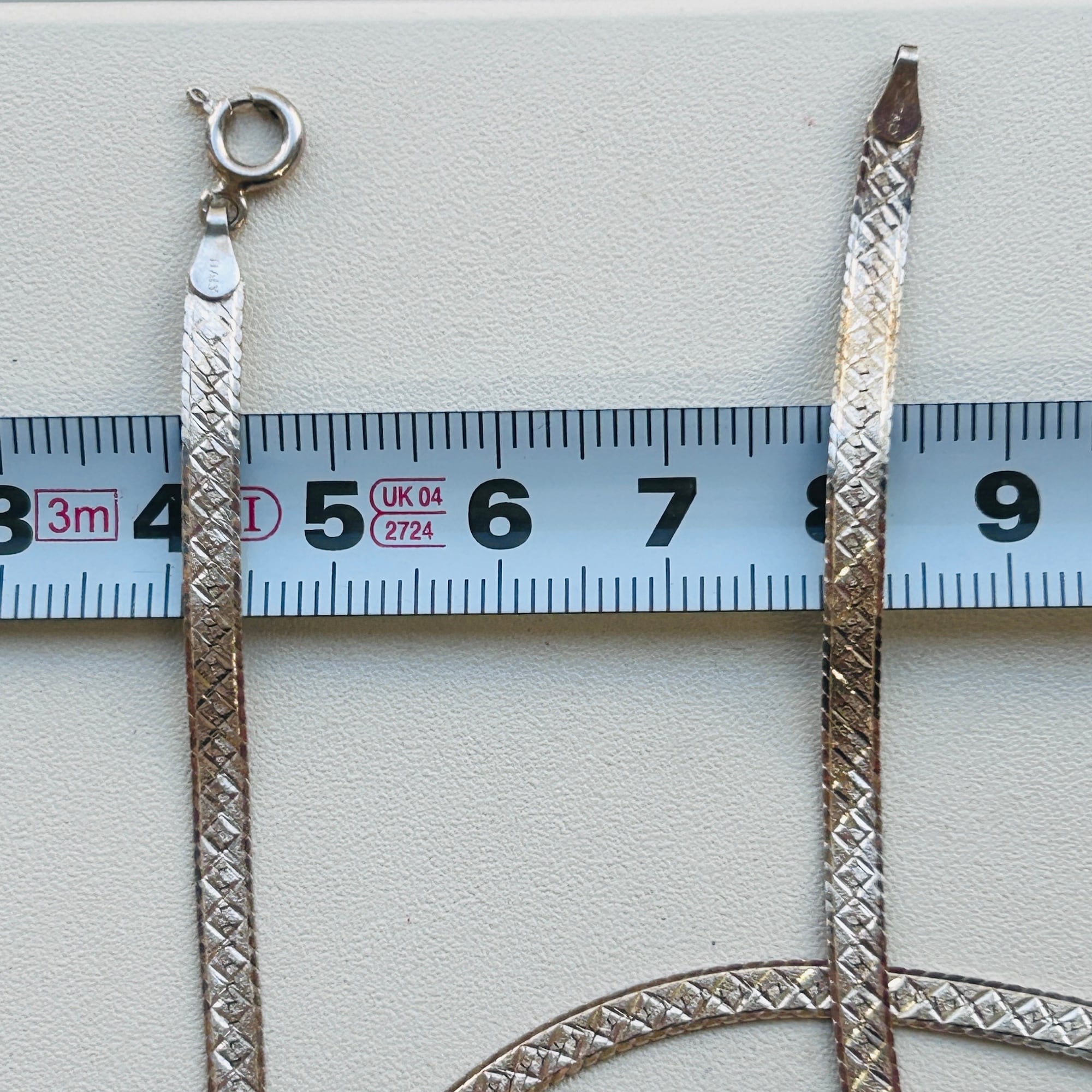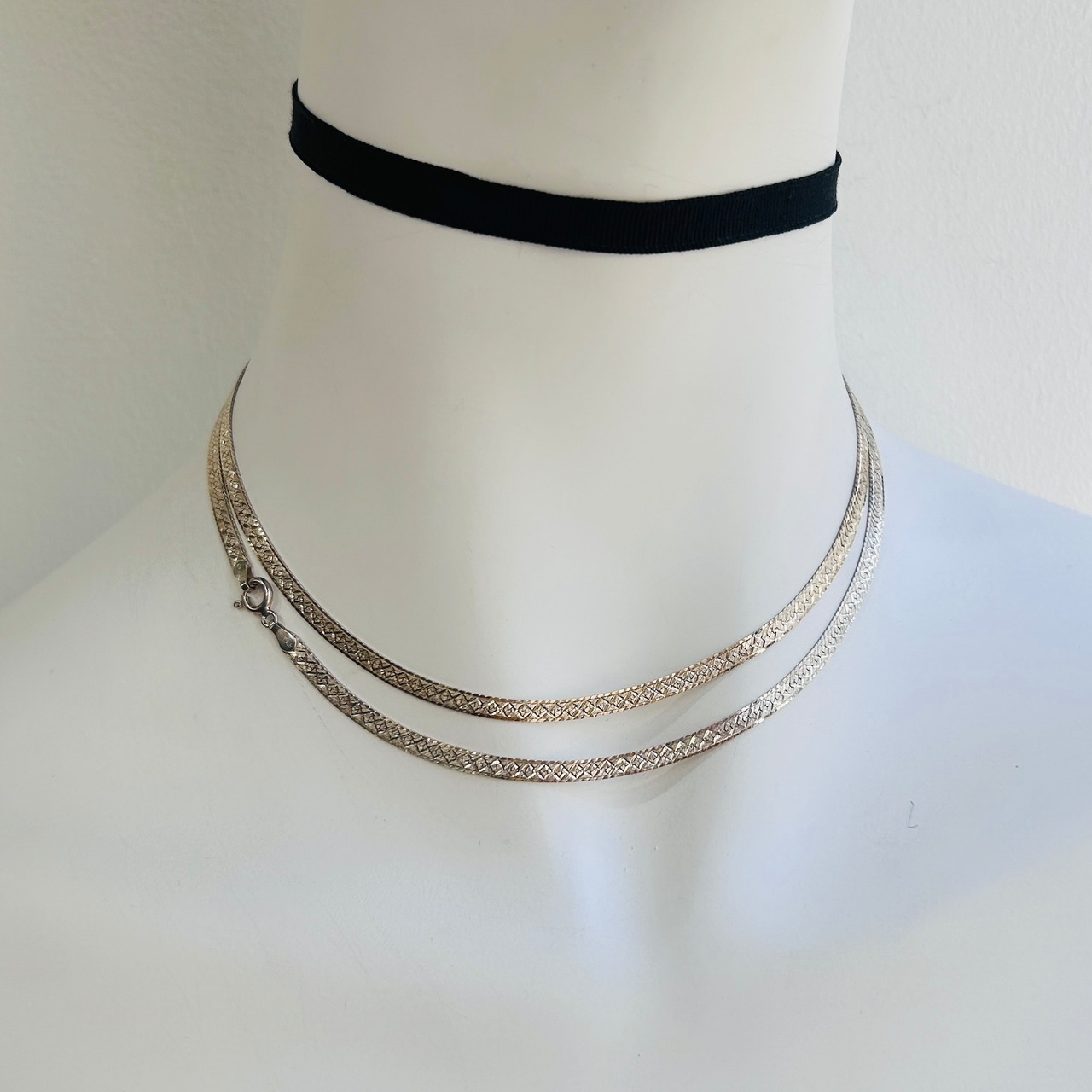両面に細かい凹み模様とダイヤ柄がプレスされたヘリンボーンチェーン。セミマットなアルミ調の質感です。着けるだけでサマになるエレガントでかっこいいヘリンボーンネックレスです。2重巻きでも楽しんで頂けます。手早くパパっと首に巻く方がニュアンスよく決まるかなと思います。ヘリンボーンは柔らかく動きません。半分に曲げると折れ曲がってしまいますのでご注意ください。「ITALY」「925」刻印。一番手っ取り早くて楽なお手入れ方法はウェットティッシュで挟んでギューっと滑らせていくだけでクスミが取れて輝きます。すぐ乾くので拭き取り不要です。