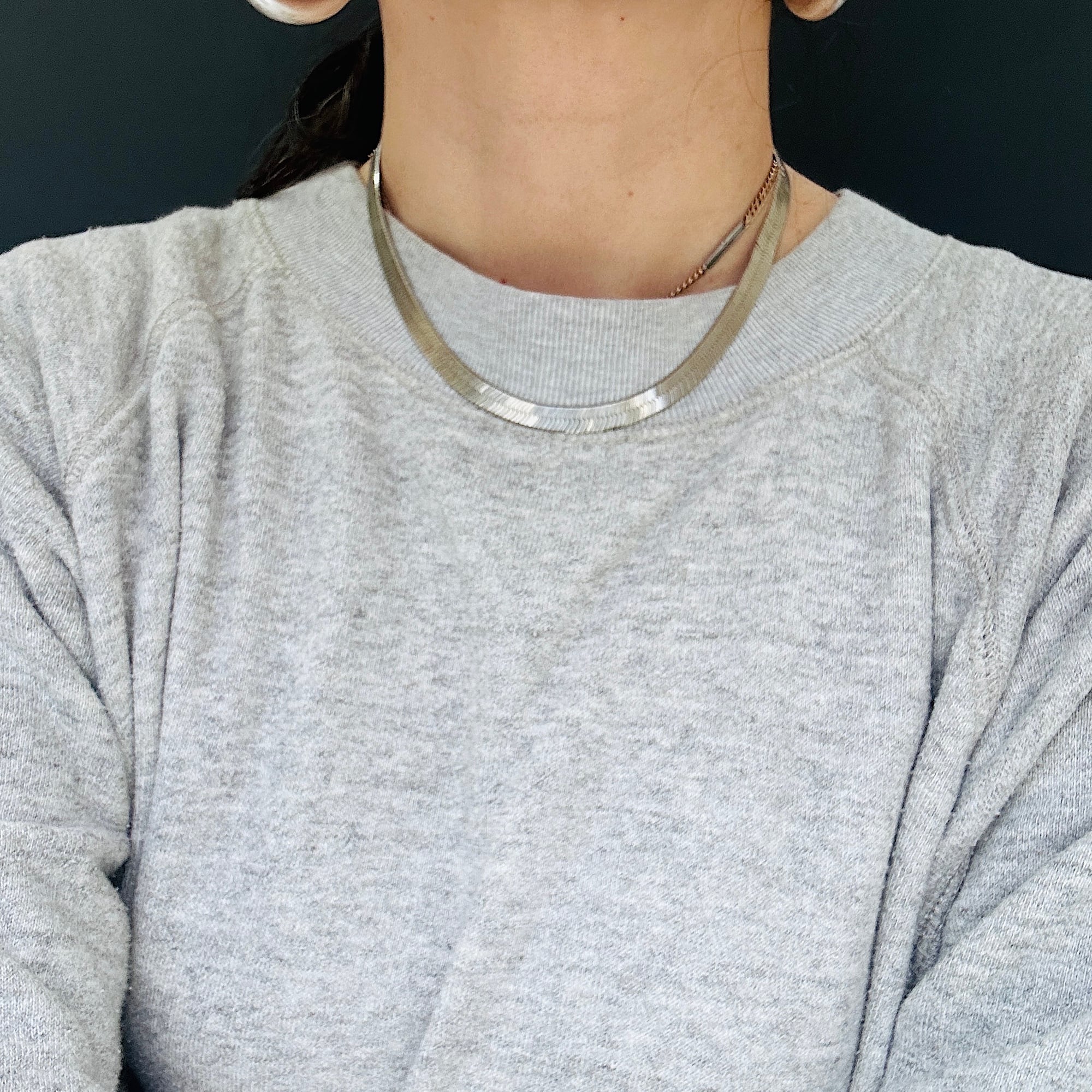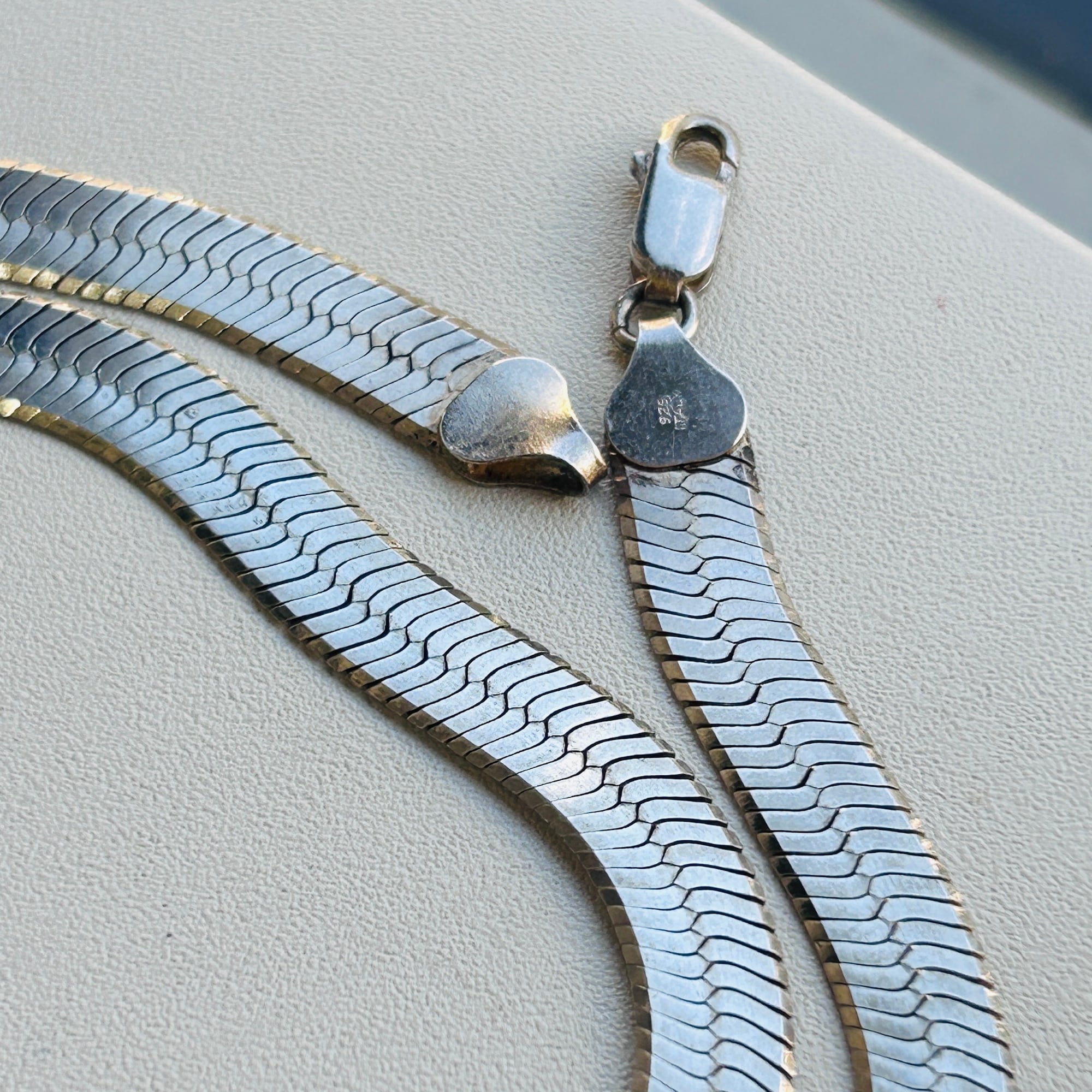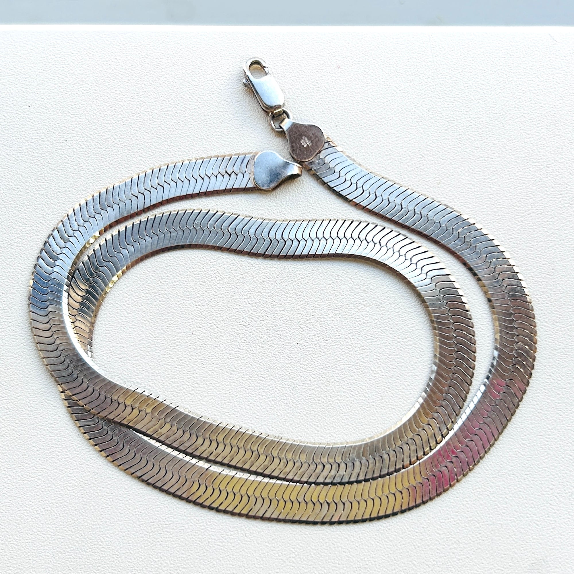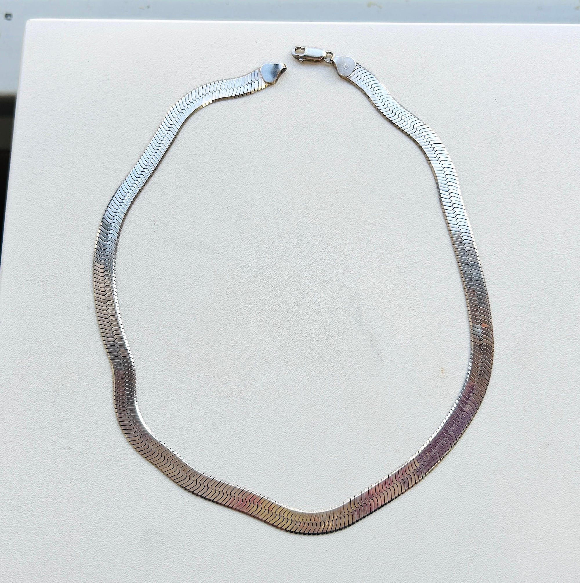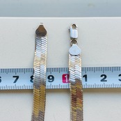 幅広でインパクトあるヘリンボーンネックレス。短めの長さで首回りにスタイリッシュな華やかさを演出してくれるデザイン。ヘリンボーンは普通のチェーンと形状が大きく異なるのでどのようなチェーンとも合うので重ね着けがさらにカッコよく決まります。こちらのネックレスは通常のヘリンボーンと違って柔らかく曲がりますので自然なウネリもかっこいいと思います。「ITALY」「925」刻印。