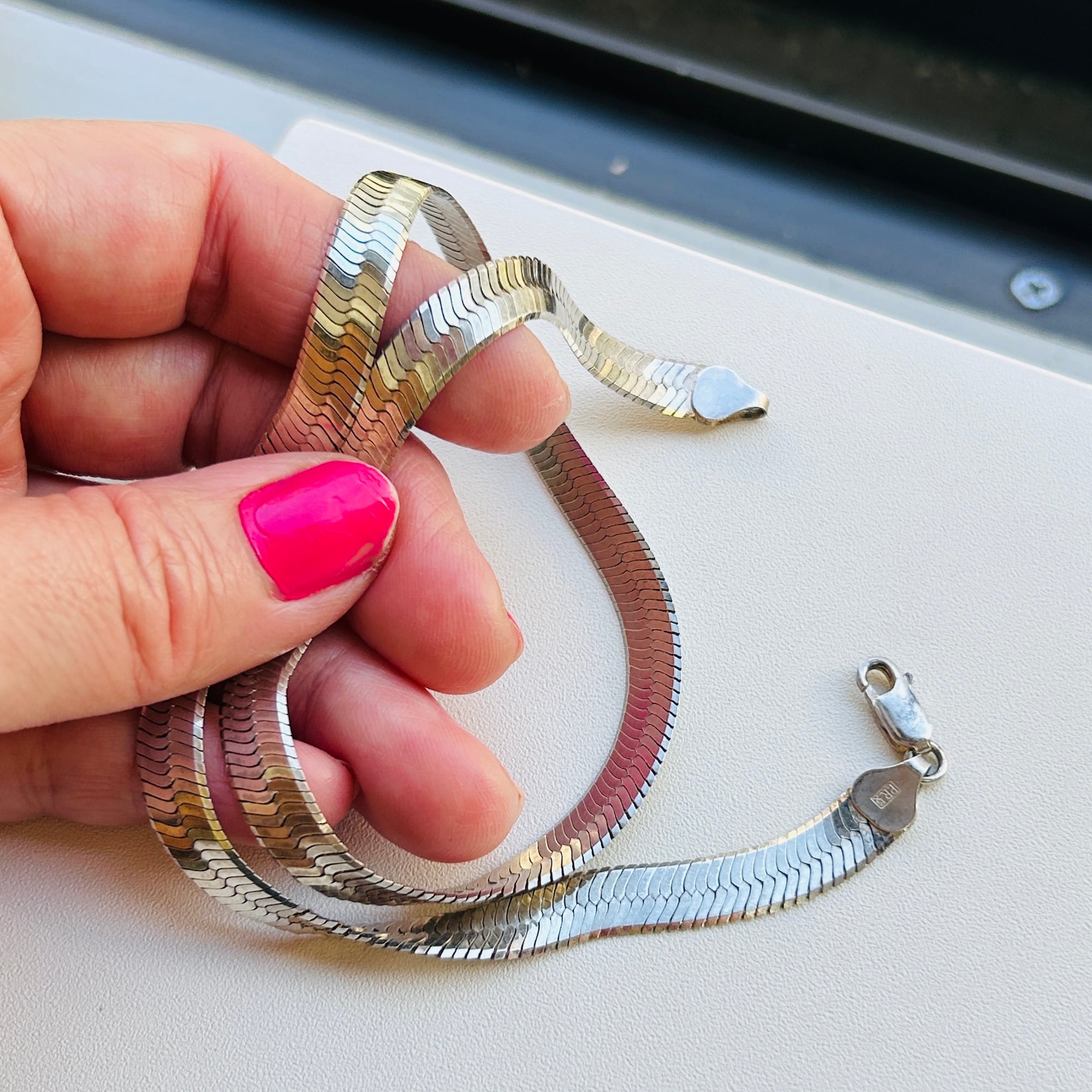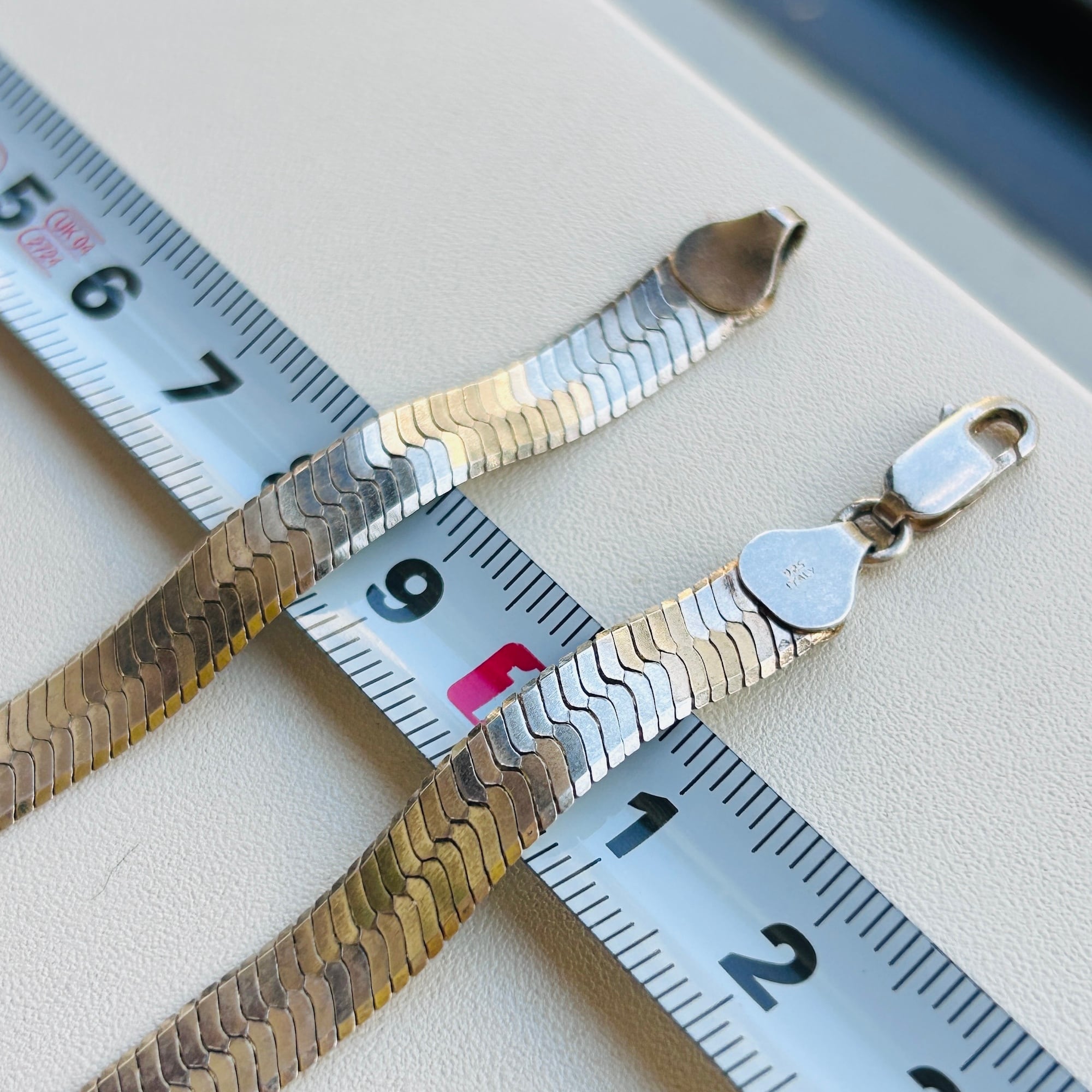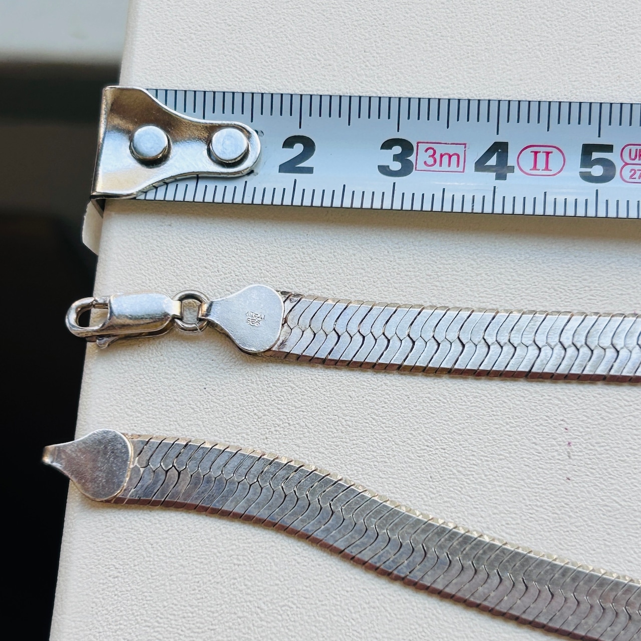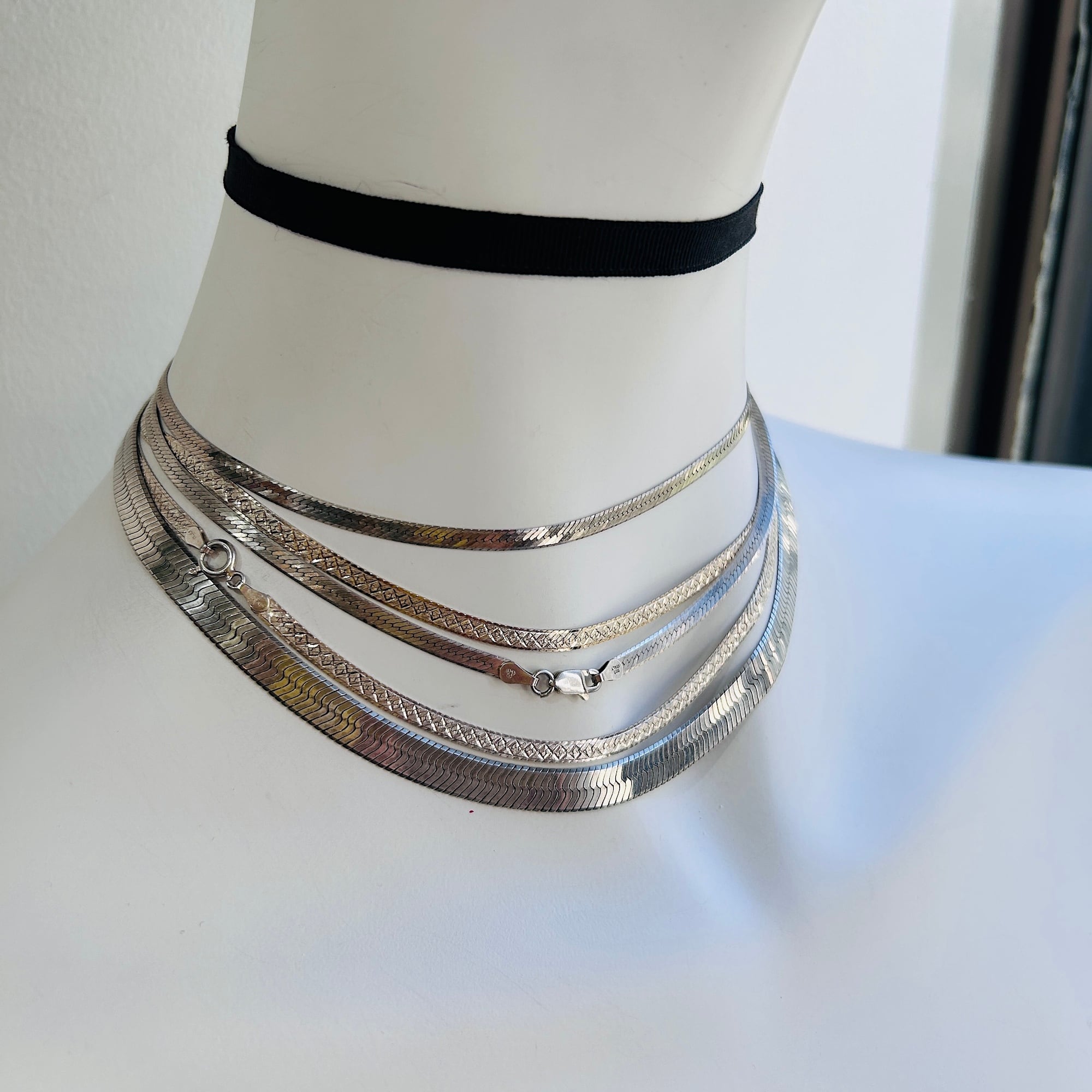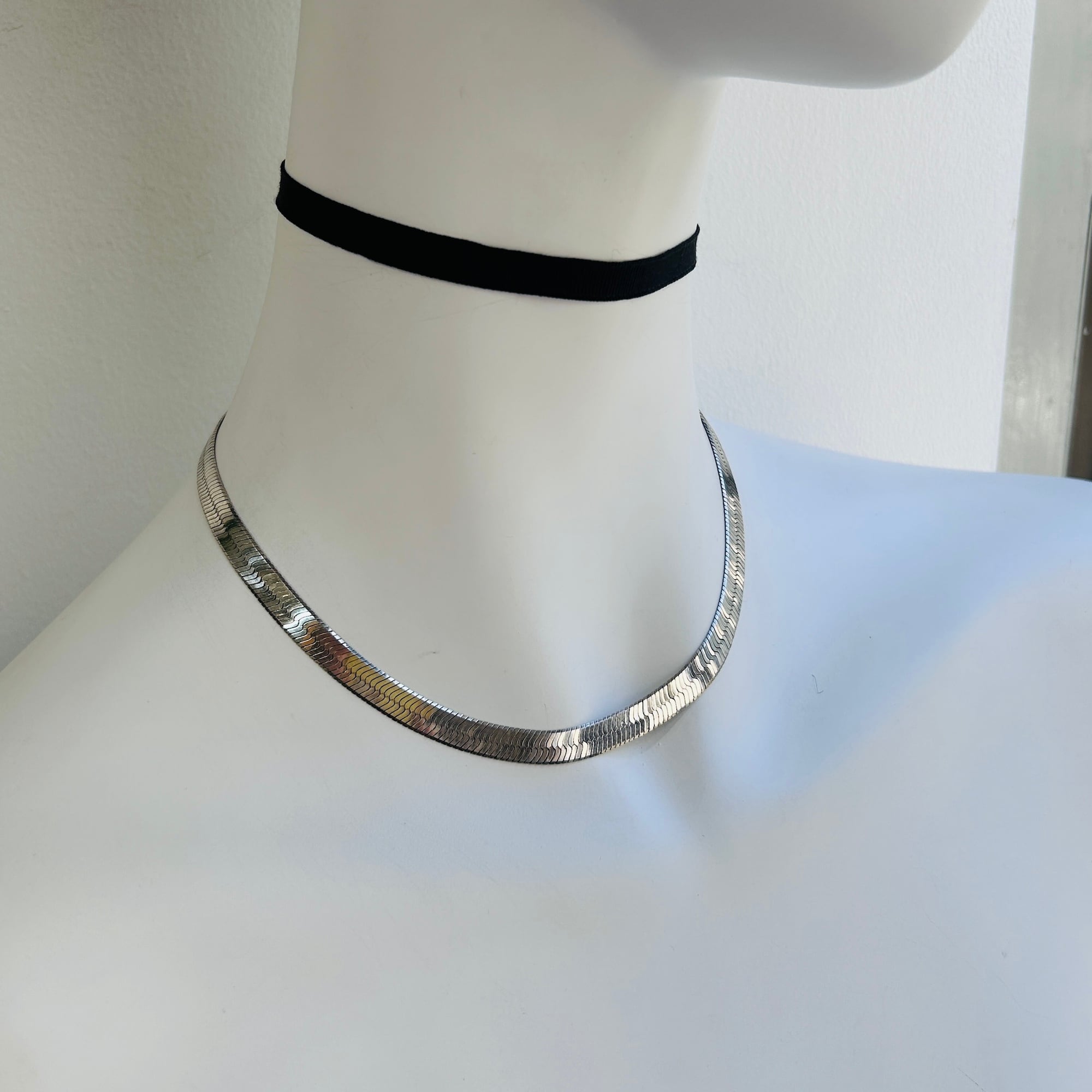 幅広でインパクトあるヘリンボーンネックレス。短めの長さで首回りにスタイリッシュな華やかさを演出してくれるデザイン。ヘリンボーンは普通のチェーンと形状が大きく異なるのでどのようなチェーンとも合うので重ね着けがさらにカッコよく決まります。こちらのネックレスは通常のヘリンボーンと違って柔らかく曲がりますので自然なウネリもかっこいいと思います。「ITALY」「925」刻印。