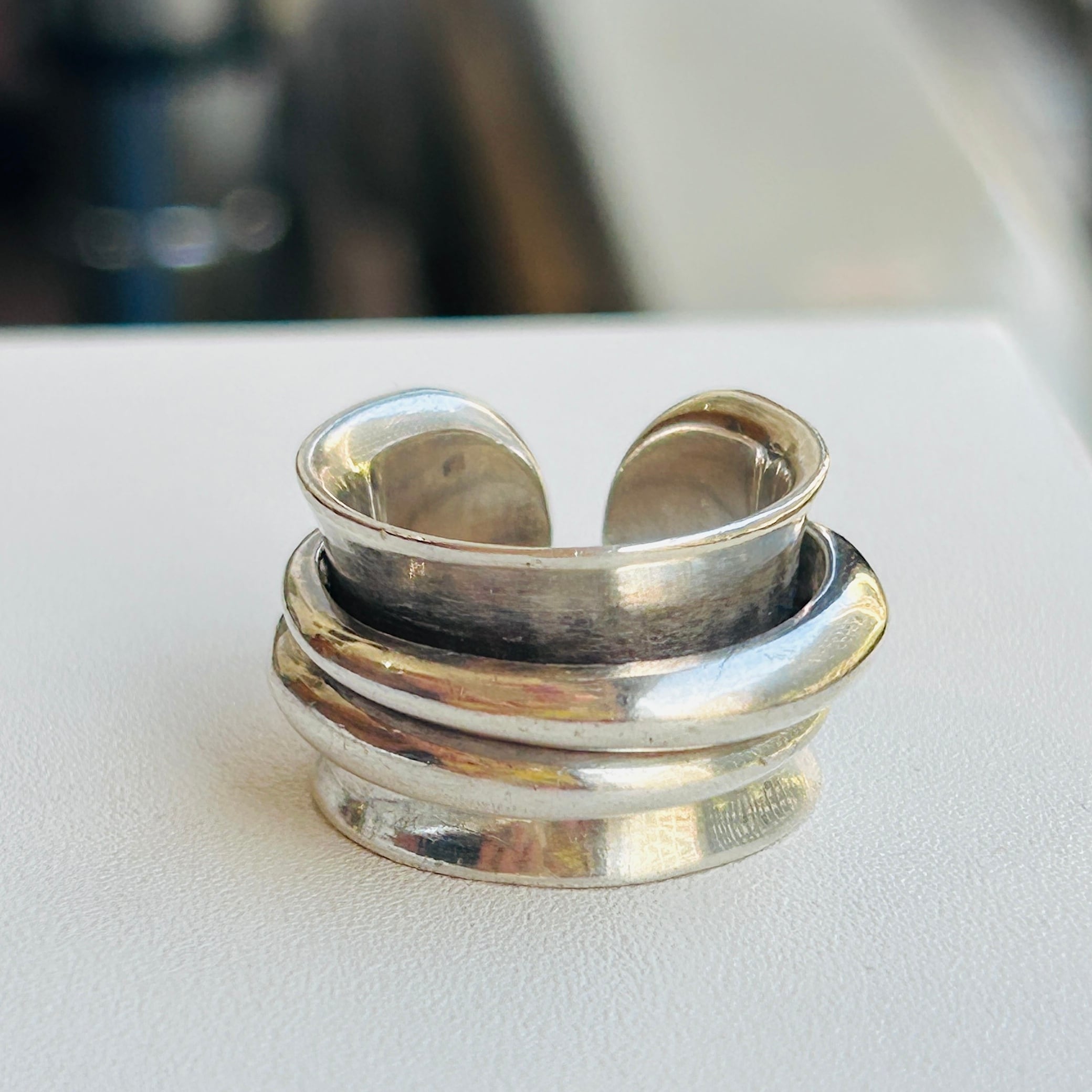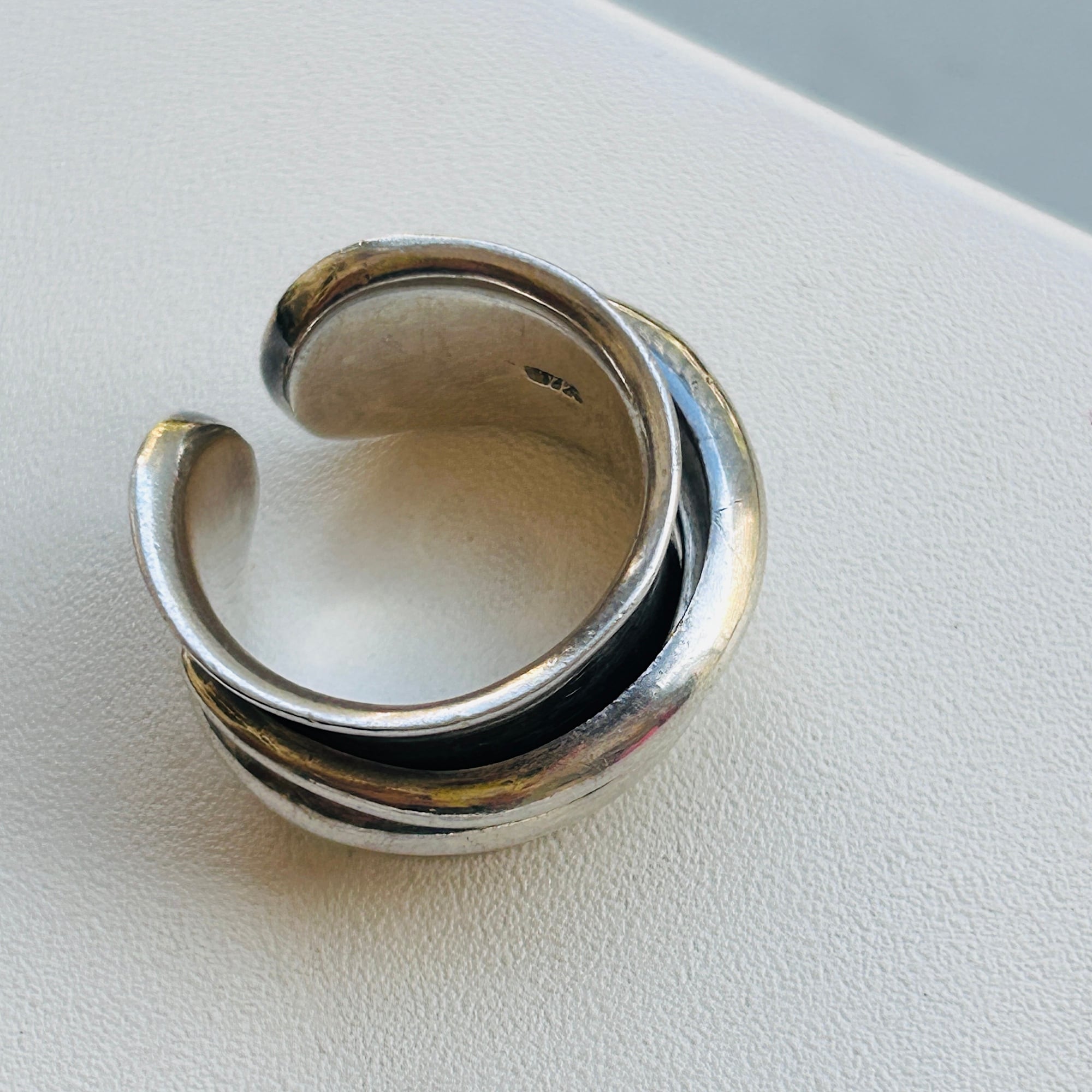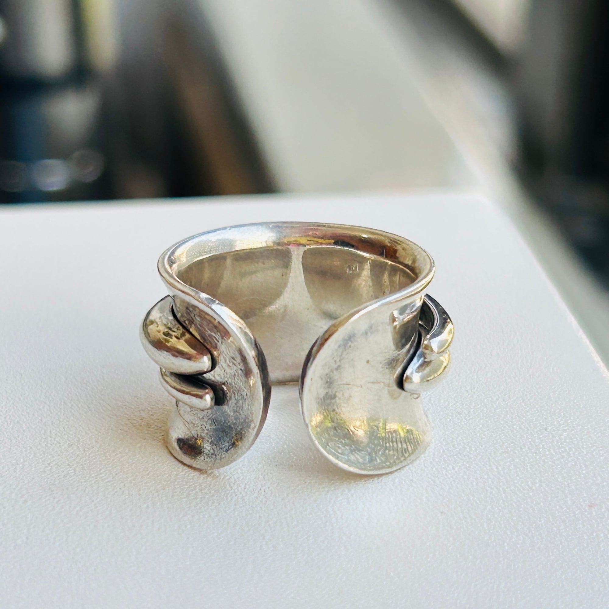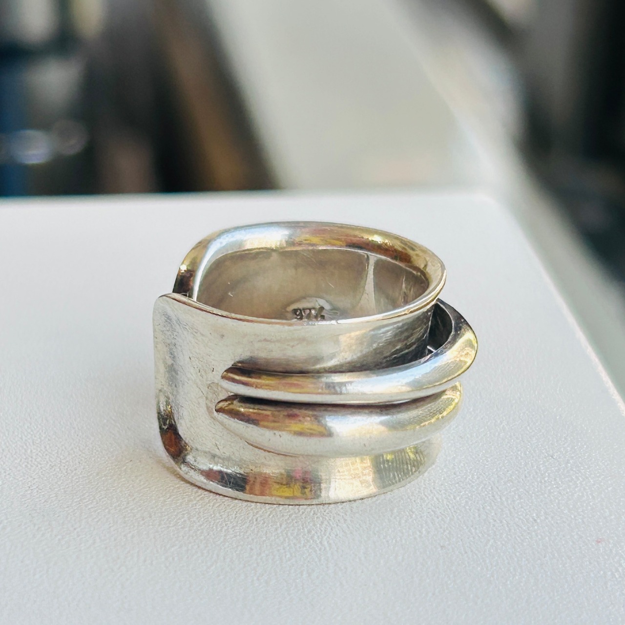 そりかえったワイドバンドにオーガニックなC型パーツが2つはめ込まれたユニークなシルバーリング。凹凸があり着けるとすごくカッコいいです。C型パーツはバンドに接合されていないので動きます。そりかえったバンドは丸みがあり滑らか。肌触りがすごくいいです。凹凸あるボリュームリング。カッコいい手元になります。内側に「925」。サイズ棒では12.5号くらいですが幅広なので12号中指に少しタイトなフィット感です。着用感は11.5号くらい。開口もあるのでキツすぎず、着脱も楽です。