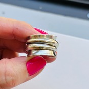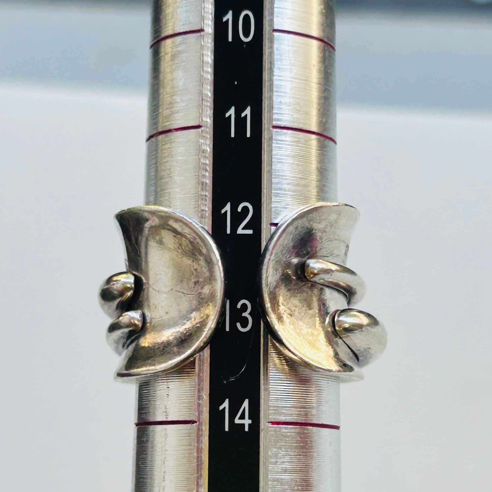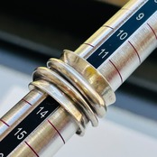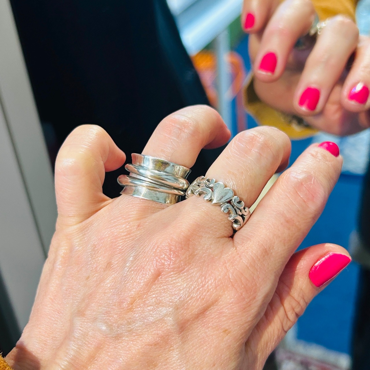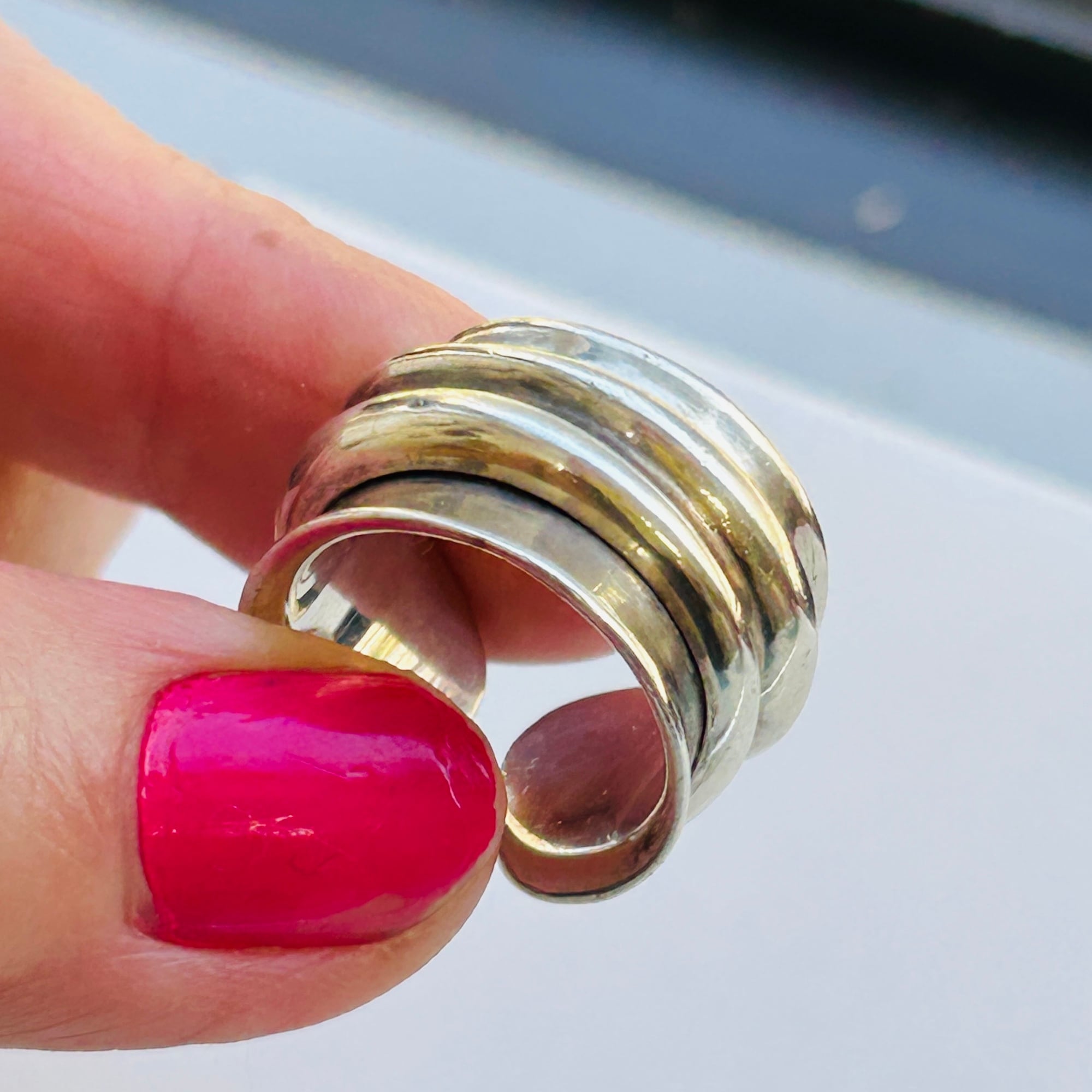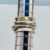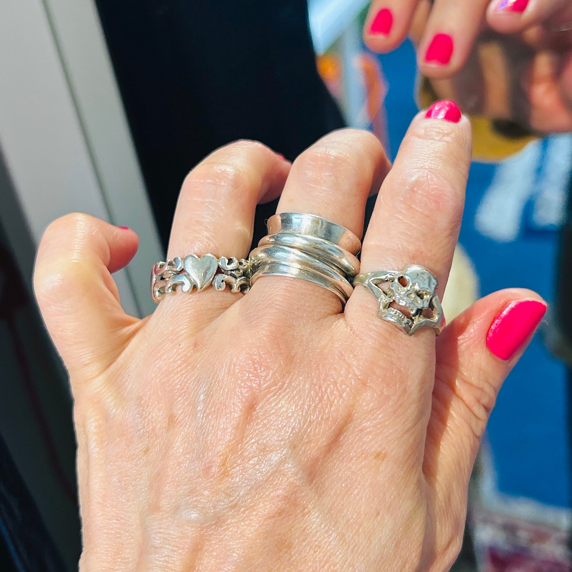 そりかえったワイドバンドにオーガニックなC型パーツが2つはめ込まれたユニークなシルバーリング。凹凸があり着けるとすごくカッコいいです。C型パーツはバンドに接合されていないので動きます。そりかえったバンドは丸みがあり滑らか。肌触りがすごくいいです。凹凸あるボリュームリング。カッコいい手元になります。内側に「925」。サイズ棒では12.5号くらいですが幅広なので12号中指に少しタイトなフィット感です。着用感は11.5号くらい。開口もあるのでキツすぎず、着脱も楽です。