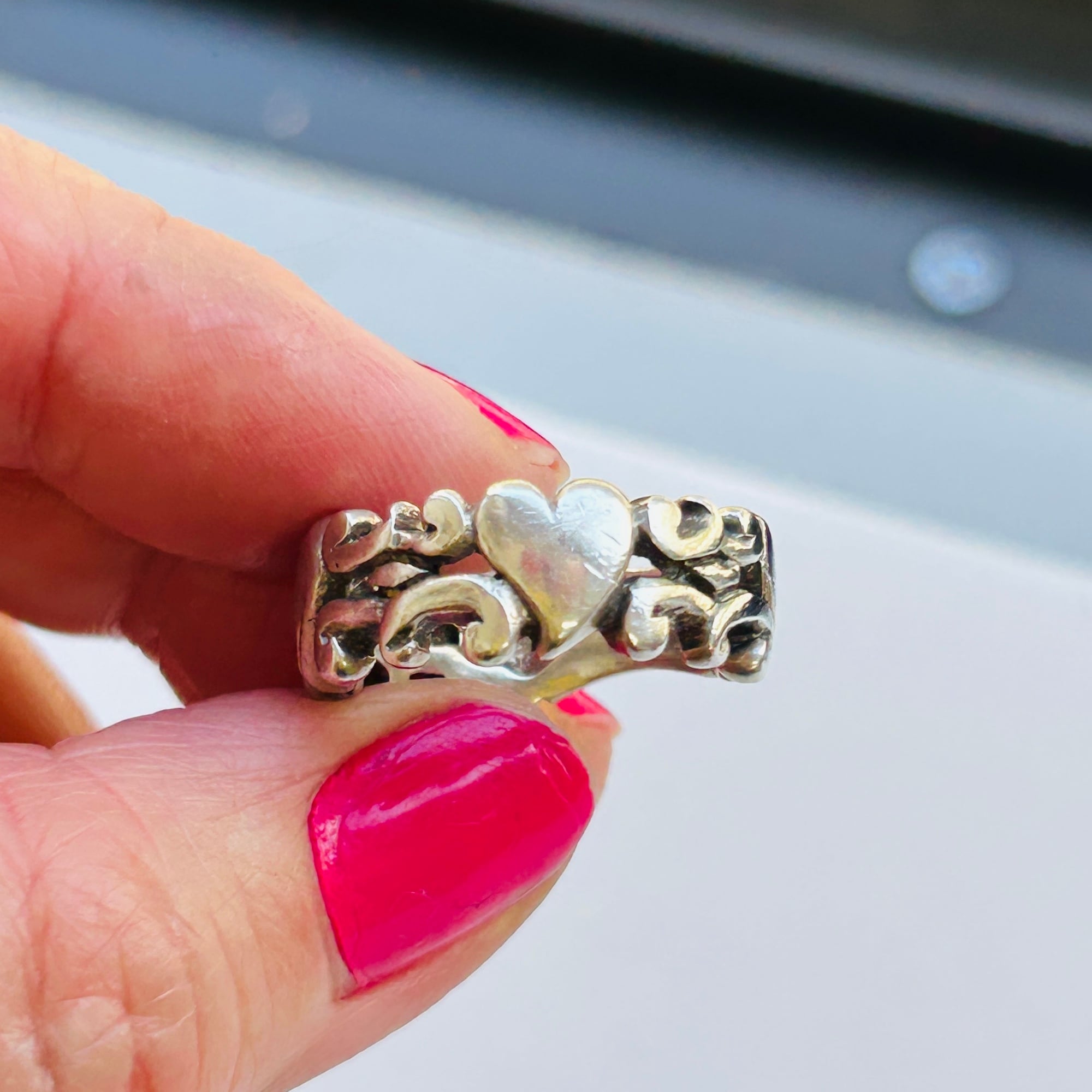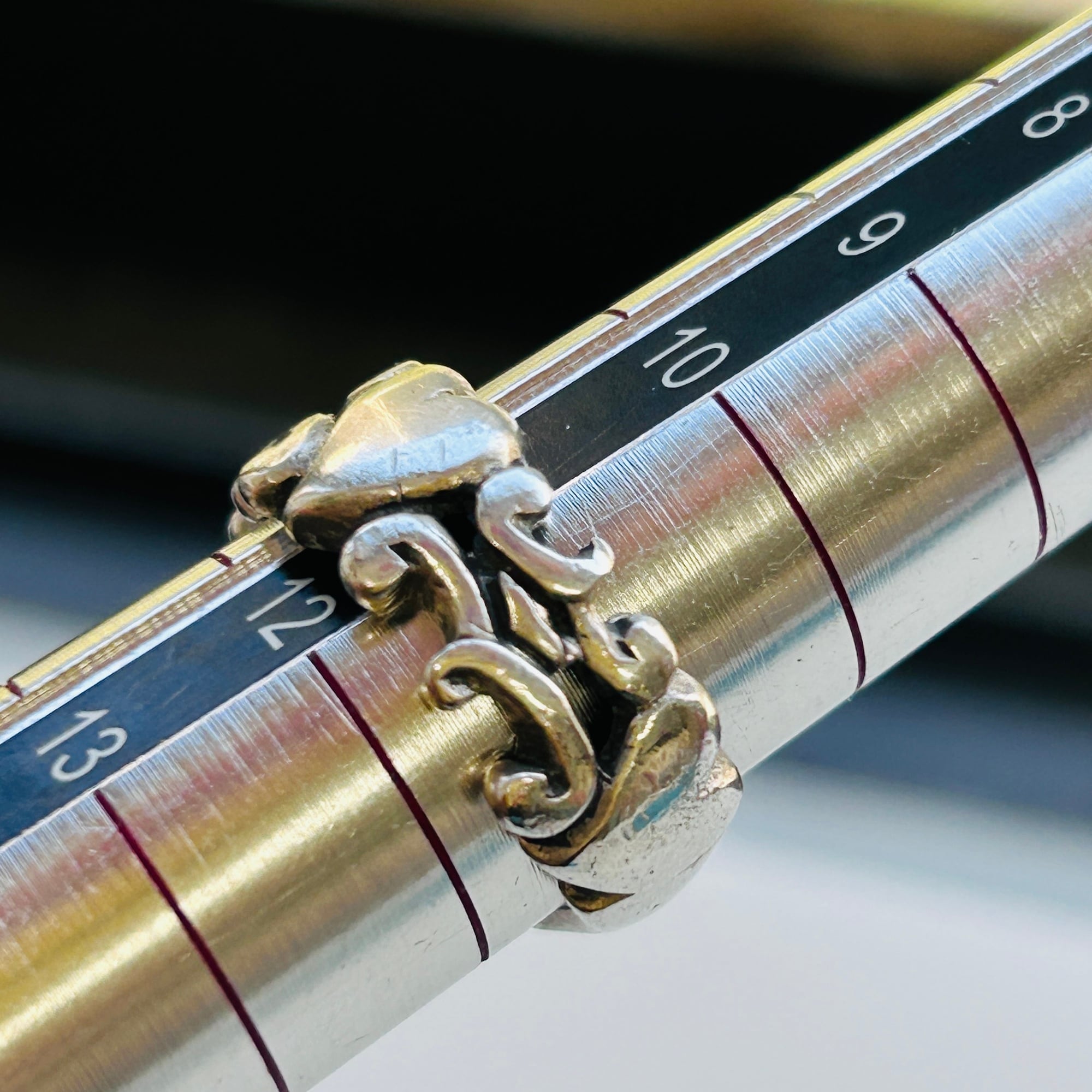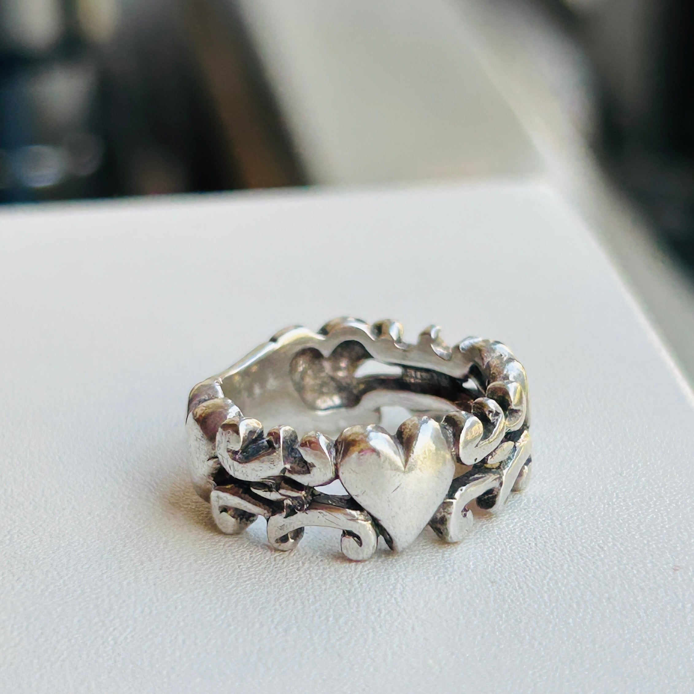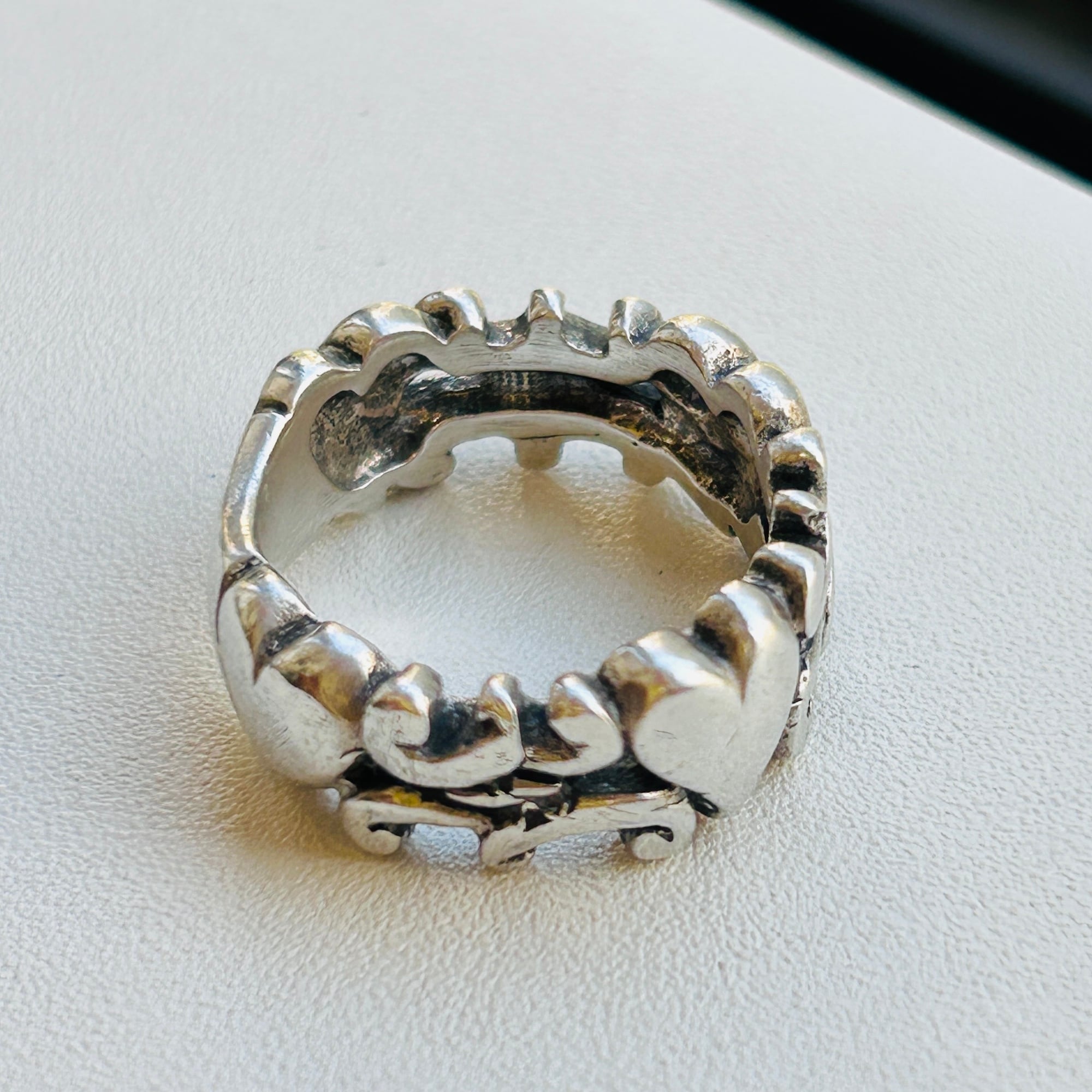ぽってりした厚みのあるバンドリング。ハートと蔦のようなゴシック調デザイン。ロックな雰囲気のキュートなリングです。刻印なシルバーです。