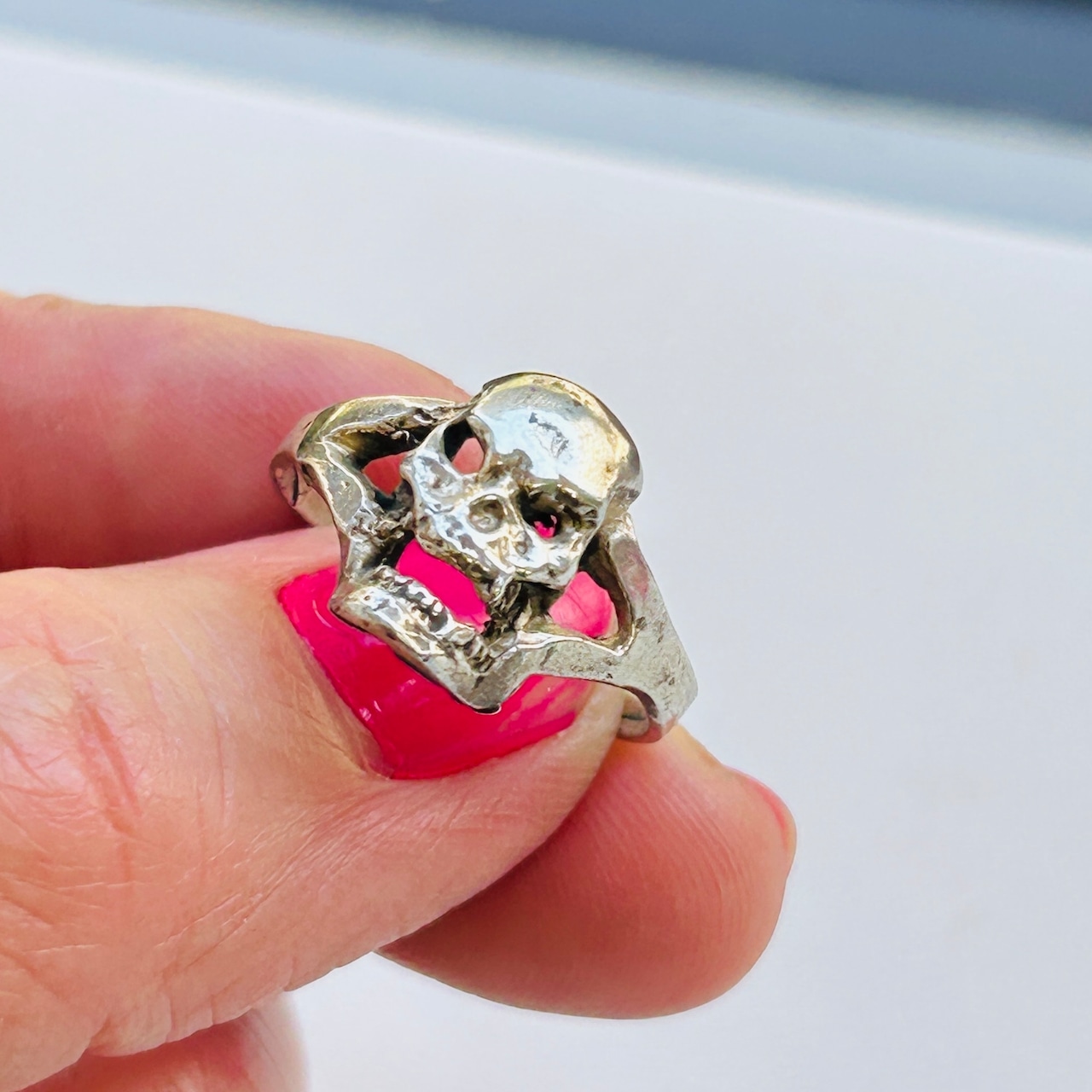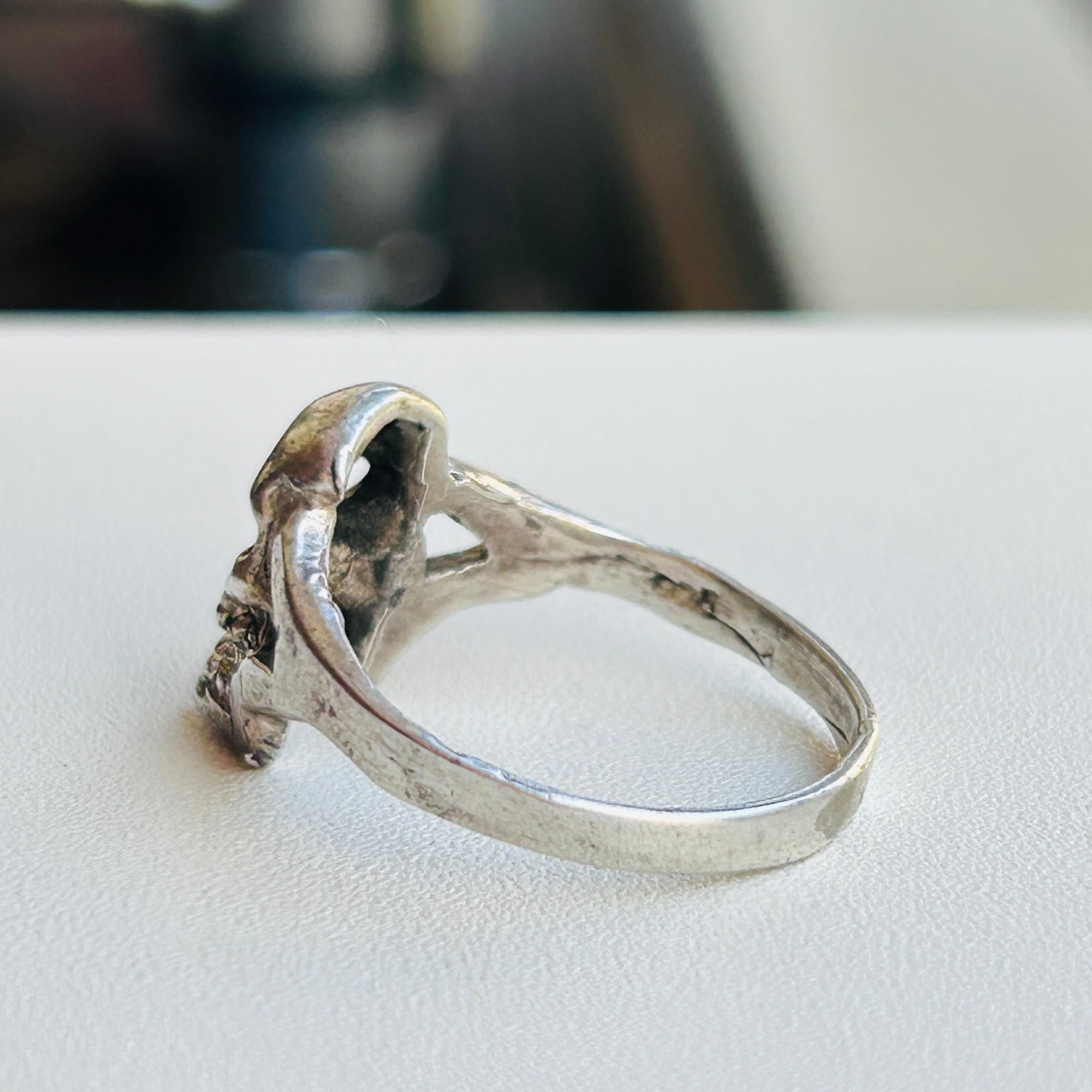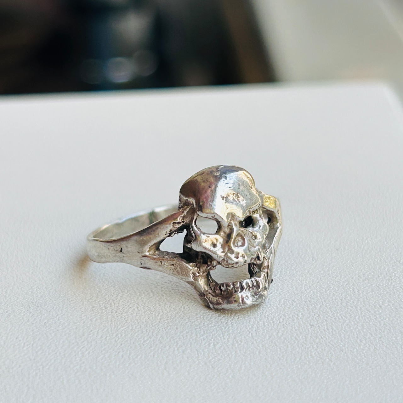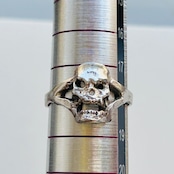 スカルリング。今までスルーしてきたモチーフですが私の買い付けアンテナも変わりました:)遊びゴコロある手元になります。内側に「925」。細いバンドでスカルの裏側に凹みスペースがありので19号の指にも入るような気がしてます。