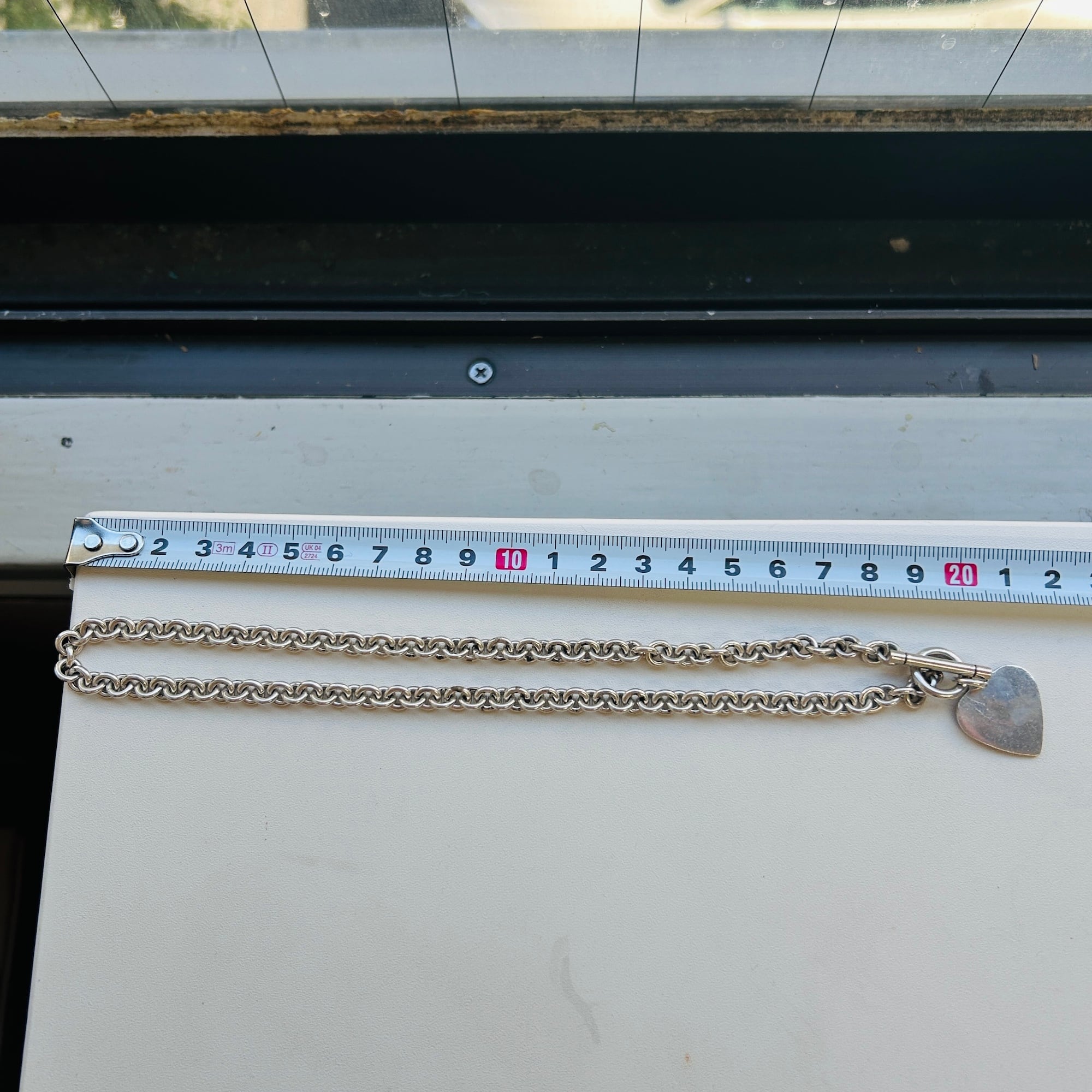 太めチェーンとハートが可愛いネックレス。丸い輪にTバーと通すトグル留め具もアクセントになります。ハートタグは表側に薄いシミがあるのですがクロス磨いたら分かりません。変色すると目についてくるかもですが角度によっても見え方が変わります。気になるかたは刻印がある方を正面に向けるのも可愛いのでオススメ致します。「925」刻印。