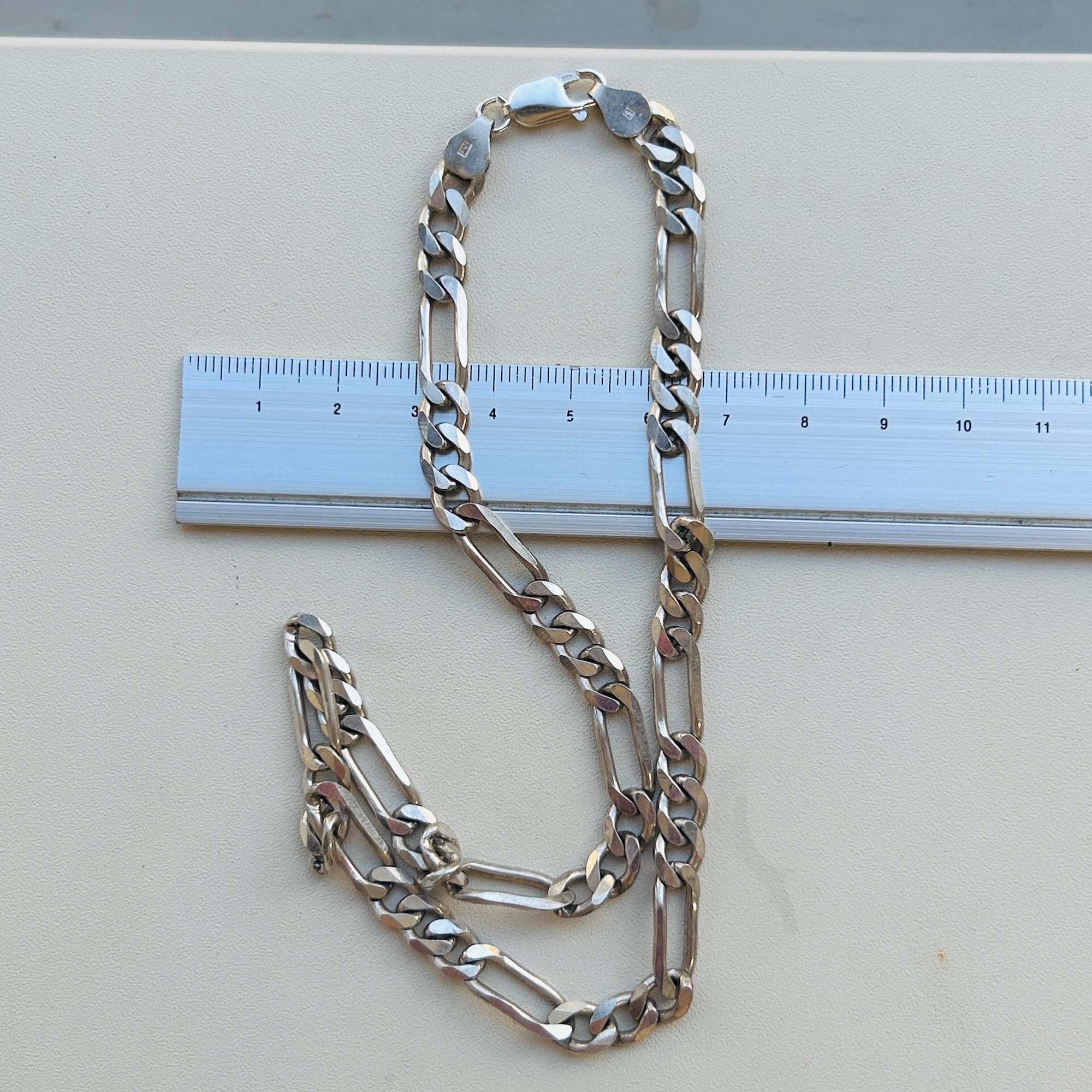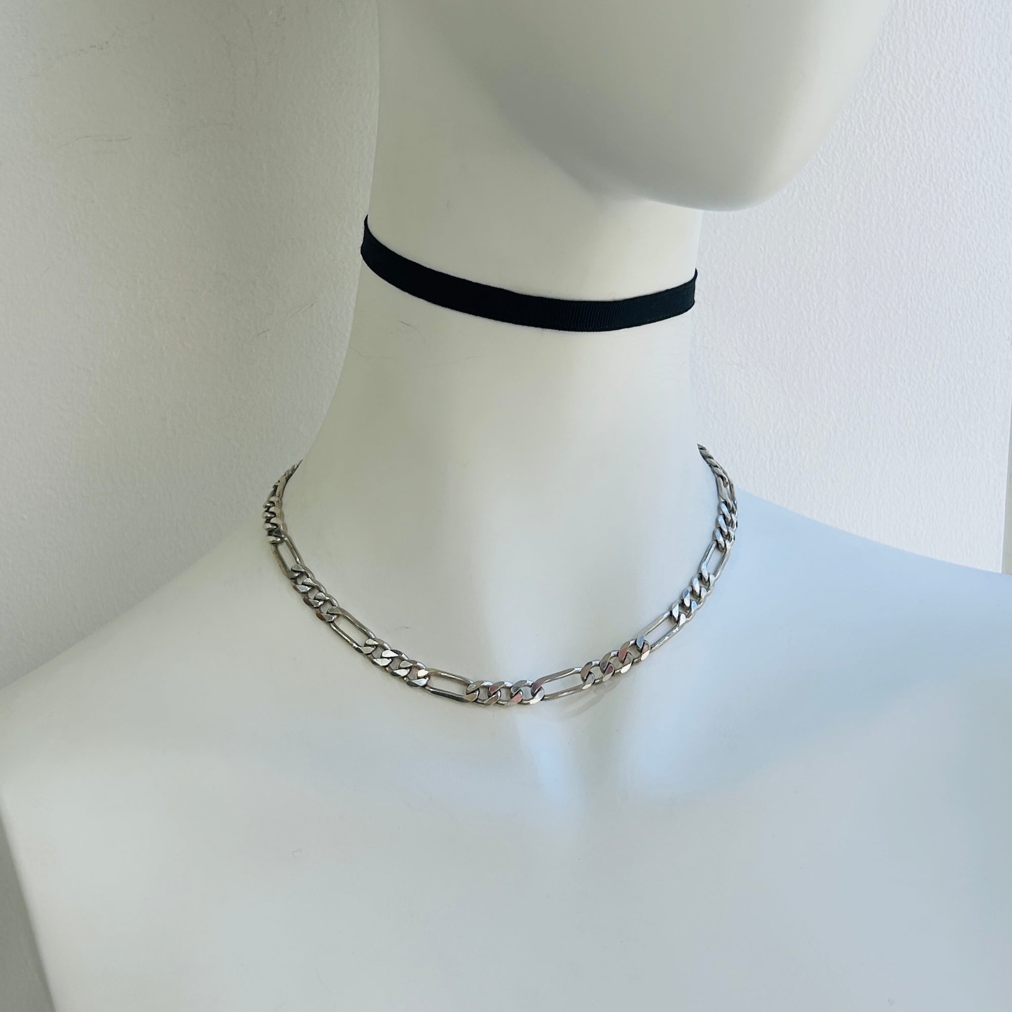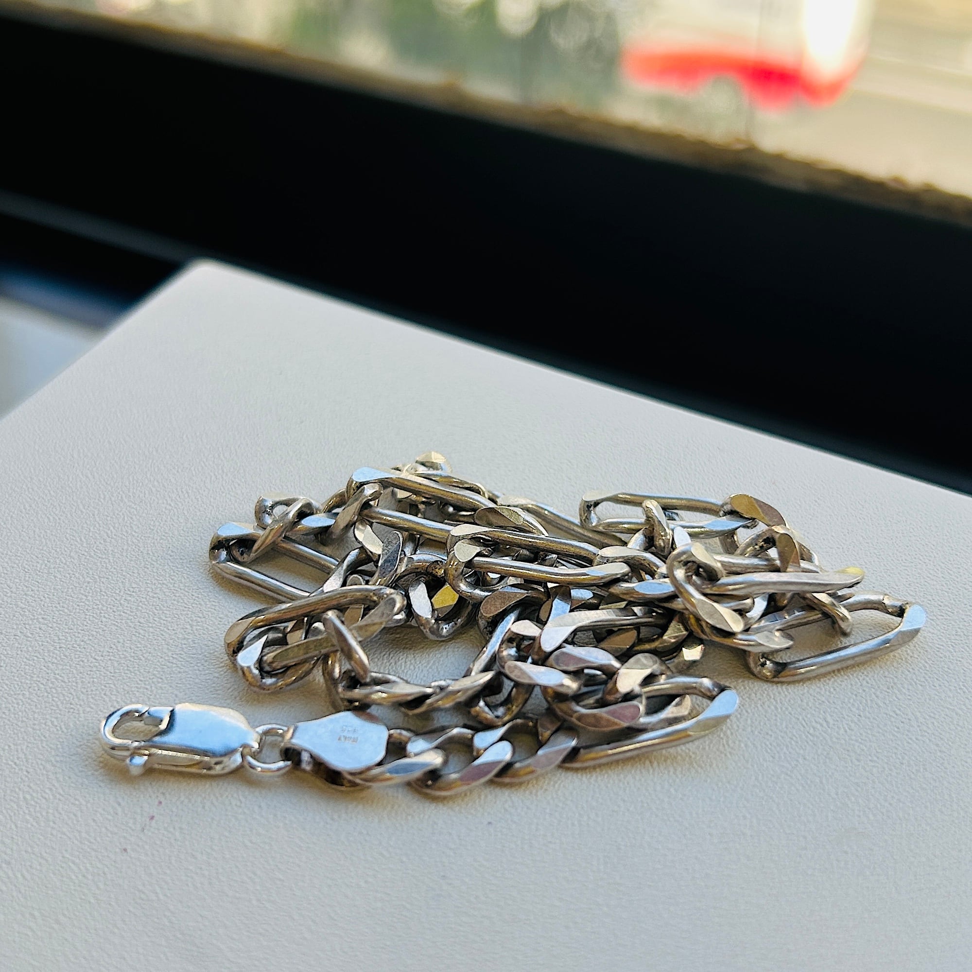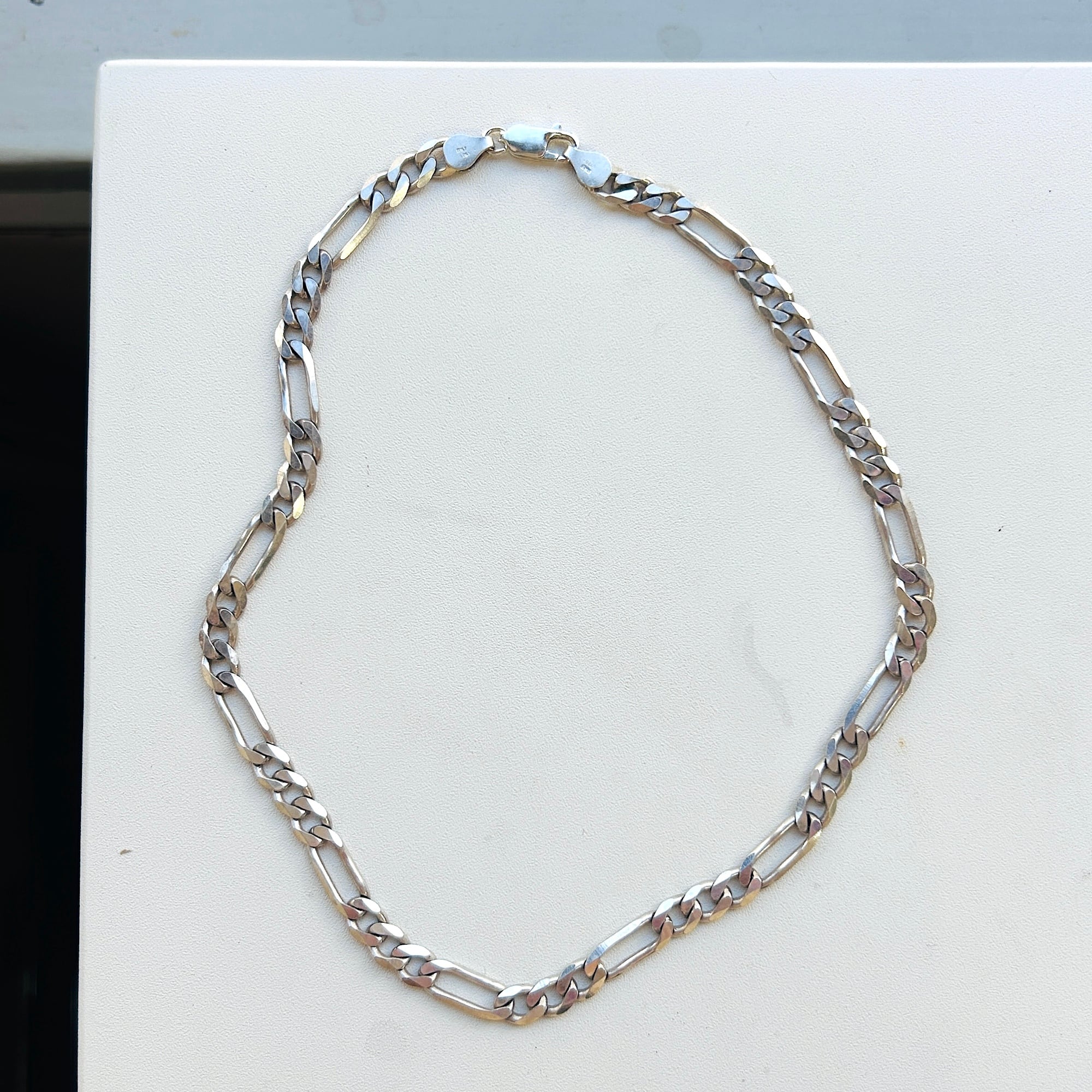 短くてヘビーなフィガロチェーンネックレス。女性向けの短さで頑強な作りのチェーンです。留め具が付いていなかったので私が楕円の引き輪(新品シルバー925製)をつけました。楕円コマの角に引っ掛けることも出来るので更に短く着用できます。本当は楕円引き輪(ロブスター)よりカニカン(丸っこい引き輪)の方が扱いやすく、引っ掛けやすいと思いますが、現在の在庫はロブスター型のみです。もしご自身で交換できるようでしたらチャレンジしてみて下さい。更に使いやすくなると思います。「ITALY」「925」刻印。