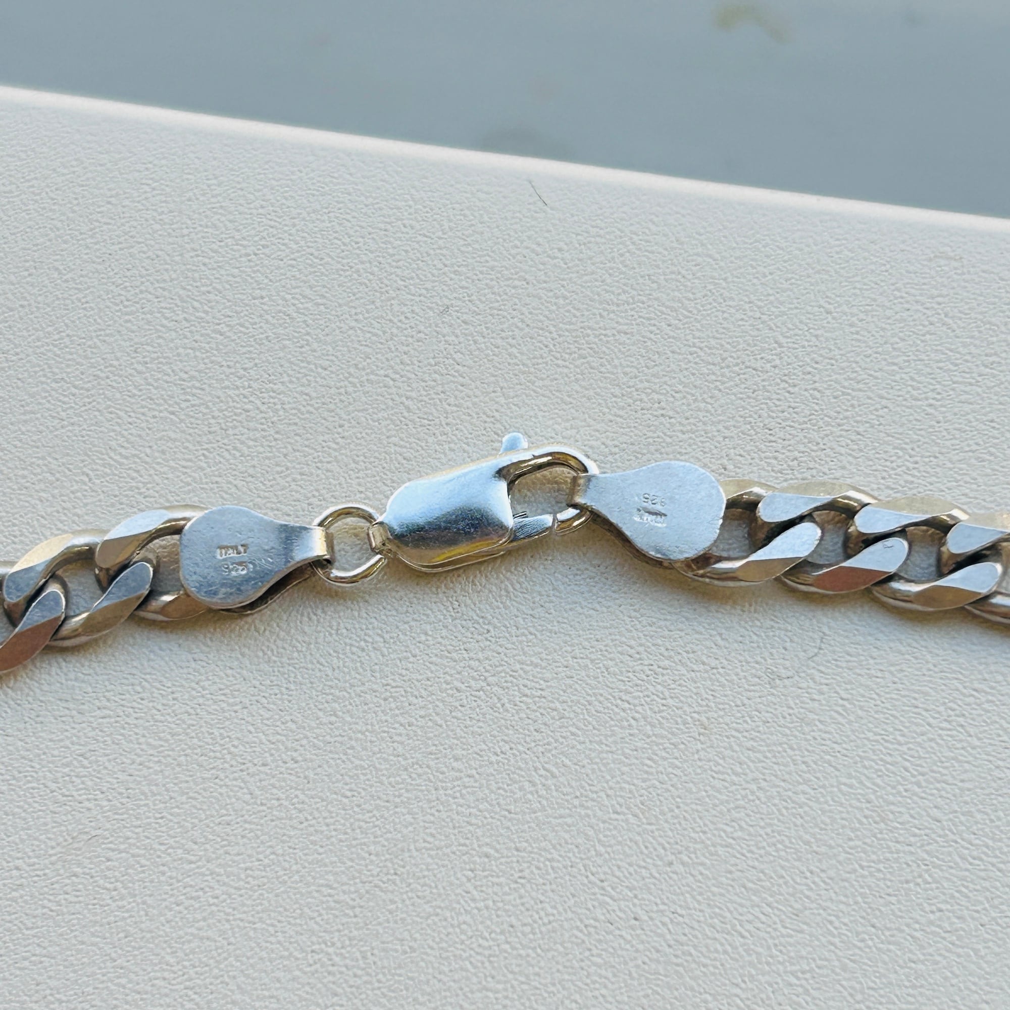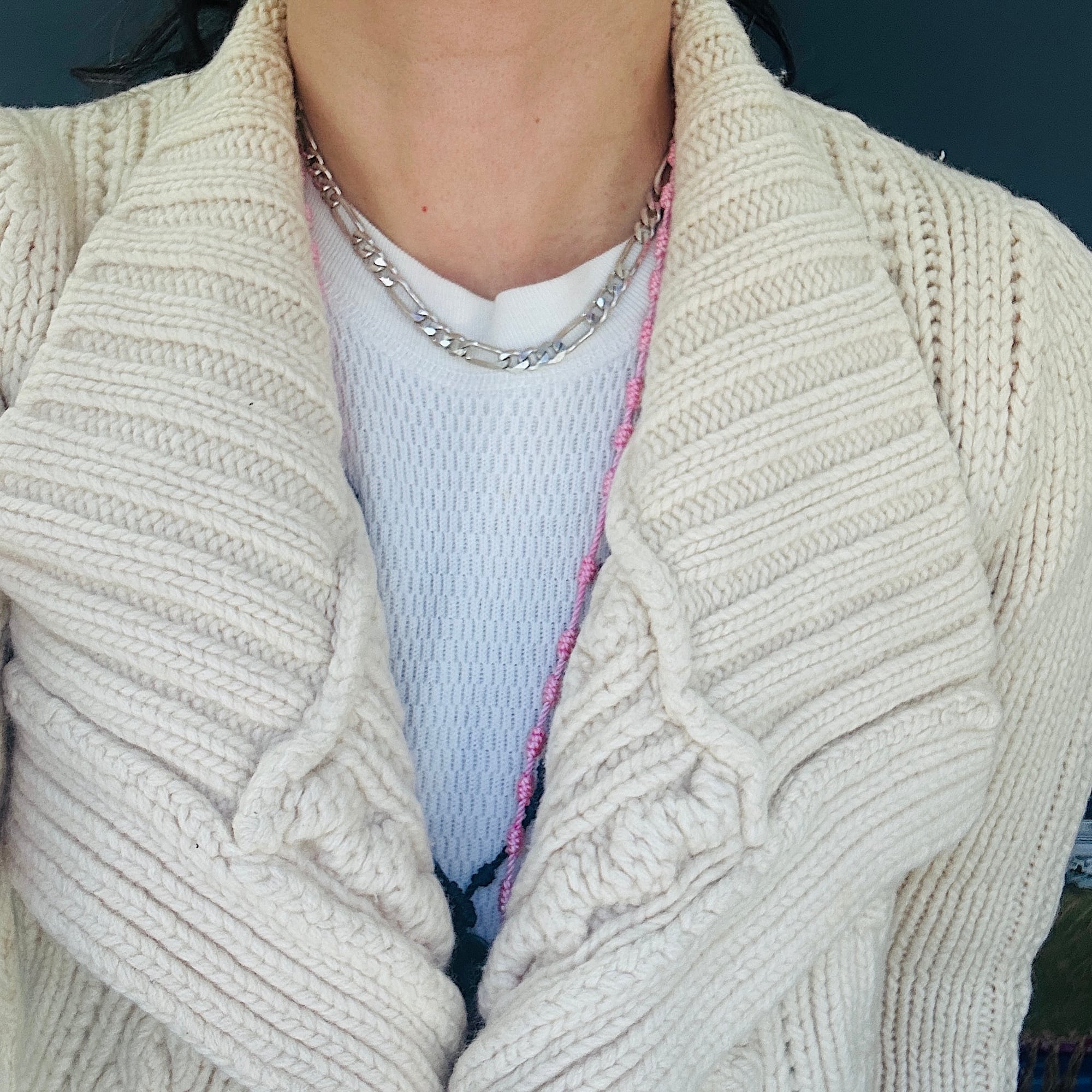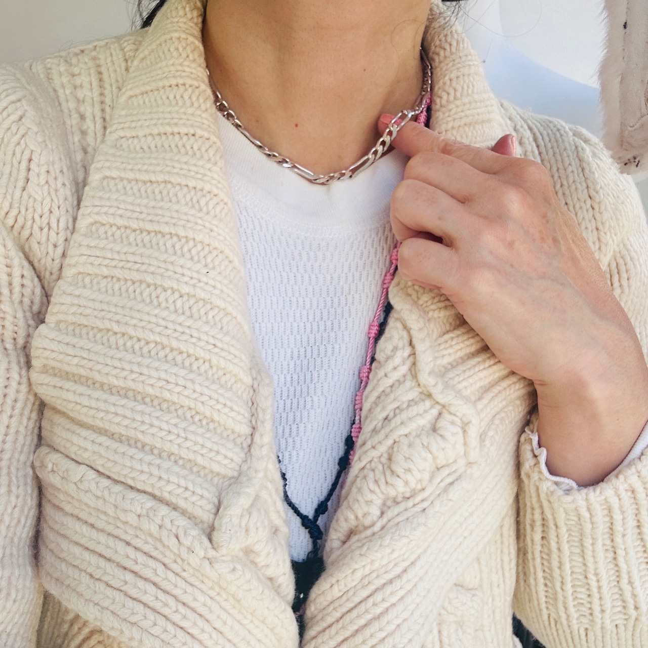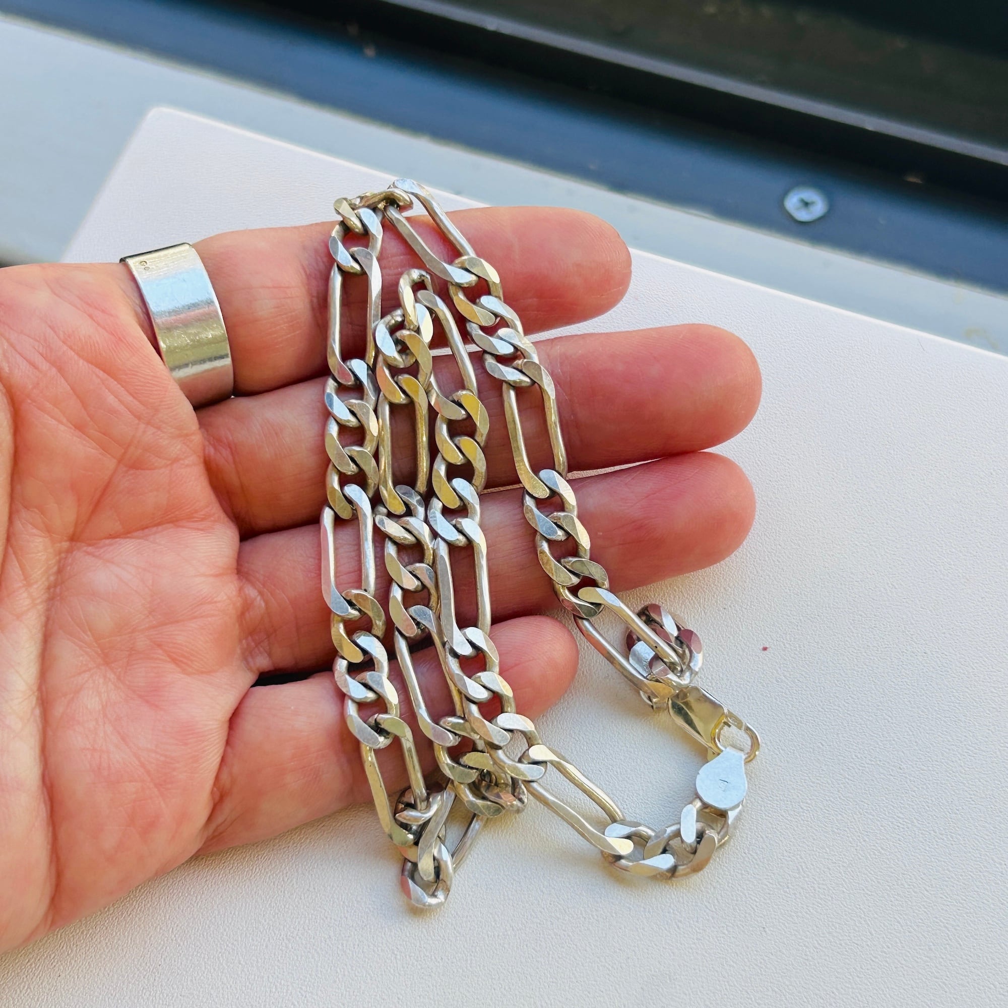 短くてヘビーなフィガロチェーンネックレス。女性向けの短さで頑強な作りのチェーンです。留め具が付いていなかったので私が楕円の引き輪(新品シルバー925製)をつけました。楕円コマの角に引っ掛けることも出来るので更に短く着用できます。本当は楕円引き輪(ロブスター)よりカニカン(丸っこい引き輪)の方が扱いやすく、引っ掛けやすいと思いますが、現在の在庫はロブスター型のみです。もしご自身で交換できるようでしたらチャレンジしてみて下さい。更に使いやすくなると思います。「ITALY」「925」刻印。