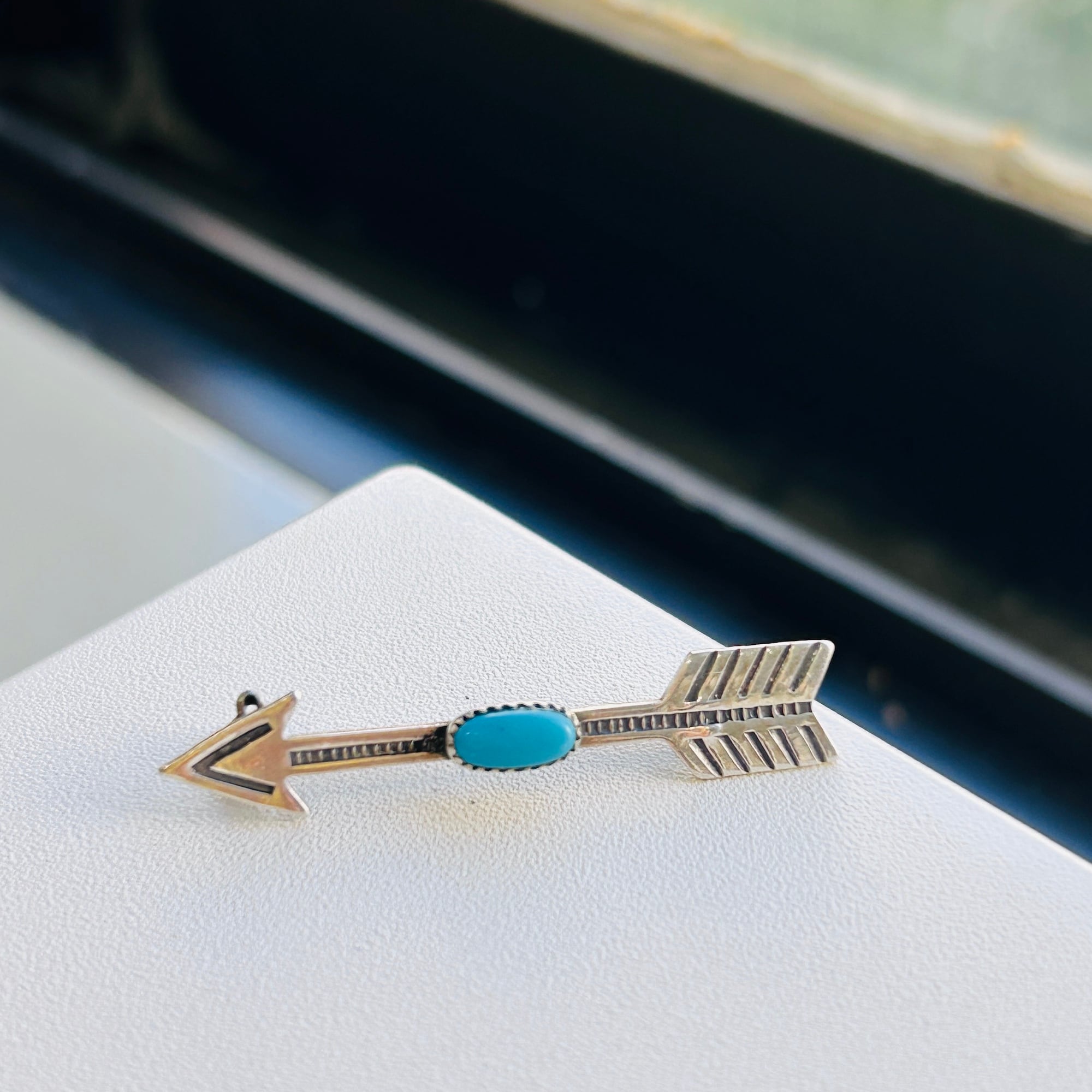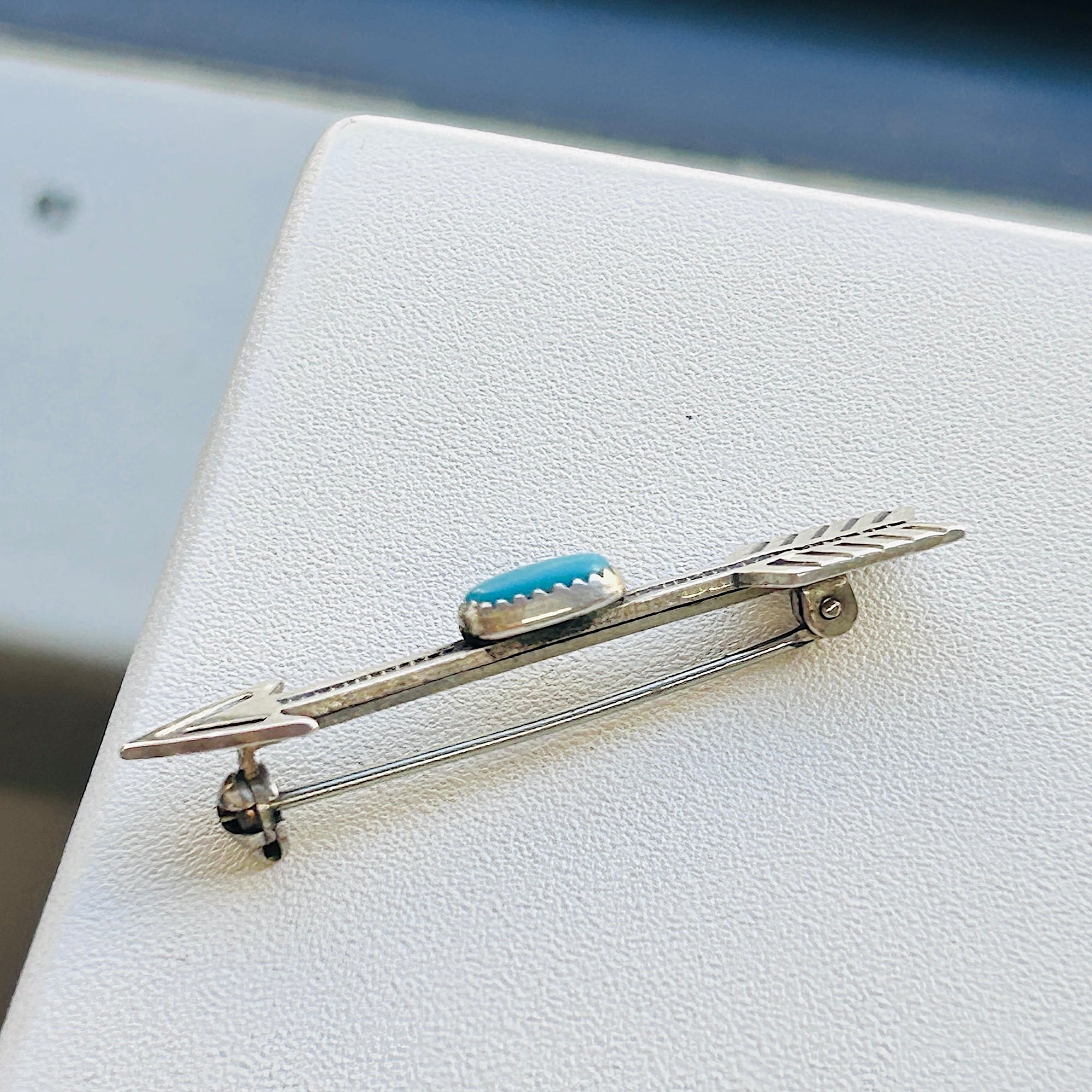小さなアロー(矢印)ブローチ。ネイティブアメリカンの代表的なモチーフである矢印にターコイズもついたクラシックなデザイン。ミニサイズで可愛らしさアップなブローチです。色々な向きで着けることができますし、帽子などにも着けやすいです。ピンの動きに問題ありません。裏に1961ー1972年のBell Tradingロゴマークと「STERLING」刻印。
