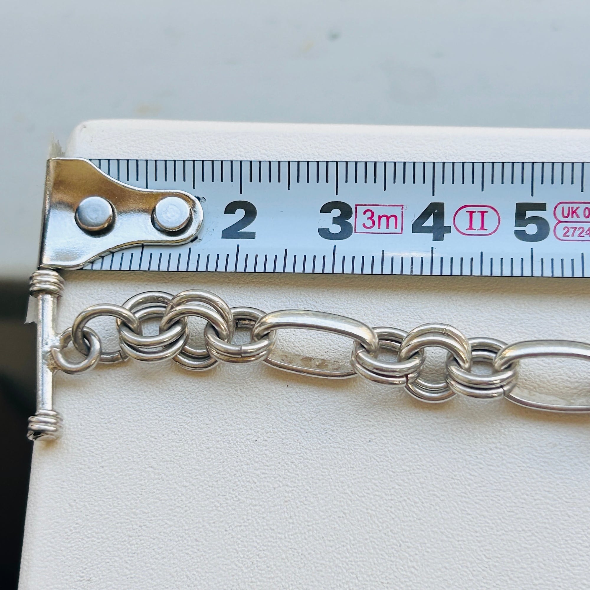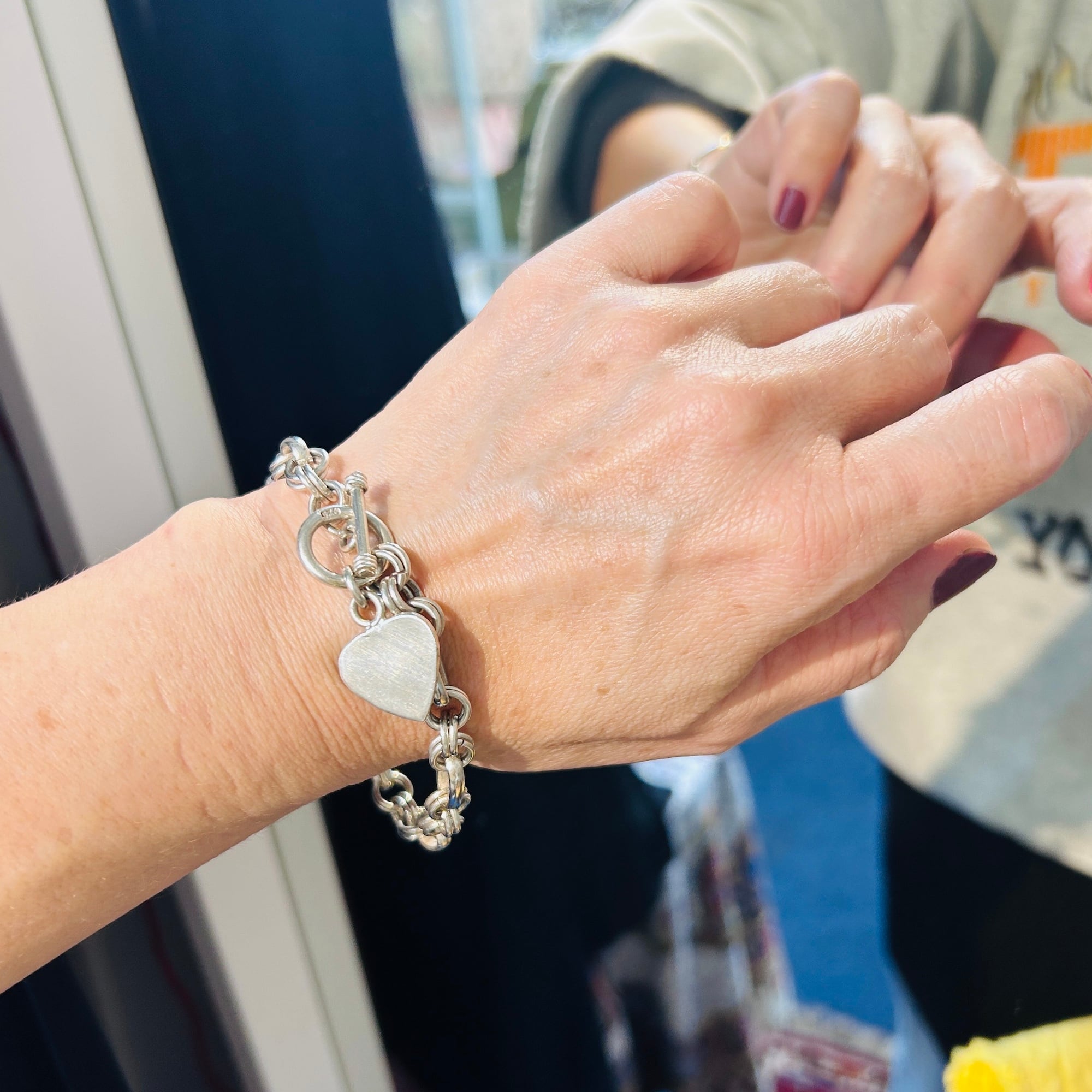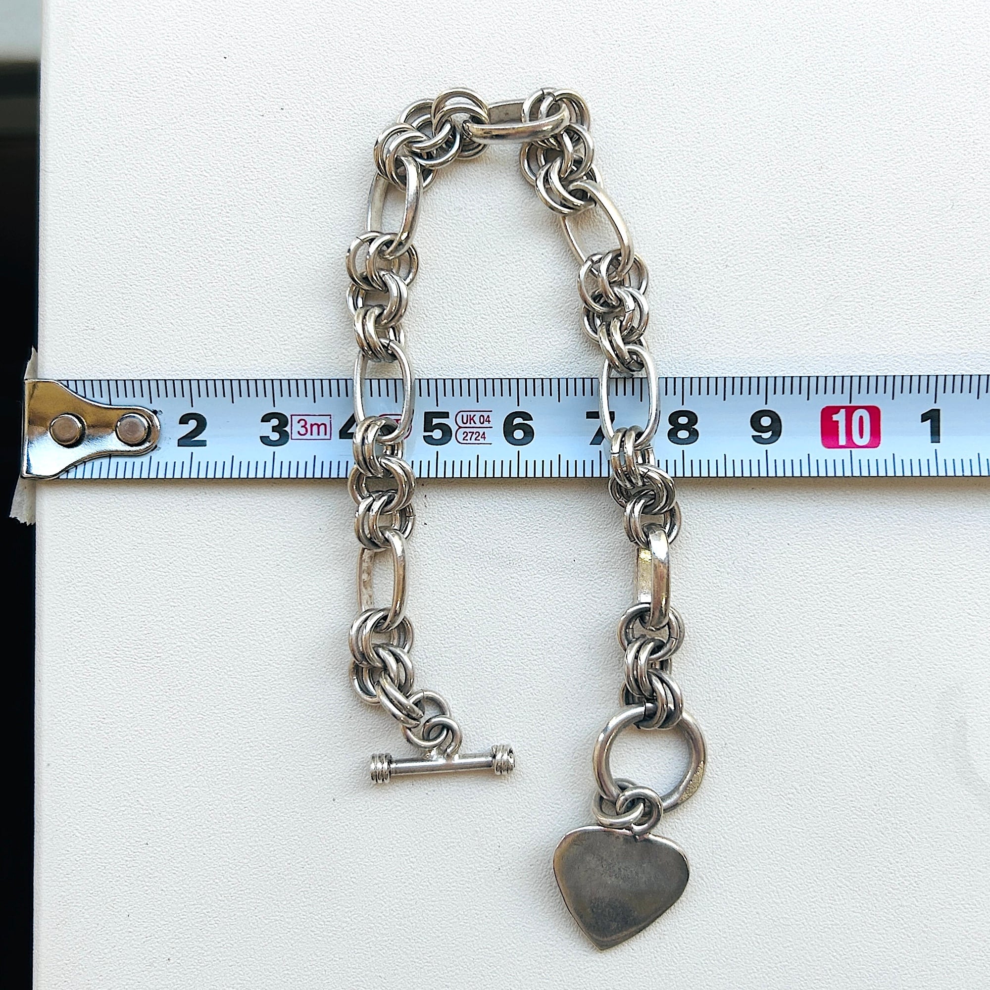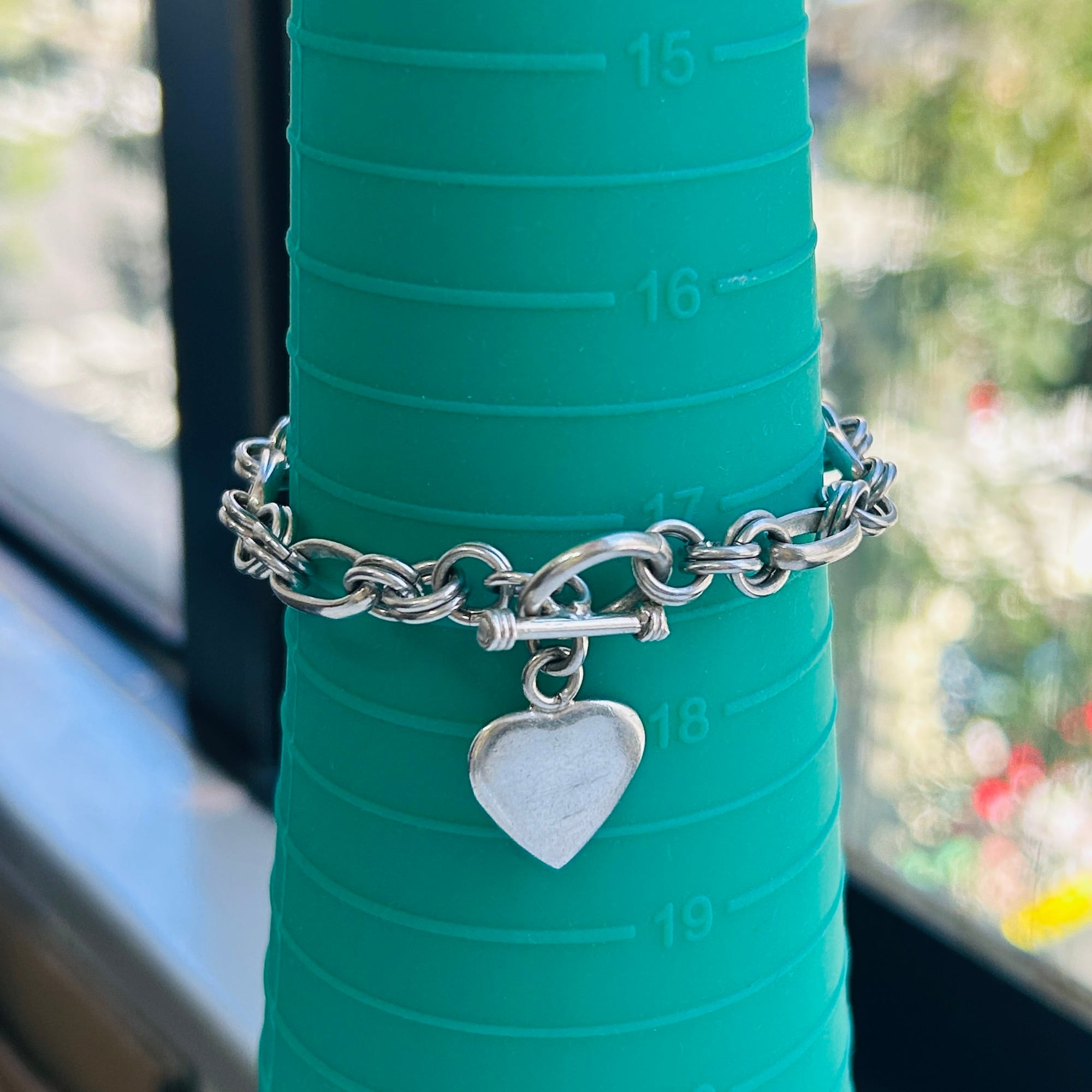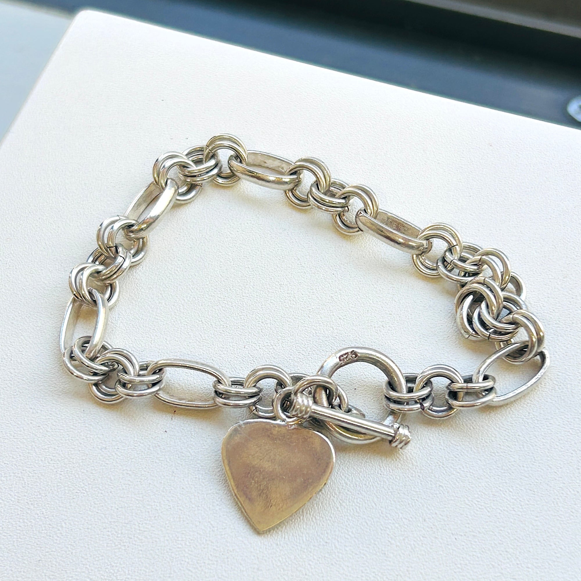 プレーンなハートタグがついたチェーンブレスレット。輪にTバーを通すトグル留め具も素敵なアクセントです。楕円コマと複数の丸コマが連なるユニークなチェーン。他と差が出るブレスレットです。輪に「925」刻印。