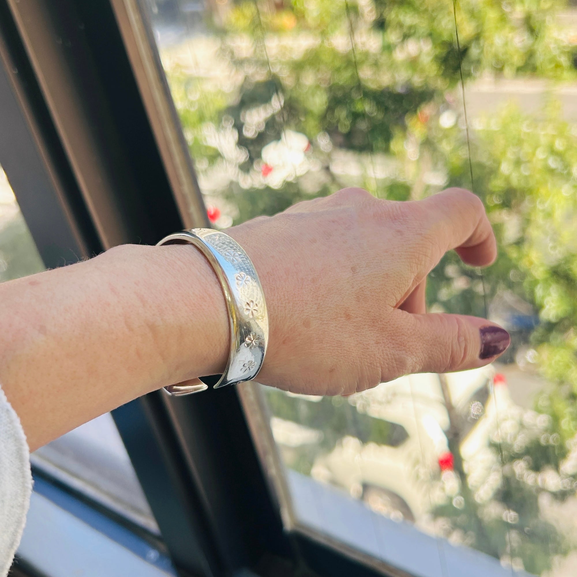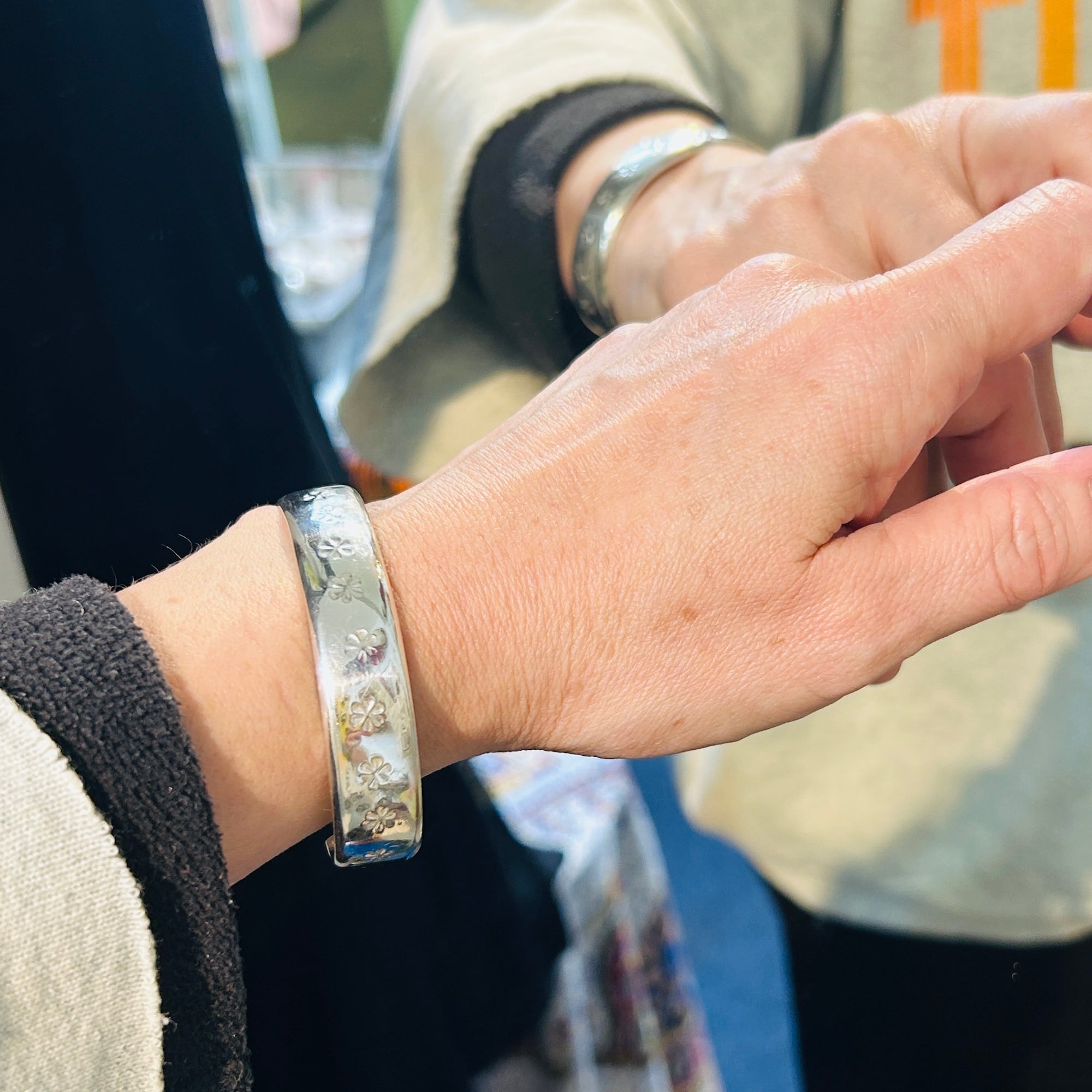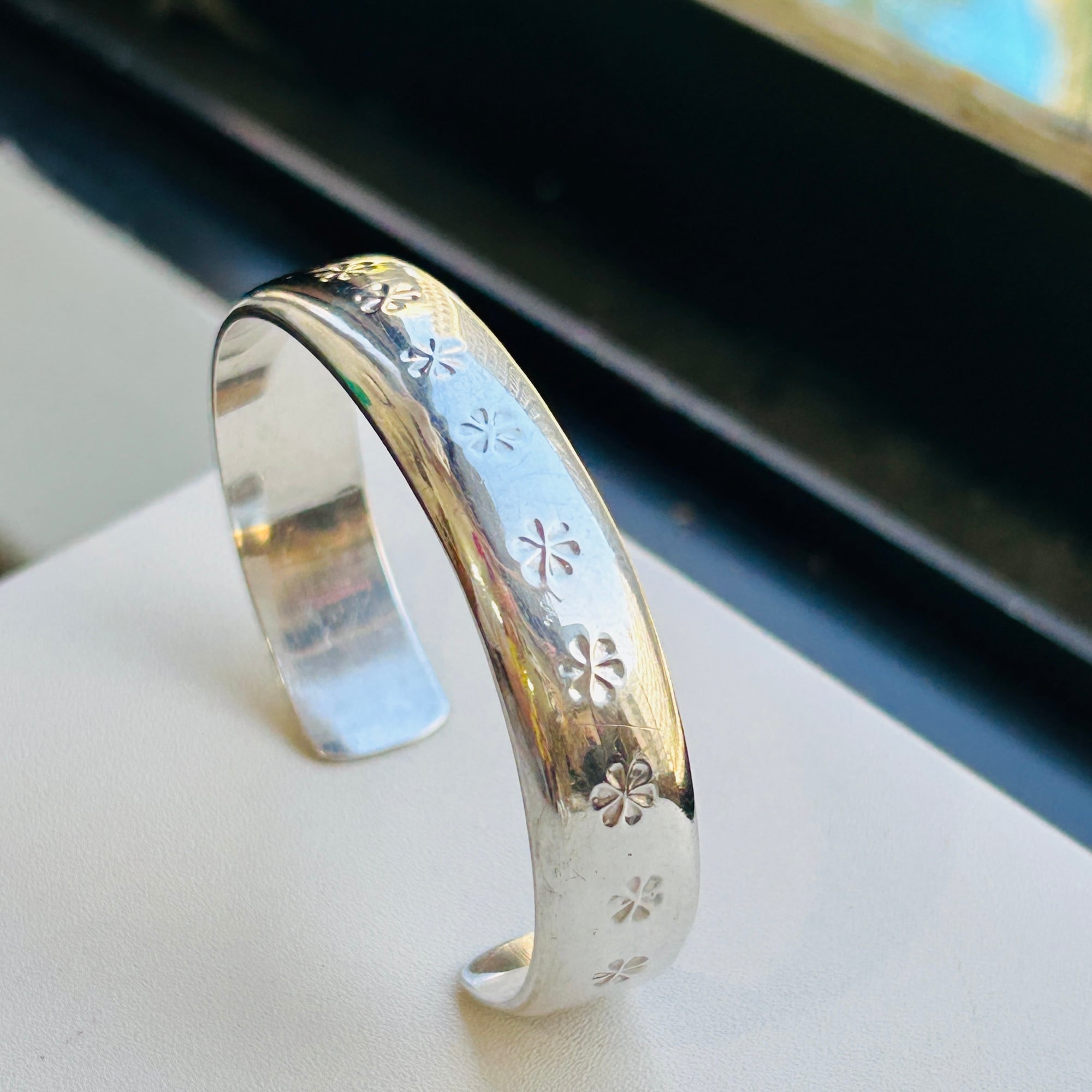 幅12mm、少し膨らみのあるプレーンバングル。お花のスタンプマークが可愛いです。膨らんだ中は空洞で軽い付け心地。着けた時のフィット感もいいです。着けてからもう少し締めれそうな感じがします。整ったキレイなカタチです。ネイティブアメリカンジュエリーだと思いますが詳細は分かりません。内側に「NS」「STERLING」。