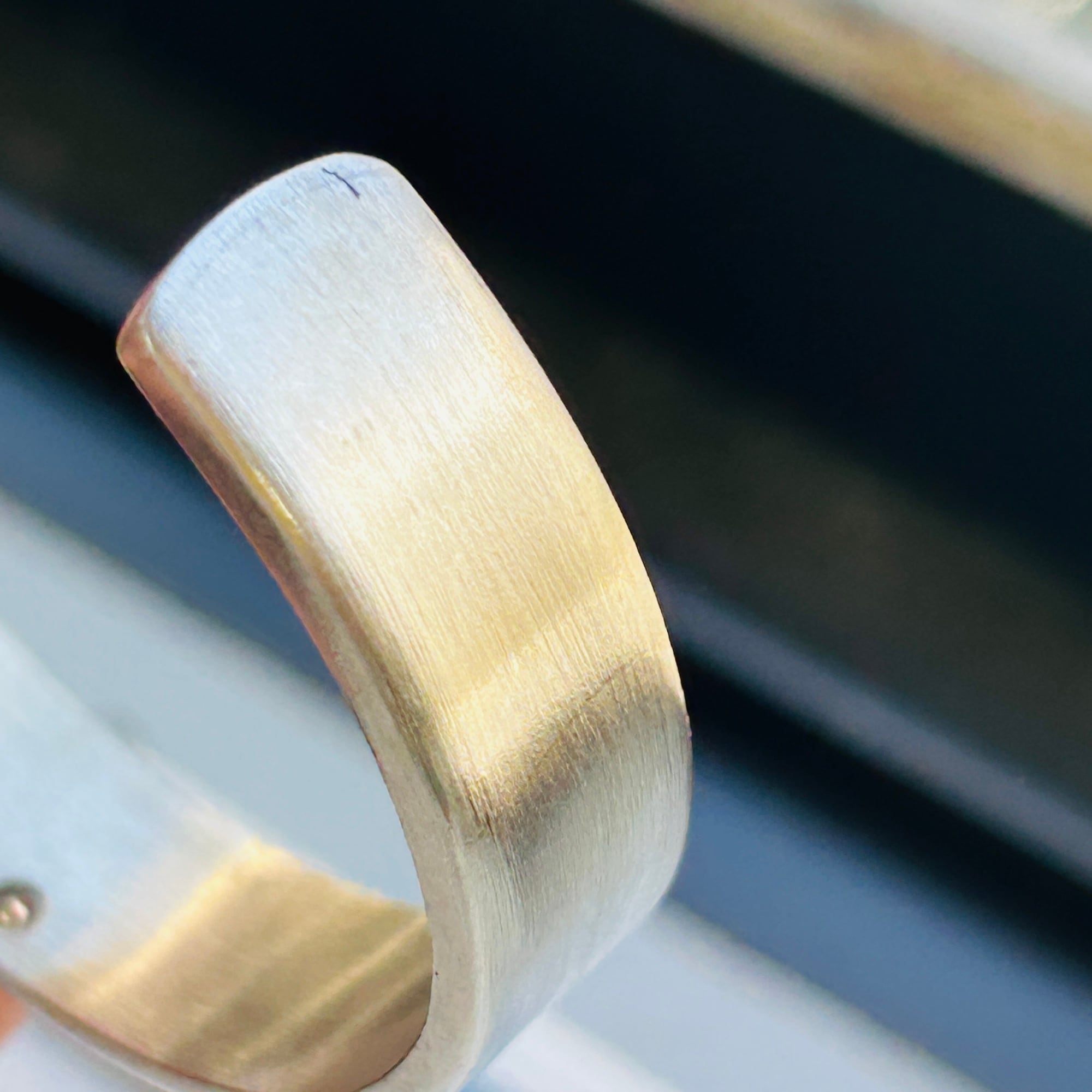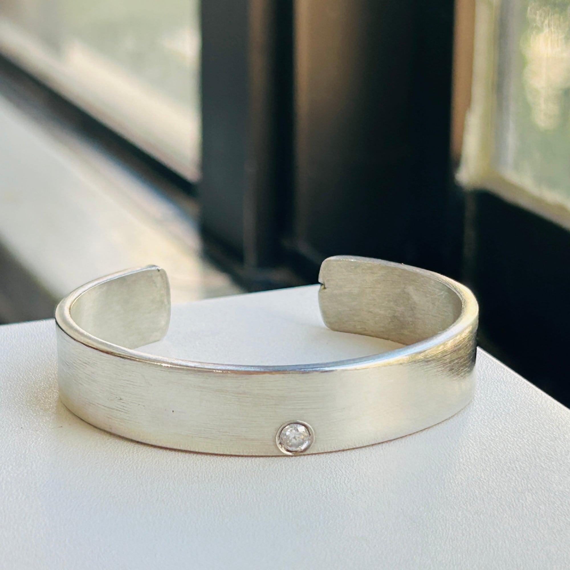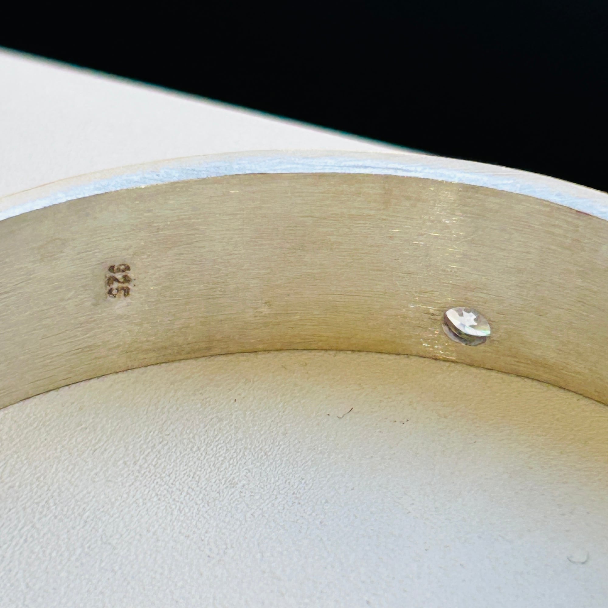 オフセットな位置にクリアストーンが埋め込まれたファッション・バングル。ツヤを抑えたセミマット仕上げ。ステンレスのような質感です。中は空洞で開口部分に穴がが開いており、重さをあまり感じない軽い作りです。着画ではよく似た質感のフランスシルバー、セミマットリングと合わせています。
