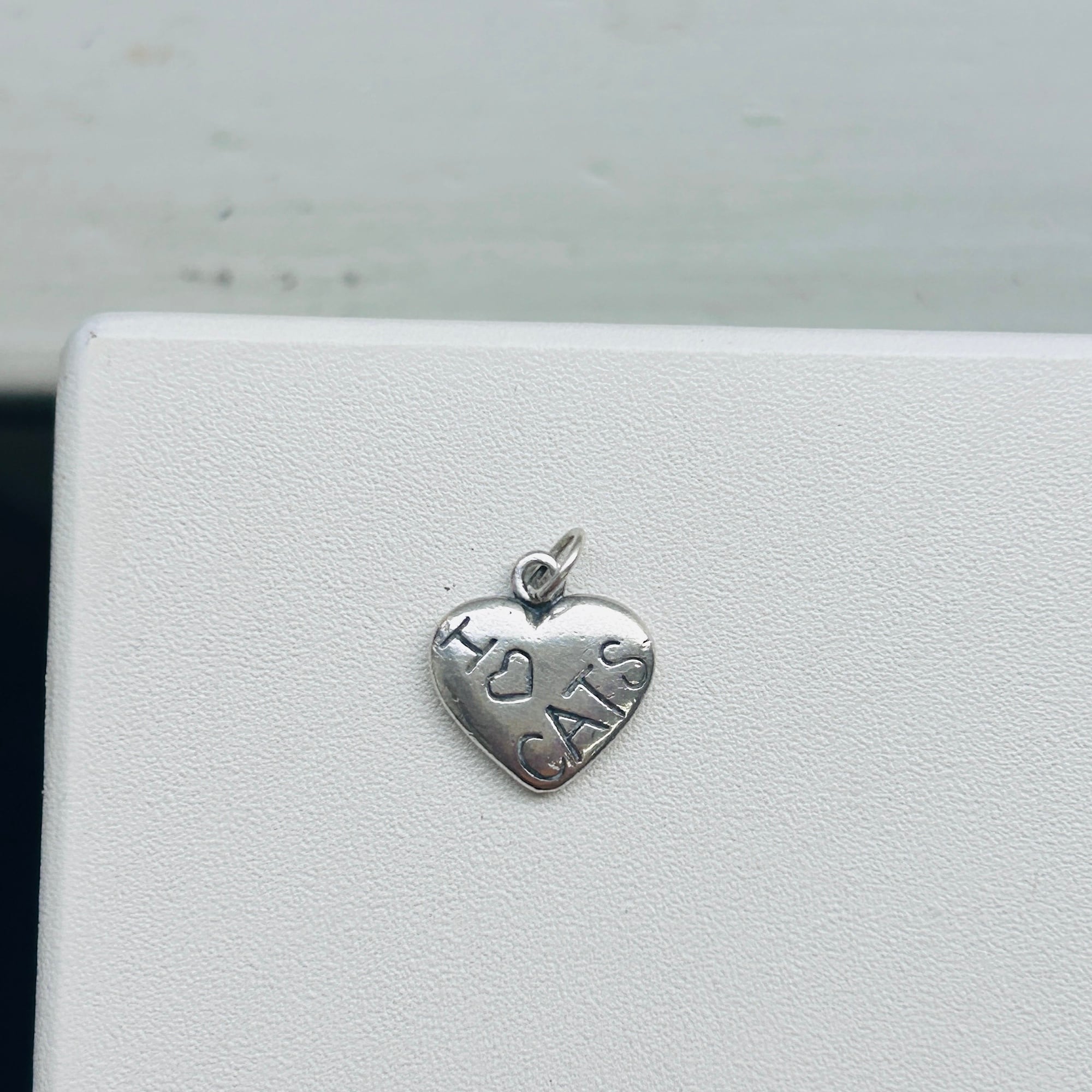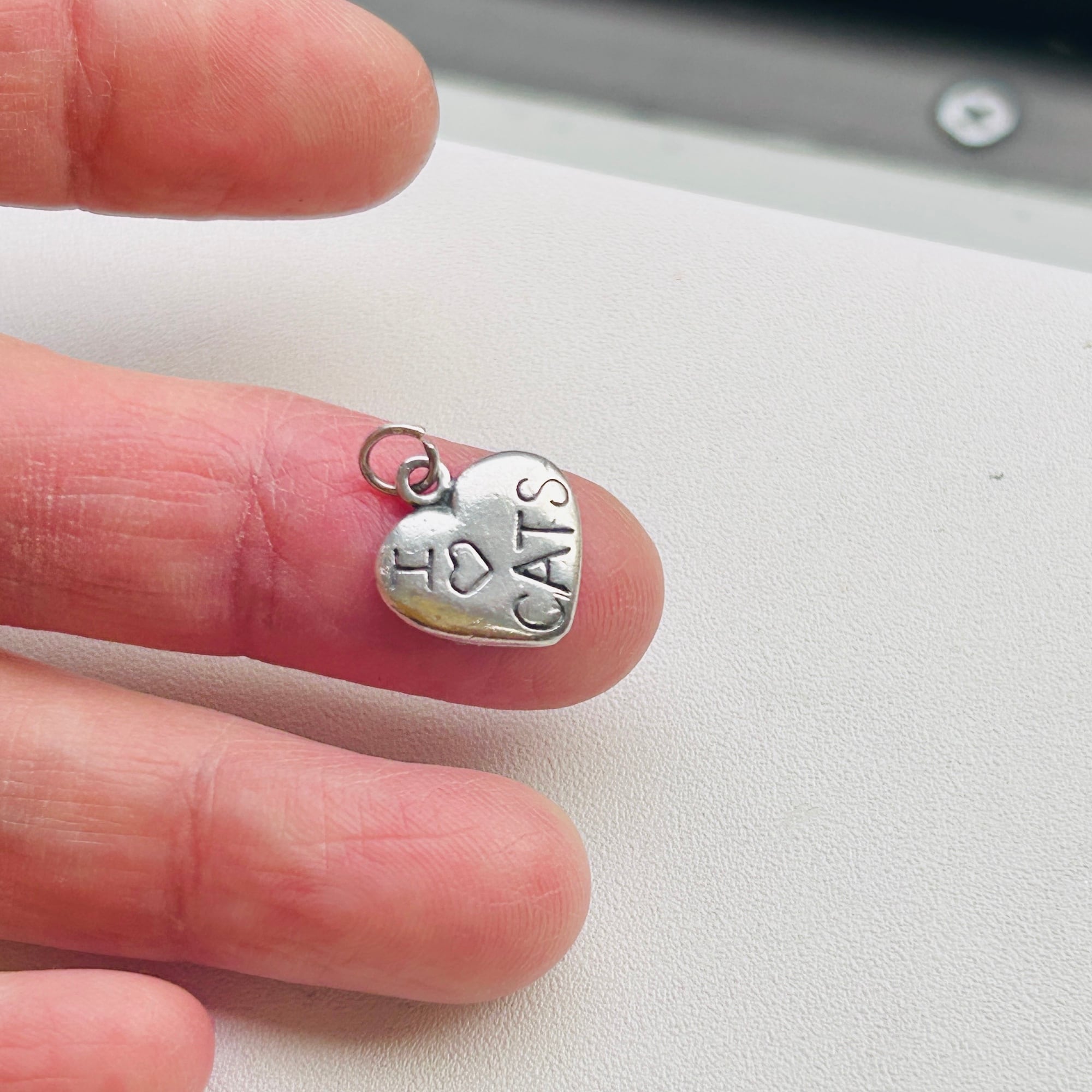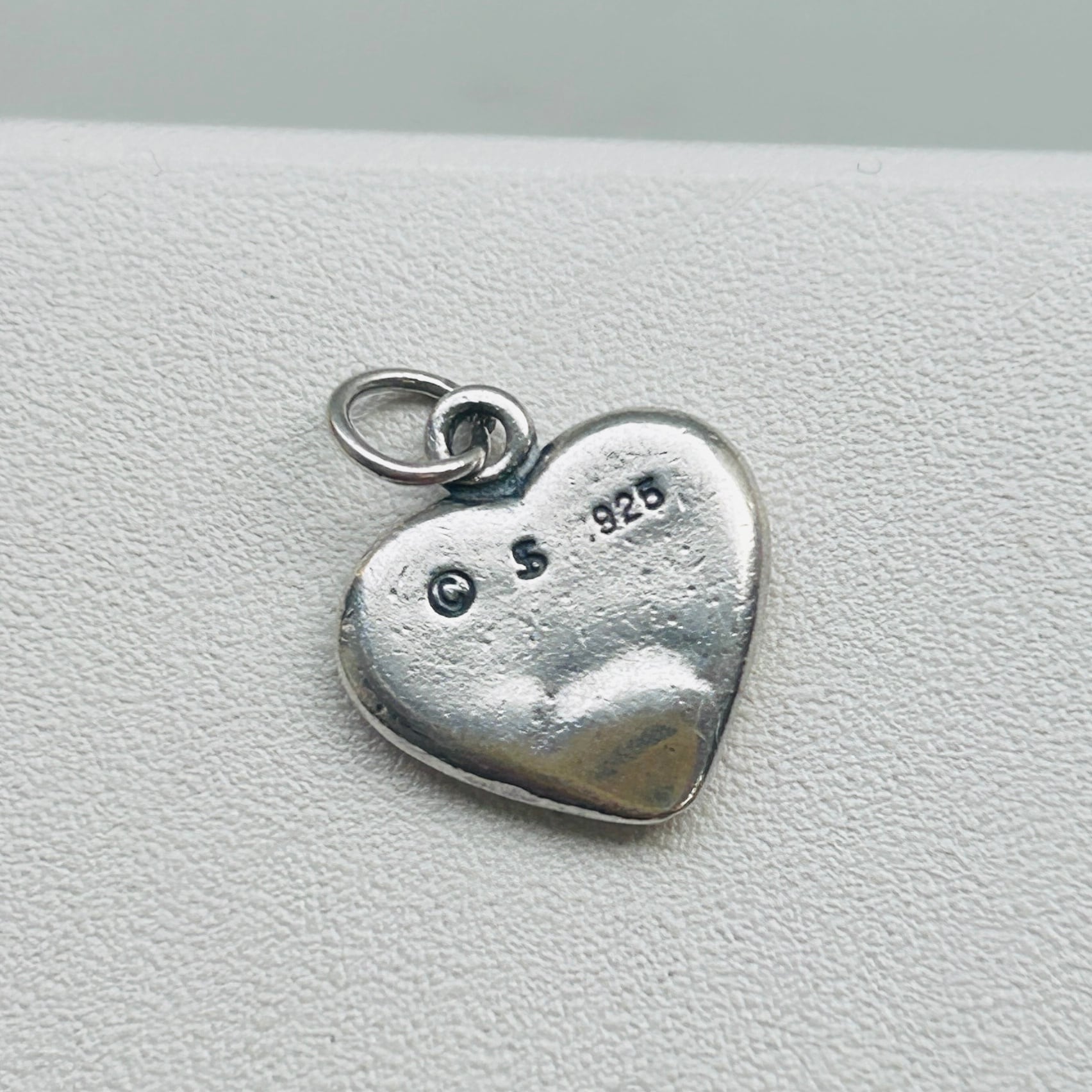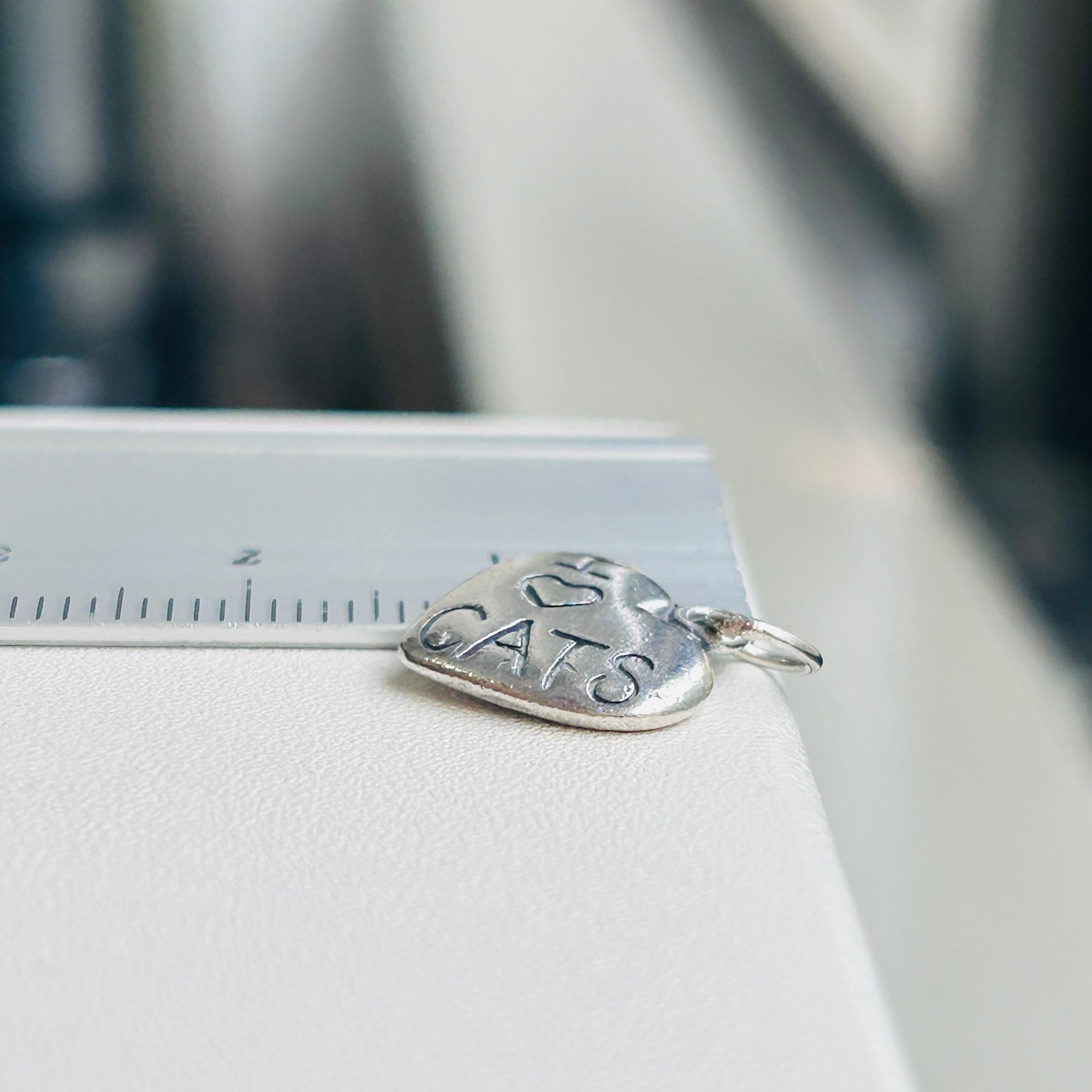 猫好きさんの為の小さなハートチャーム。さりげなく猫への愛を主張できるチャームです。鉛っぽい色味、質感のシルバーです。小さいですが厚みがありゴロンとしています。裏面にメーカーマークと「925」。丸カン内径3mmです。チェーンは付属しません。チェーンをお探しの場合はお問い合わせ下さい。