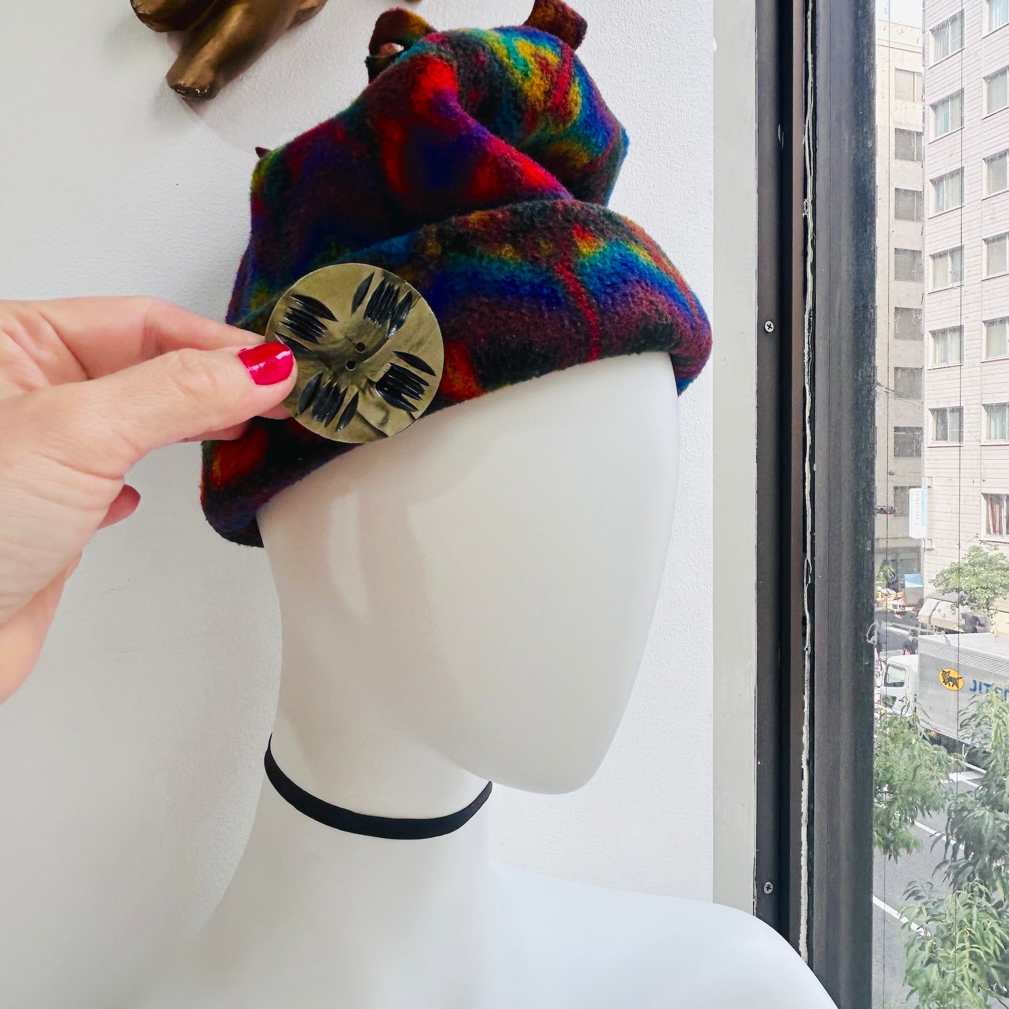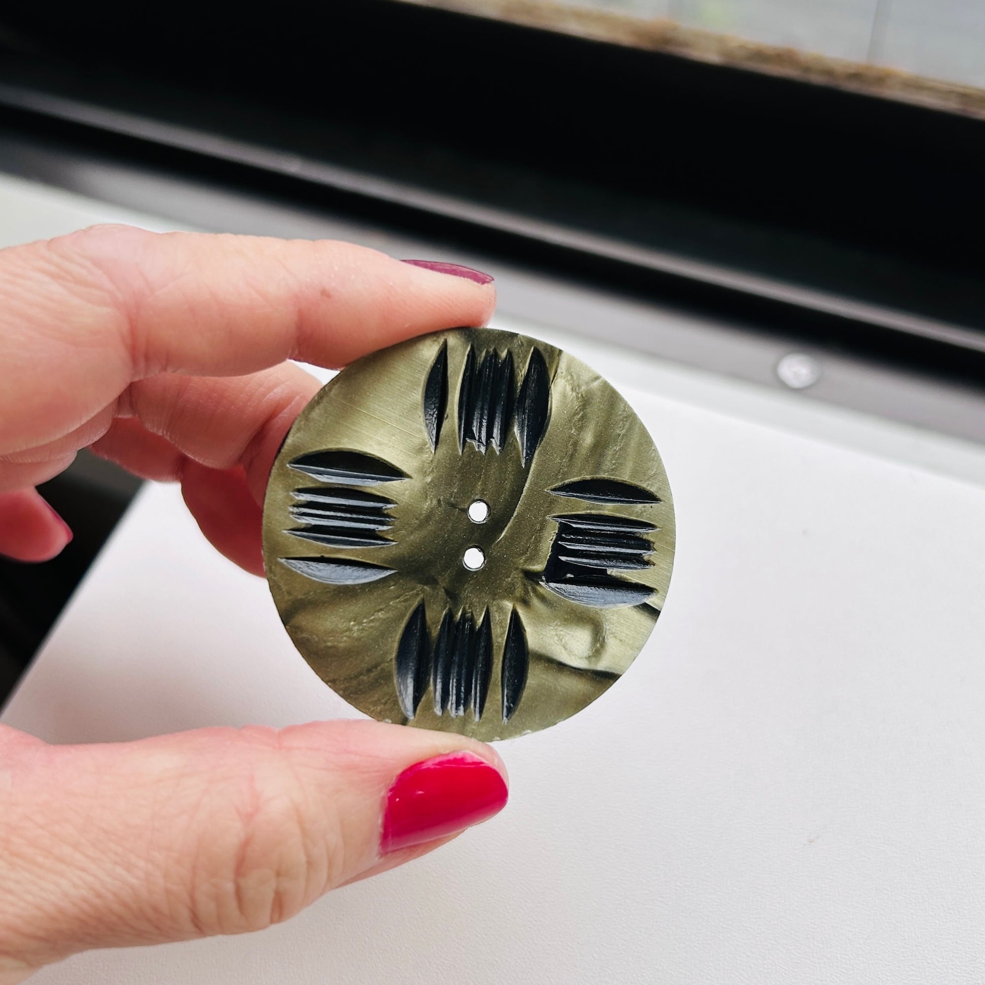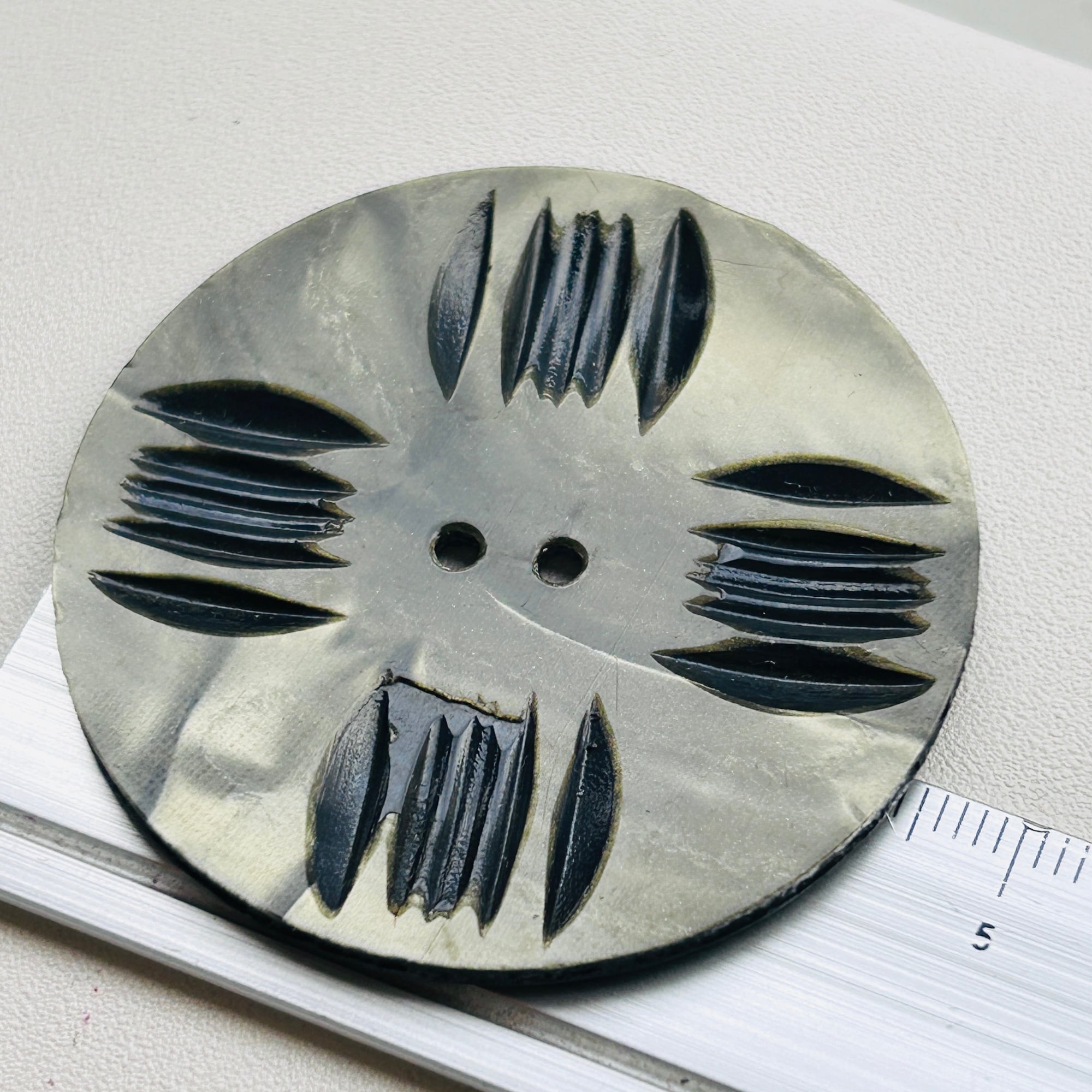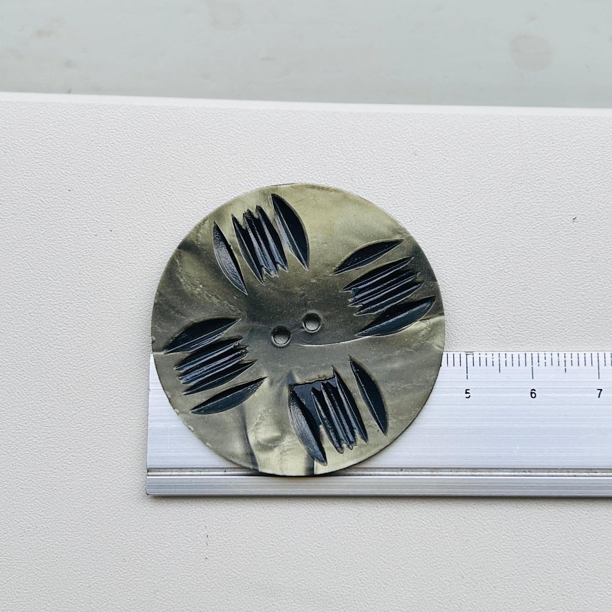 大きなセルロイドボタン。パール調の渋いセージグリーンに彫りが入っています。ヴィンテージらしくてとても可愛いです。きっととても可愛いコートやカーディガンに着いていたんだろうなぁと想像できますね。白い筋のように見えるのはヒビではありません。Good Proce!
