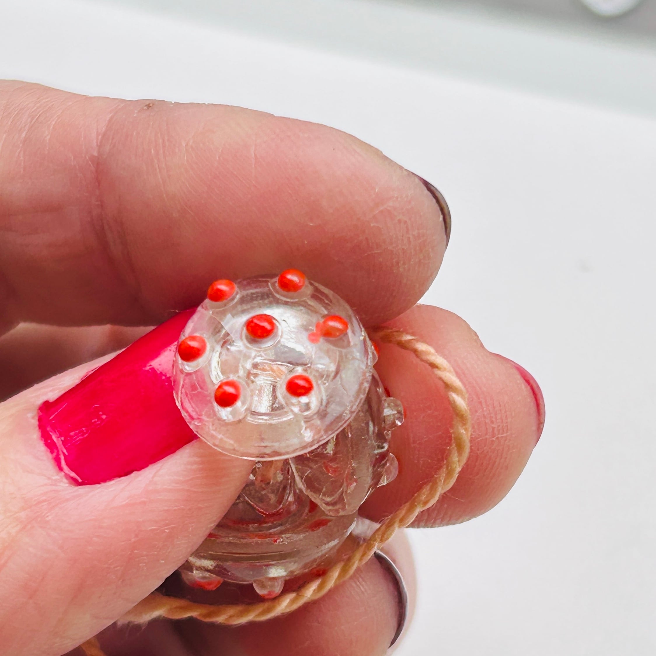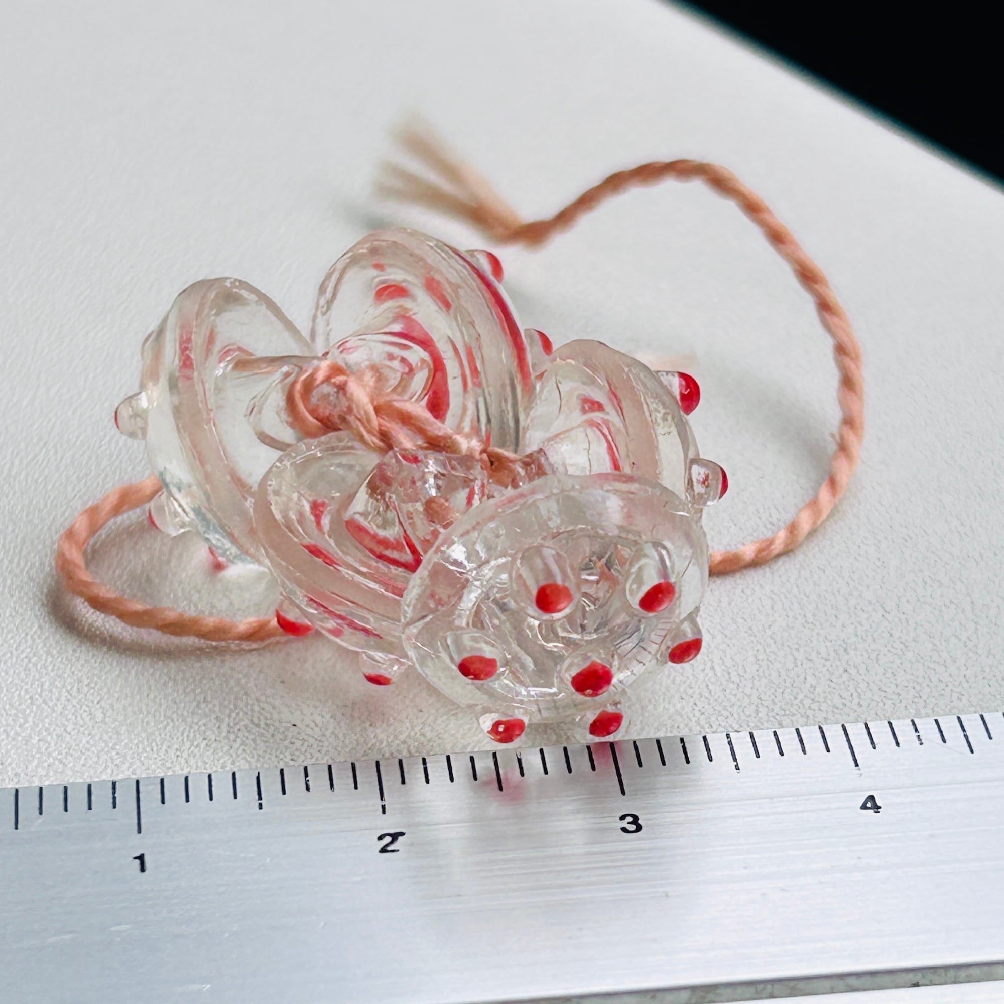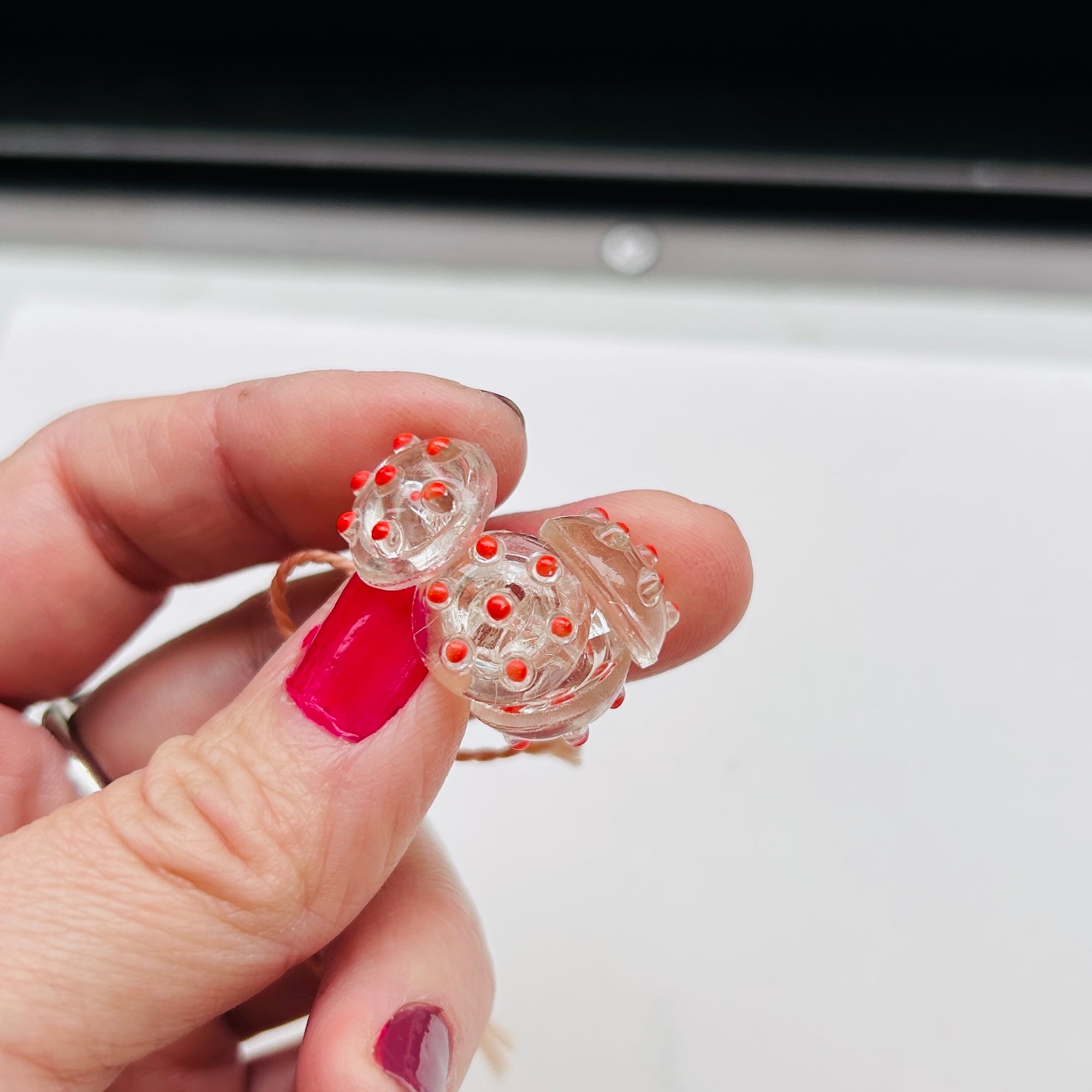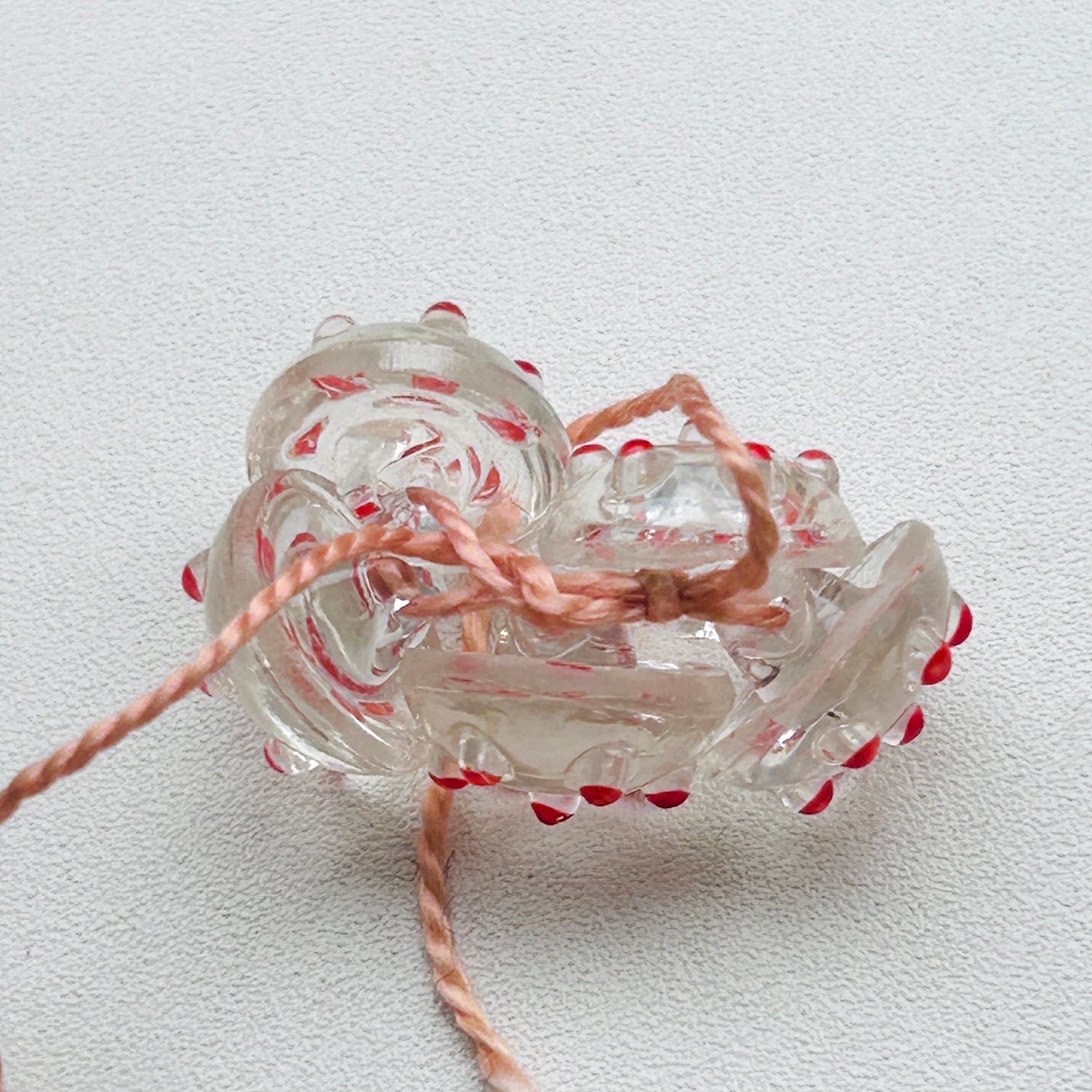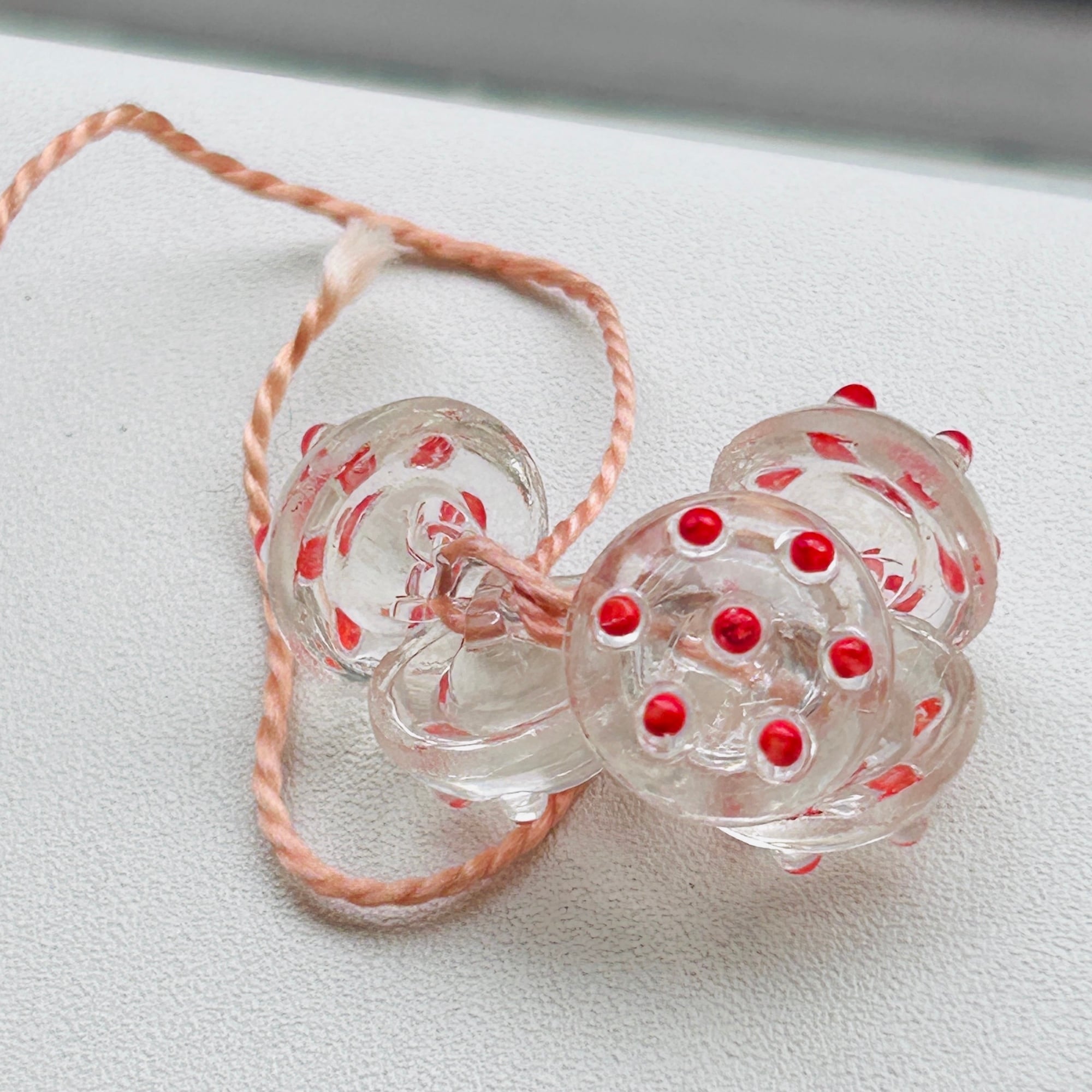 朱赤ドットのキュートなガラスボタン。糸に通してバラけないよう保管されていました。見つけたままの状態で販売いたします。ボタンは全部で5つ。割れ欠けありません。Good Price!