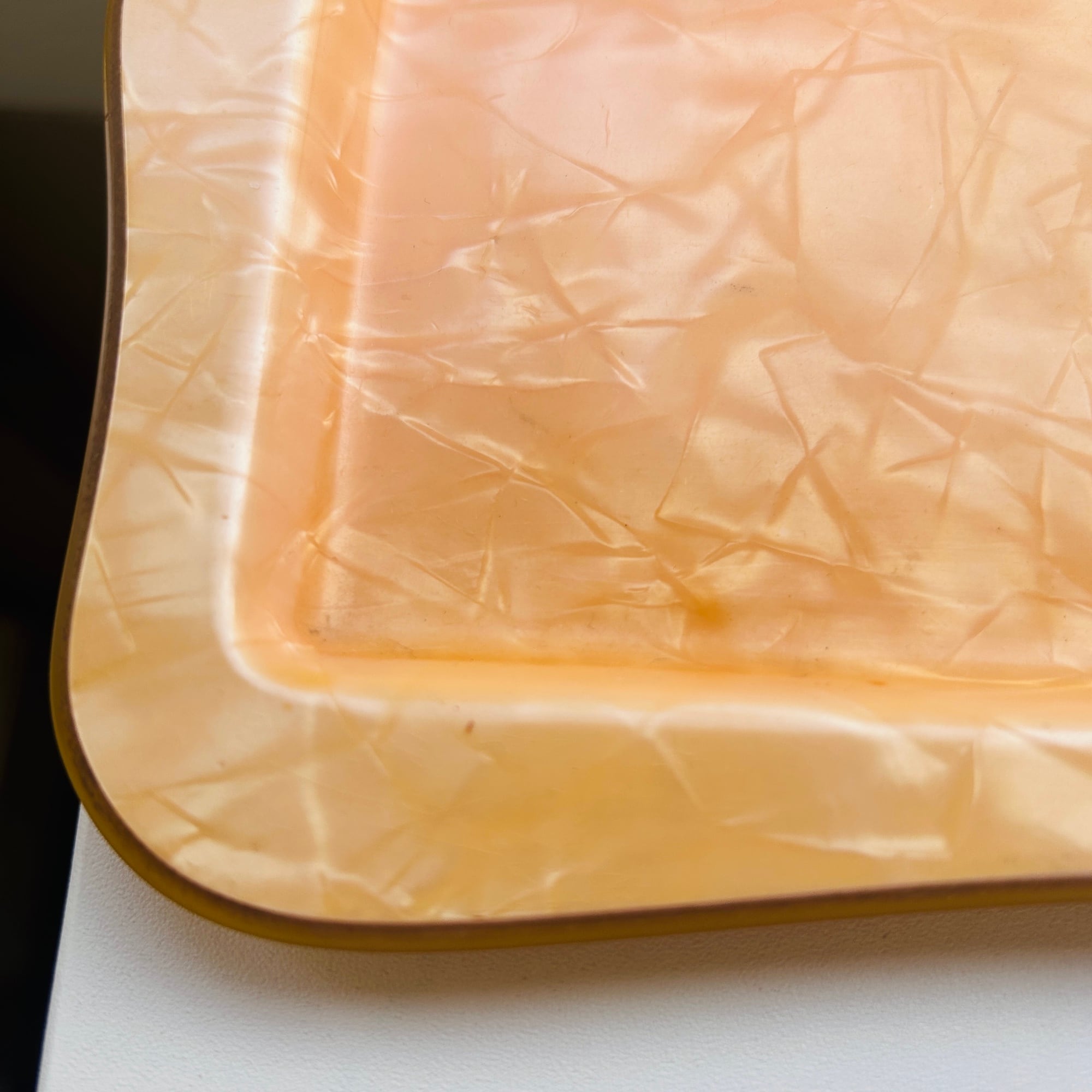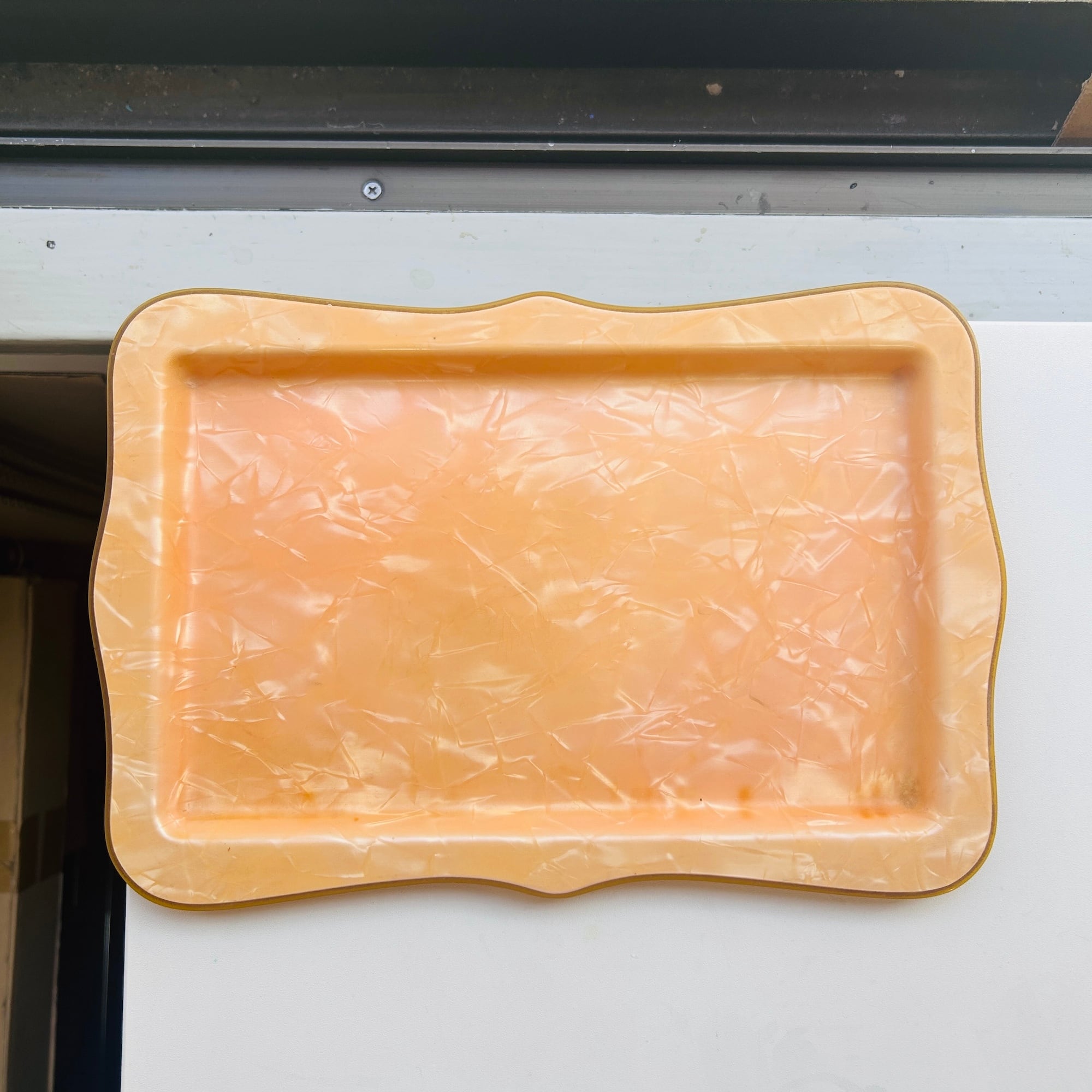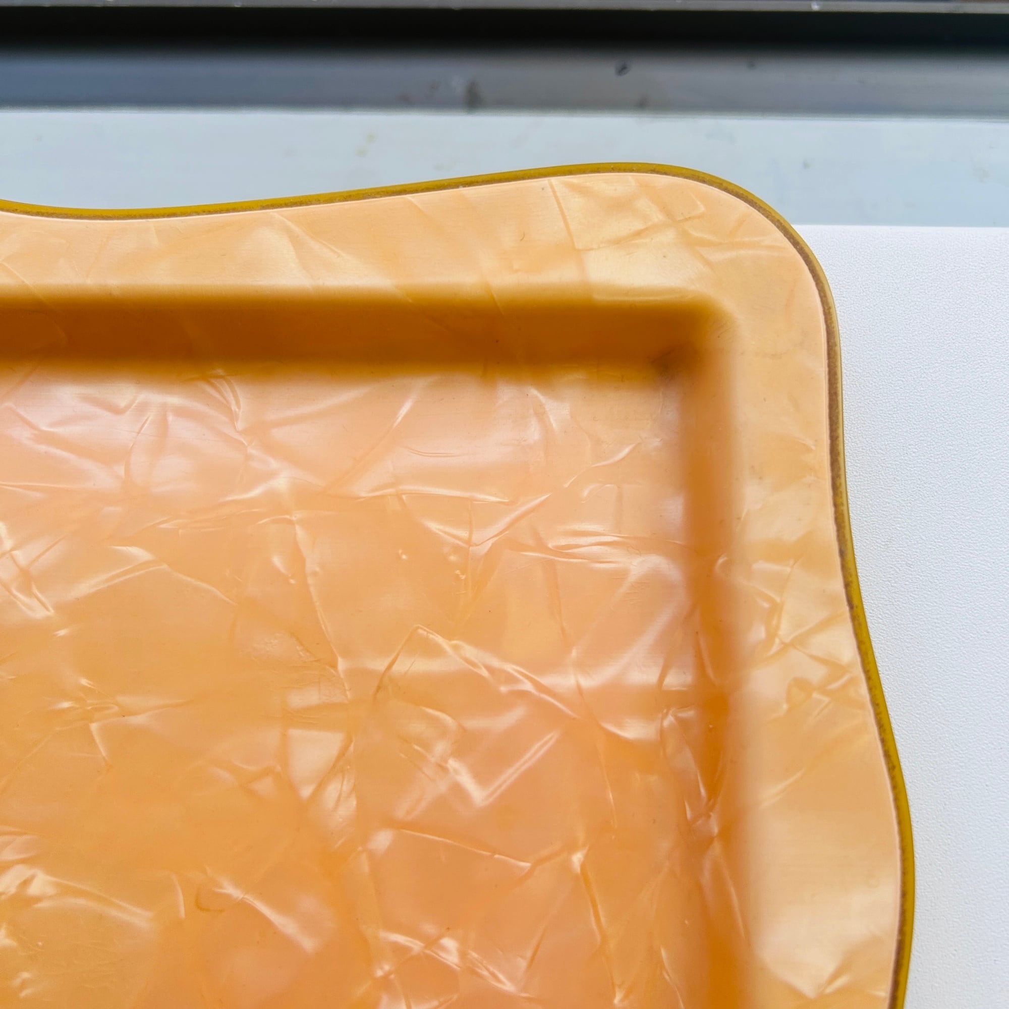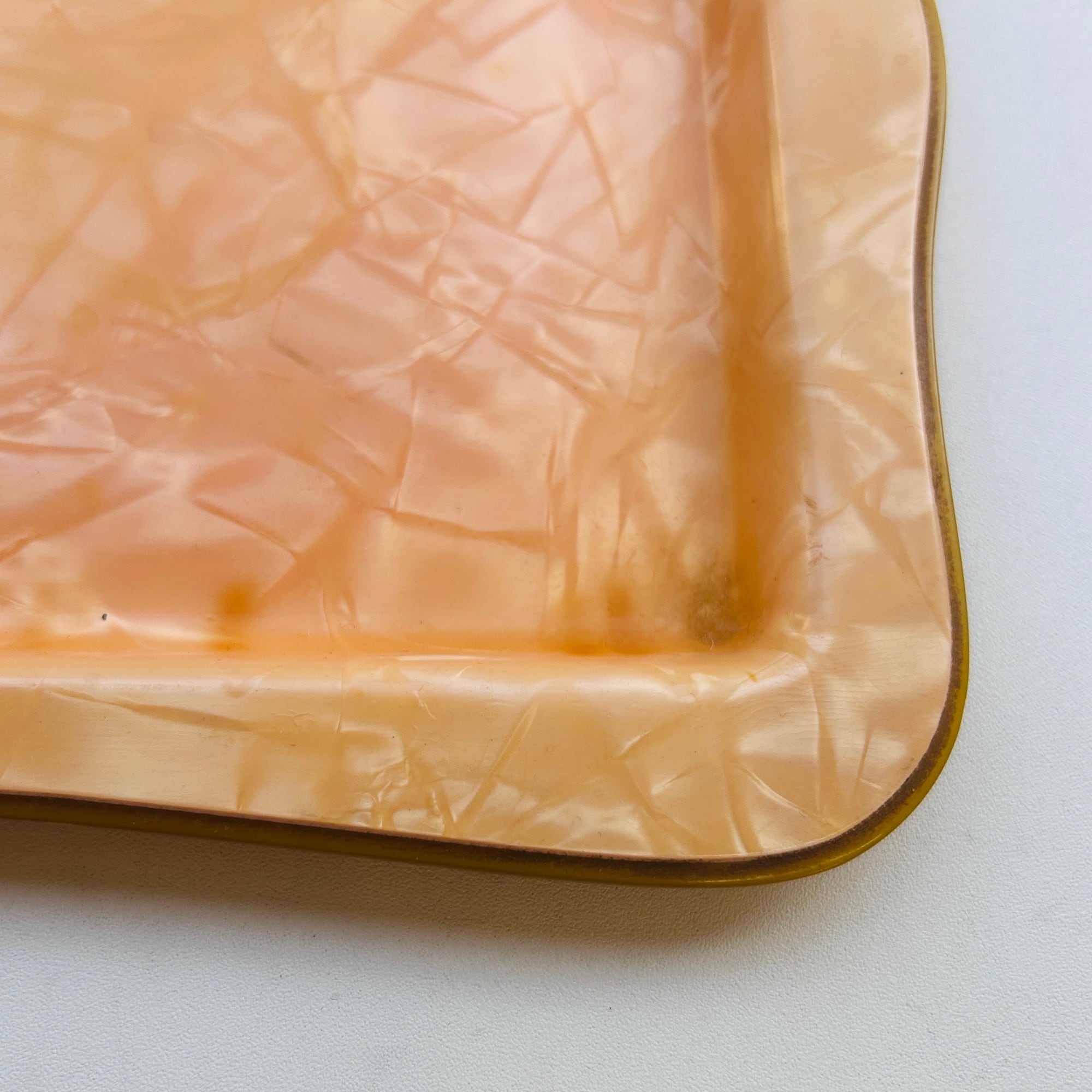 パール調パステルオレンジのノスタルジックなトレイ。セルロイド製です。ちょうどカップ&ソーサーと豆皿が乗るサイズ。一人ティータイムの気分が上がるトレイです。厚みがあり硬くて丈夫なトレイです。食洗機使用不可です。
