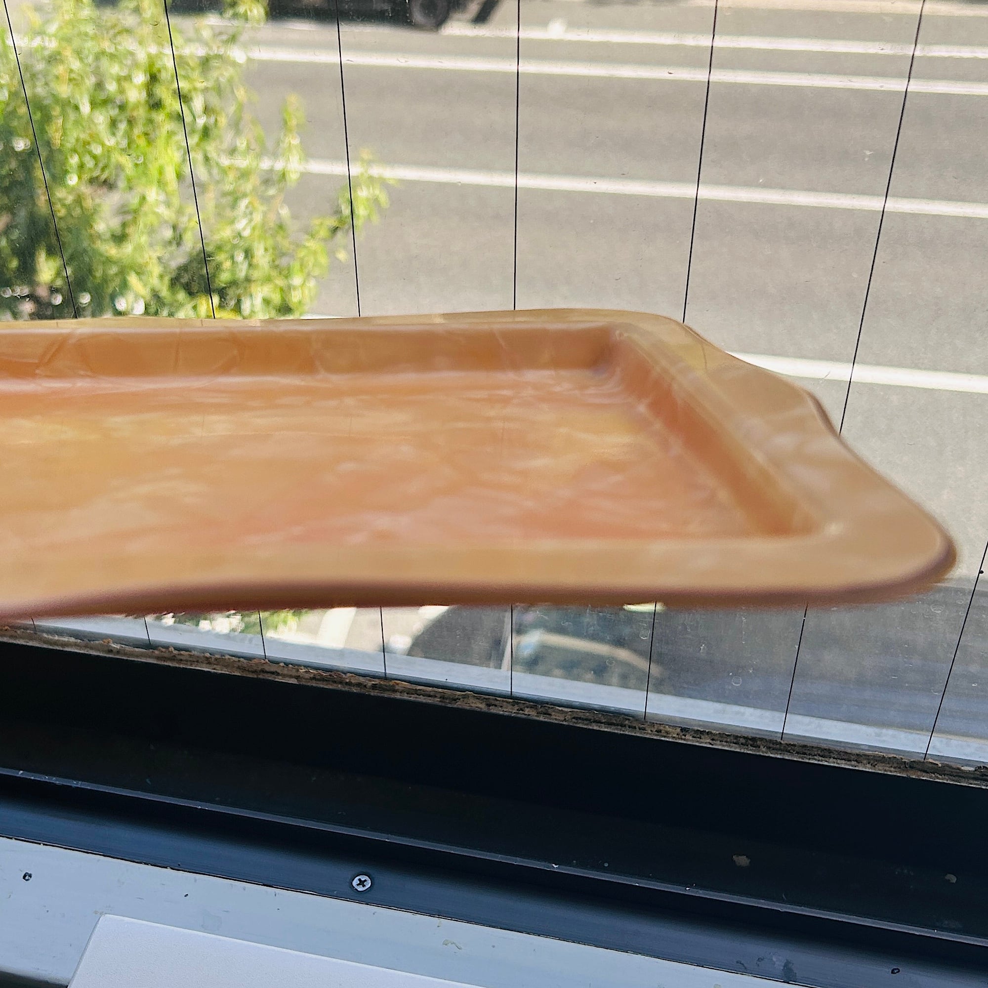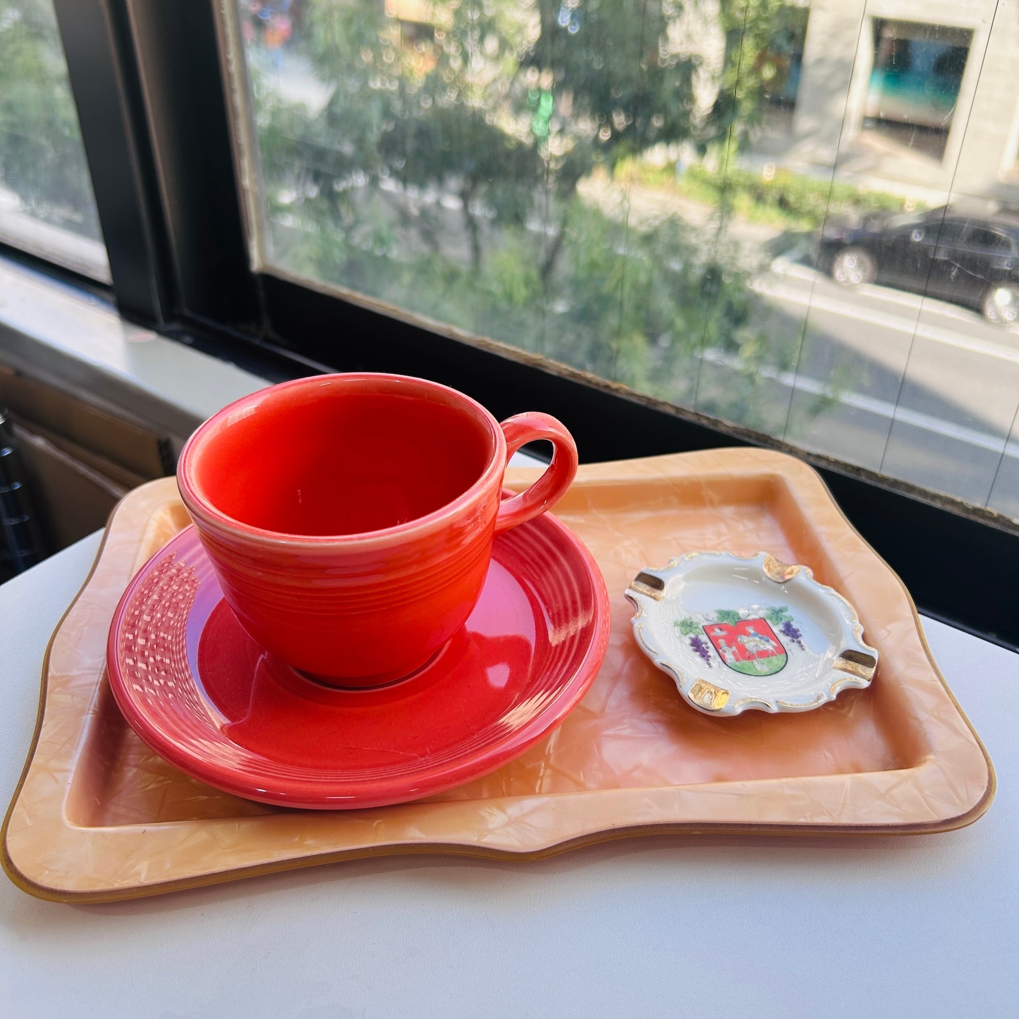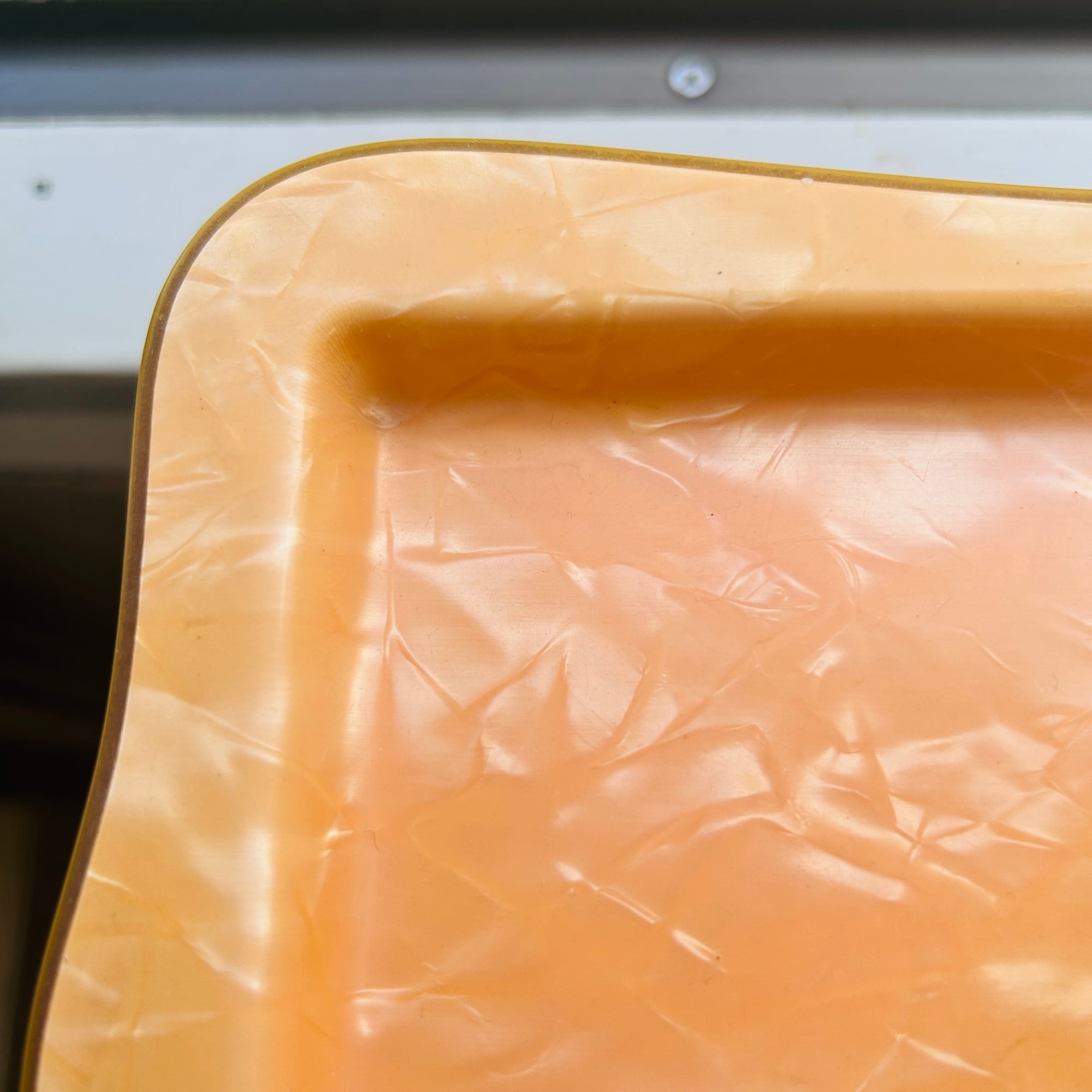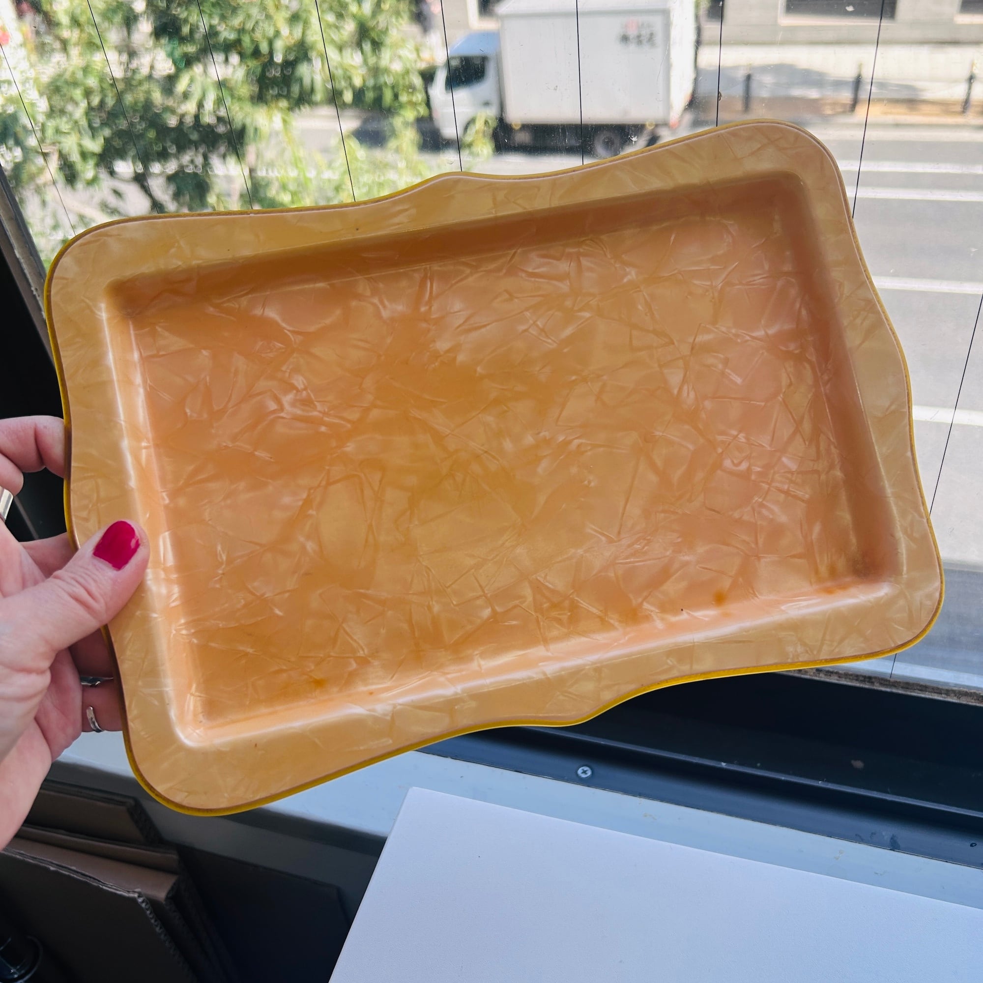 パール調パステルオレンジのノスタルジックなトレイ。セルロイド製です。ちょうどカップ&ソーサーと豆皿が乗るサイズ。一人ティータイムの気分が上がるトレイです。厚みがあり硬くて丈夫なトレイです。食洗機使用不可です。