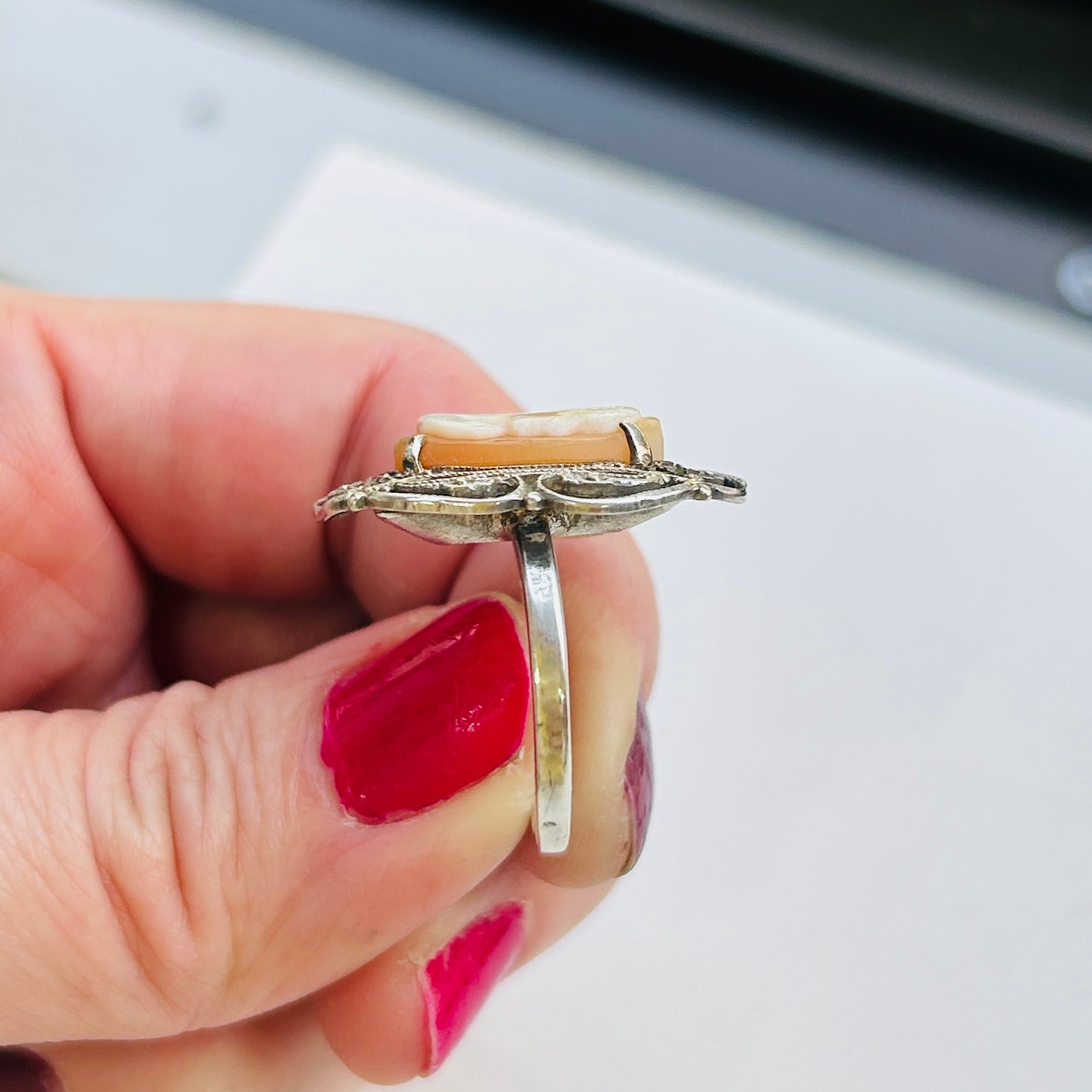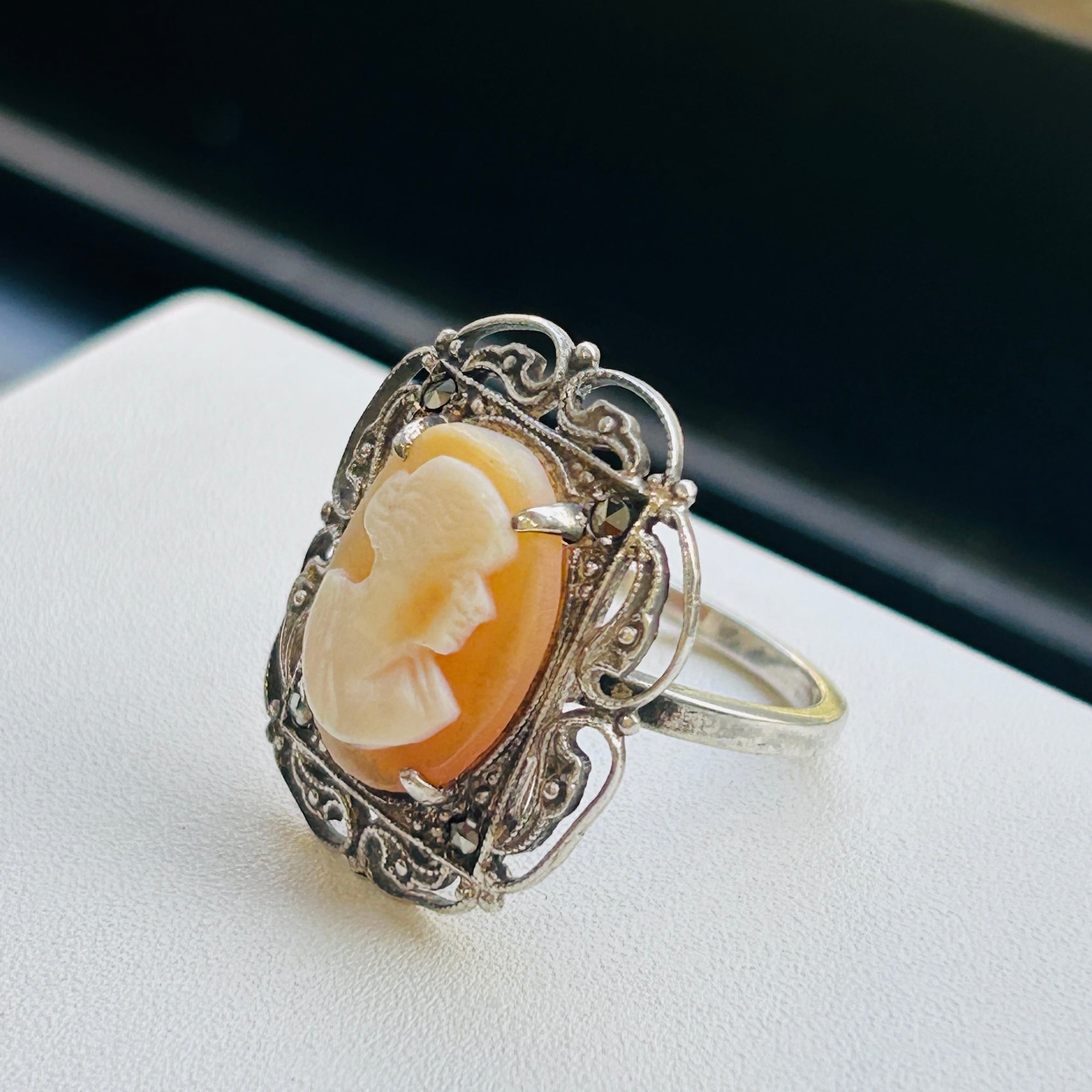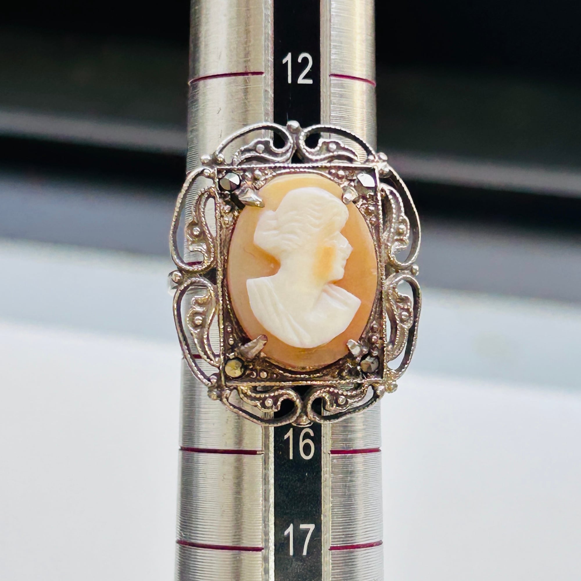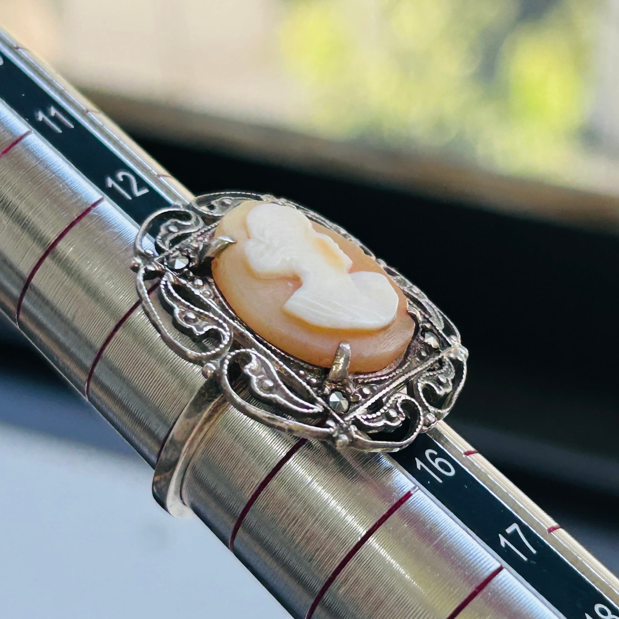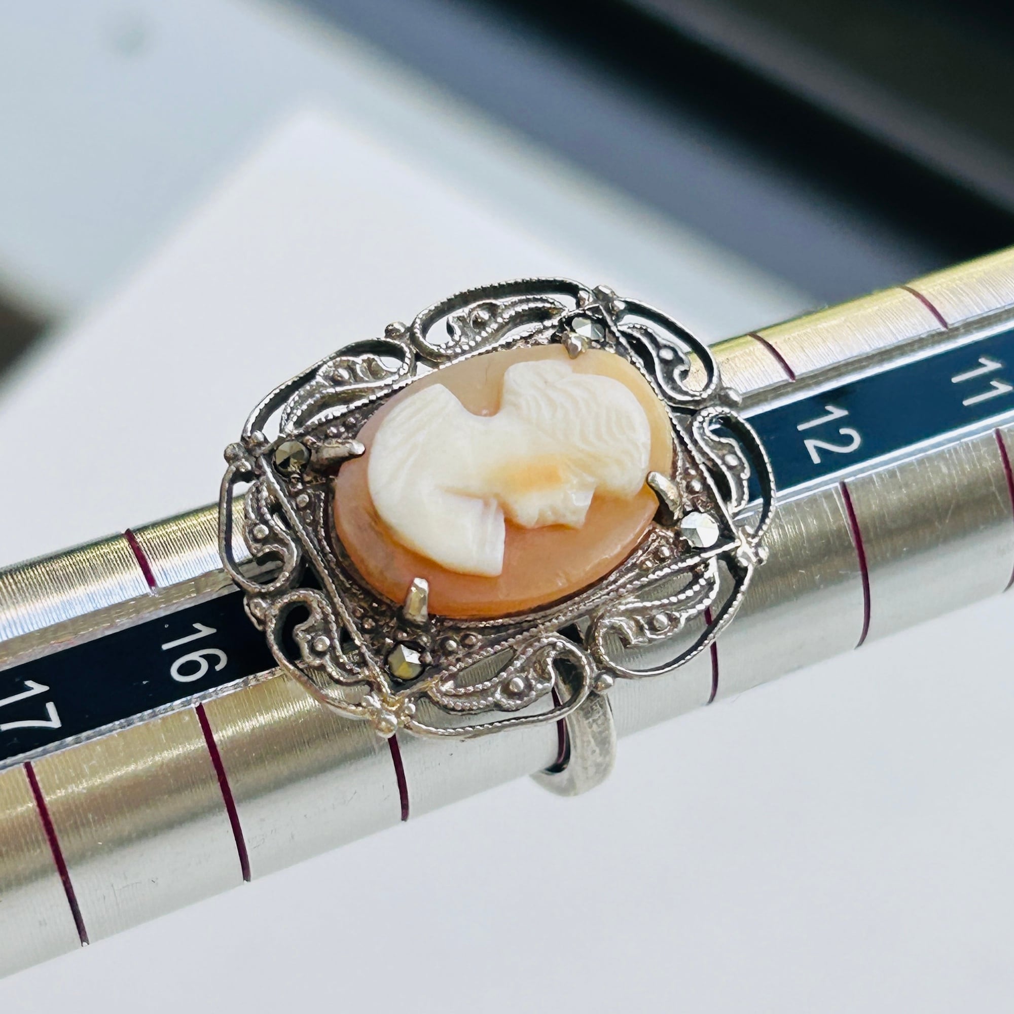 銀線細工フレームがデコラティブなカメオリング。シルバーにシェルカメオが4点爪どめされています。爪の根元にはマーカサイトが独特の輝きを放っています。シルバー刻印のなしシルバーです。バンドが細くカメオ裏にスペースがあるので実寸より大きな指に入ります。サイズ棒では14号ですが普段14〜15号の人差し指に緩いので16号としました。