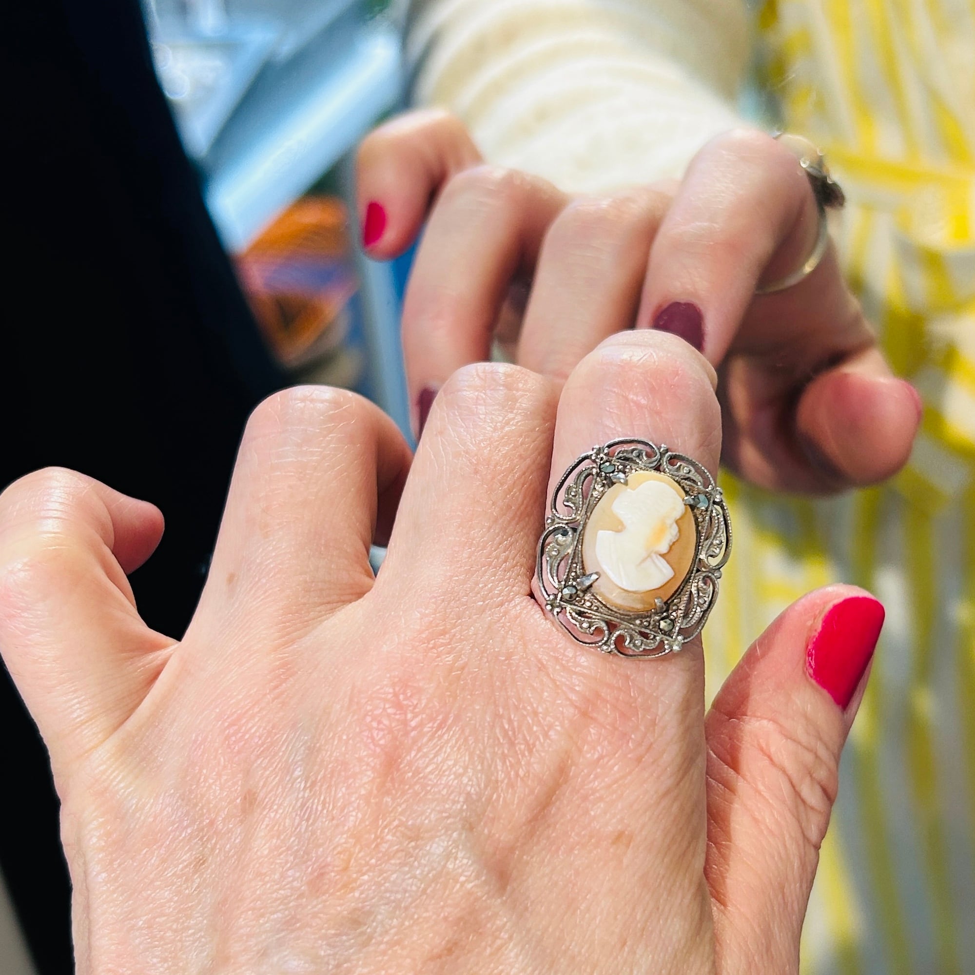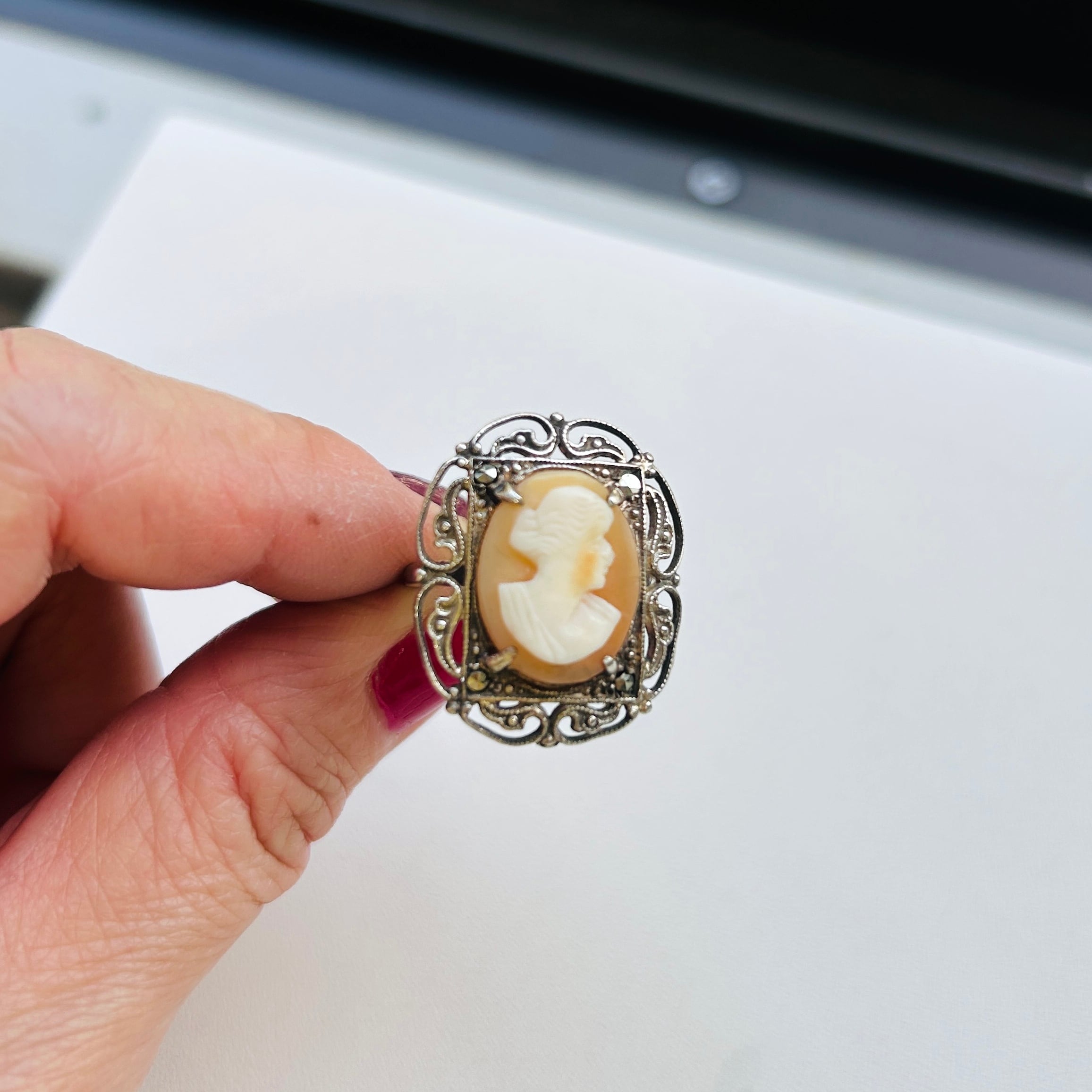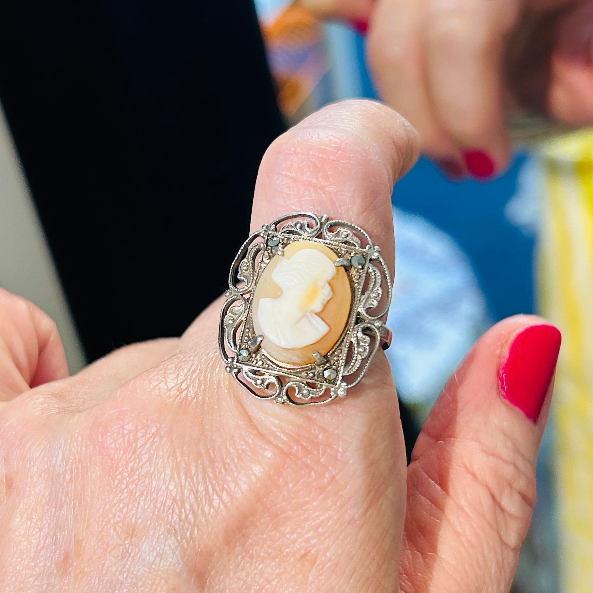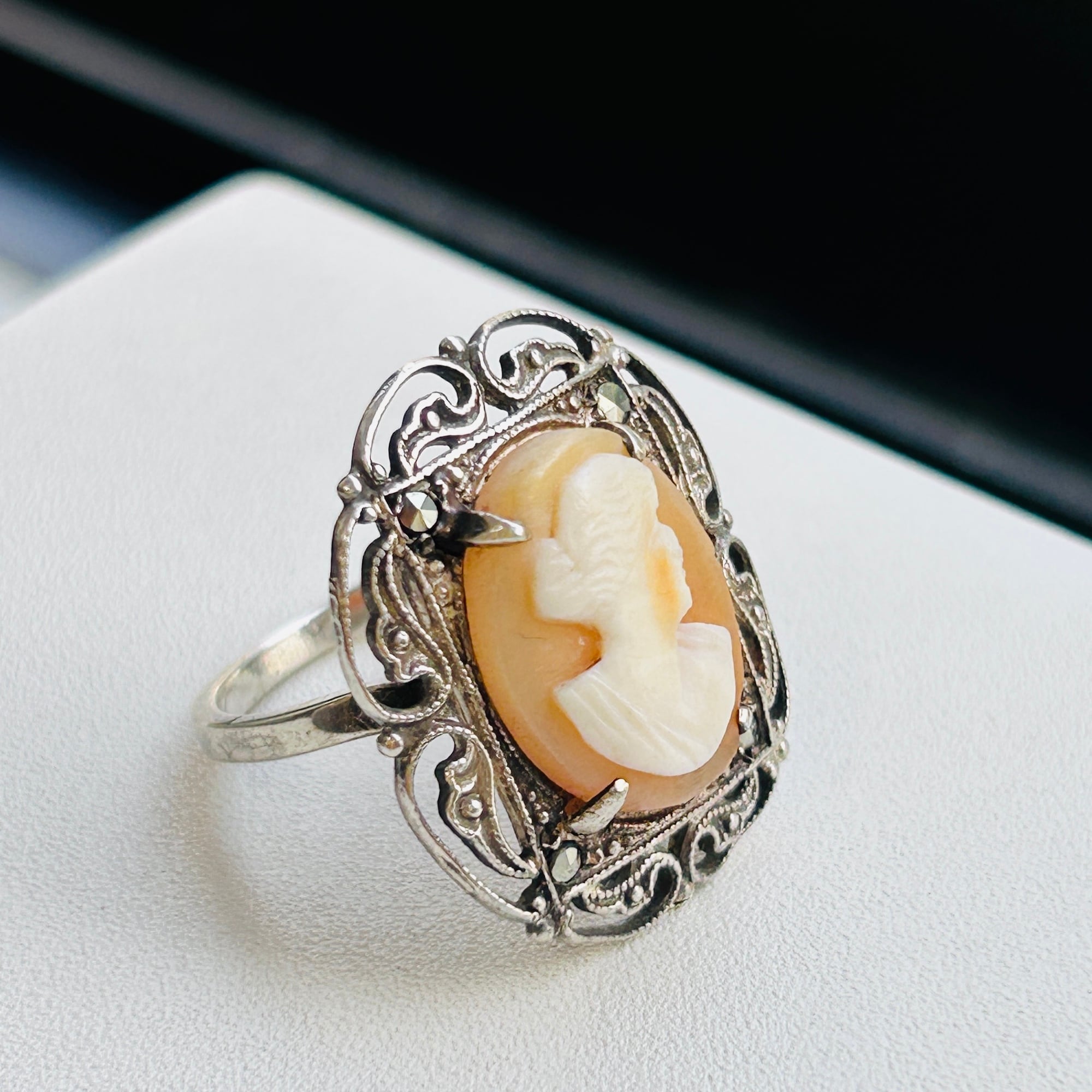 銀線細工フレームがデコラティブなカメオリング。シルバーにシェルカメオが4点爪どめされています。爪の根元にはマーカサイトが独特の輝きを放っています。シルバー刻印のなしシルバーです。バンドが細くカメオ裏にスペースがあるので実寸より大きな指に入ります。サイズ棒では14号ですが普段14〜15号の人差し指に緩いので16号としました。