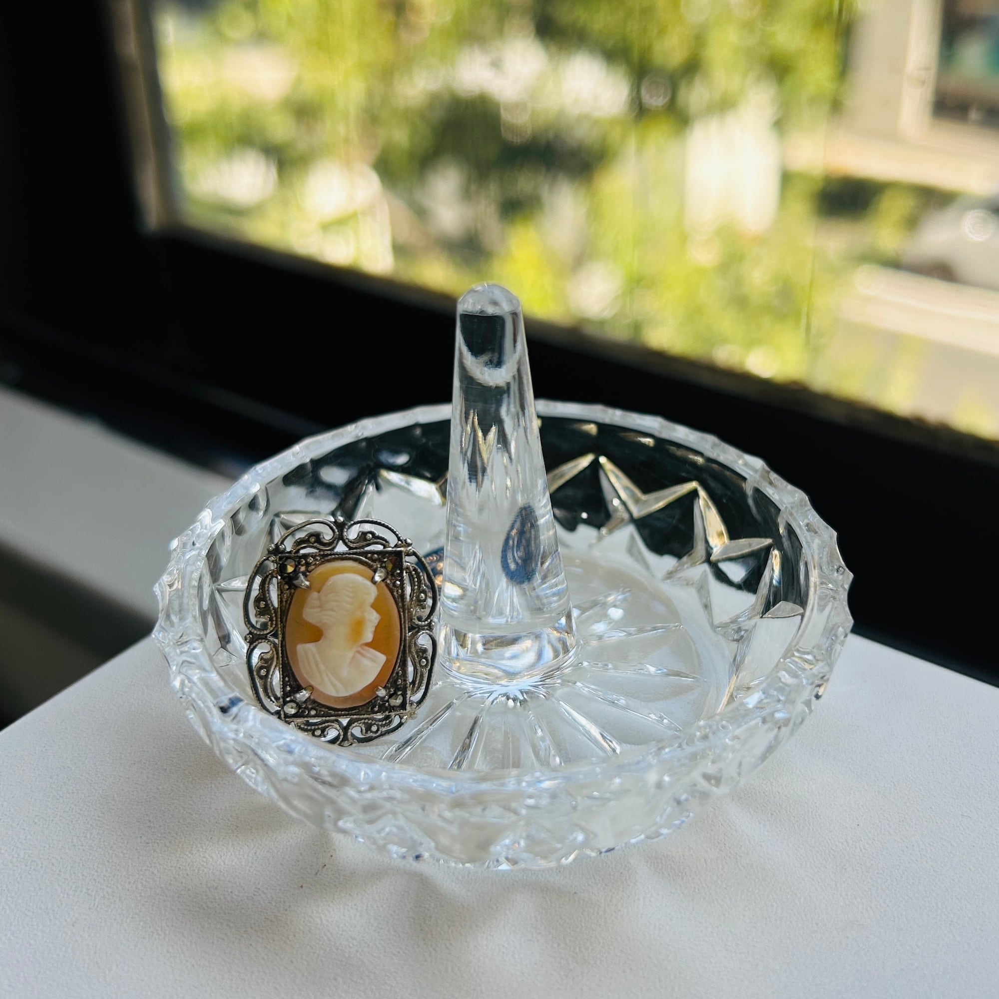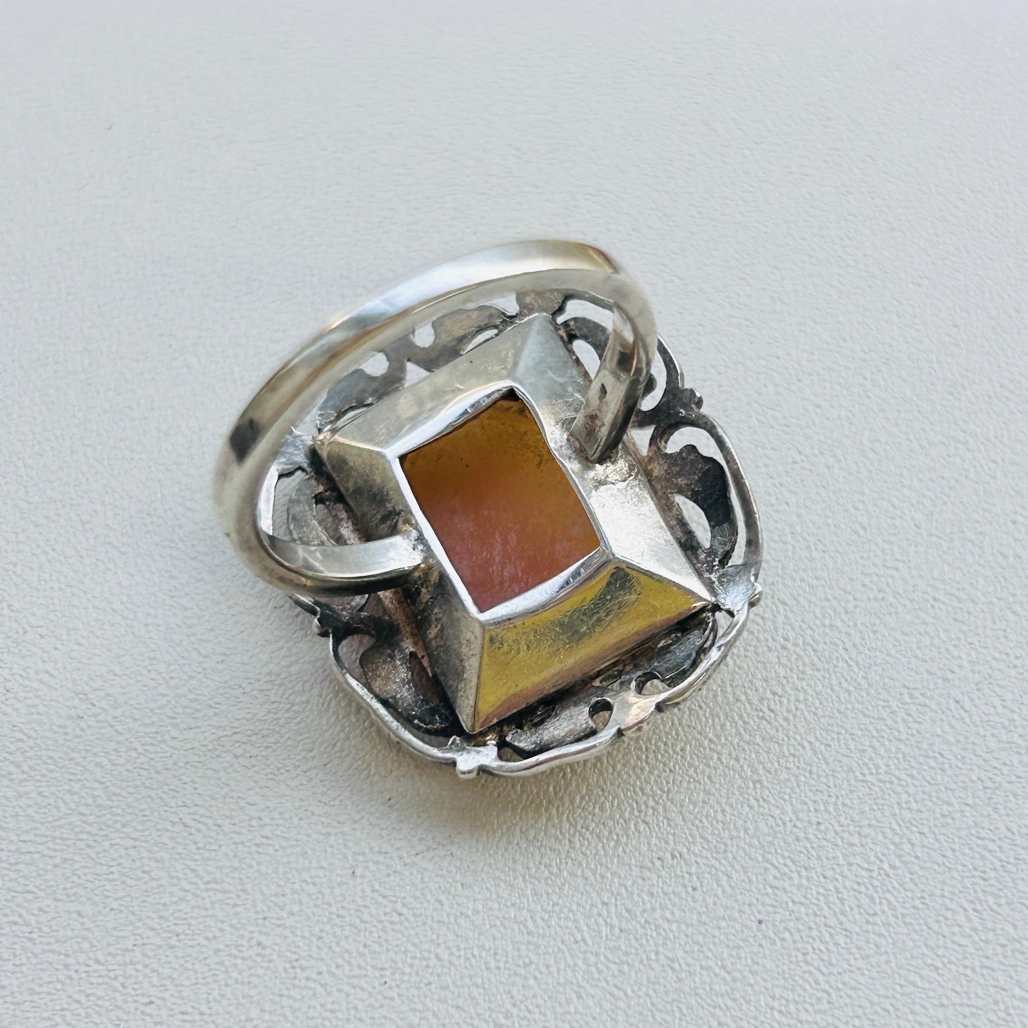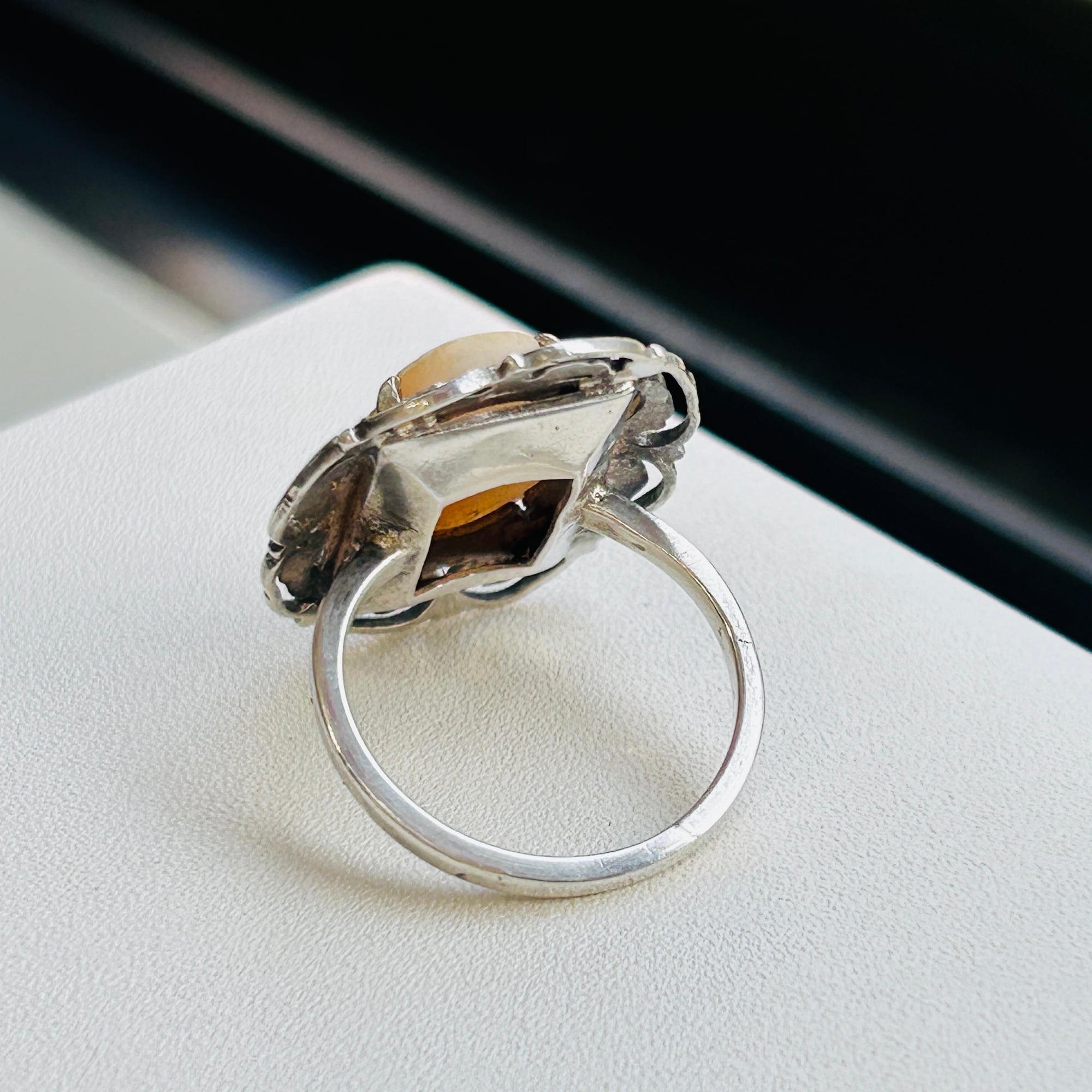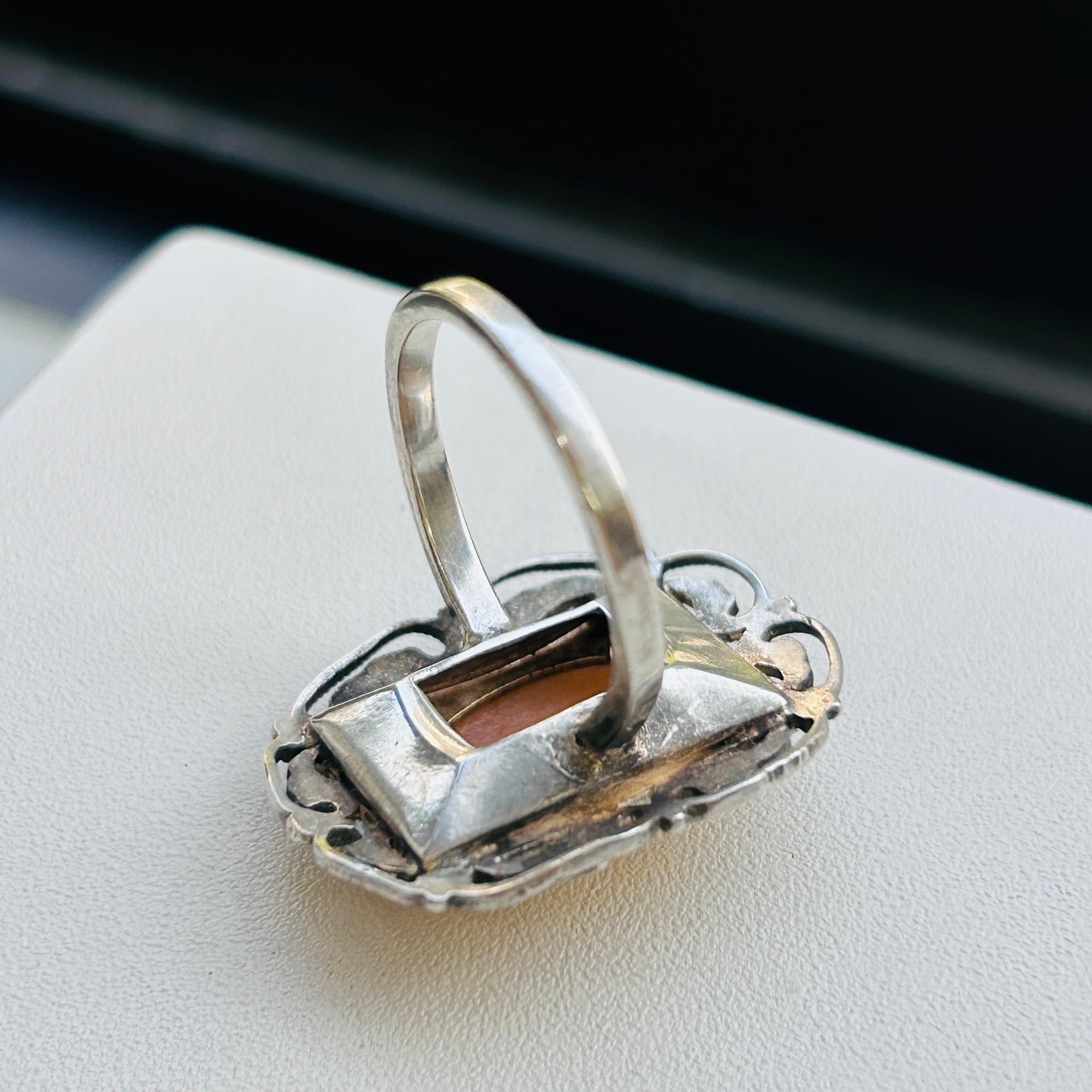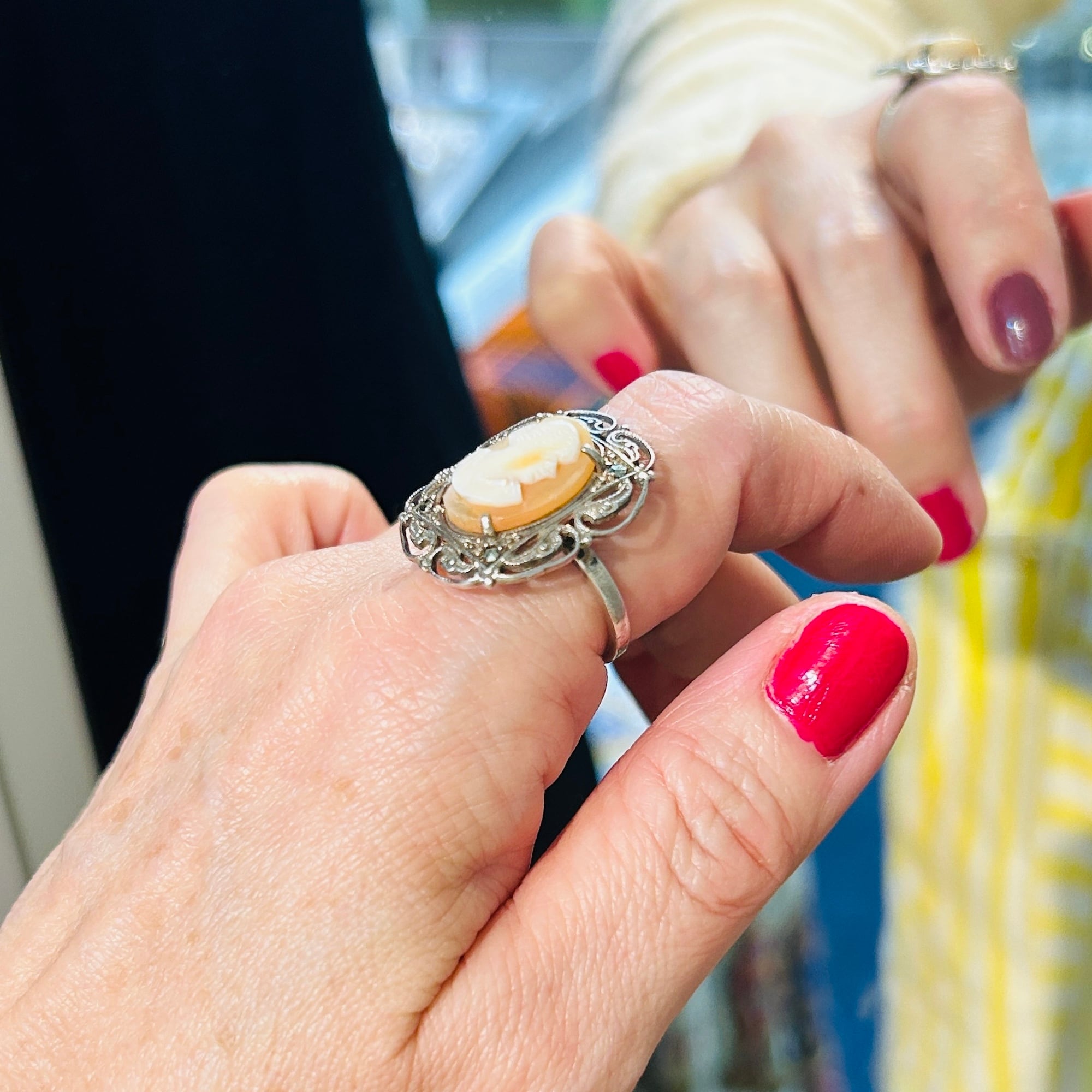 銀線細工フレームがデコラティブなカメオリング。シルバーにシェルカメオが4点爪どめされています。爪の根元にはマーカサイトが独特の輝きを放っています。シルバー刻印のなしシルバーです。バンドが細くカメオ裏にスペースがあるので実寸より大きな指に入ります。サイズ棒では14号ですが普段14〜15号の人差し指に緩いので16号としました。