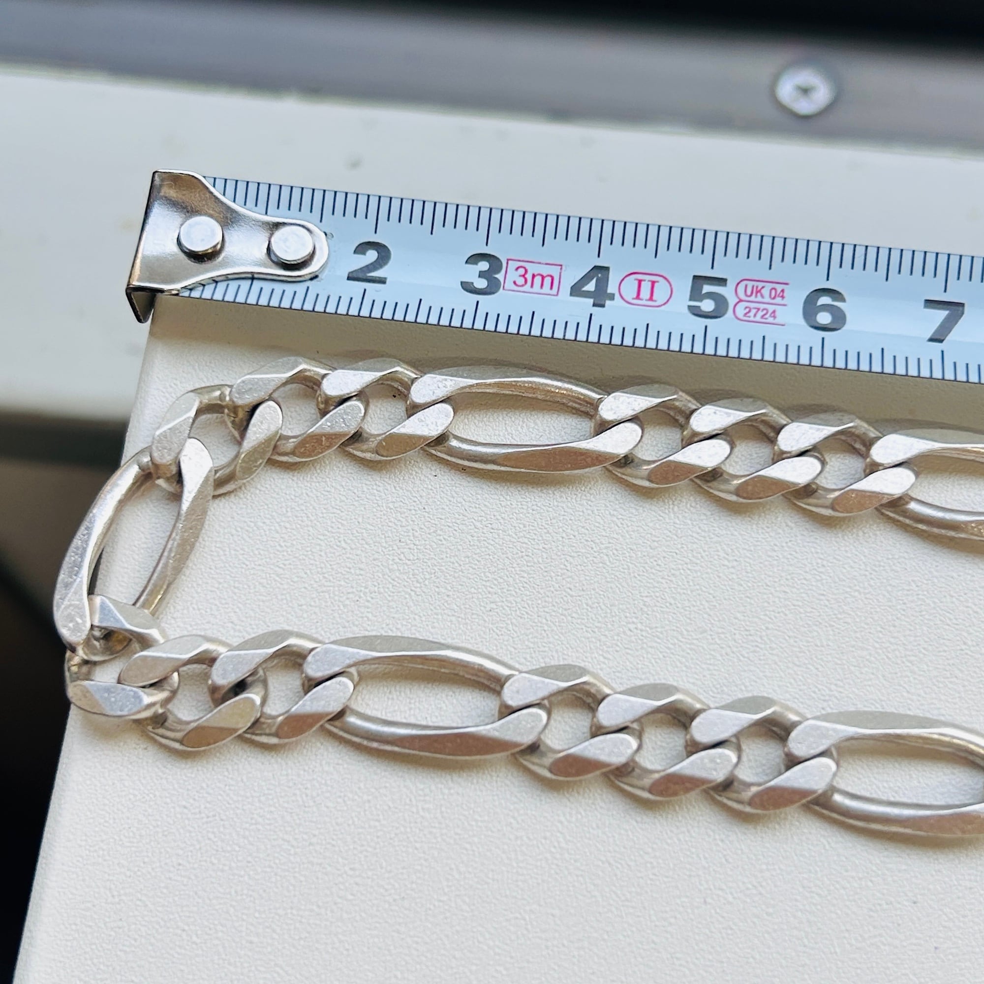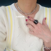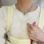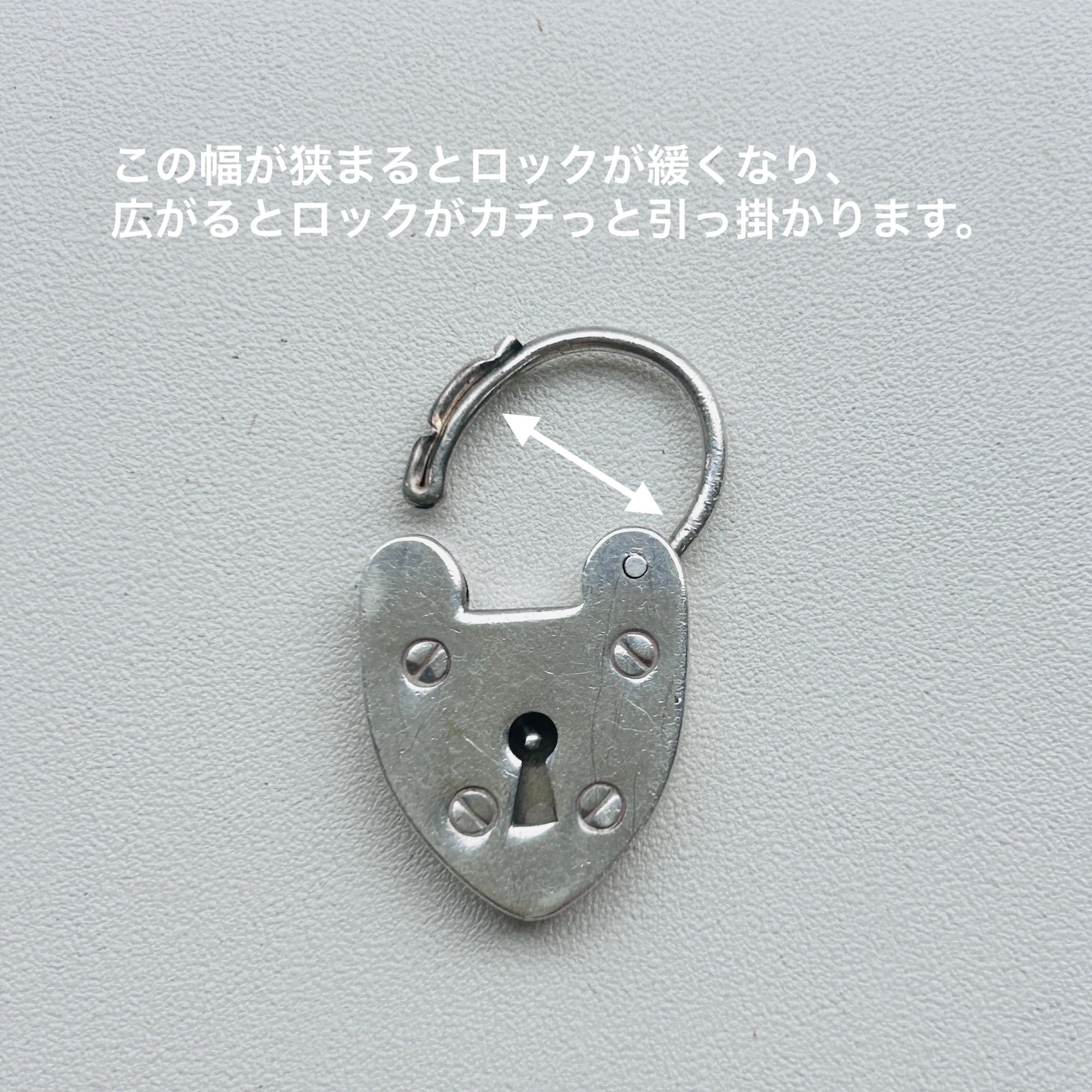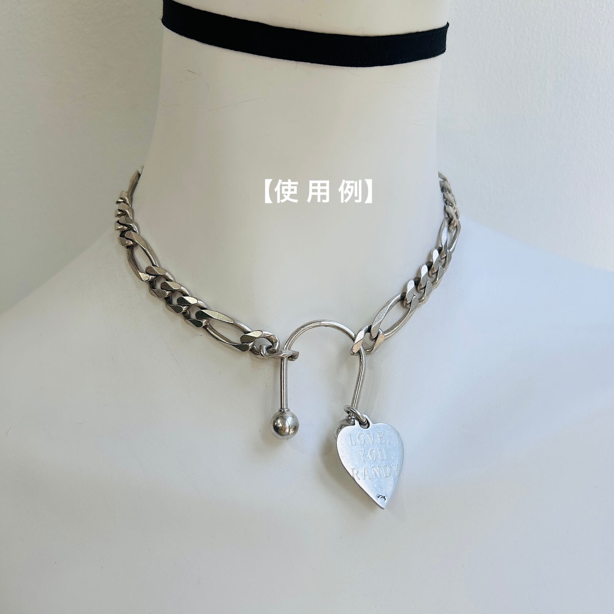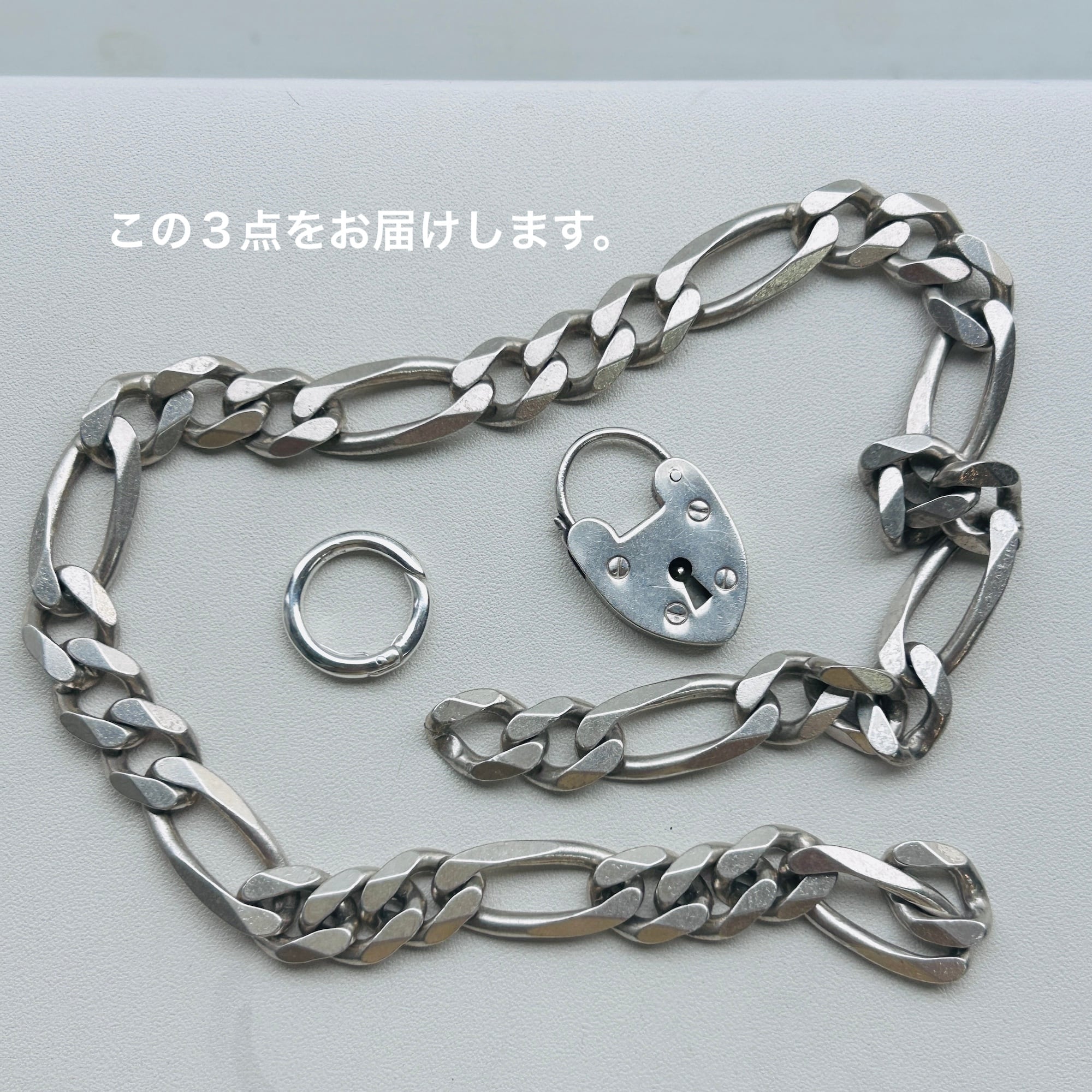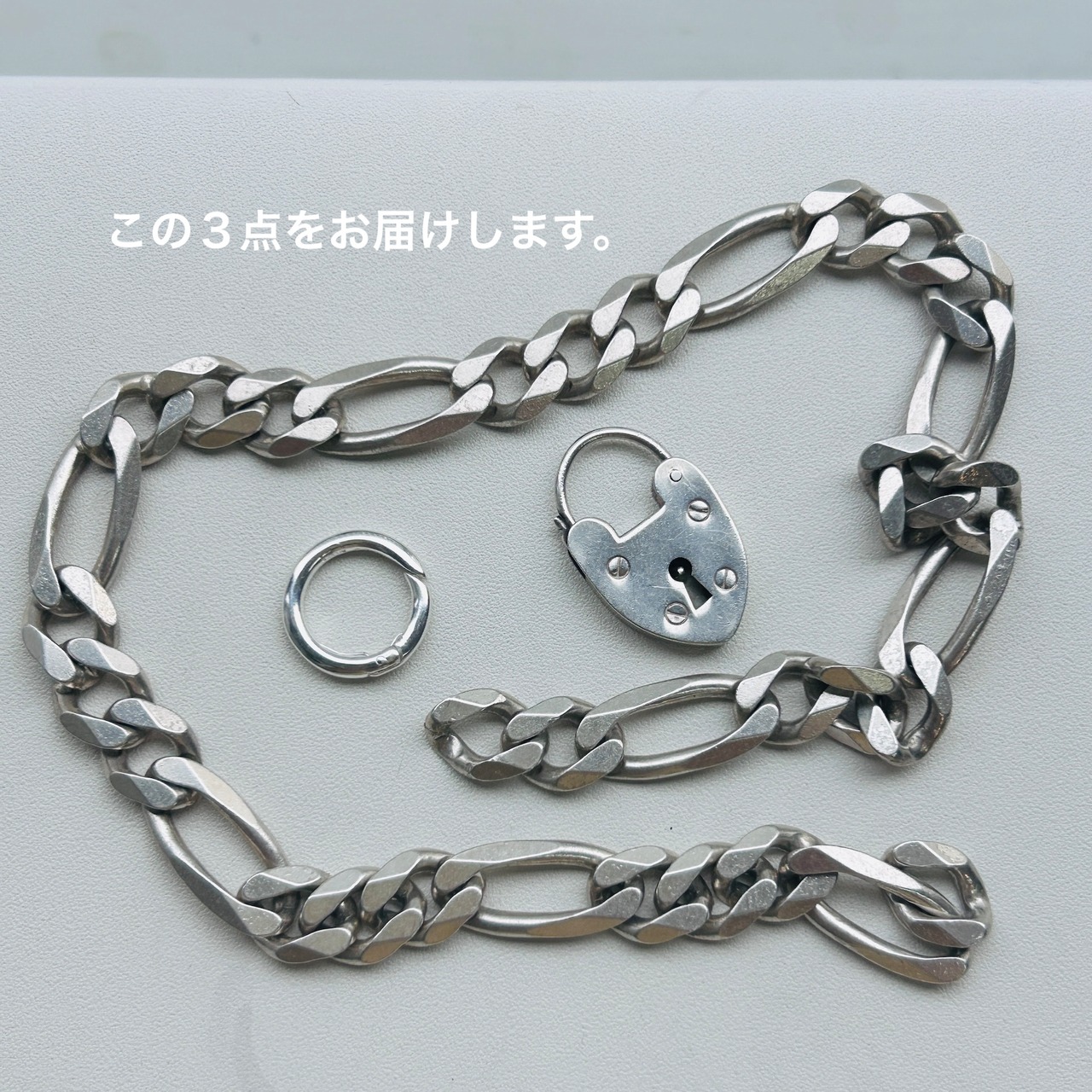 金具のないヘビーなフィガロチェーンを見つけてきました。どのように販売しようか考えた結果(修理屋さんに頼むと色々費用もかさみますので)、在庫のパドロックハートを留め具代わりにチェーンとセットでチョーカーチェーンとしてご提案いたします。チェーンは幅9.5mm、長さ35cm、首にピッタリ巻きつくクールな長さ。手首に巻いて頂くことも出来ます。パドロックハートは1974年LONDONの刻印。比較的大きいです。パドロックに加えまして丸型留め具(新品シルバー925)もお付けしてお届けいたします。パドロックは付けっぱなしにして、この丸型留め具で留めてもらうことも出来ます。パドロックのロックの引っ掛かりが甘くなってきた場合は写真のようにアーチを少し広げて下さい。また、どちらも使用せずご自身のアイデアでチェーンを留めるのも楽しいですし、新品金具もユニークな形がありますので探してみて下さい。写真17はアイデア例です。在庫のキーチェーンで留めてみました。チェーンがとても短いので手元操作のし辛さは少々伴います。見た目と使いやすさに一長一短ありますが、すごくかっこいいです!