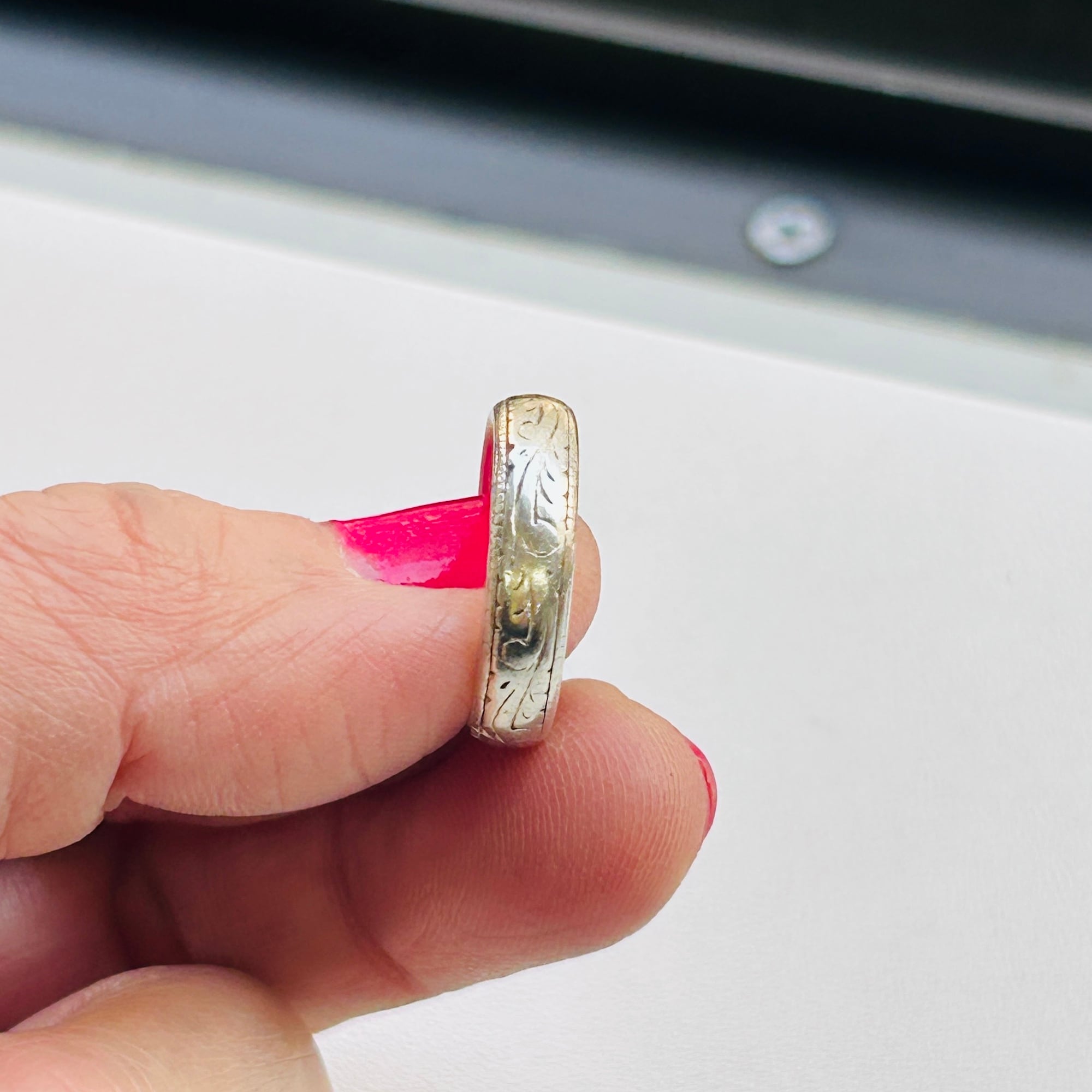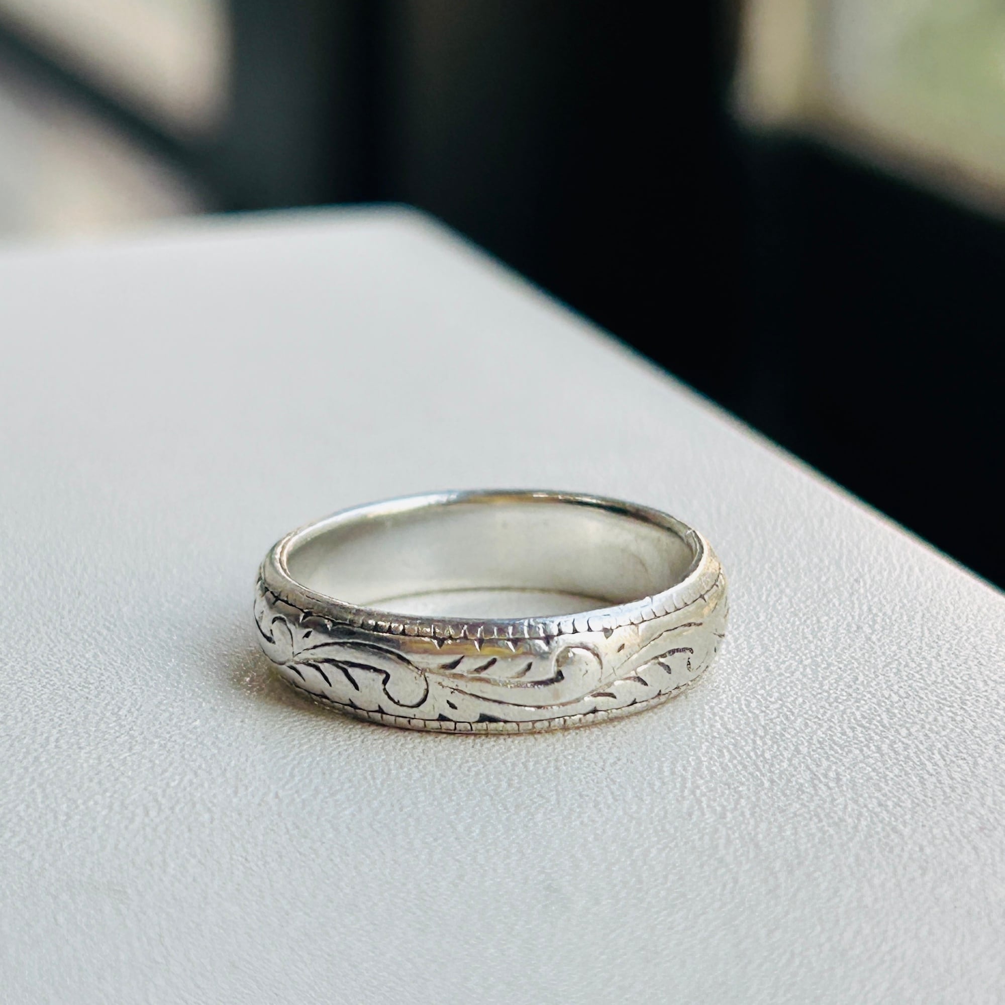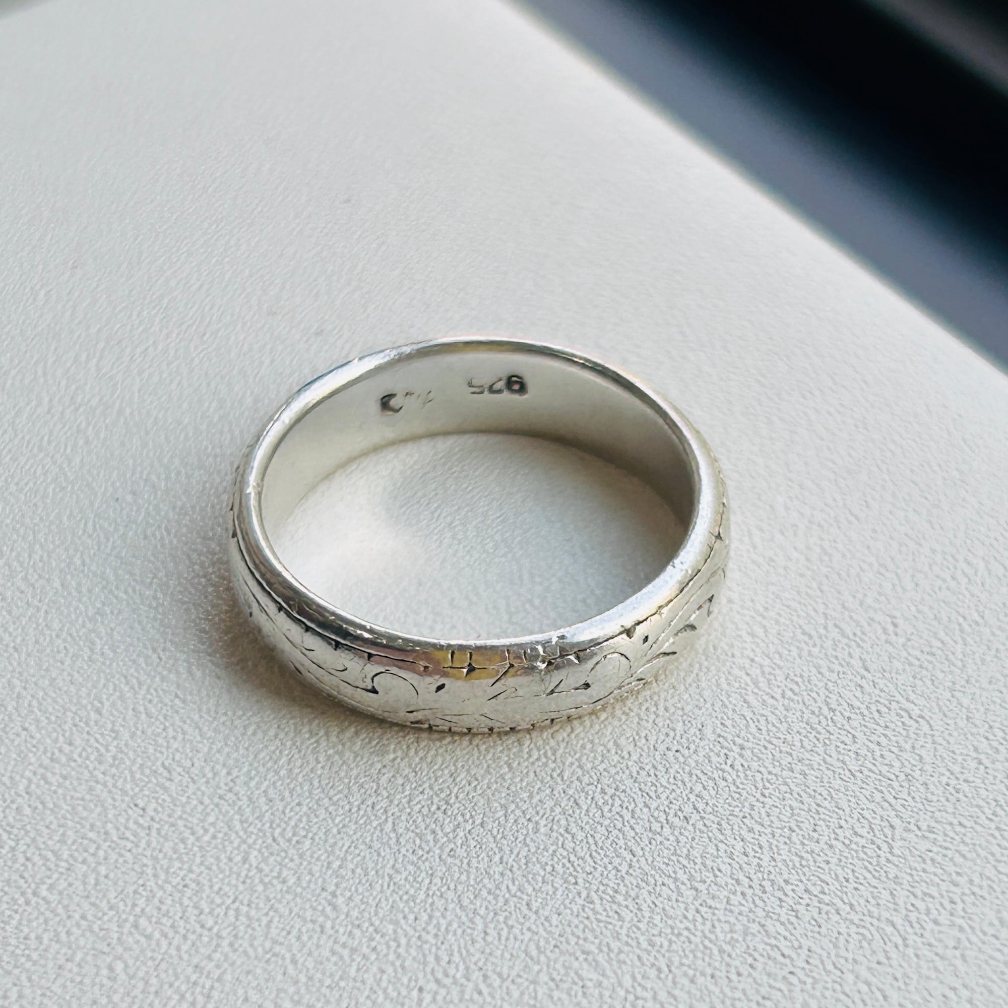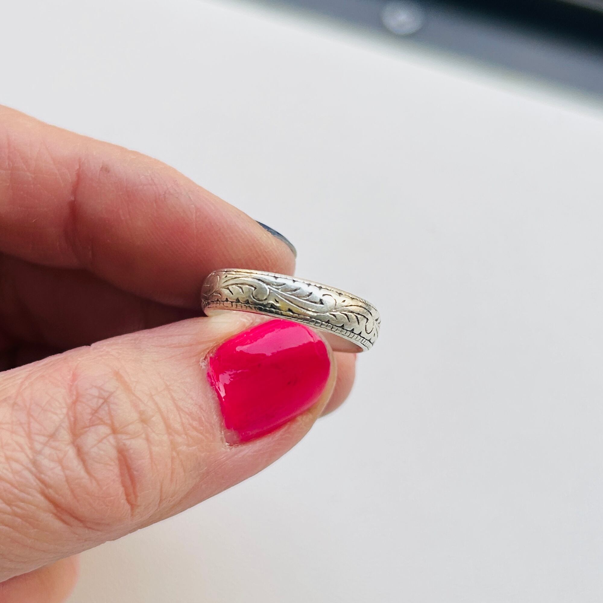 シンプルな総彫リング。使い込まれたヴィンテージらしさを感じます。デイリーに使って頂ける合わせやすいデザイン。内側に「925」私は10号の指に入ります。