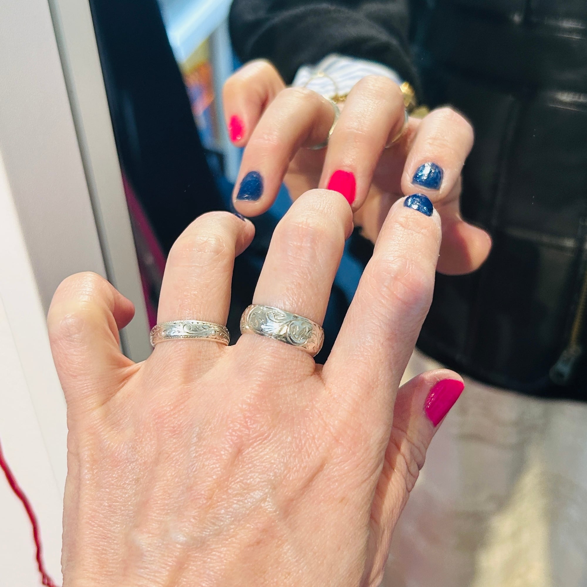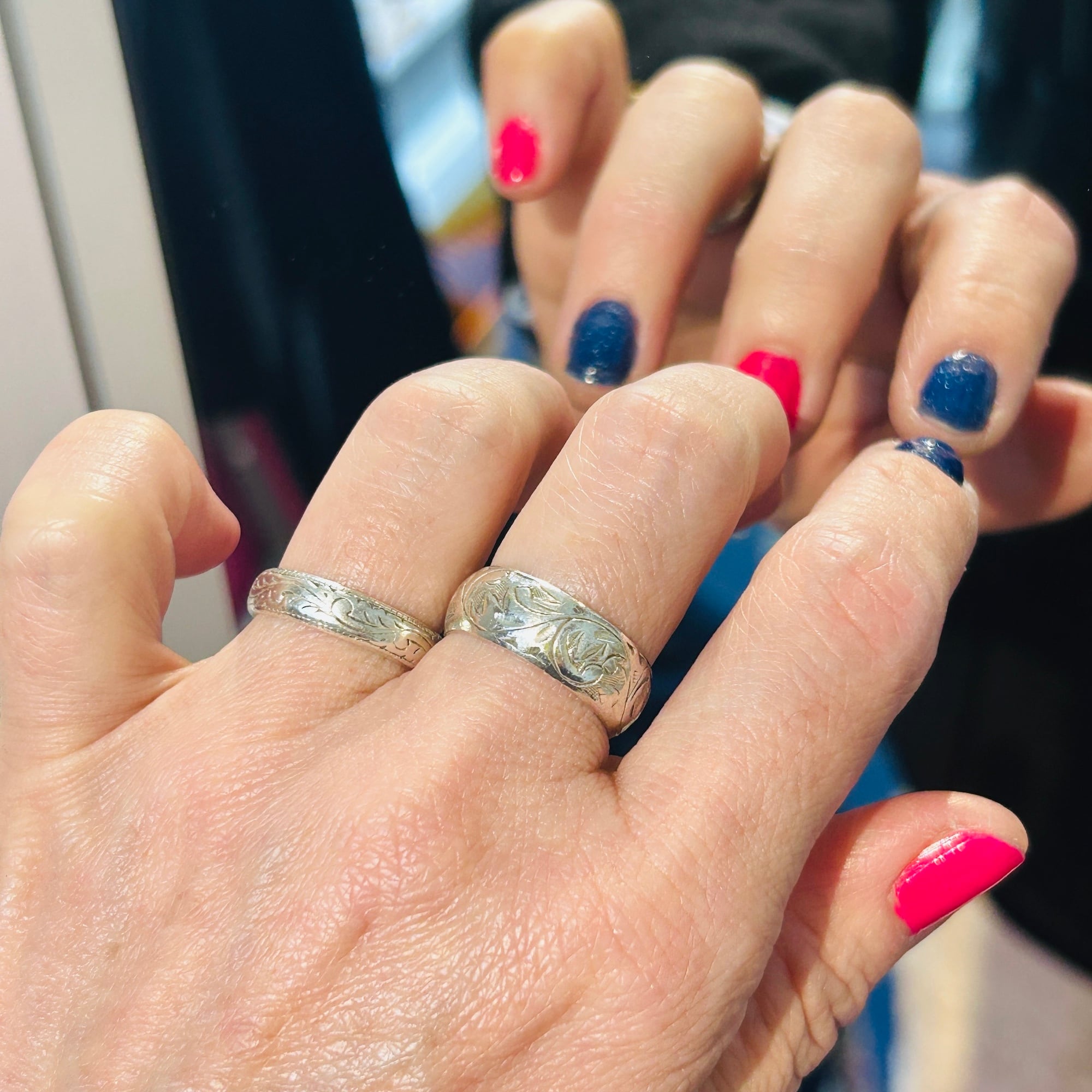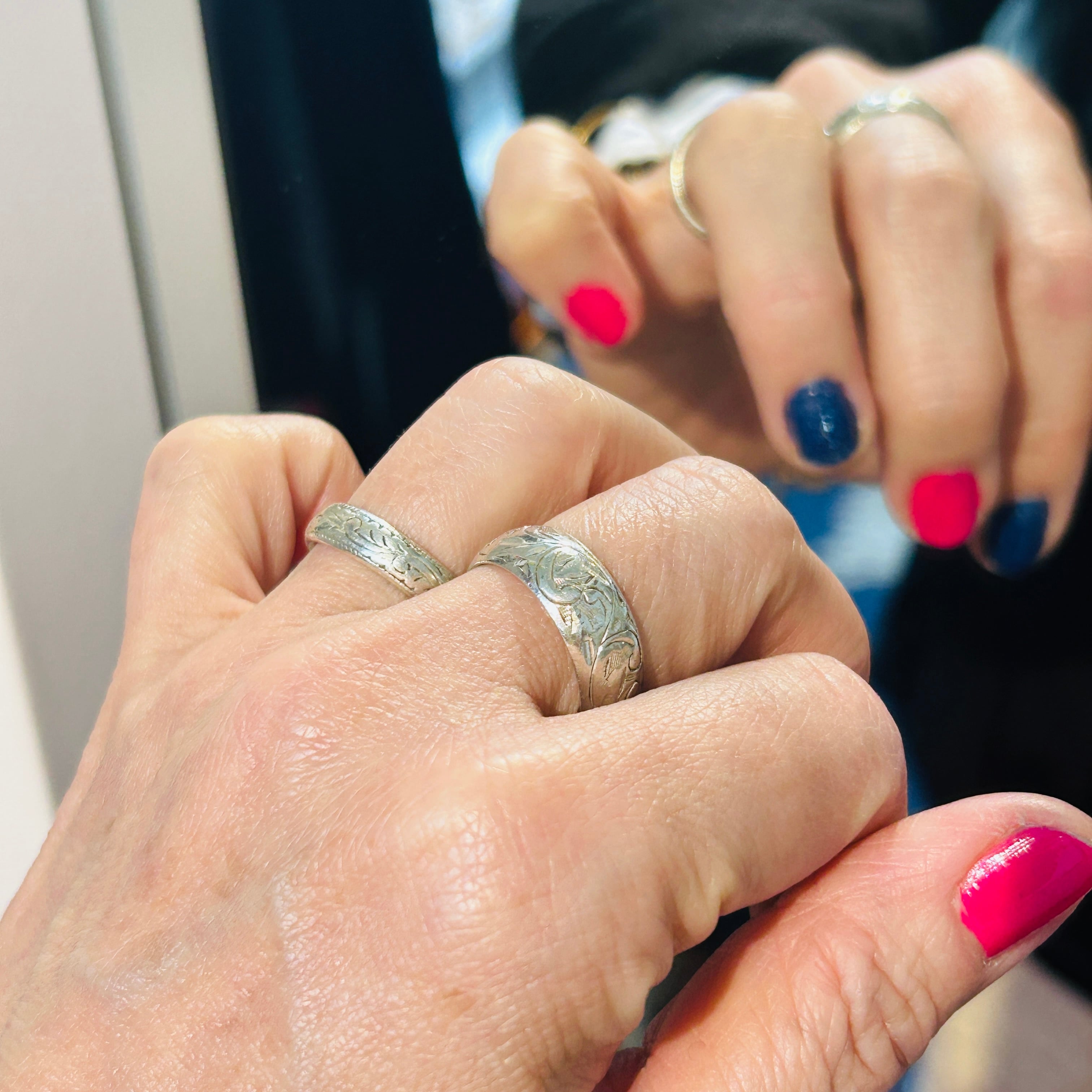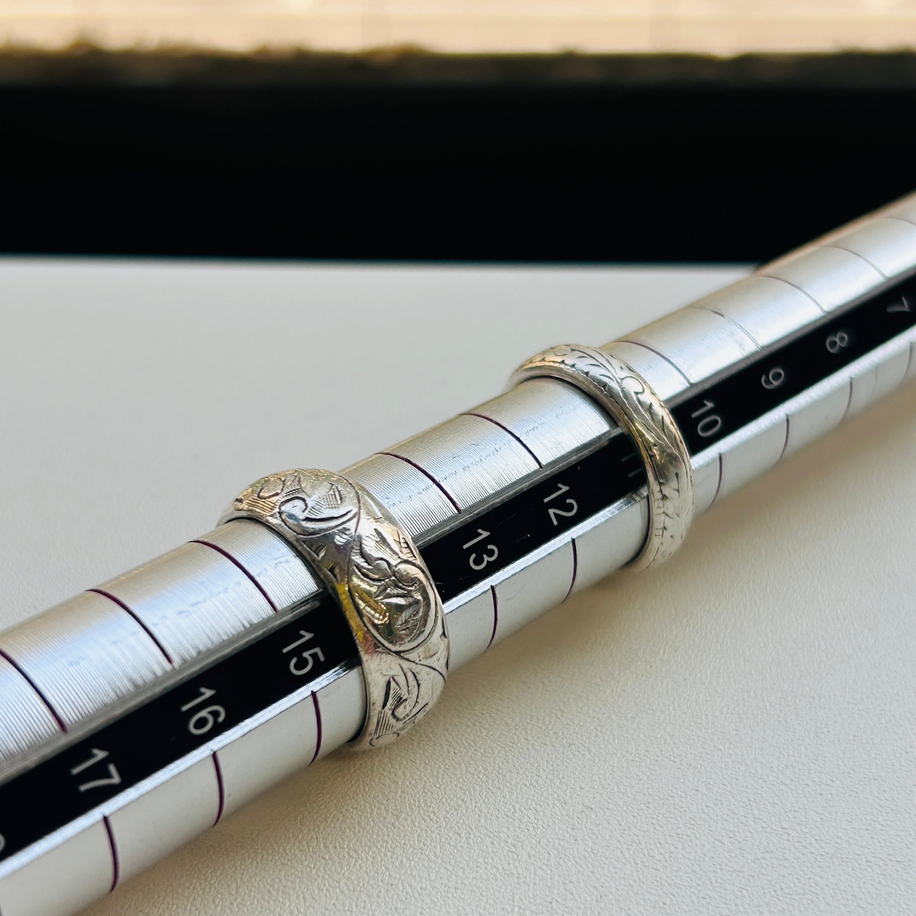 シンプルな総彫リング。使い込まれたヴィンテージらしさを感じます。デイリーに使って頂ける合わせやすいデザイン。内側に「925」私は10号の指に入ります。