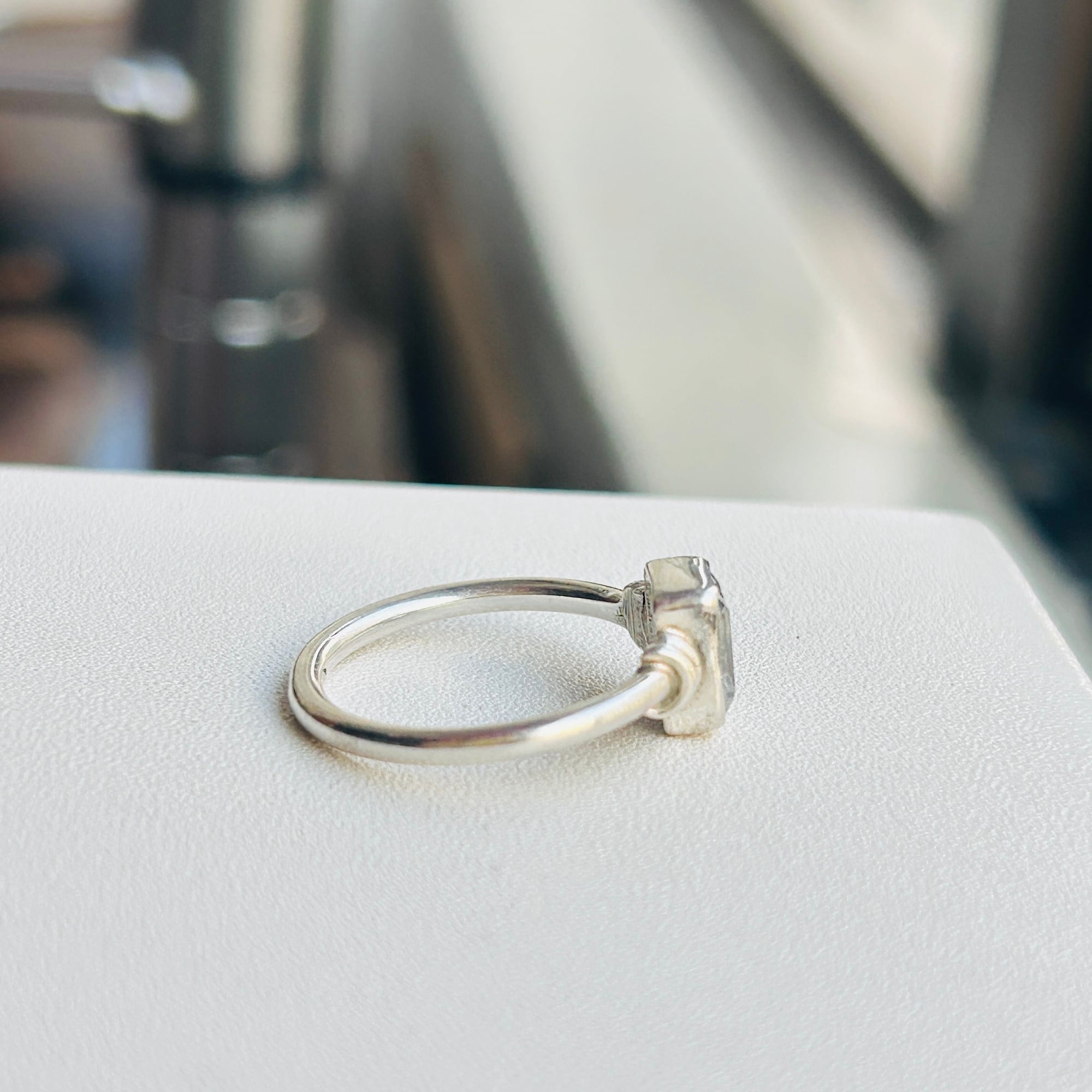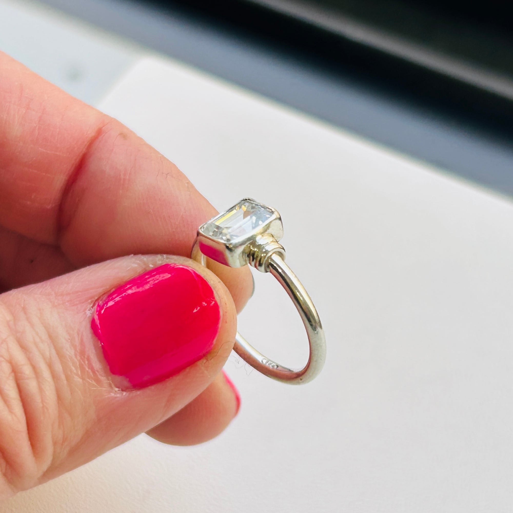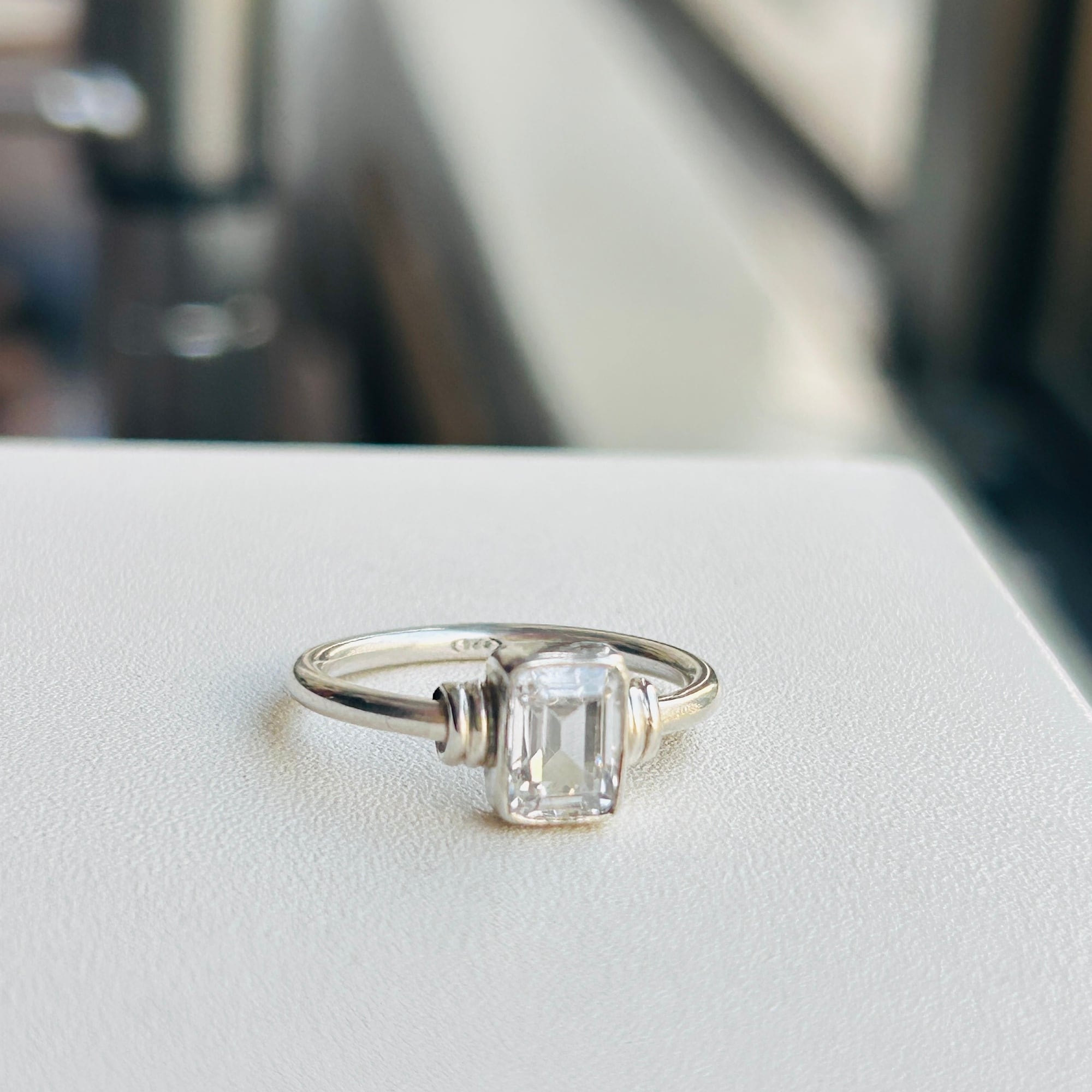 スクエア型クリアCZ(ジルコニア)リング。控えめな作りでシンプルジュエリーがお好きな方の手元に程よいアクセントになるカジュアルなリングです。細くて丸いバンドは着けやすいので私は薬指・中指・人差し指の3本に着けることができます。お手持ちのリングと色々な組み合わせで楽しめるリングだと思います。「925」刻印。