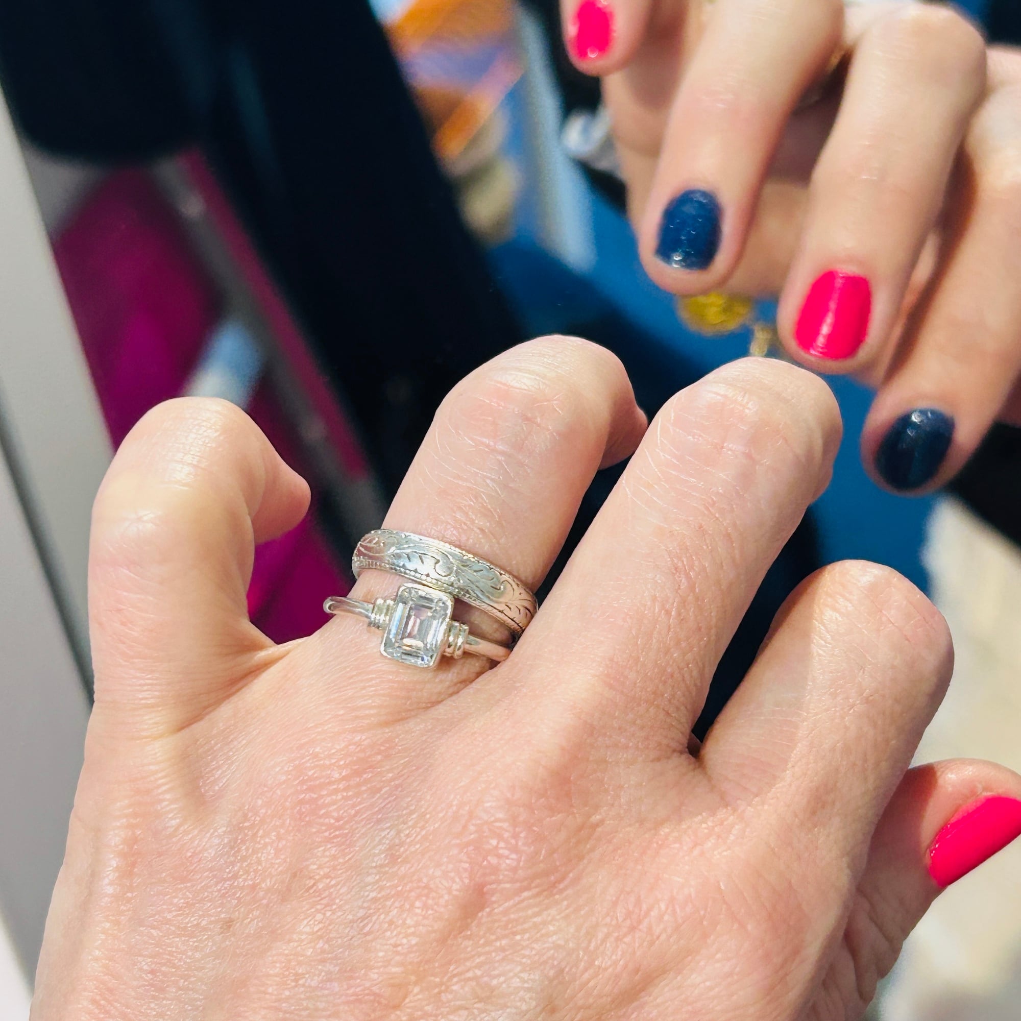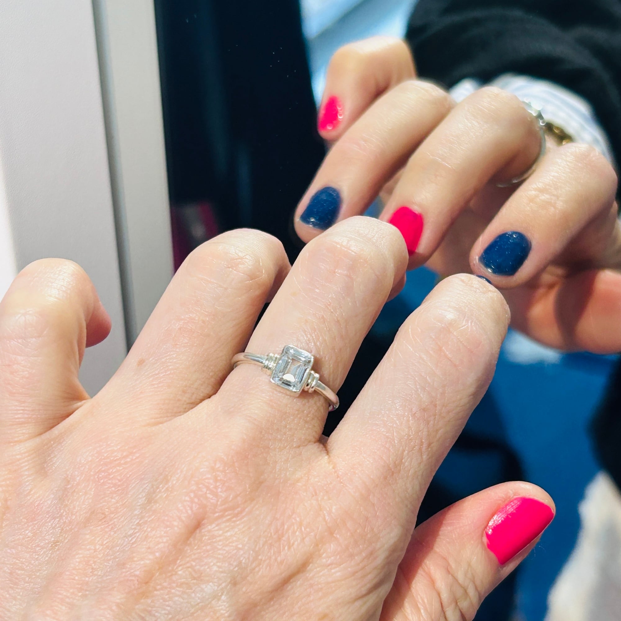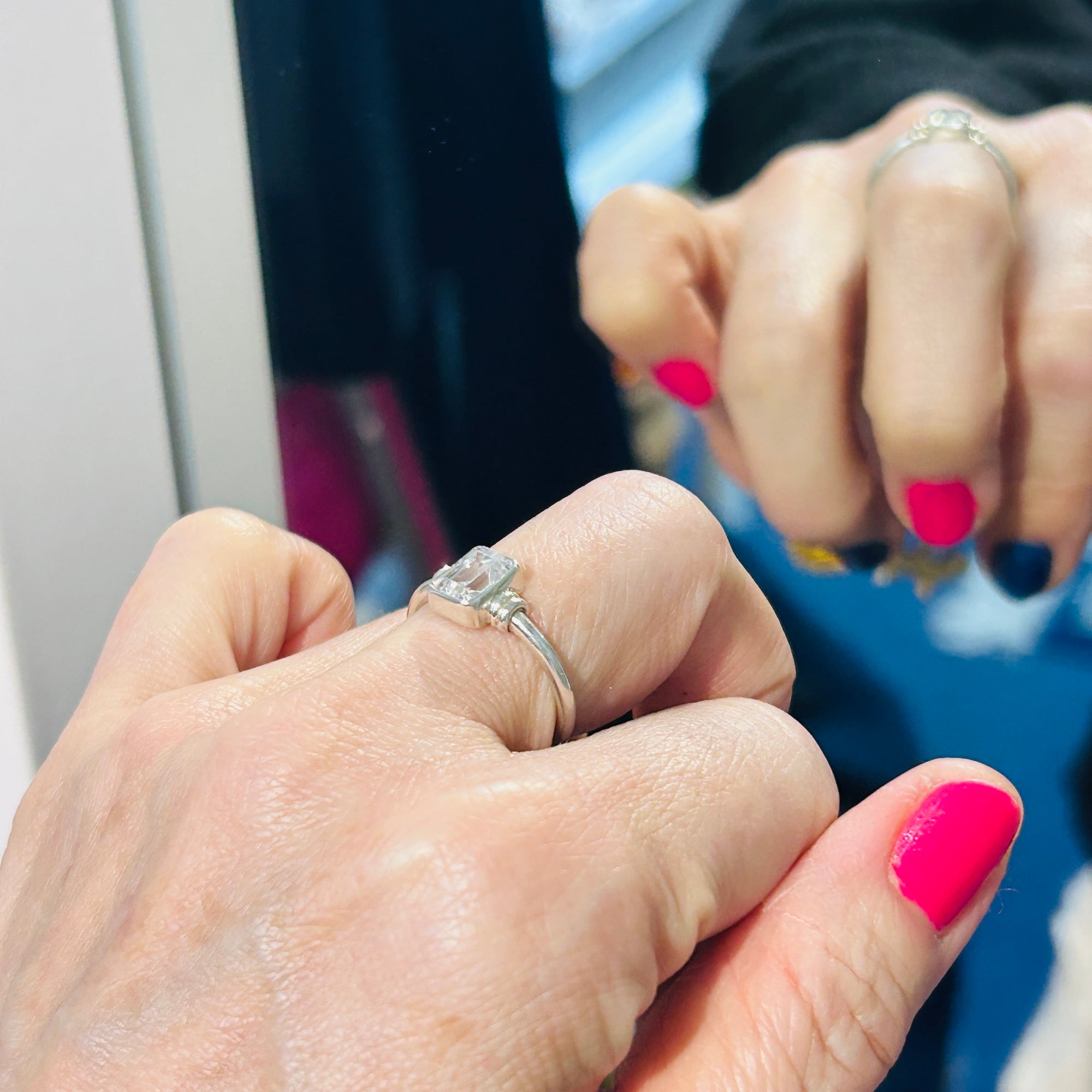 スクエア型クリアCZ(ジルコニア)リング。控えめな作りでシンプルジュエリーがお好きな方の手元に程よいアクセントになるカジュアルなリングです。細くて丸いバンドは着けやすいので私は薬指・中指・人差し指の3本に着けることができます。お手持ちのリングと色々な組み合わせで楽しめるリングだと思います。「925」刻印。