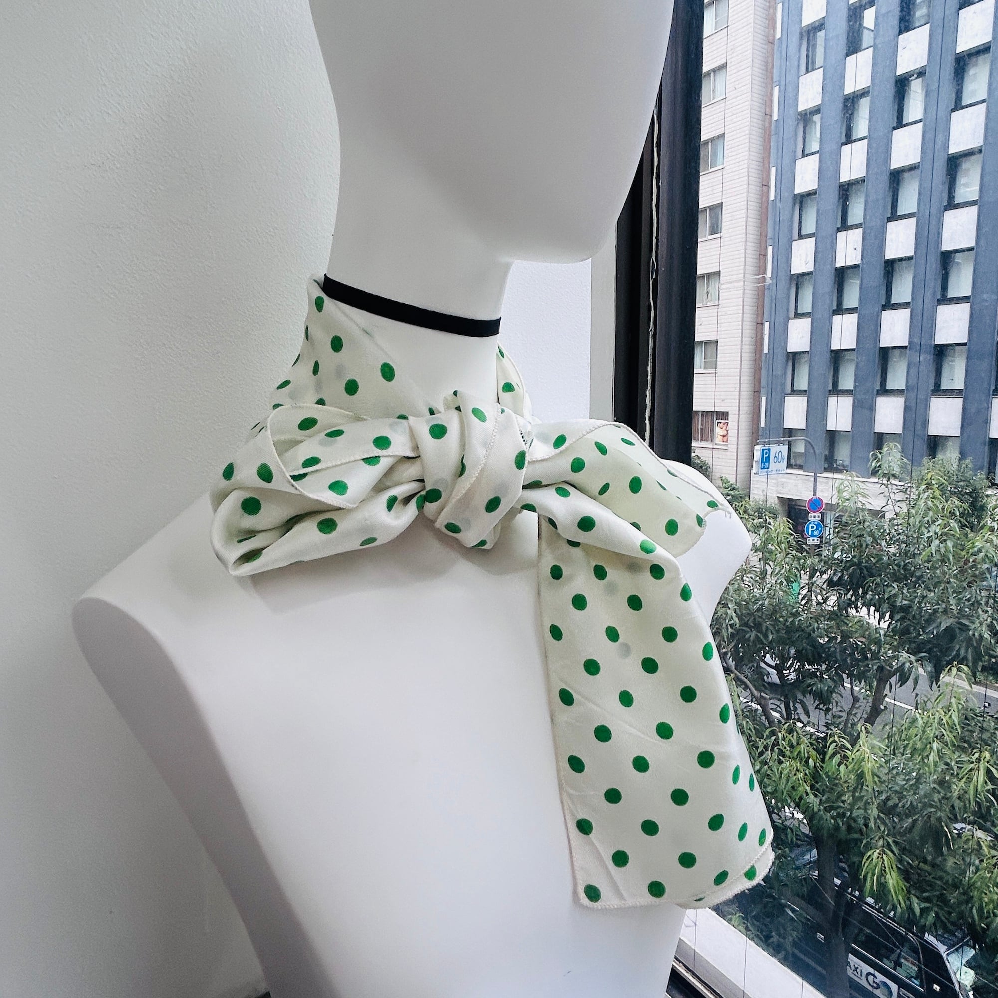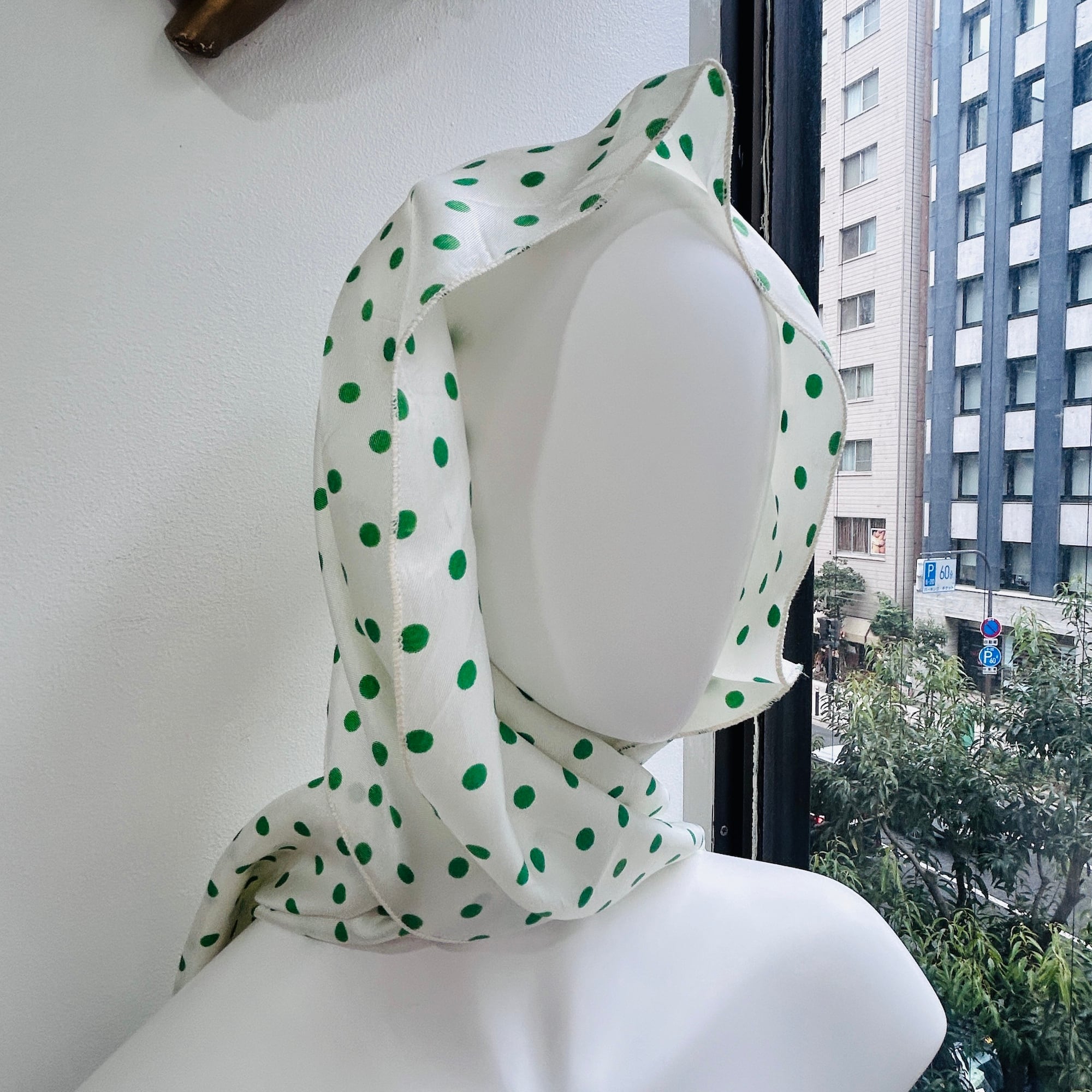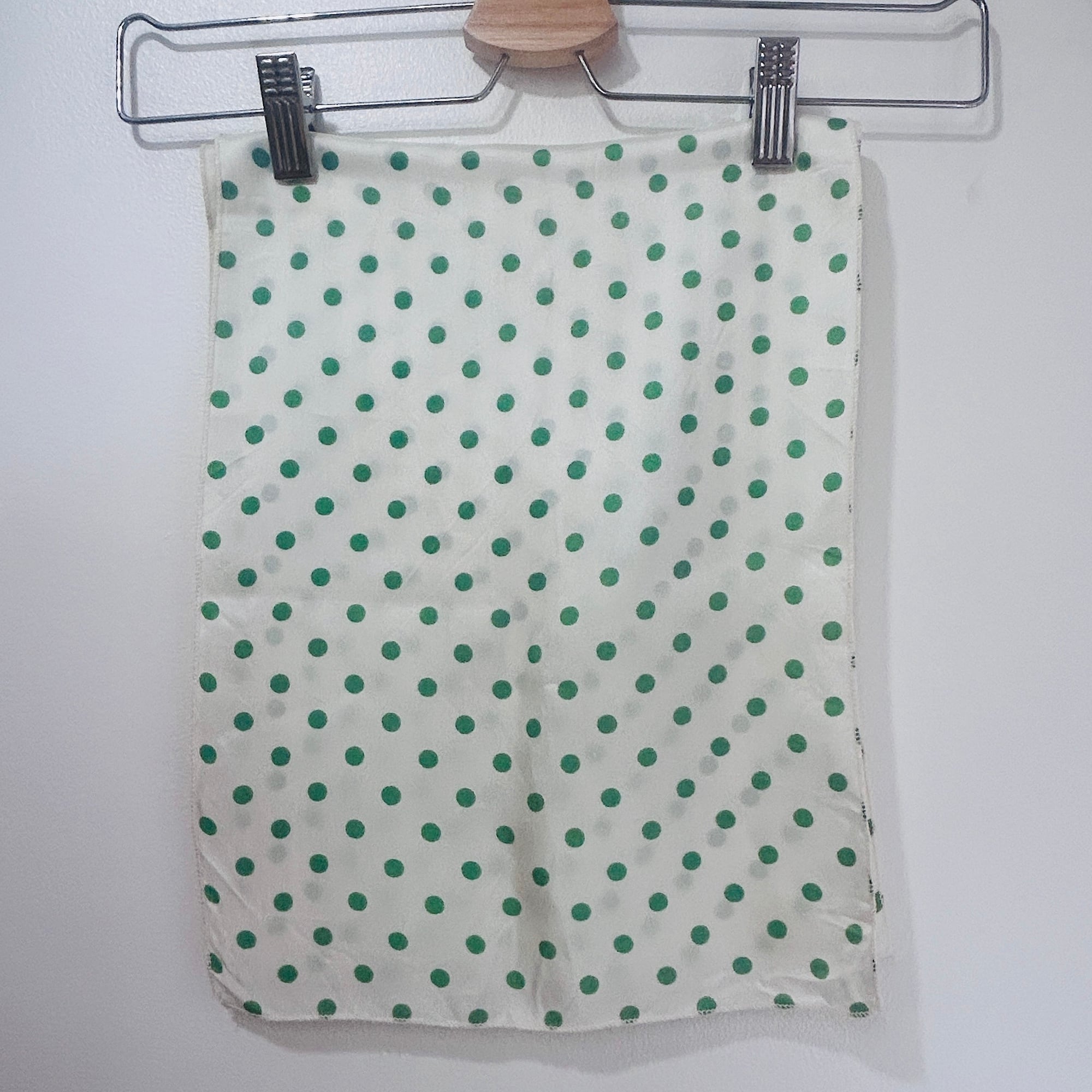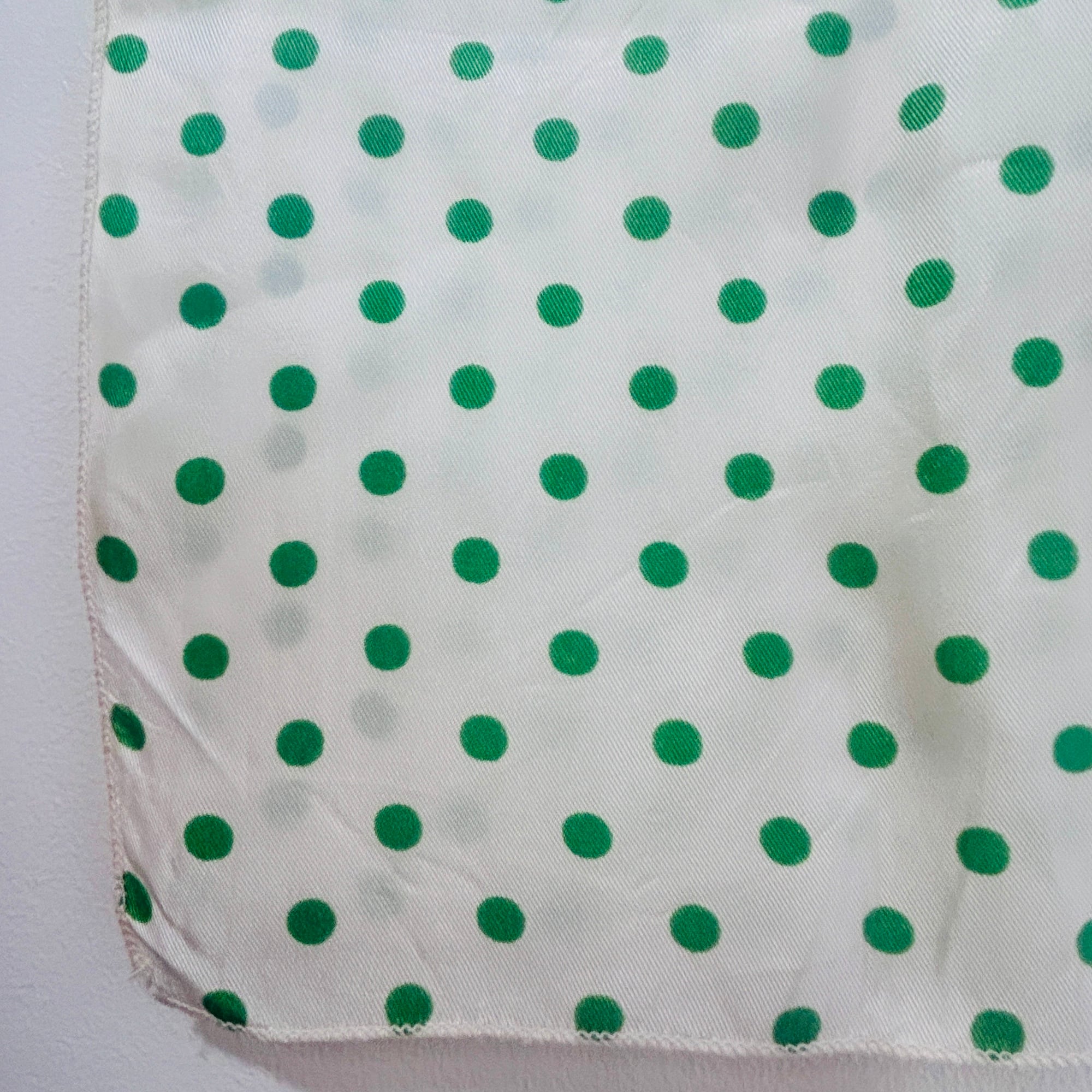 緑の水玉スカーフ。形は縦長です。基本は白じゃなくてうっっすらイエローっぽいエッグシェルというような色にグリーンの水玉。レトロなカラーリングです。張りのあるシルキーなポリエステルです。タグなし。特筆すべきダメージはありません。一度ホームクリーニングしました。