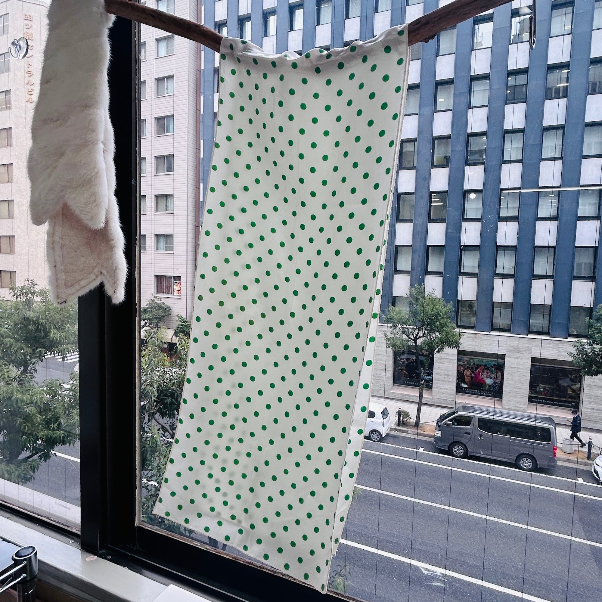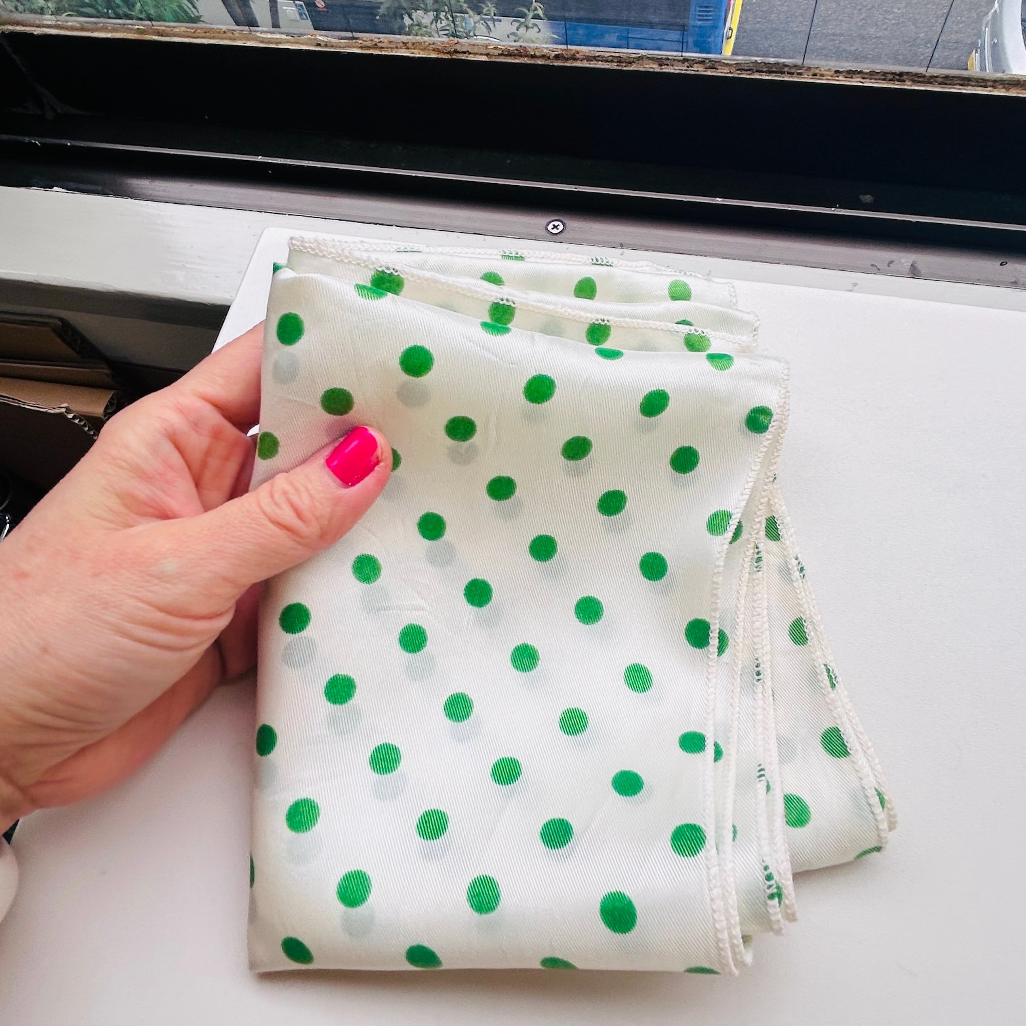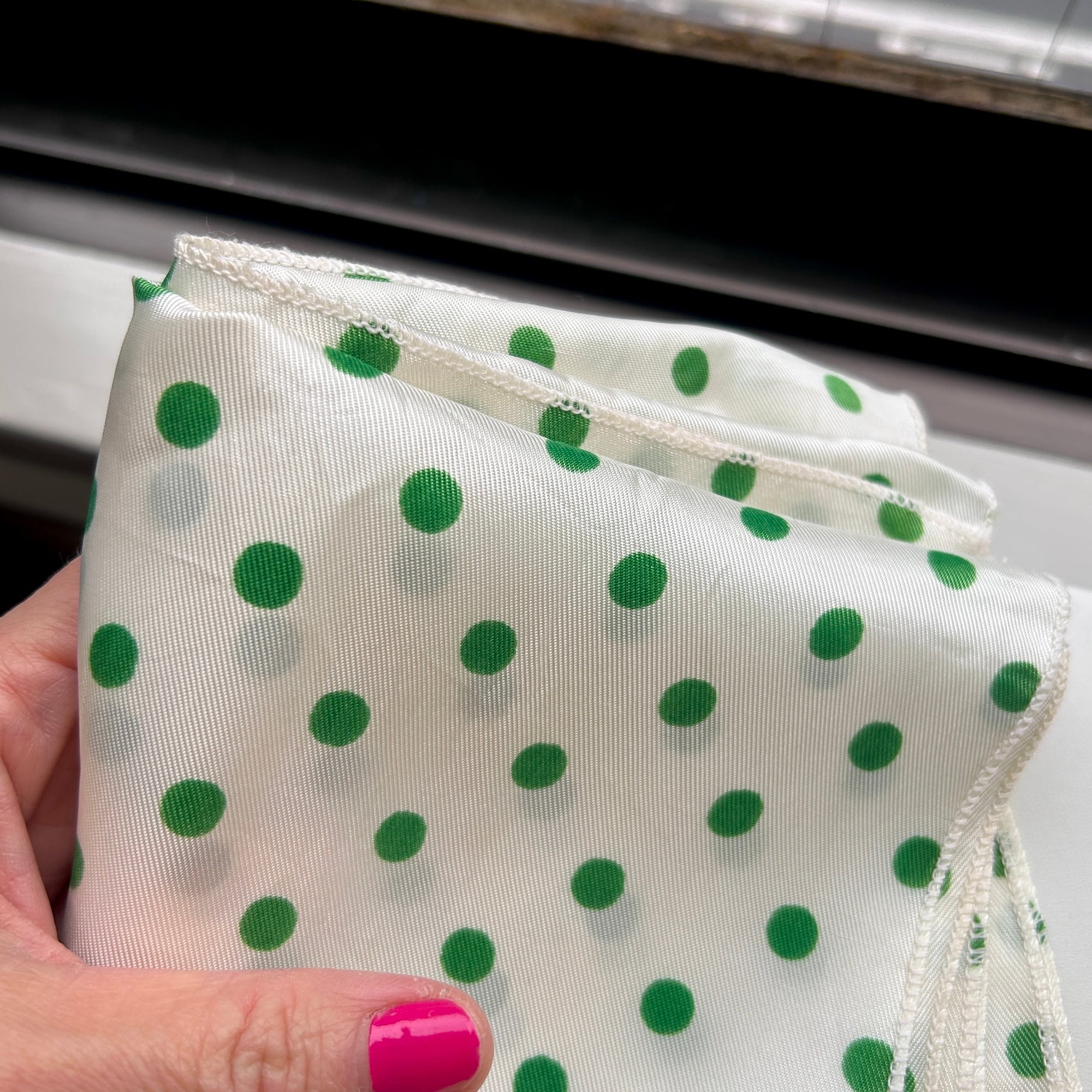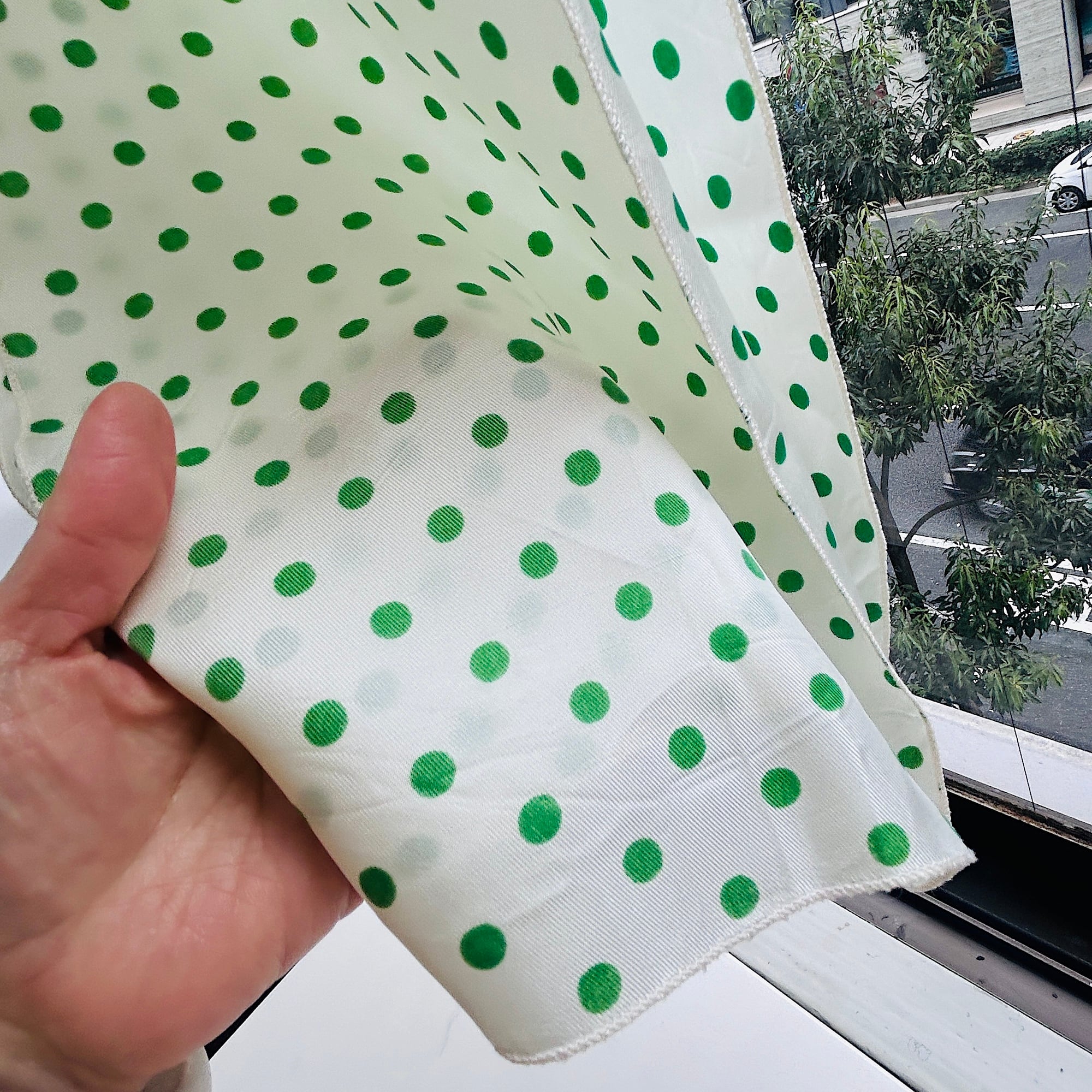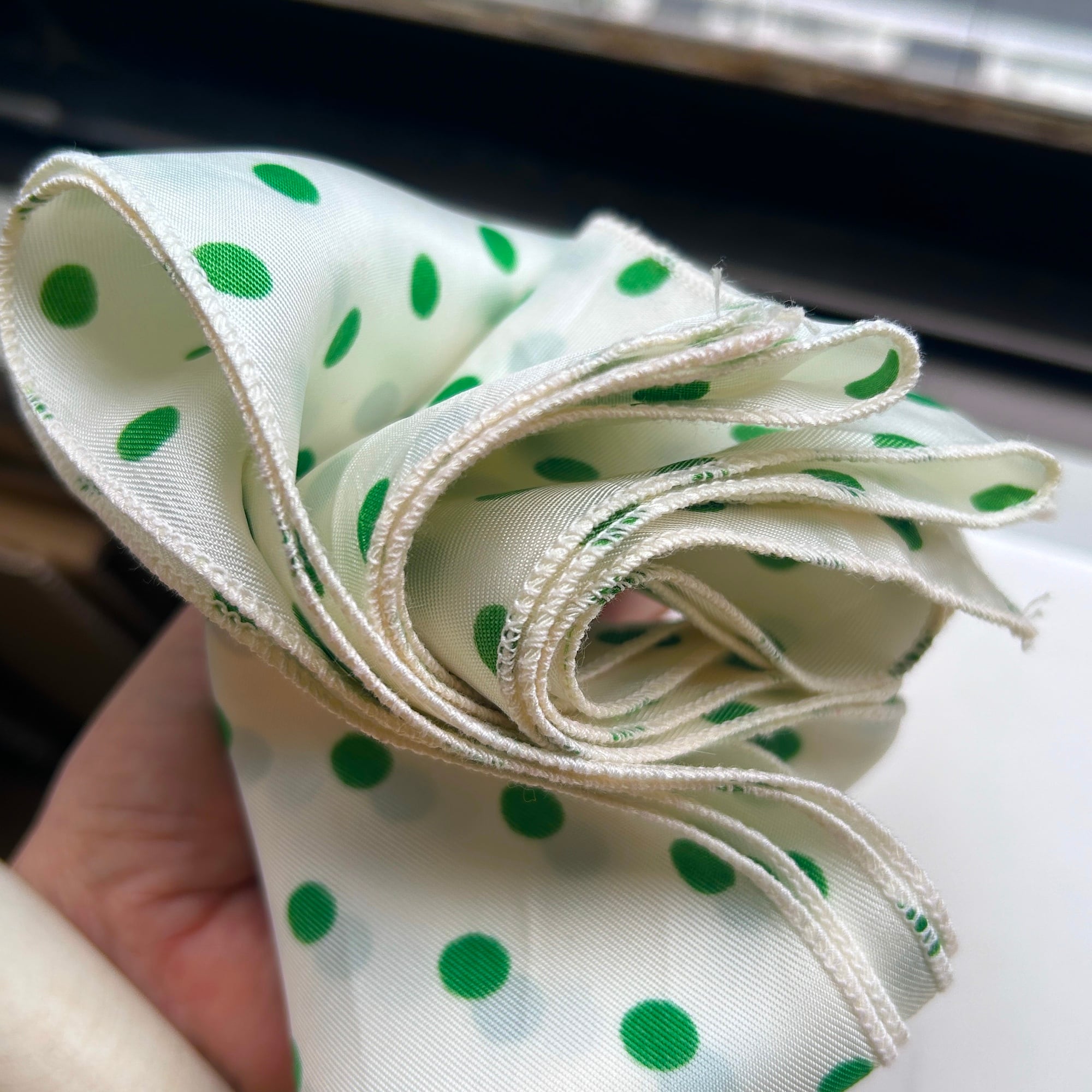 緑の水玉スカーフ。形は縦長です。基本は白じゃなくてうっっすらイエローっぽいエッグシェルというような色にグリーンの水玉。レトロなカラーリングです。張りのあるシルキーなポリエステルです。タグなし。特筆すべきダメージはありません。一度ホームクリーニングしました。