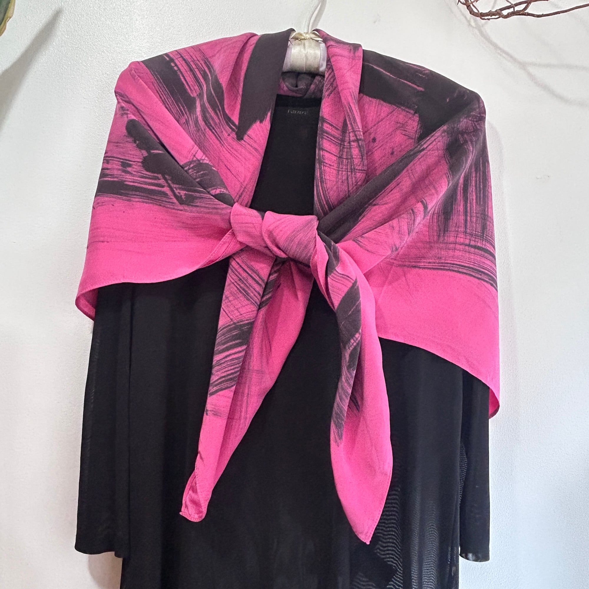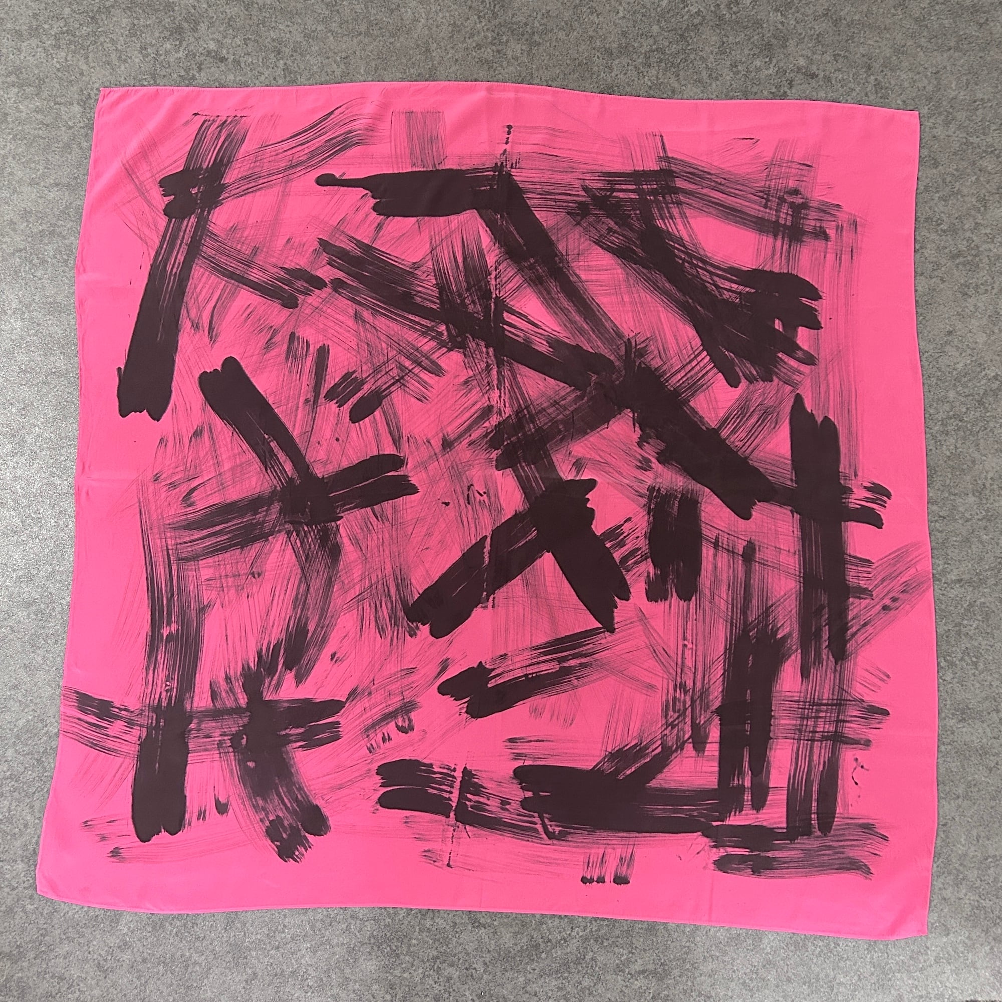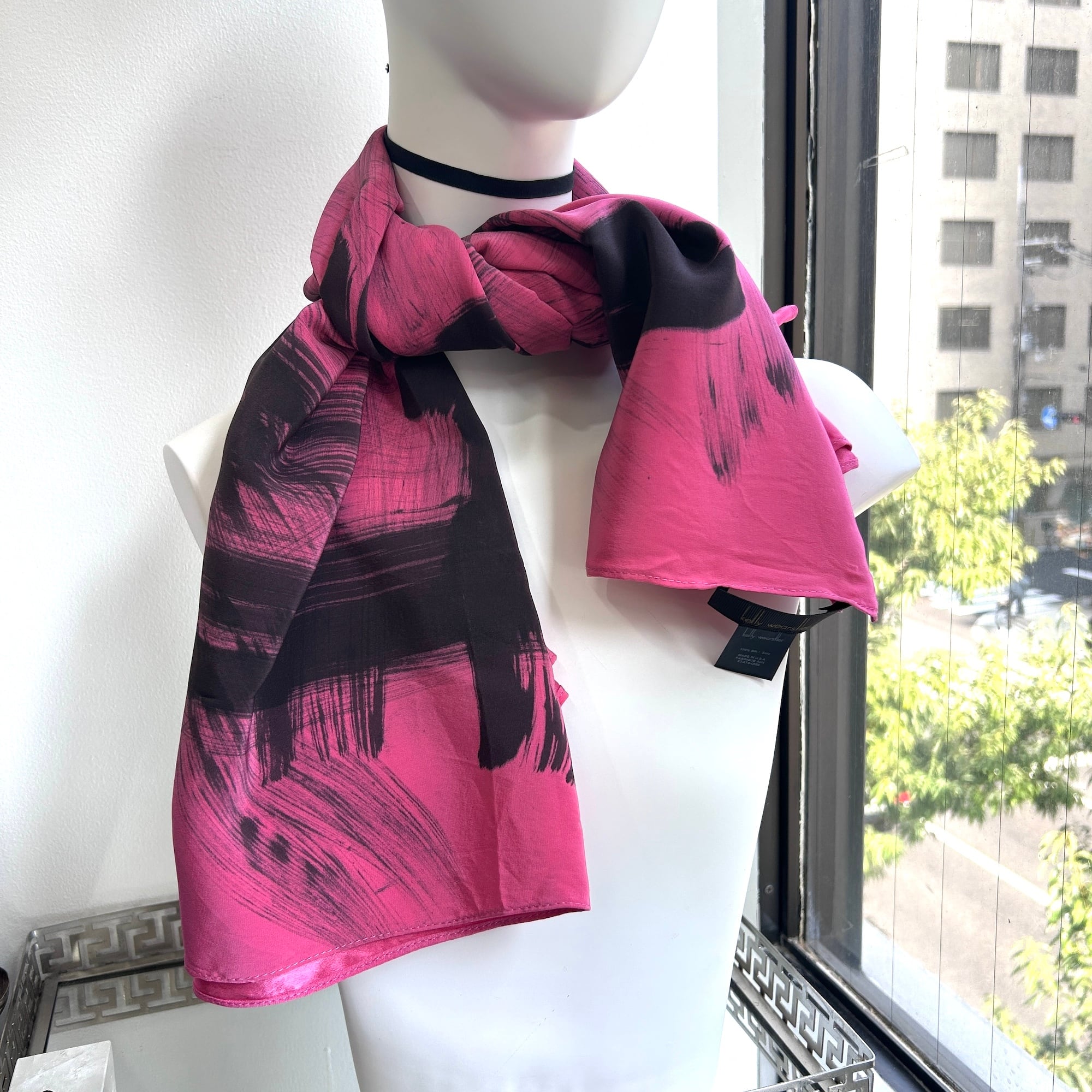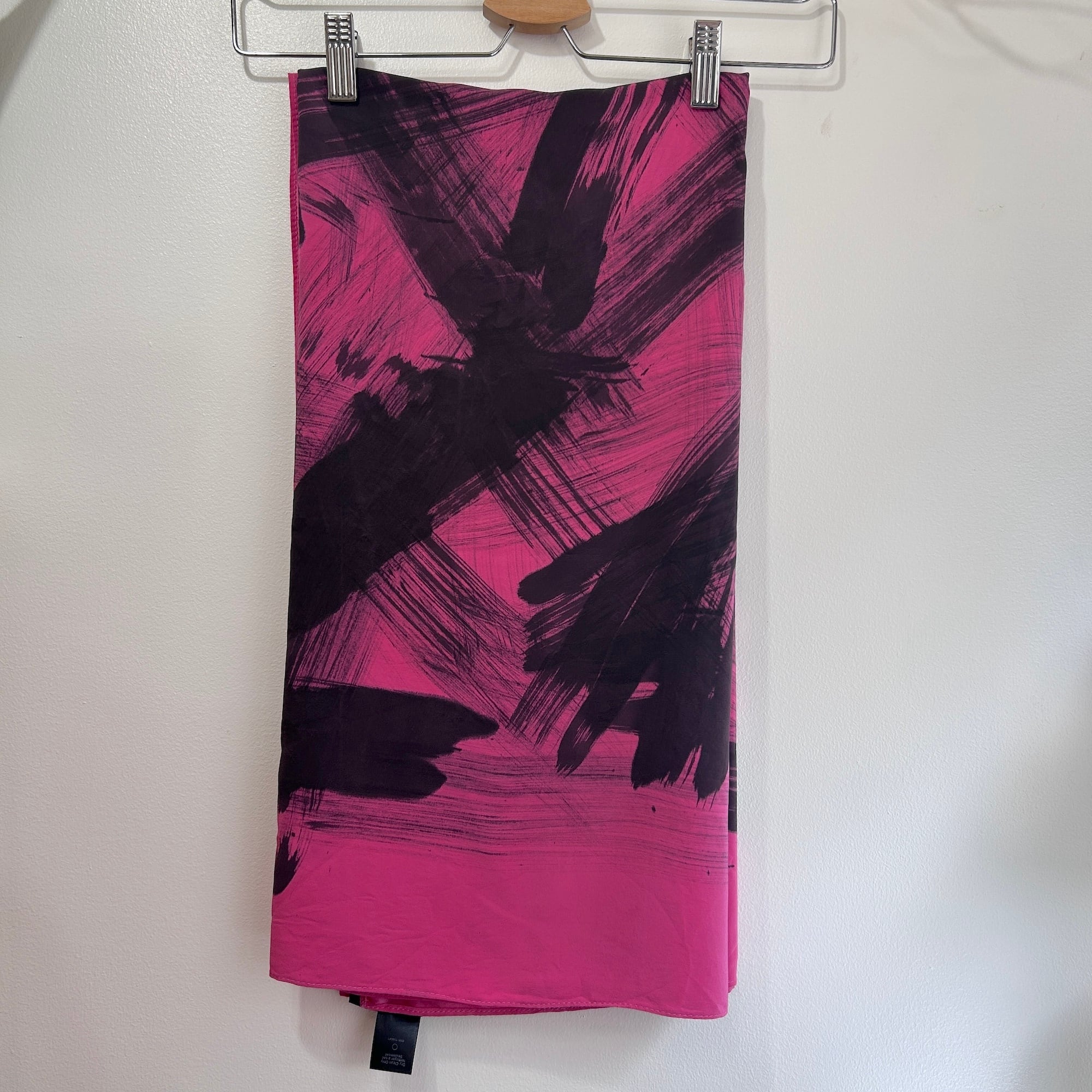 スカーフは鮮やかなピンクに黒の刷毛目プリント。かすれた風合いがリアルです。ハンドペイントの刷毛目模様なので1点1点プリントの出方が異なります。抽象的な模様と大胆な色使いが魅力のパワフルでラグジュアリーなデザインスカーフ。しっとり上質な手触りの100%シルク製、Made in USAです。巻きスカート風にレイヤードしたり、羽織りにしたり色々な使い方ができそう。特筆すべきダメージはありません。一度ホームクリーニングしました。