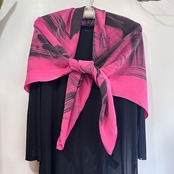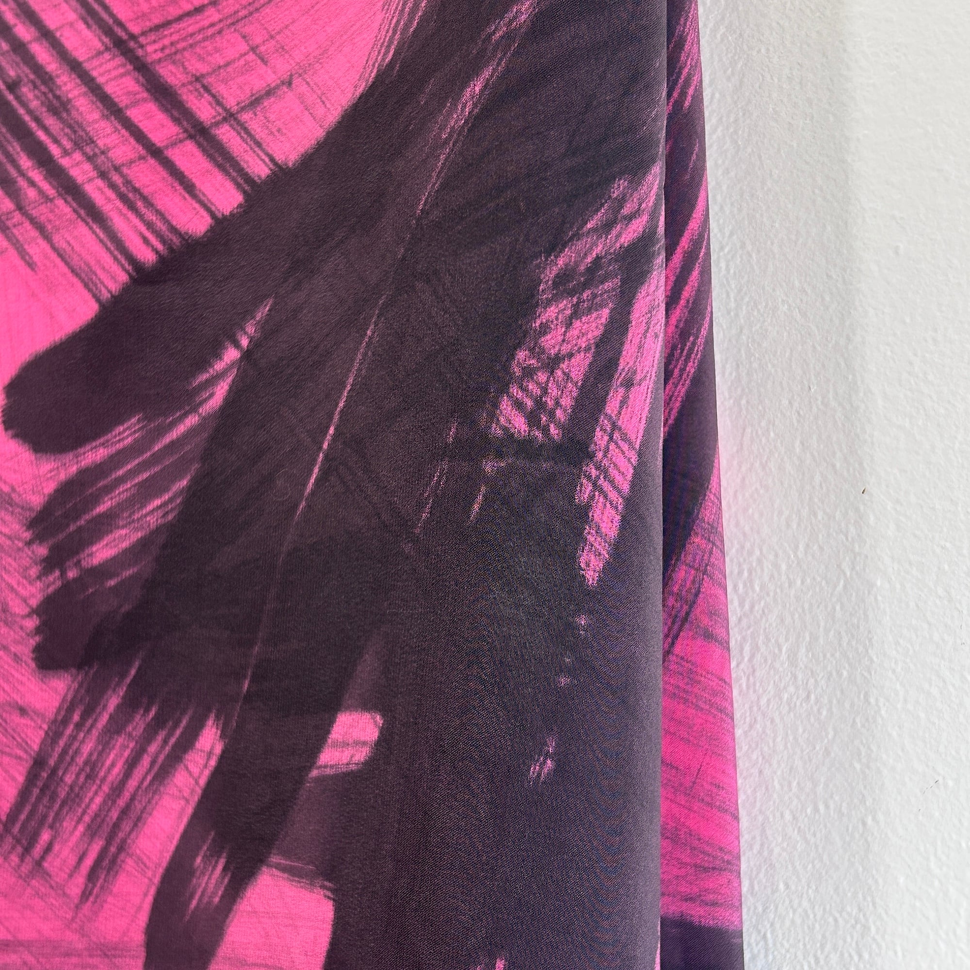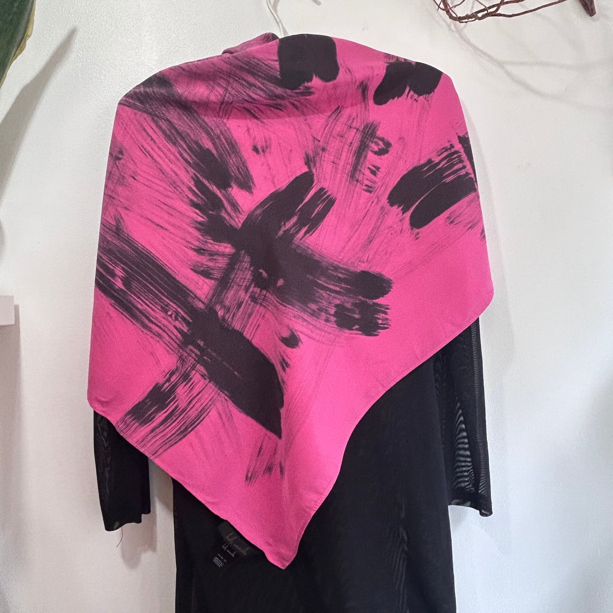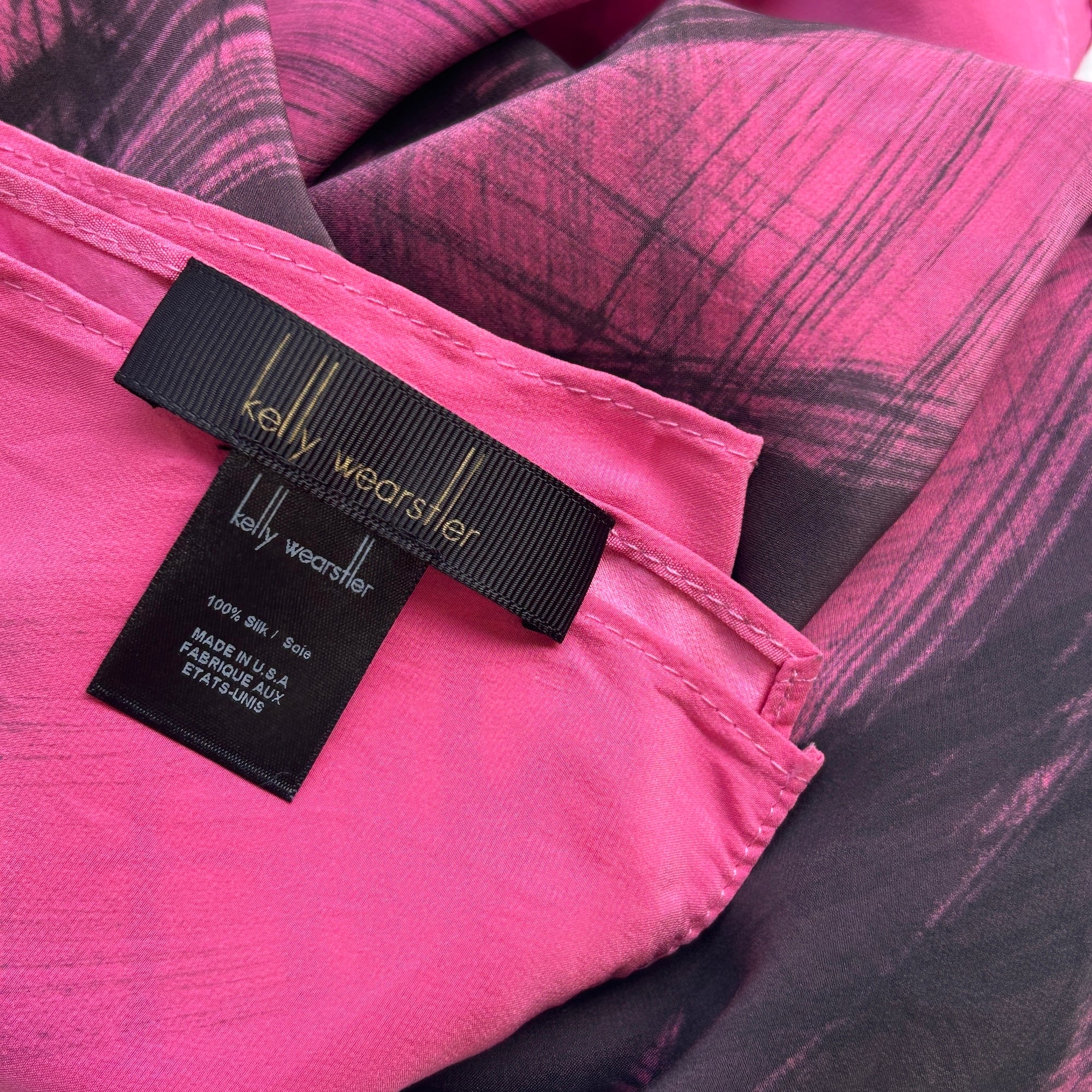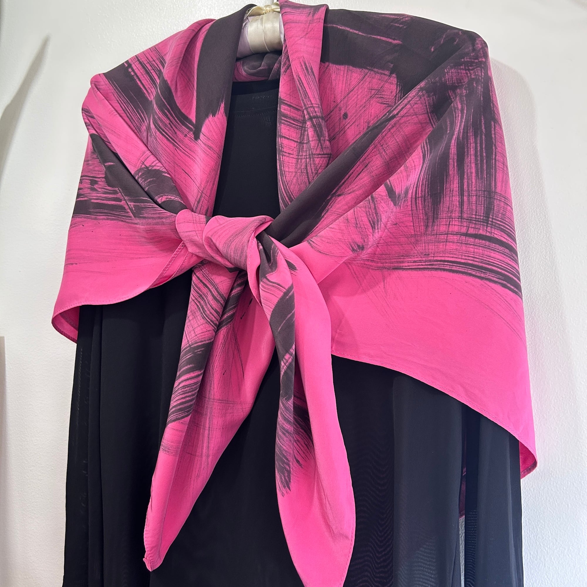 スカーフは鮮やかなピンクに黒の刷毛目プリント。かすれた風合いがリアルです。ハンドペイントの刷毛目模様なので1点1点プリントの出方が異なります。抽象的な模様と大胆な色使いが魅力のパワフルでラグジュアリーなデザインスカーフ。しっとり上質な手触りの100%シルク製、Made in USAです。巻きスカート風にレイヤードしたり、羽織りにしたり色々な使い方ができそう。特筆すべきダメージはありません。一度ホームクリーニングしました。