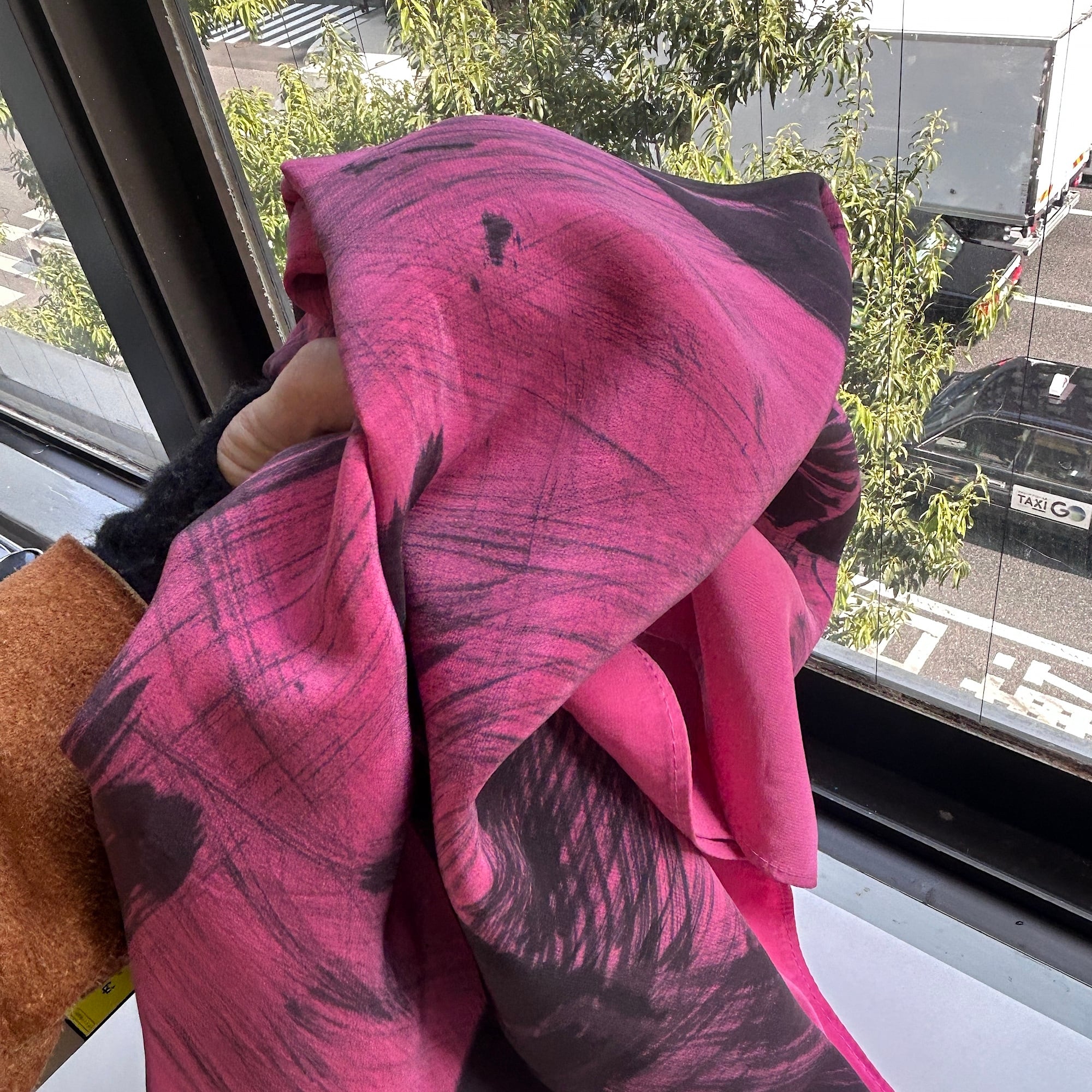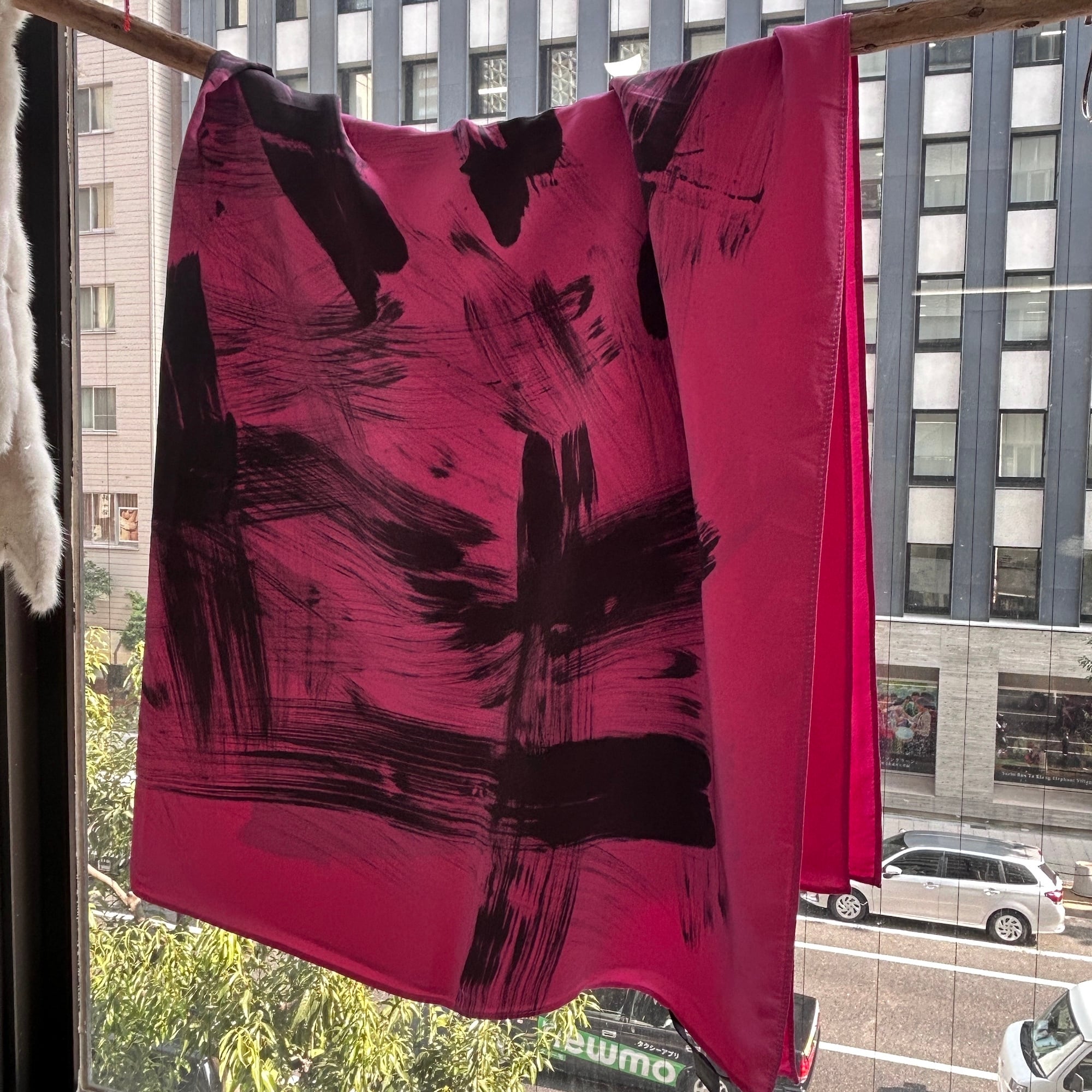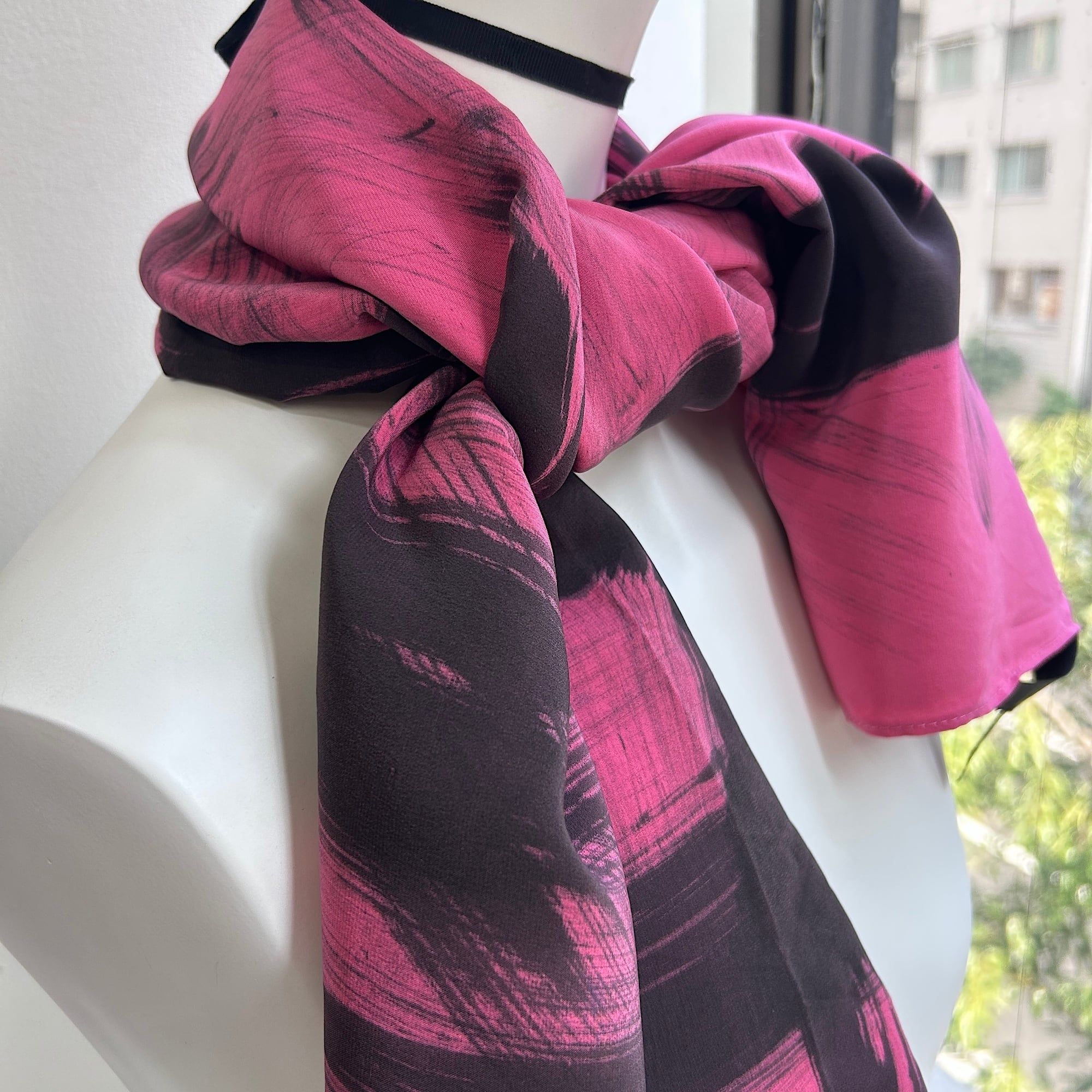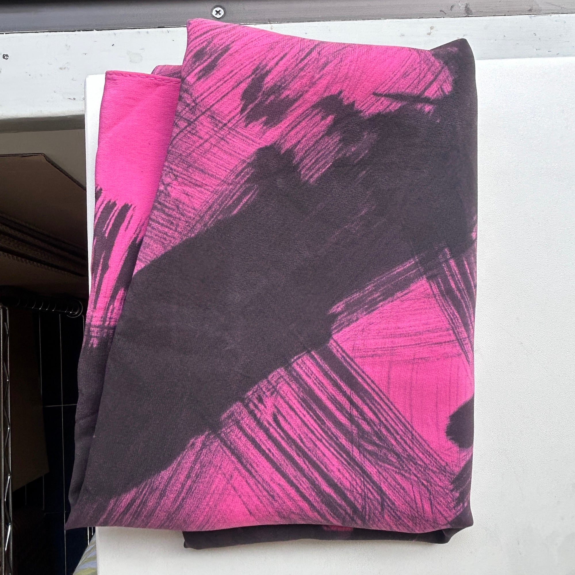 スカーフは鮮やかなピンクに黒の刷毛目プリント。かすれた風合いがリアルです。ハンドペイントの刷毛目模様なので1点1点プリントの出方が異なります。抽象的な模様と大胆な色使いが魅力のパワフルでラグジュアリーなデザインスカーフ。しっとり上質な手触りの100%シルク製、Made in USAです。巻きスカート風にレイヤードしたり、羽織りにしたり色々な使い方ができそう。特筆すべきダメージはありません。一度ホームクリーニングしました。