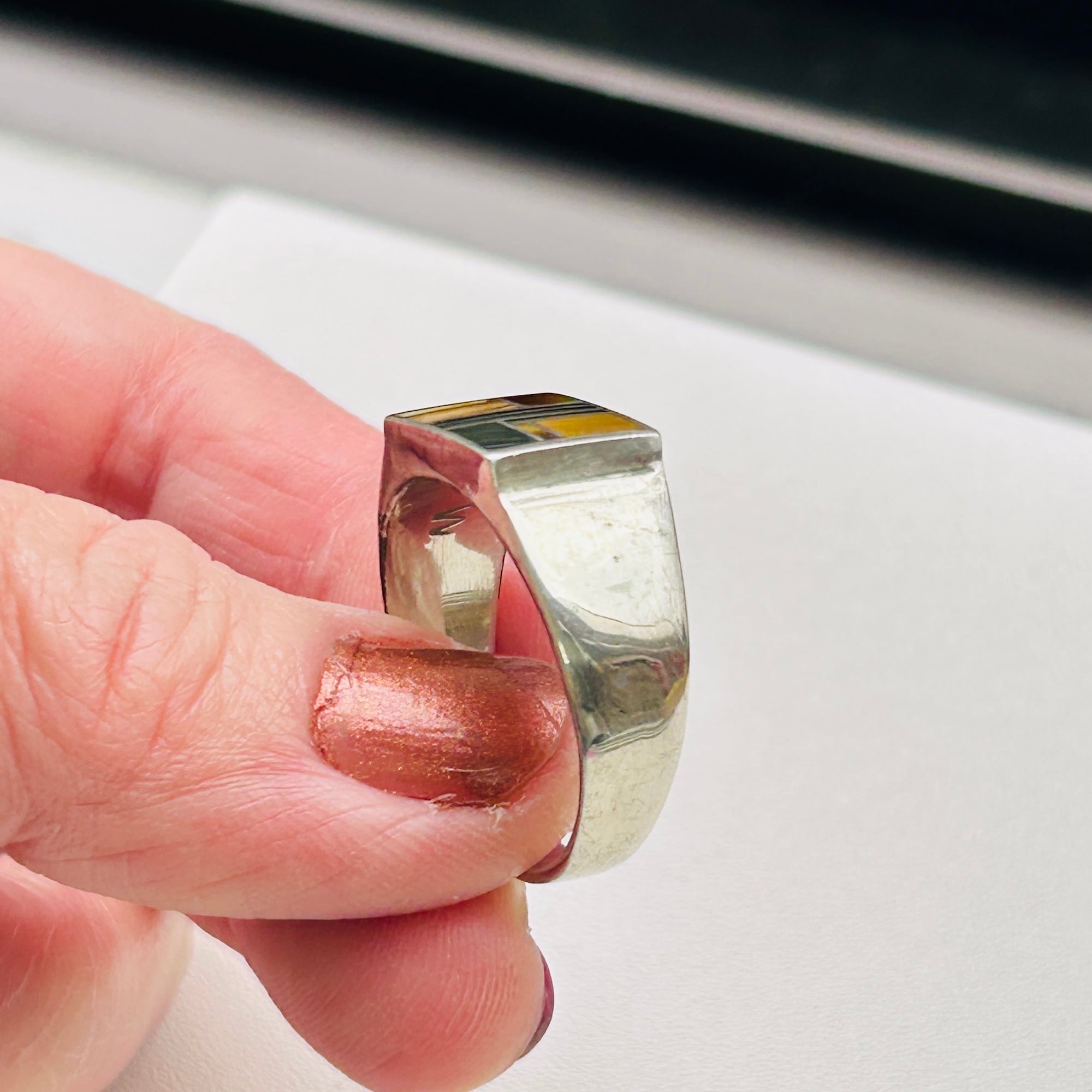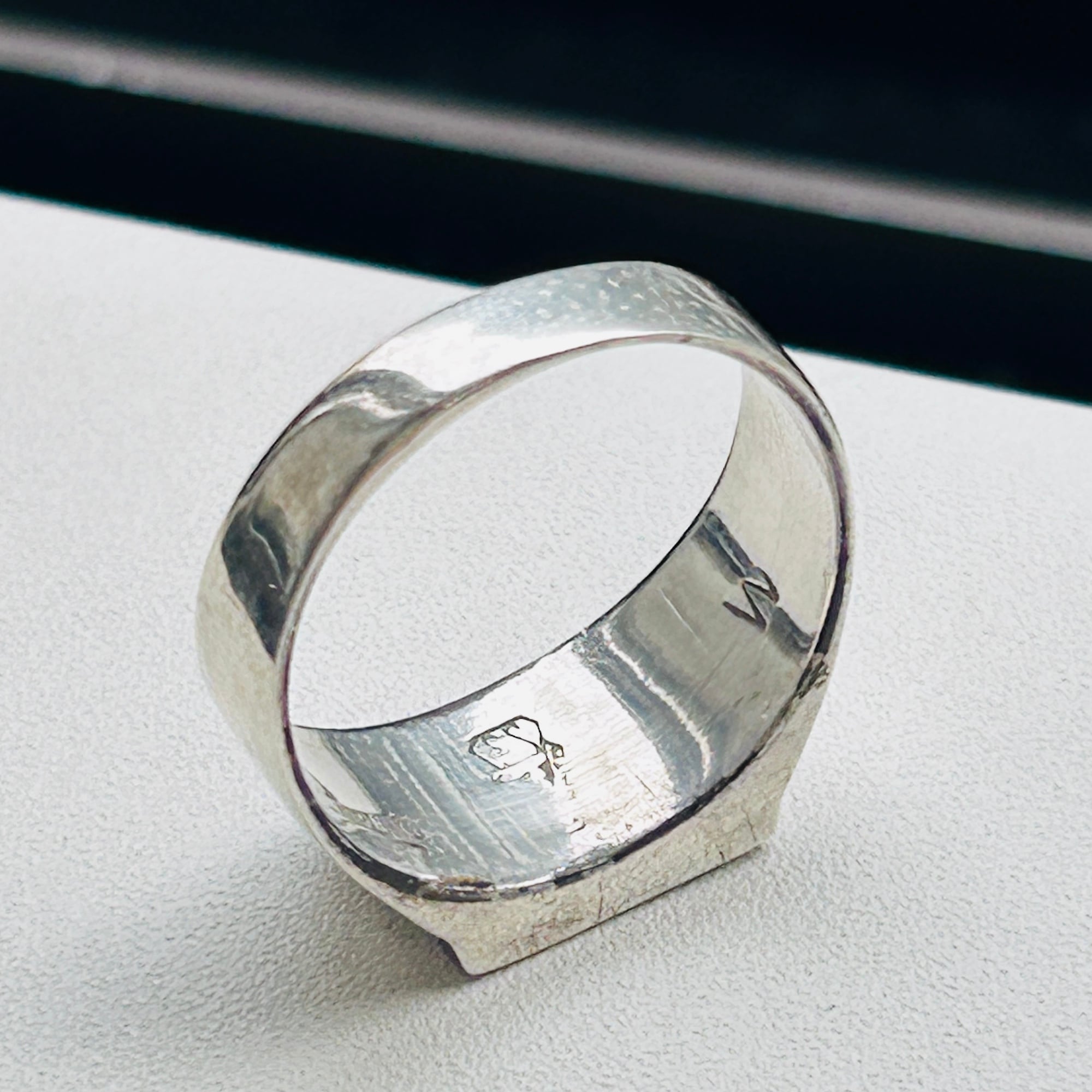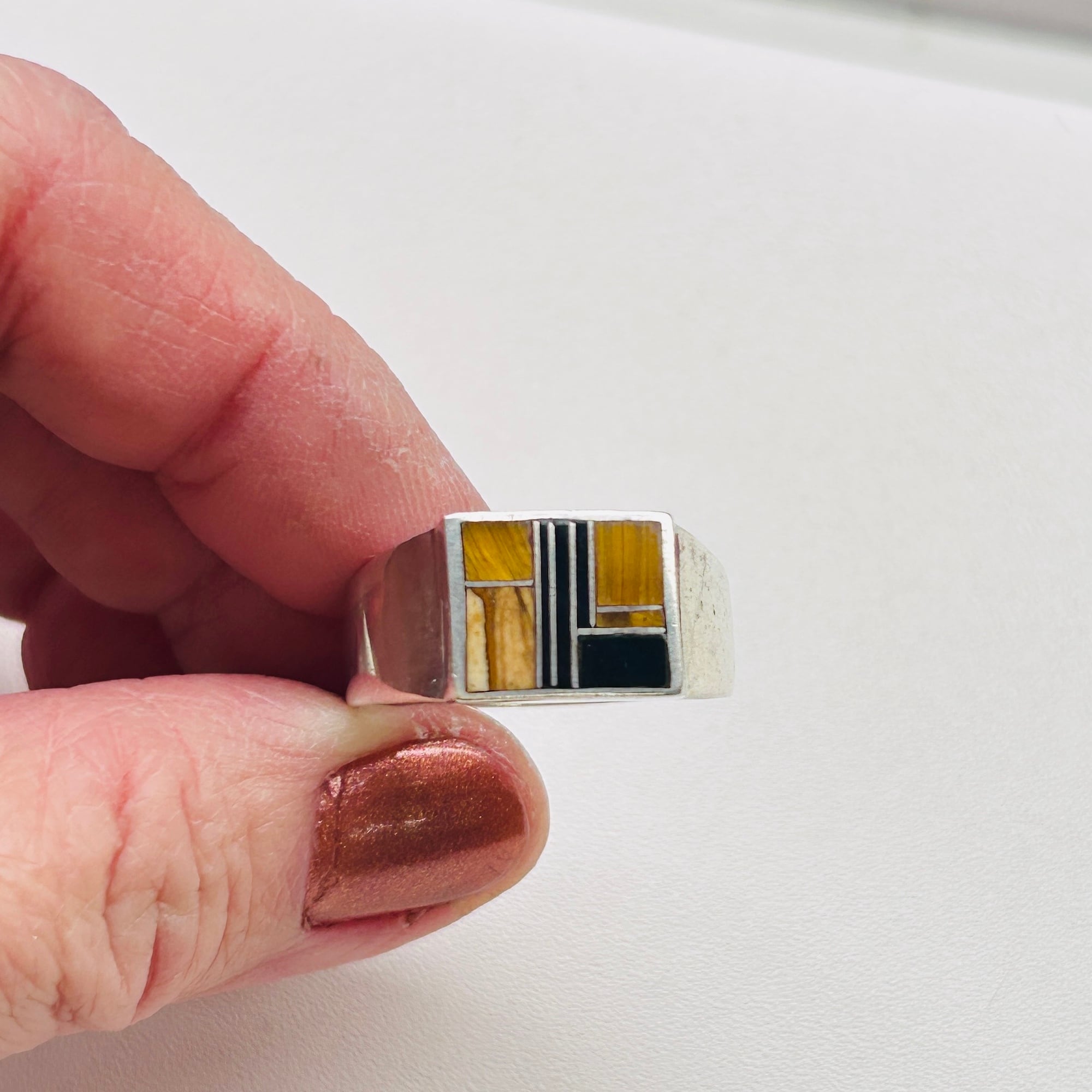 シグネットデザインにタイガーアイとオニキスが埋め込まれたクラシカルLOOKなリング。ストーン使いが魅力です。バンドは比較的薄い作り。実寸通りの着用感かなと思います。内側に「STERLING」とメーカーマーク。SuperSmiths Inc.というニューメキシコ拠点のネイティブアメリカンジュエリーメーカーです。David Rosales Jewelryとも呼ばれています。もう少し磨き上げてお届け致します。