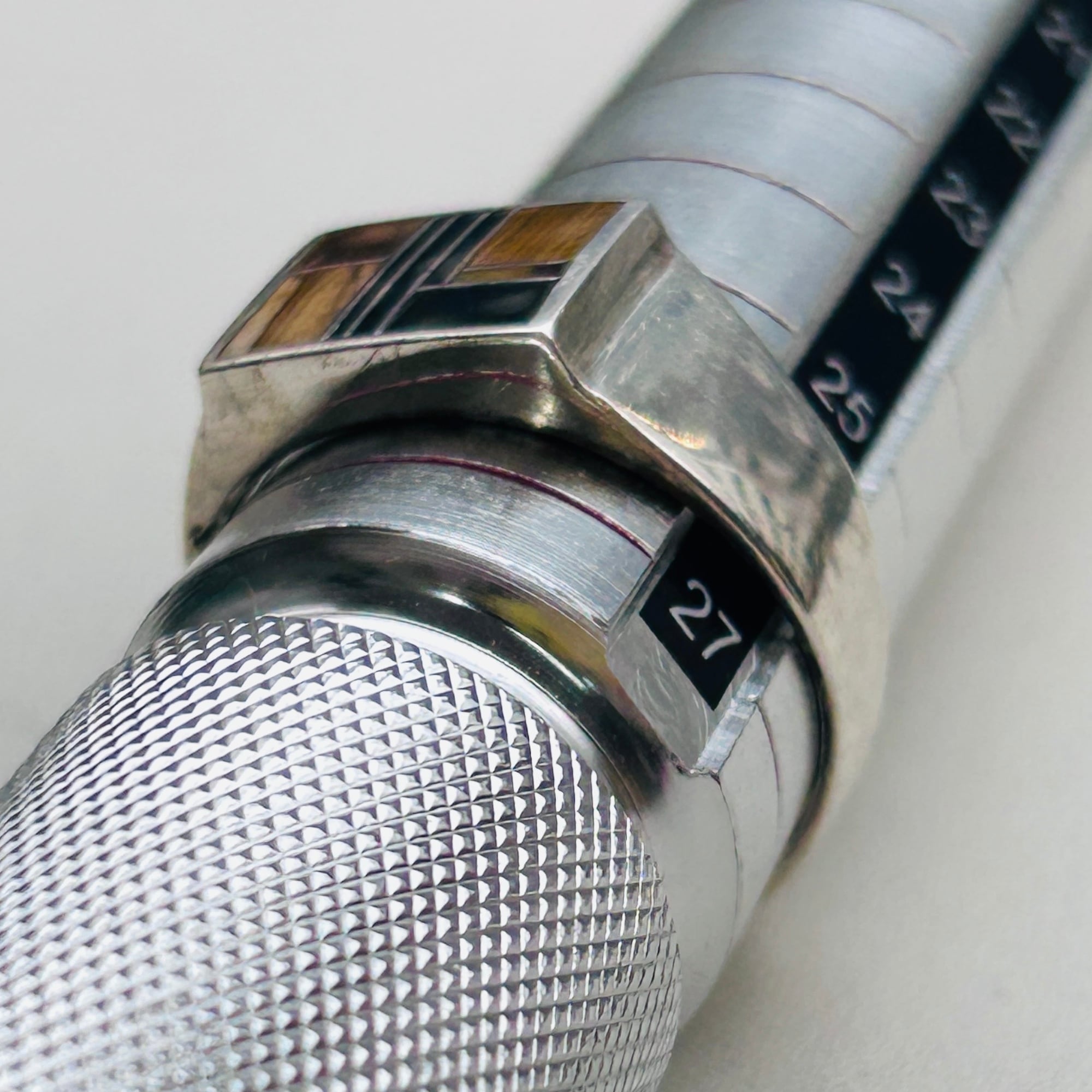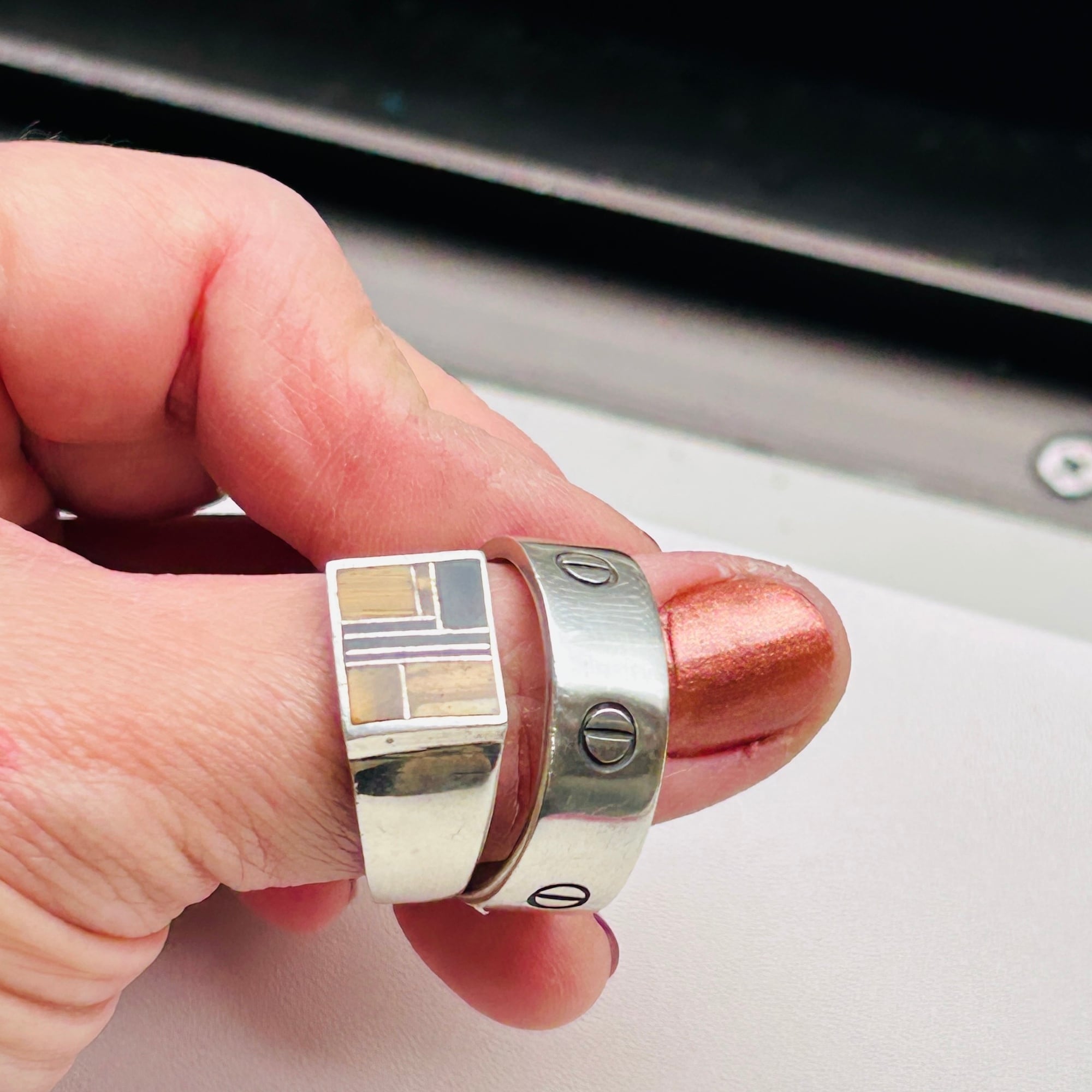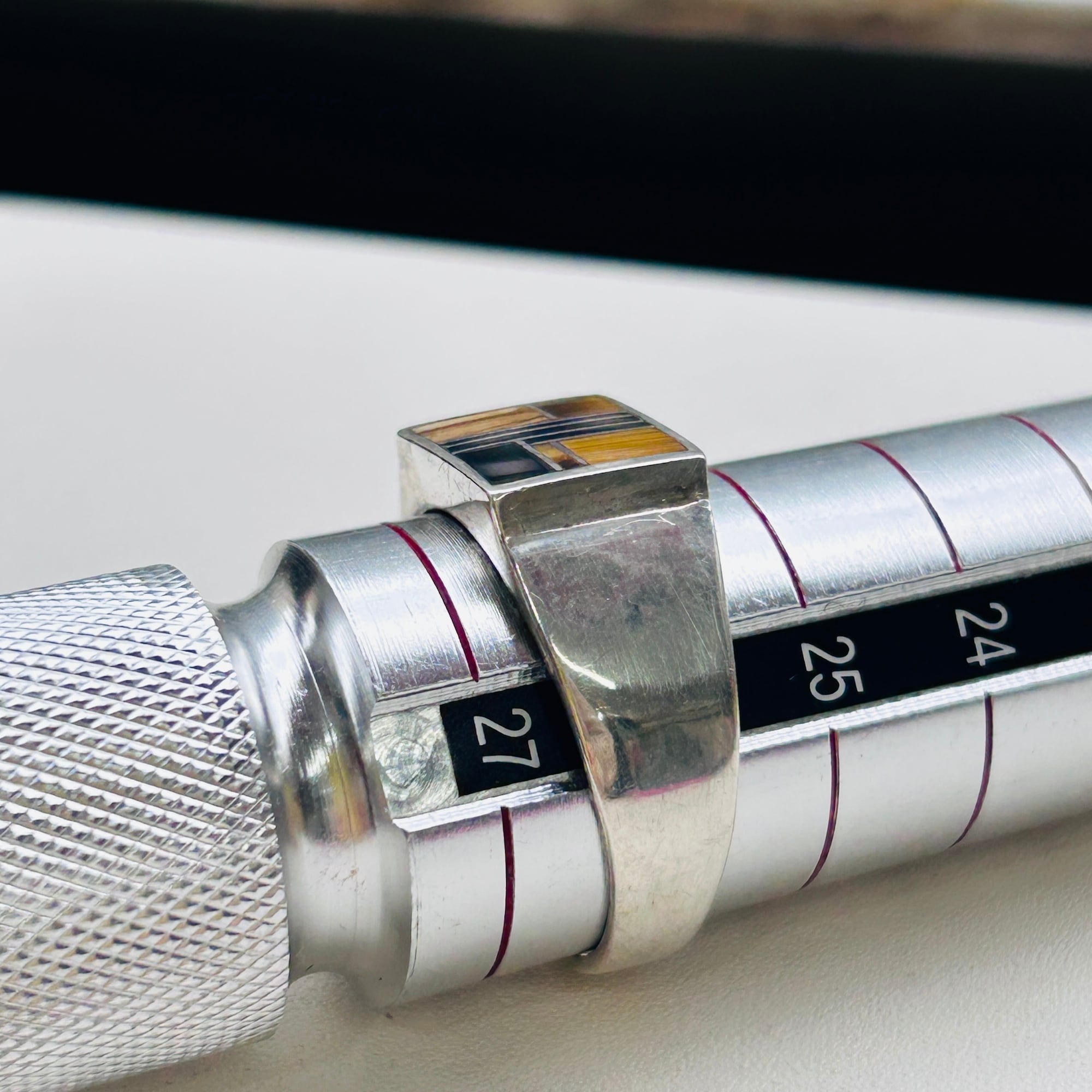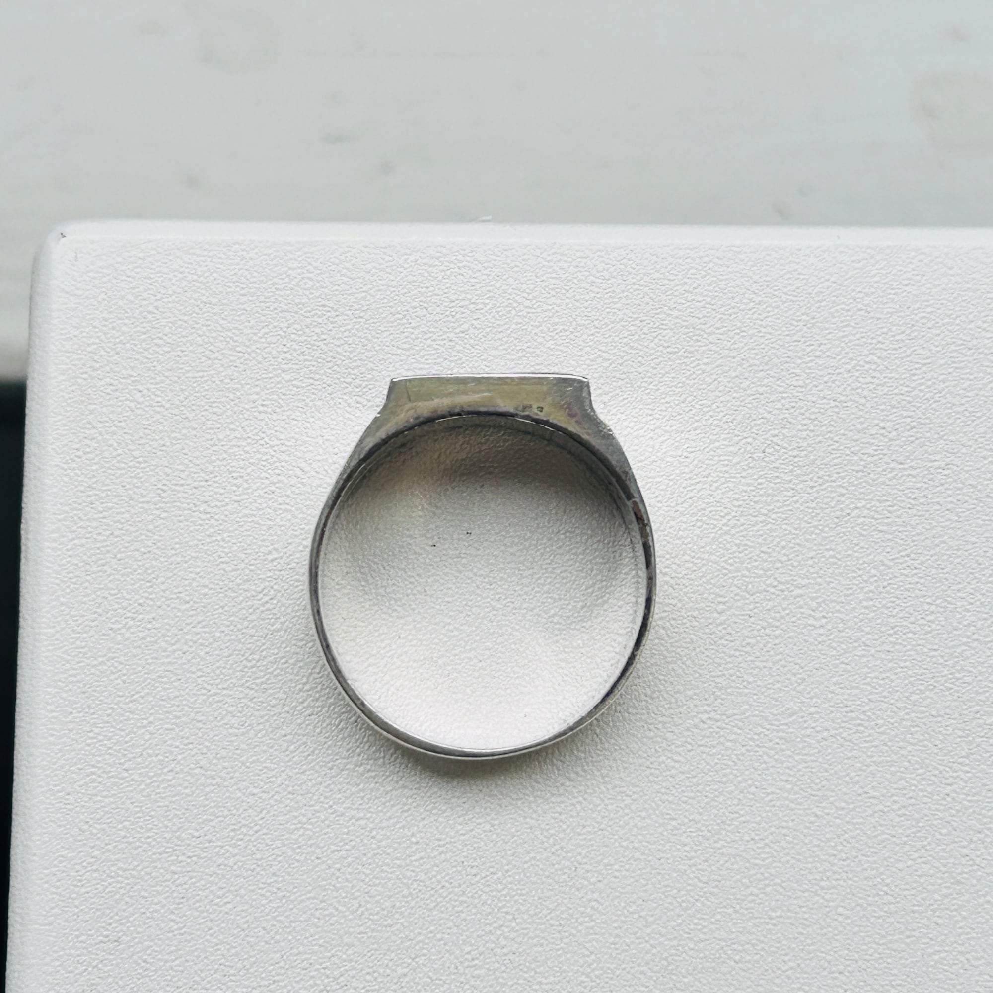 シグネットデザインにタイガーアイとオニキスが埋め込まれたクラシカルLOOKなリング。ストーン使いが魅力です。バンドは比較的薄い作り。実寸通りの着用感かなと思います。内側に「STERLING」とメーカーマーク。SuperSmiths Inc.というニューメキシコ拠点のネイティブアメリカンジュエリーメーカーです。David Rosales Jewelryとも呼ばれています。もう少し磨き上げてお届け致します。