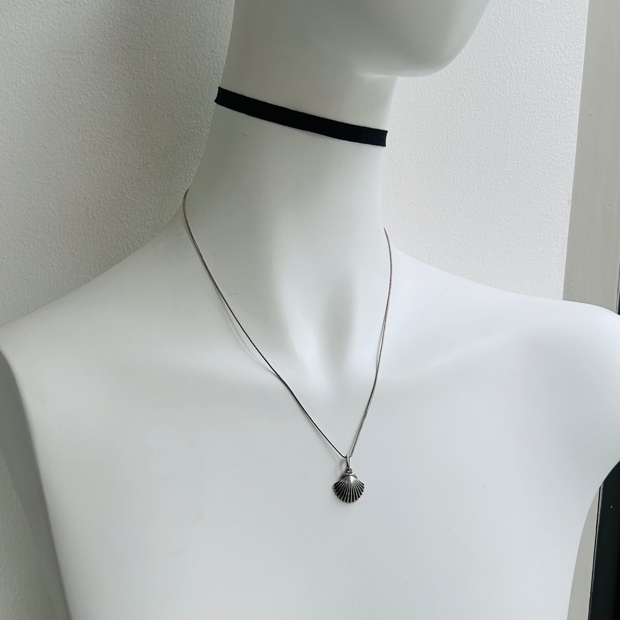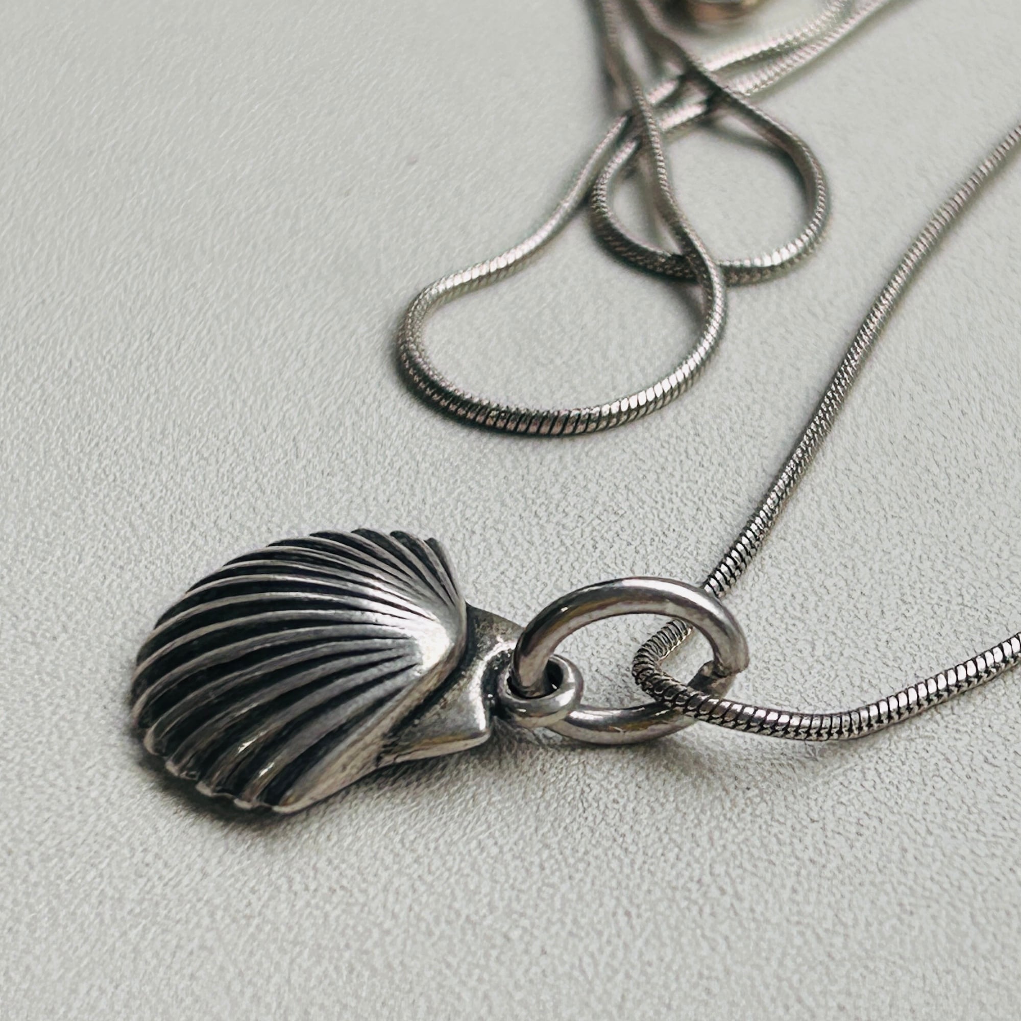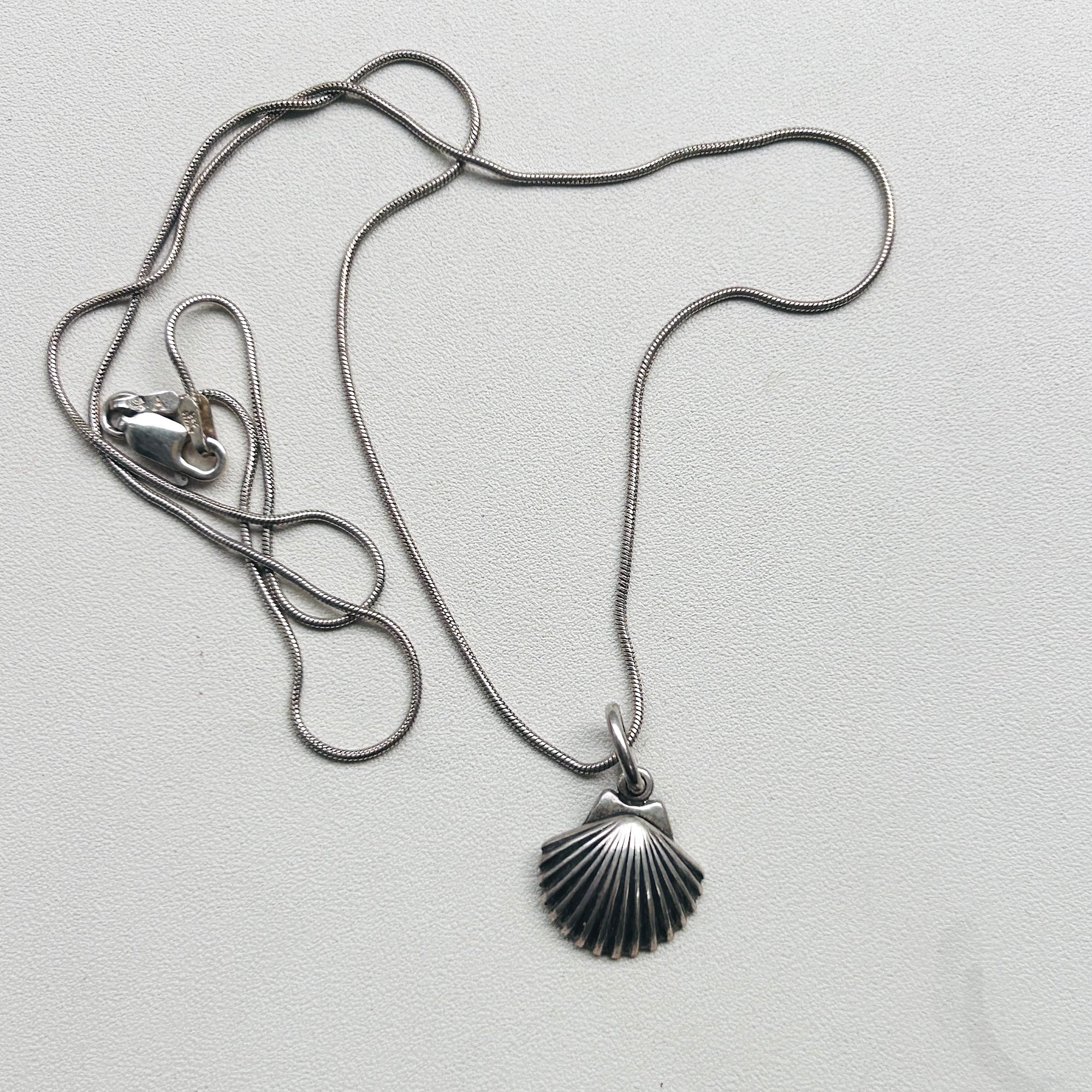 銀古美なシェルチャームネックレス。ヴィンテージチェーンの1コマをベイルにしてスネークチェーンとあわせました。径1mmの柔らかなスネークチェーンです。肉厚なベイルで見た目の印象が変わりますので私的にはオリジナルな楕円カンがポイントです。長さや形状の異なるチェーンと重ね着けがオススメです。チャーム裏に「925」とメーカーマーク。スネークチェーンは「ITALY925」。Good Price!
