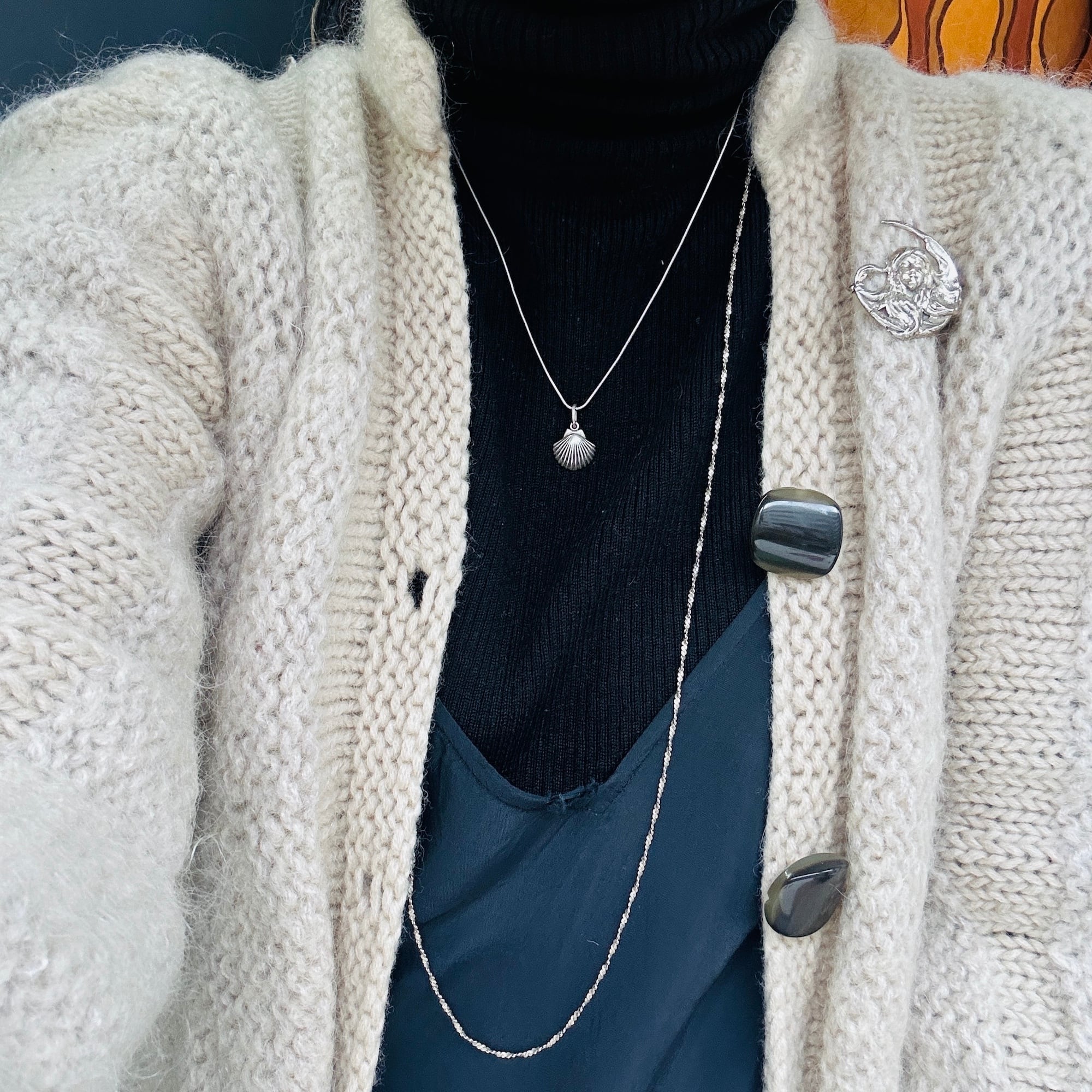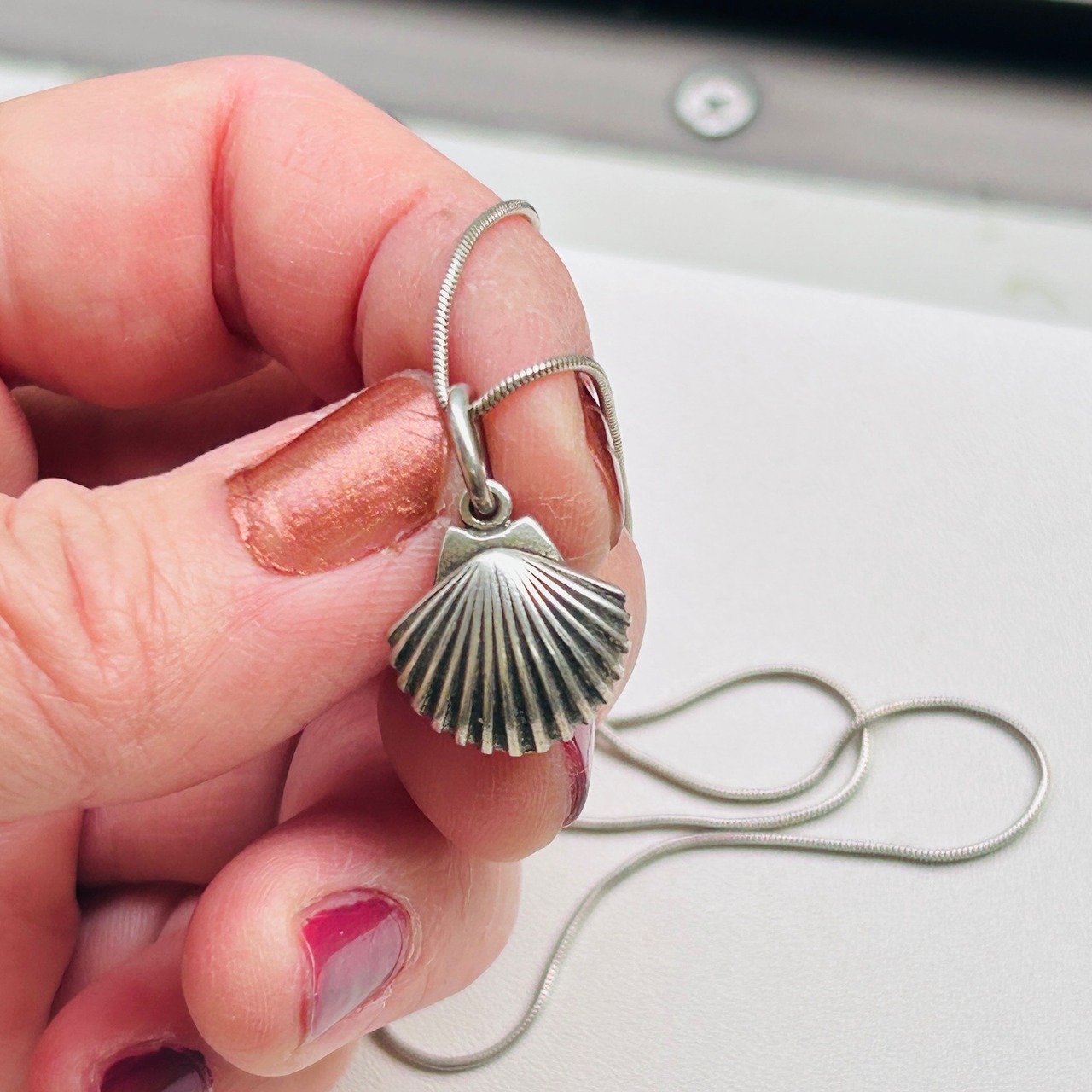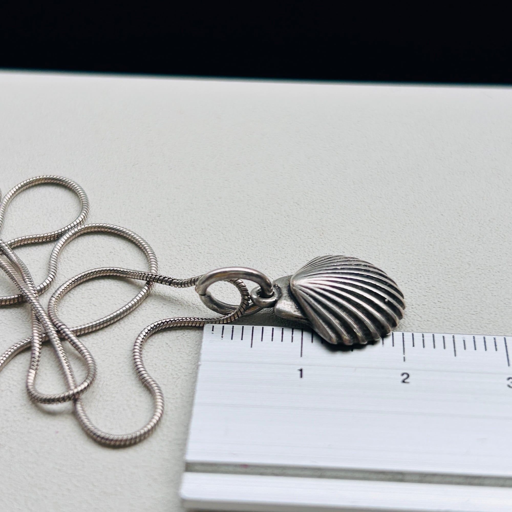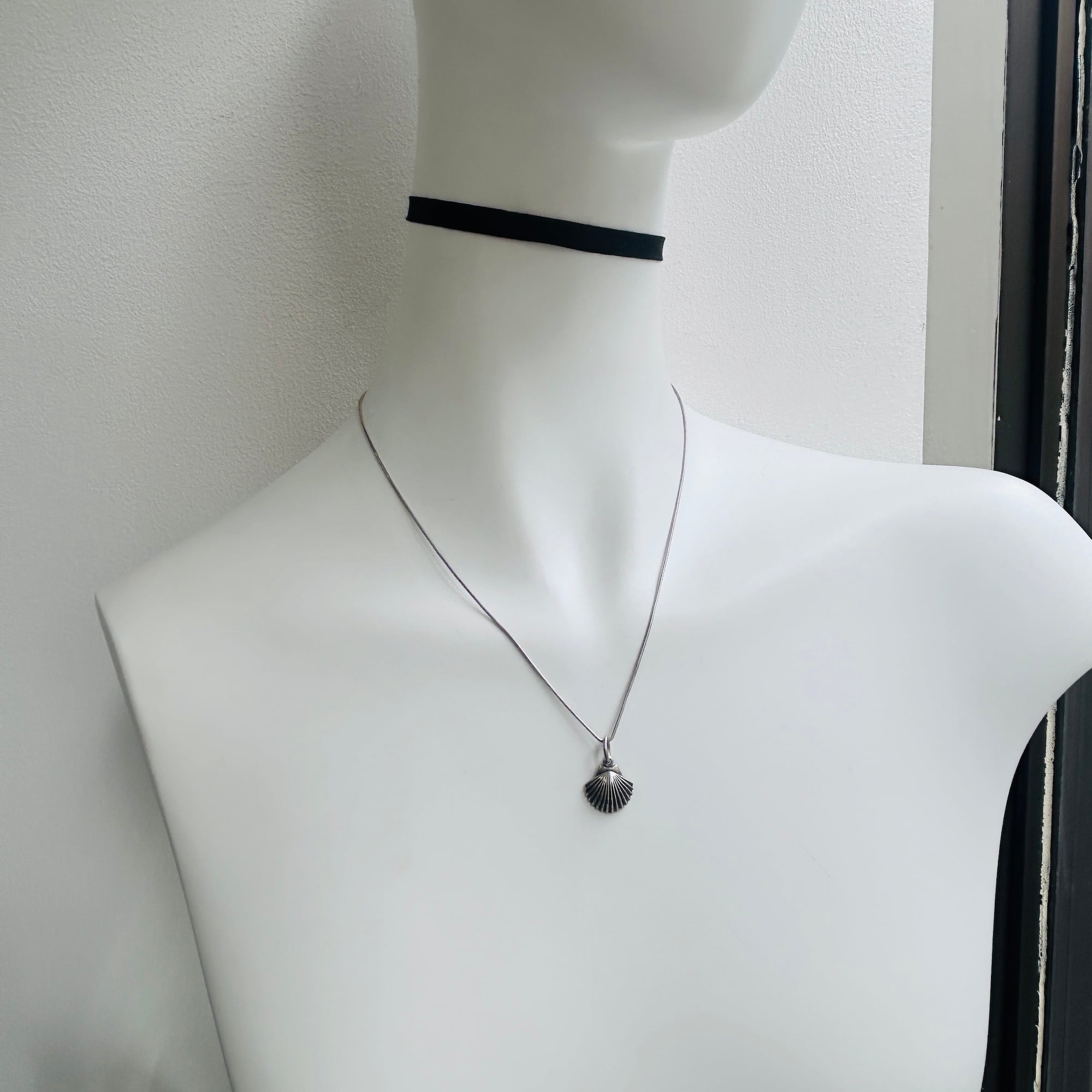 銀古美なシェルチャームネックレス。ヴィンテージチェーンの1コマをベイルにしてスネークチェーンとあわせました。径1mmの柔らかなスネークチェーンです。肉厚なベイルで見た目の印象が変わりますので私的にはオリジナルな楕円カンがポイントです。長さや形状の異なるチェーンと重ね着けがオススメです。チャーム裏に「925」とメーカーマーク。スネークチェーンは「ITALY925」。Good Price!